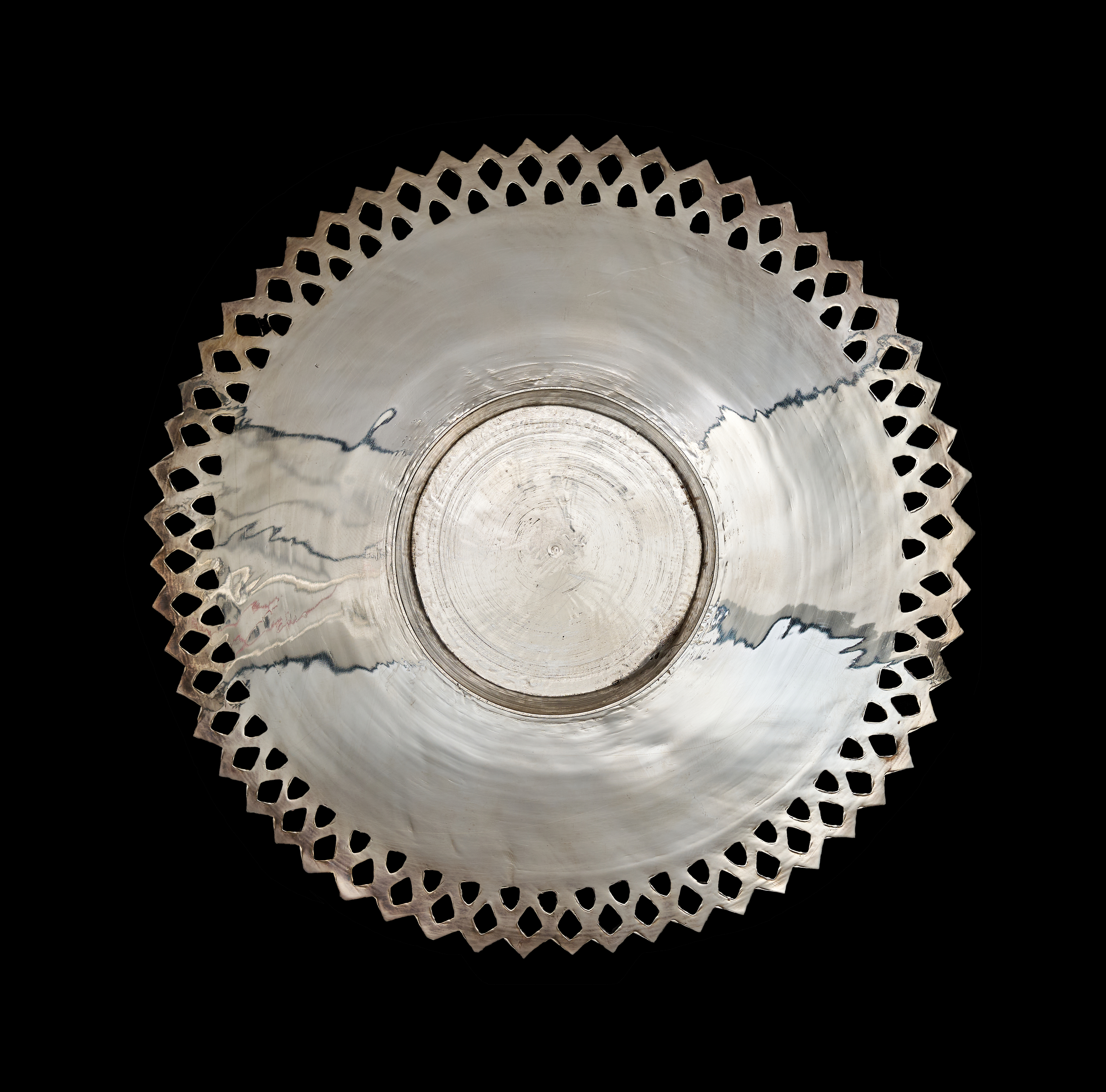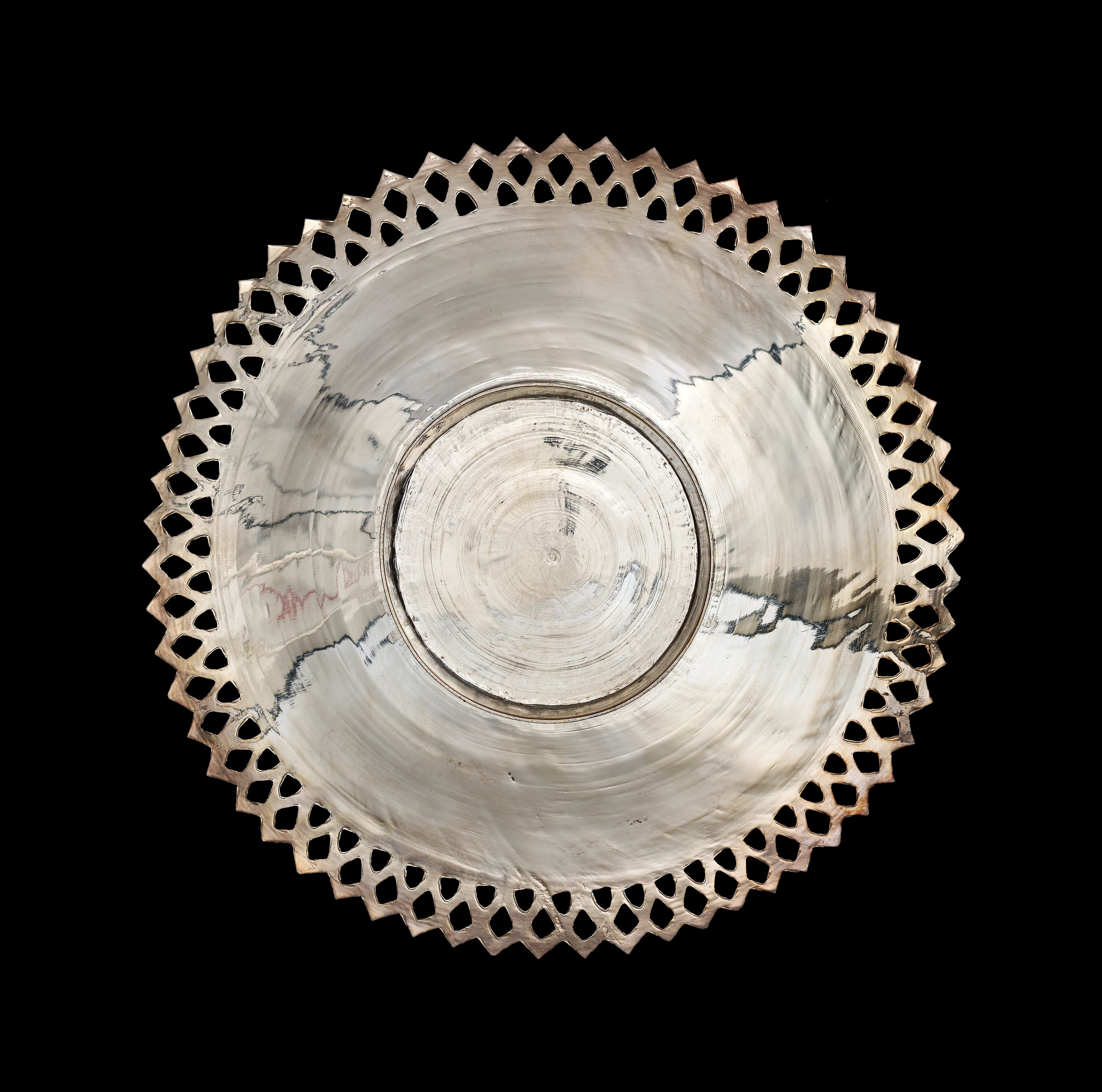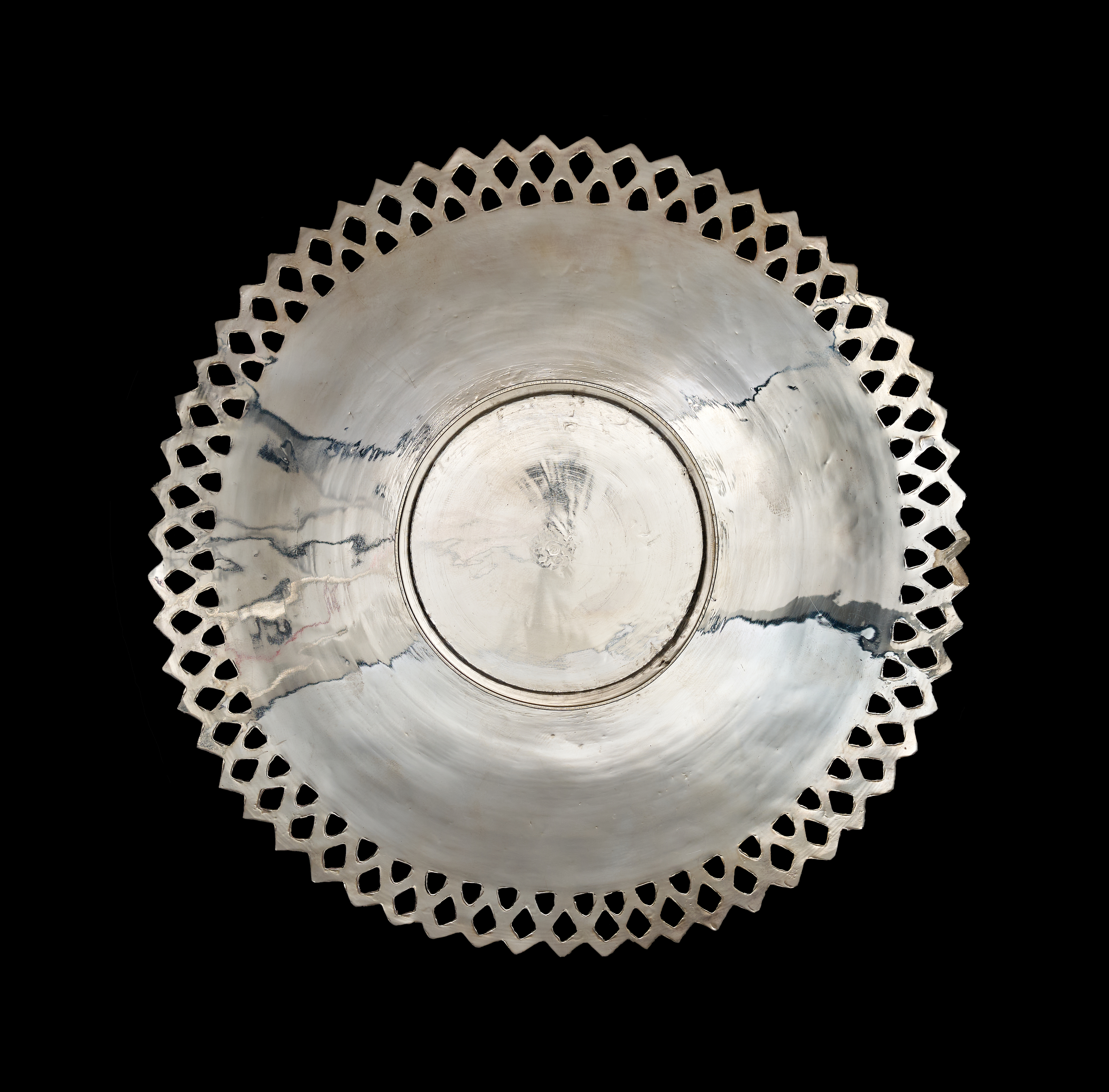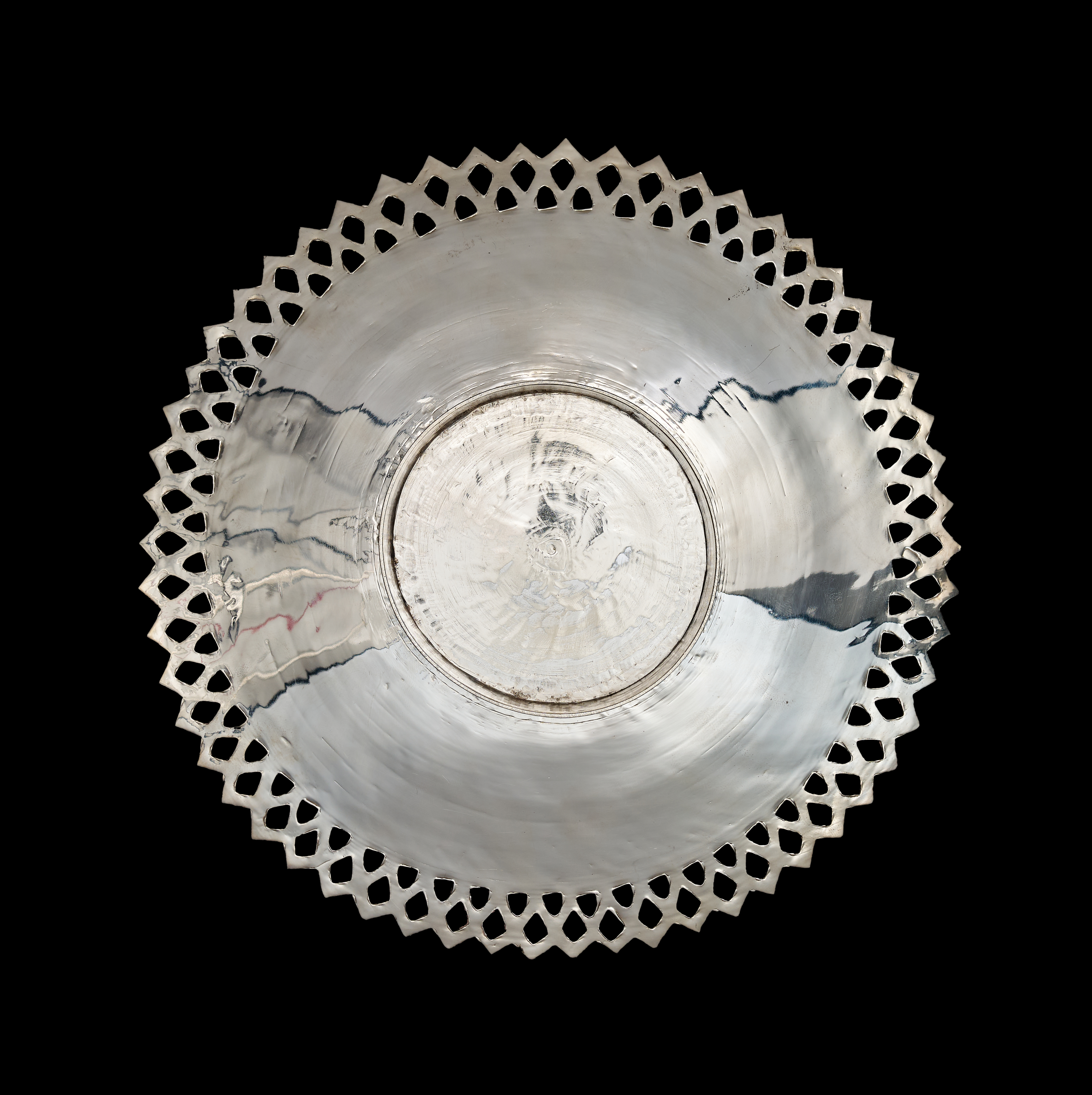 A set of Middle Eastern style silver or silver-plated tableware comprising a large, shallow bowl and several matching plates. Each piece features dense, finely engraved floral and foliate decoration, including stylized tulip motifs, arranged within a central circular field. The items are finished with a wide ajoure or pierced diamond-patterned rim. The undersides are plain and polished. No visible hallmarks or maker’s marks are present.