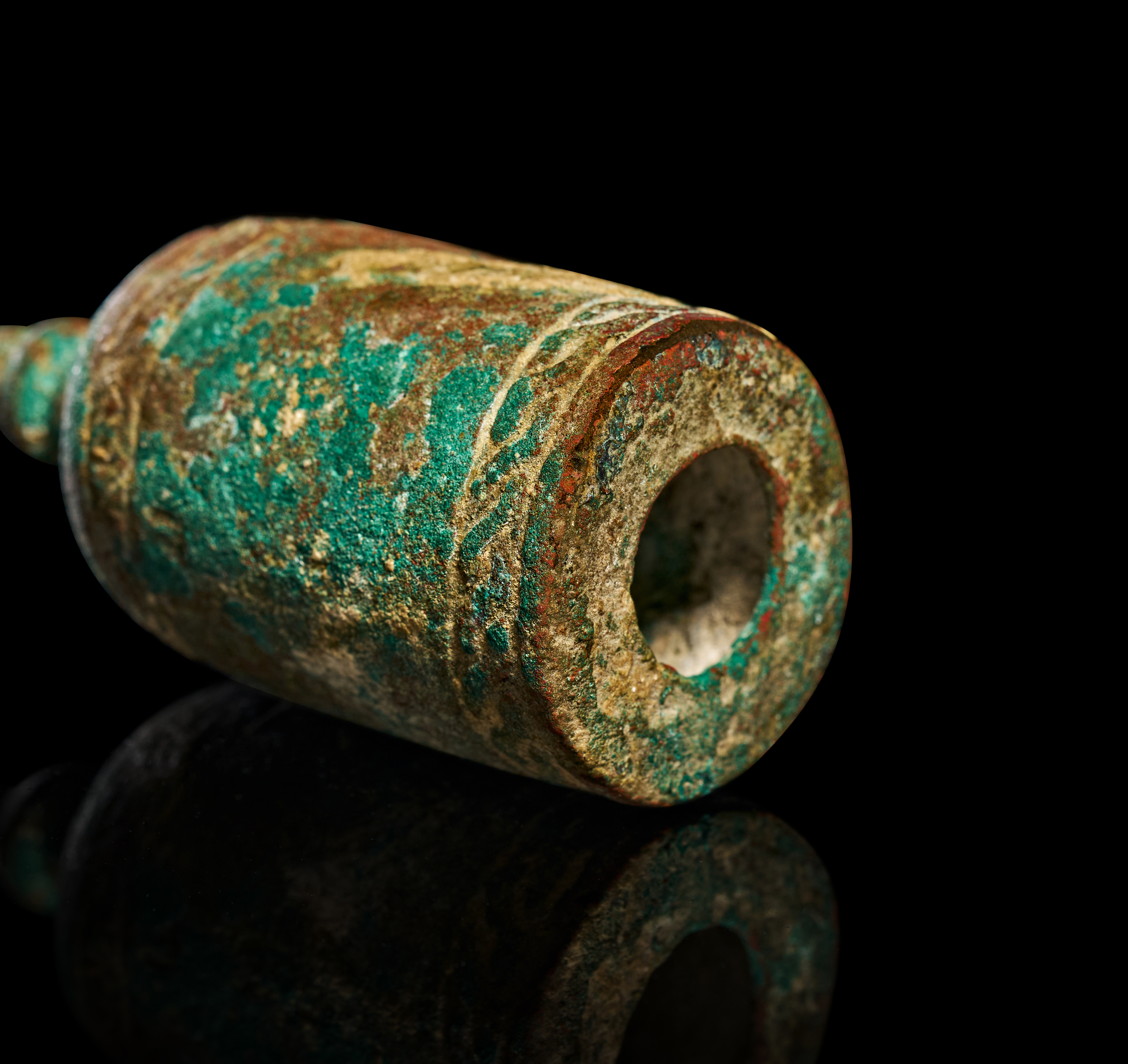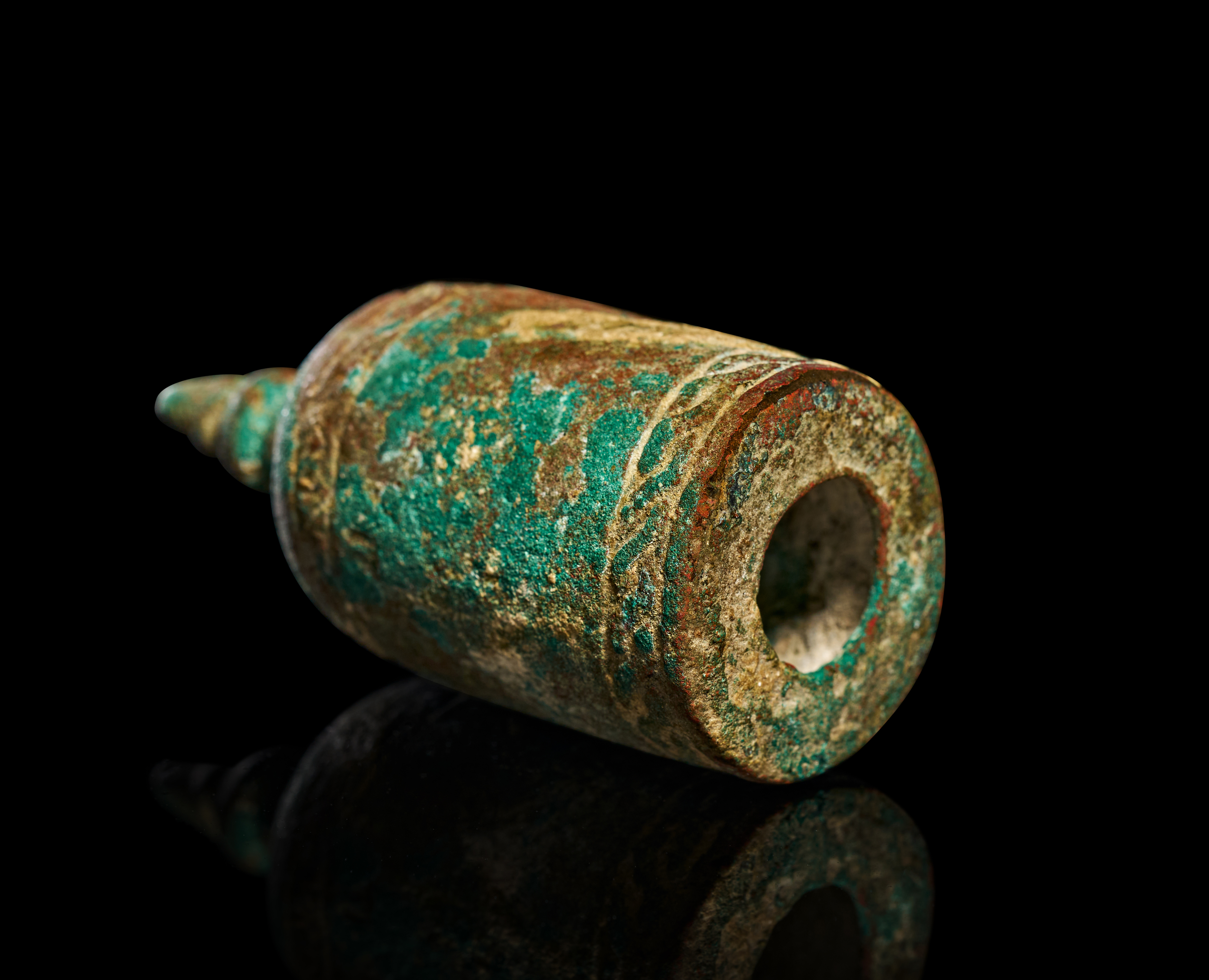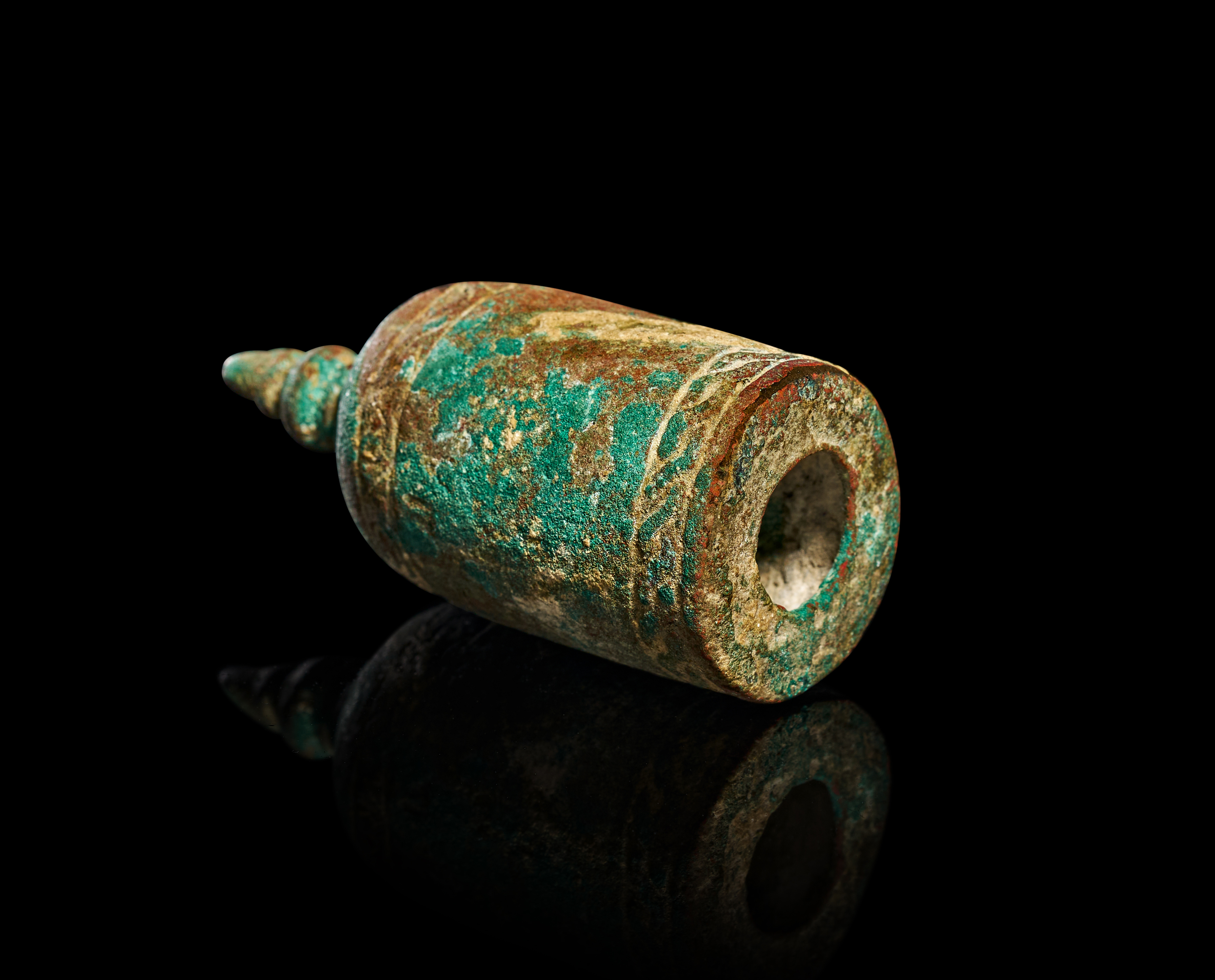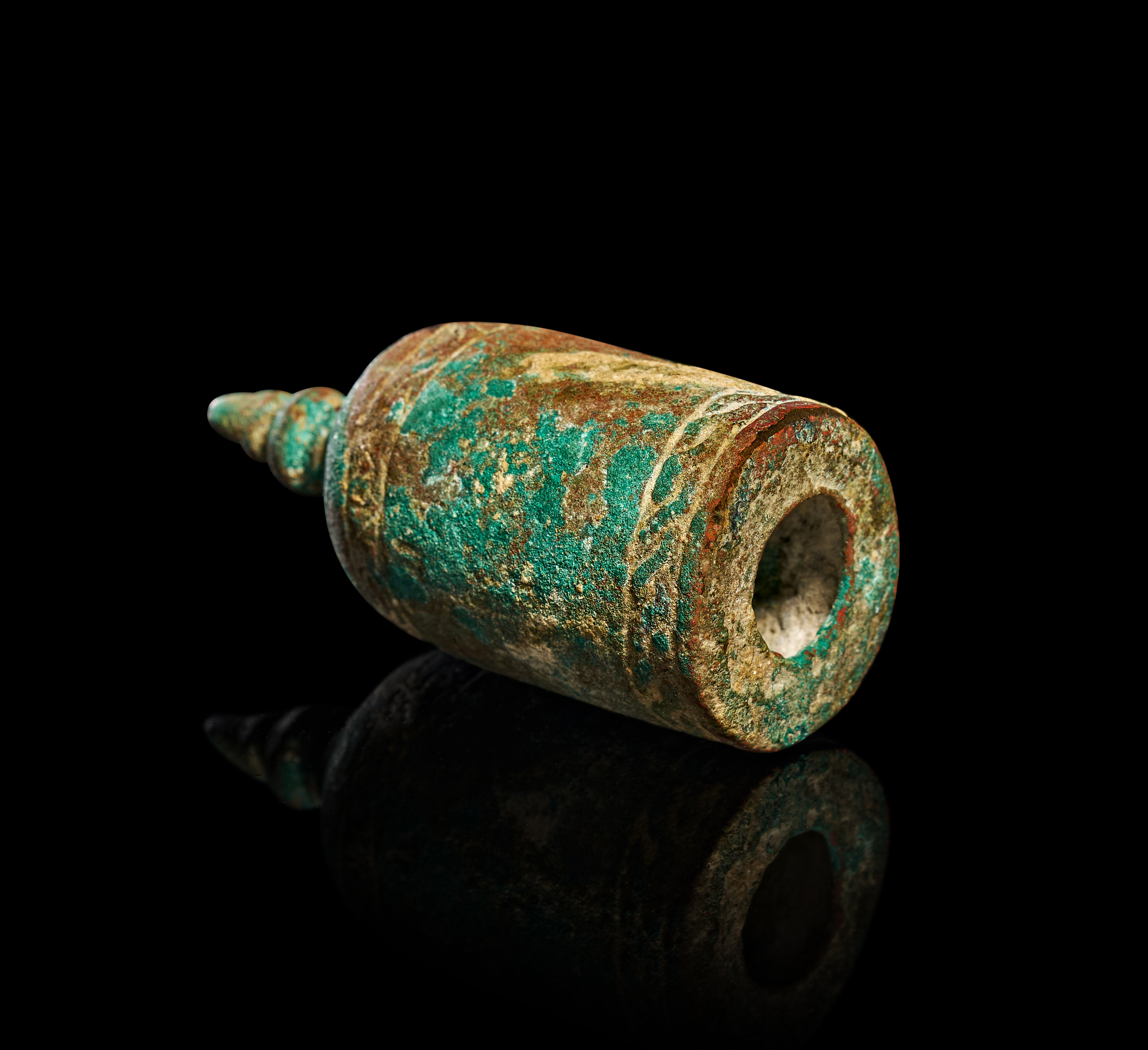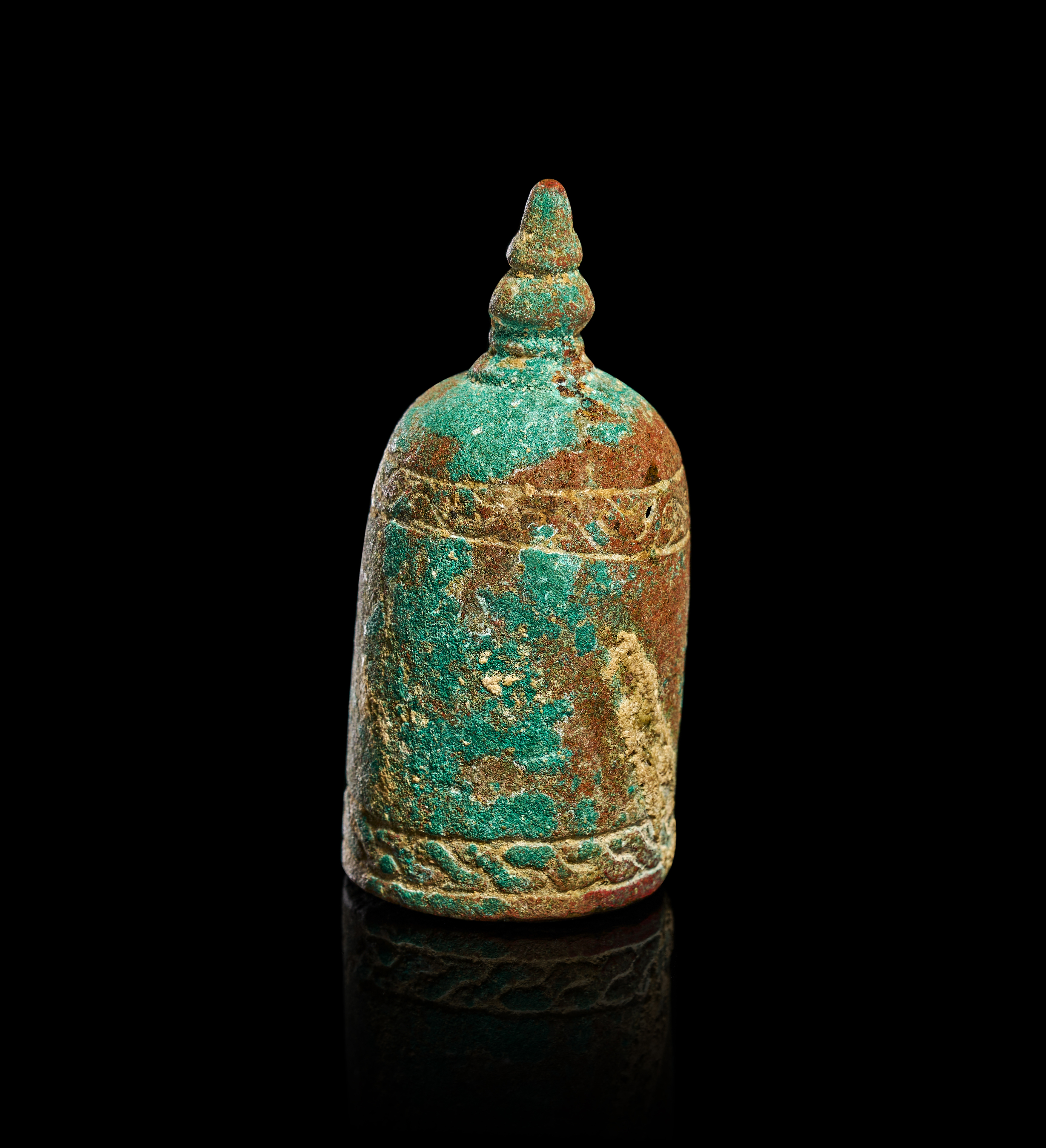 This 12th century Khorasan bronze chess piece is modeled as a pawn, consistent with medieval Islamic examples from the Iranian region. The object is cast in bronze and features a bell-shaped body surmounted by a multi-tiered, tapered finial. The exterior is decorated with two horizontal bands of relief-molded scrolling and braided patterns positioned near the shoulder and the base. The flat underside contains a central circular opening leading to a hollow interior.