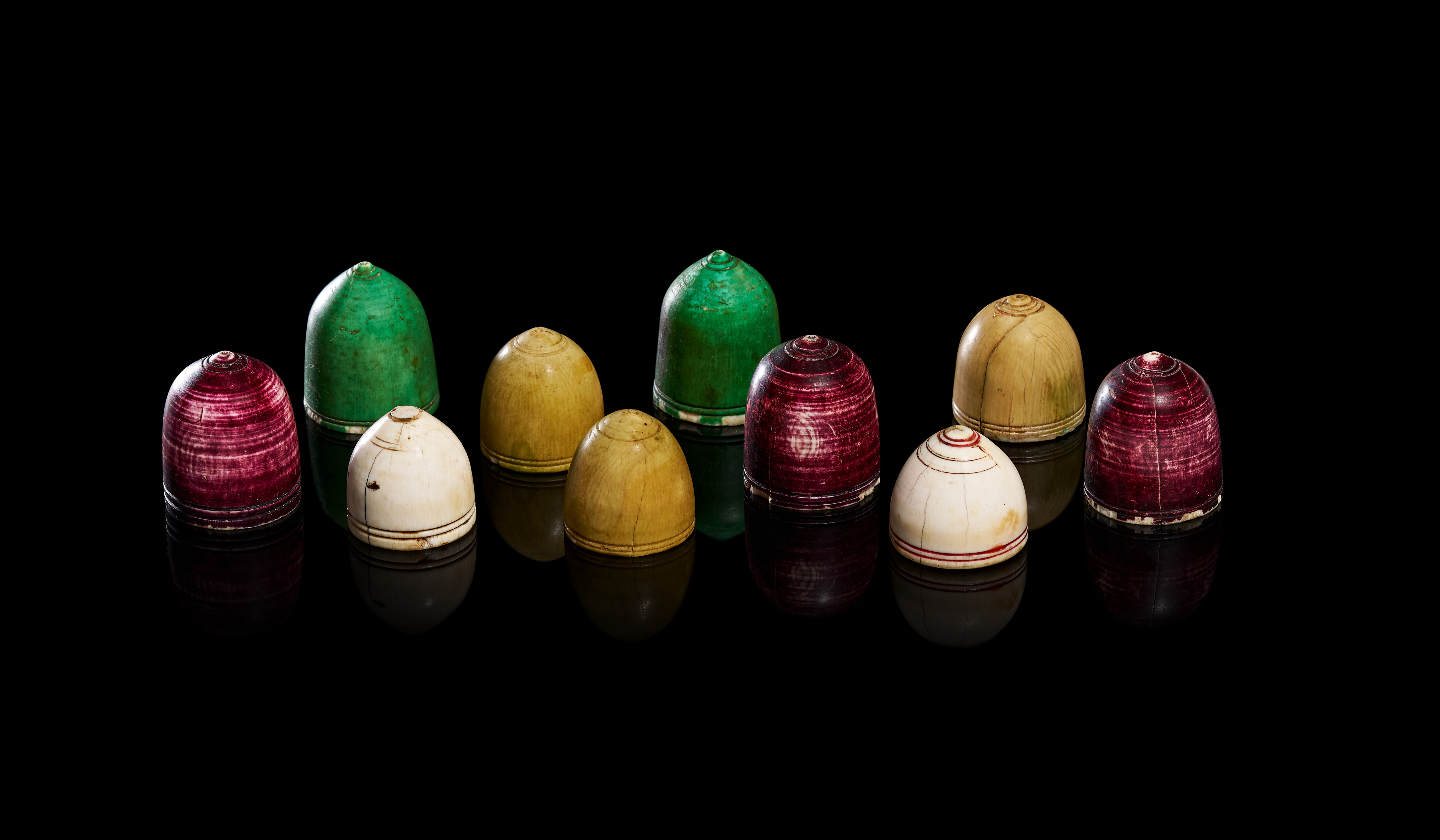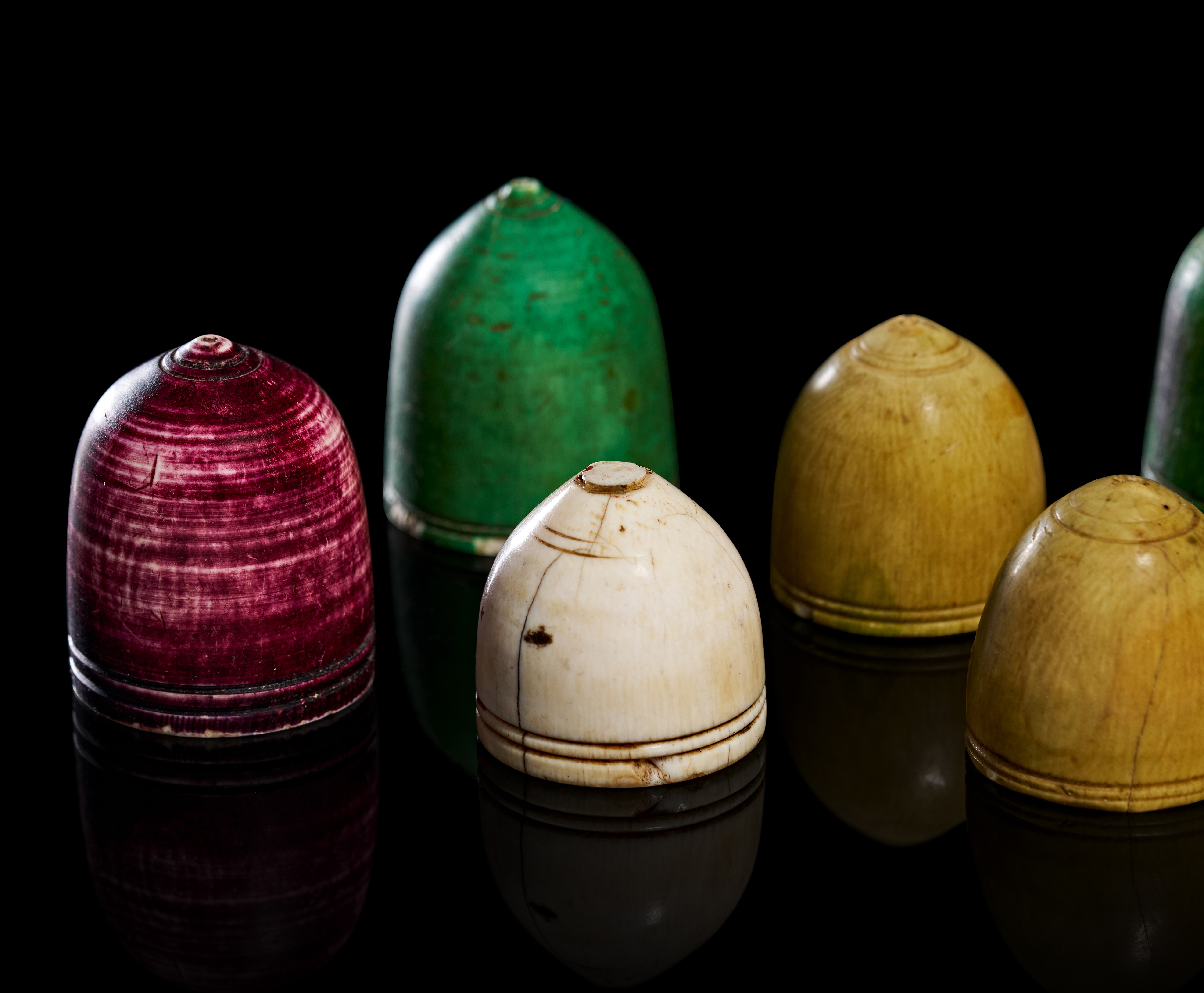 Each piece features a dome-topped, tapering cylindrical form. The decoration consists of concentric turned rings at both the base and the apex. The pieces are finished in various colors, including green, purple, cream, and tan. The organic material exhibits characteristic grain patterns and cross-hatch markings consistent with the material’s structure.