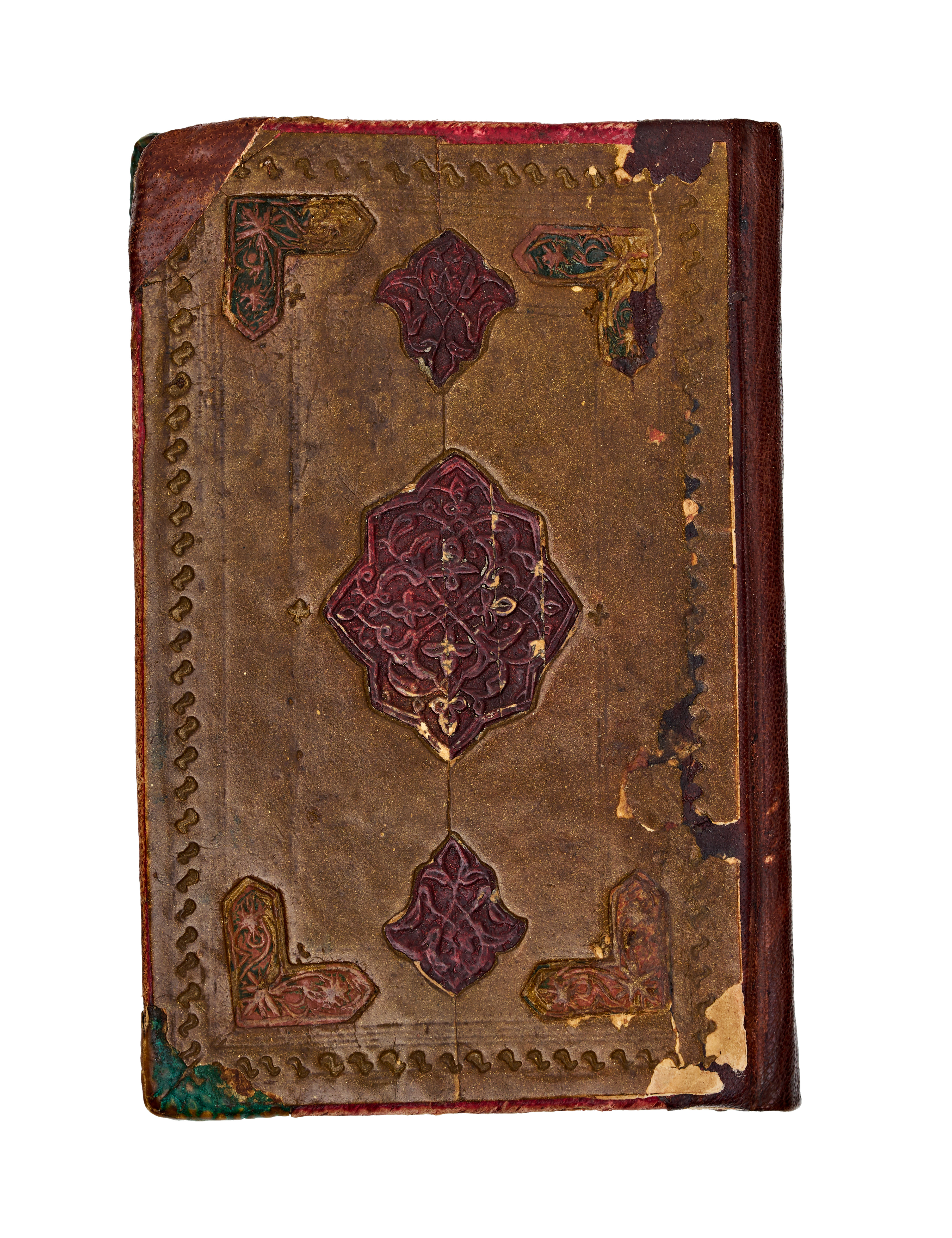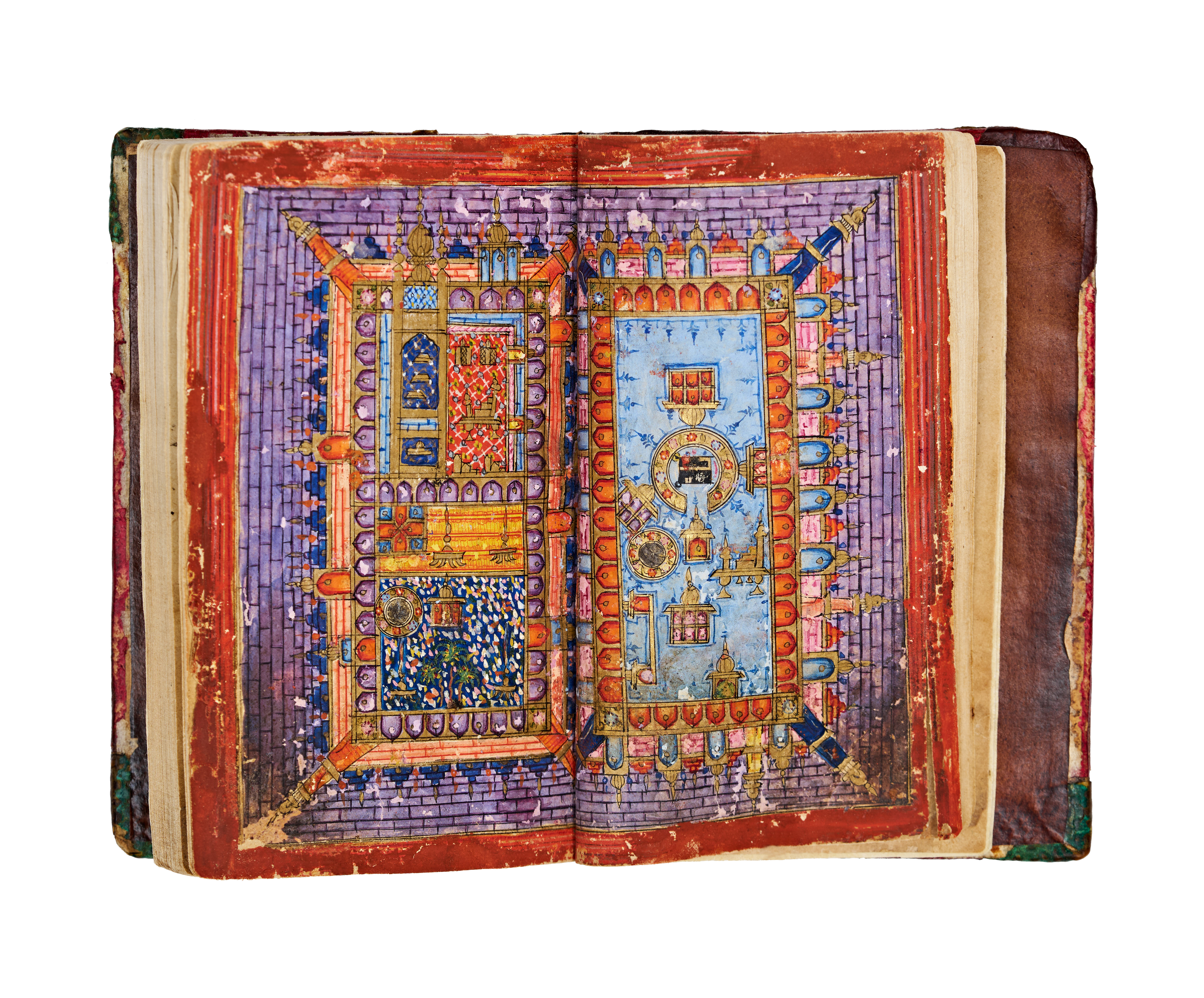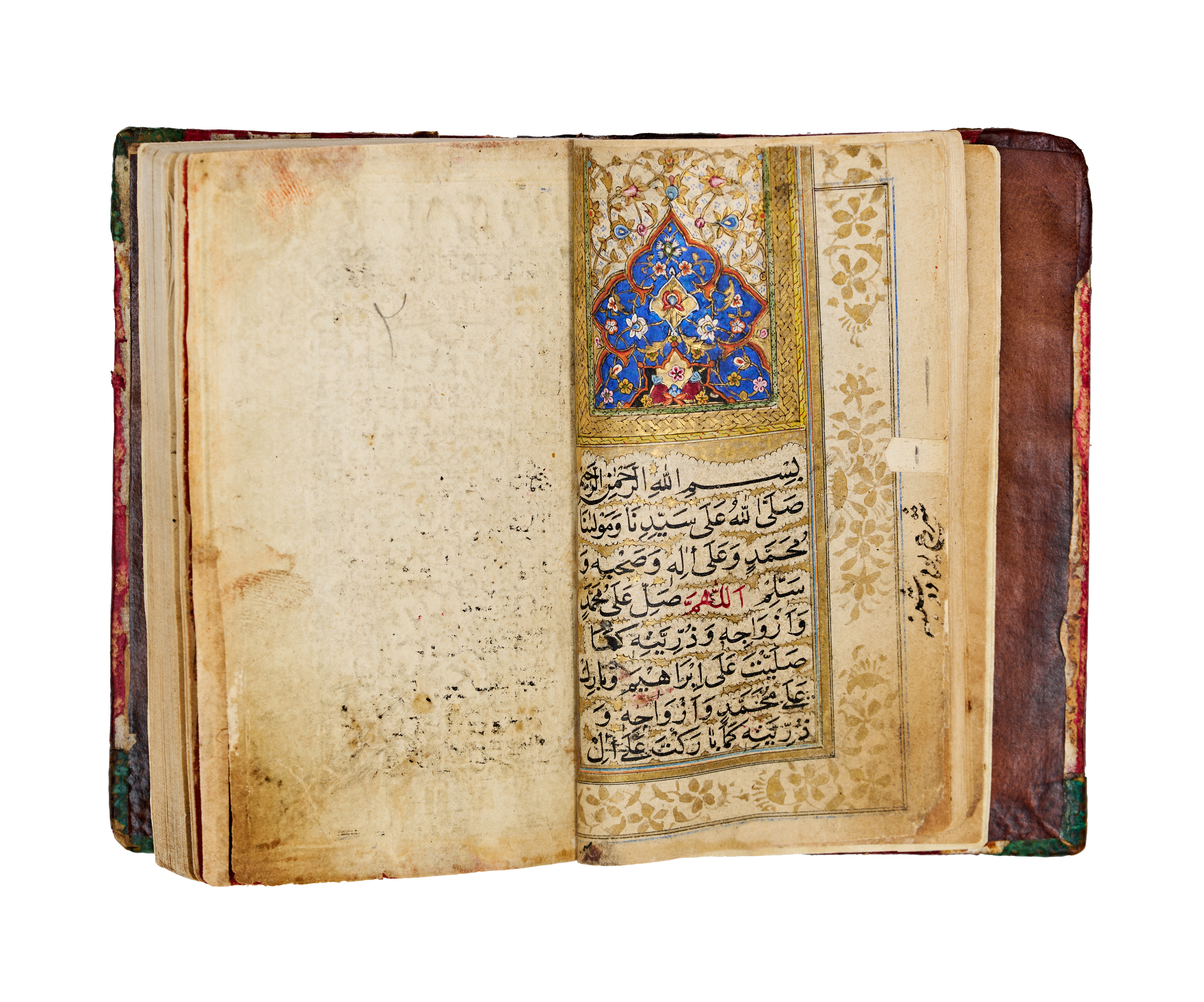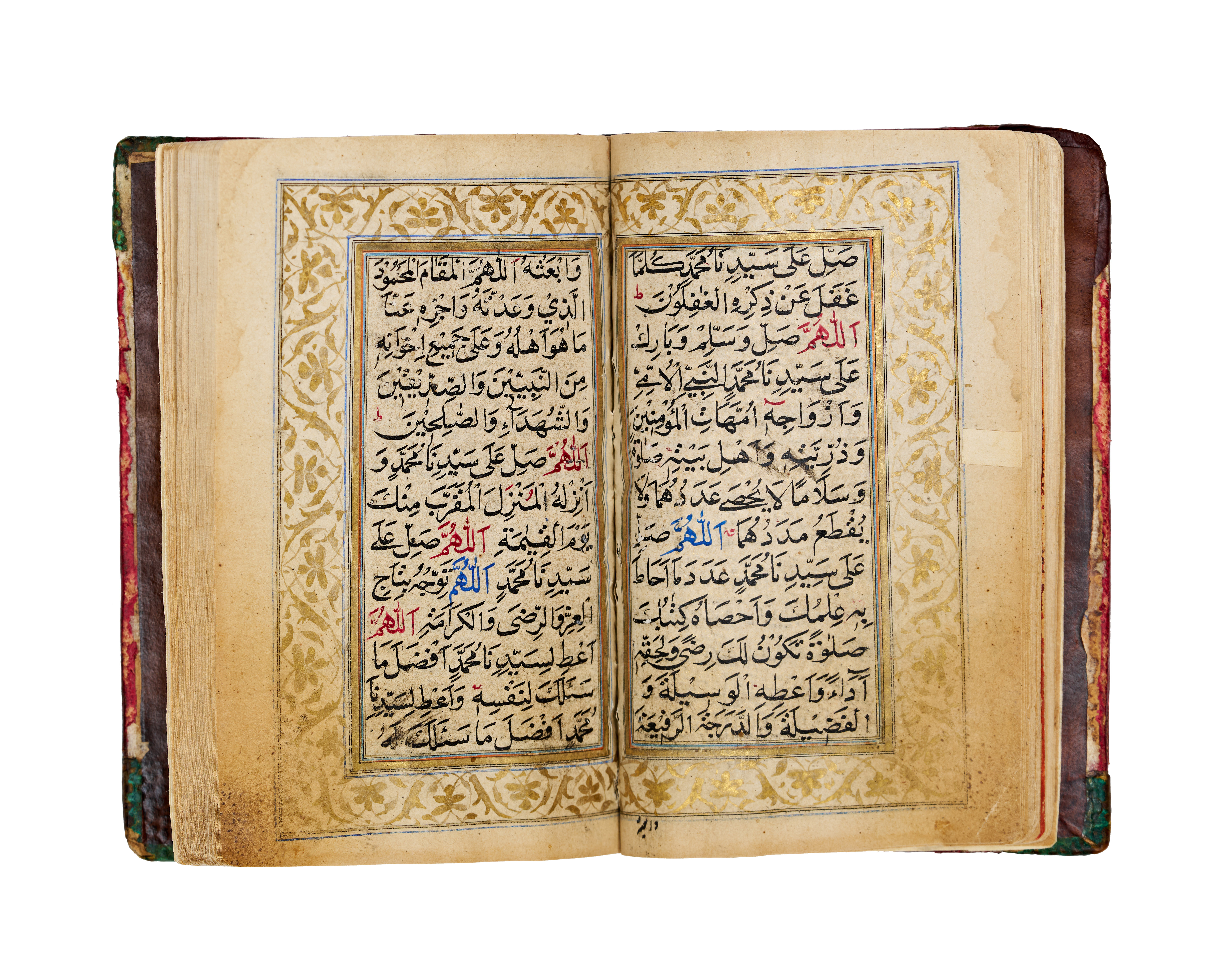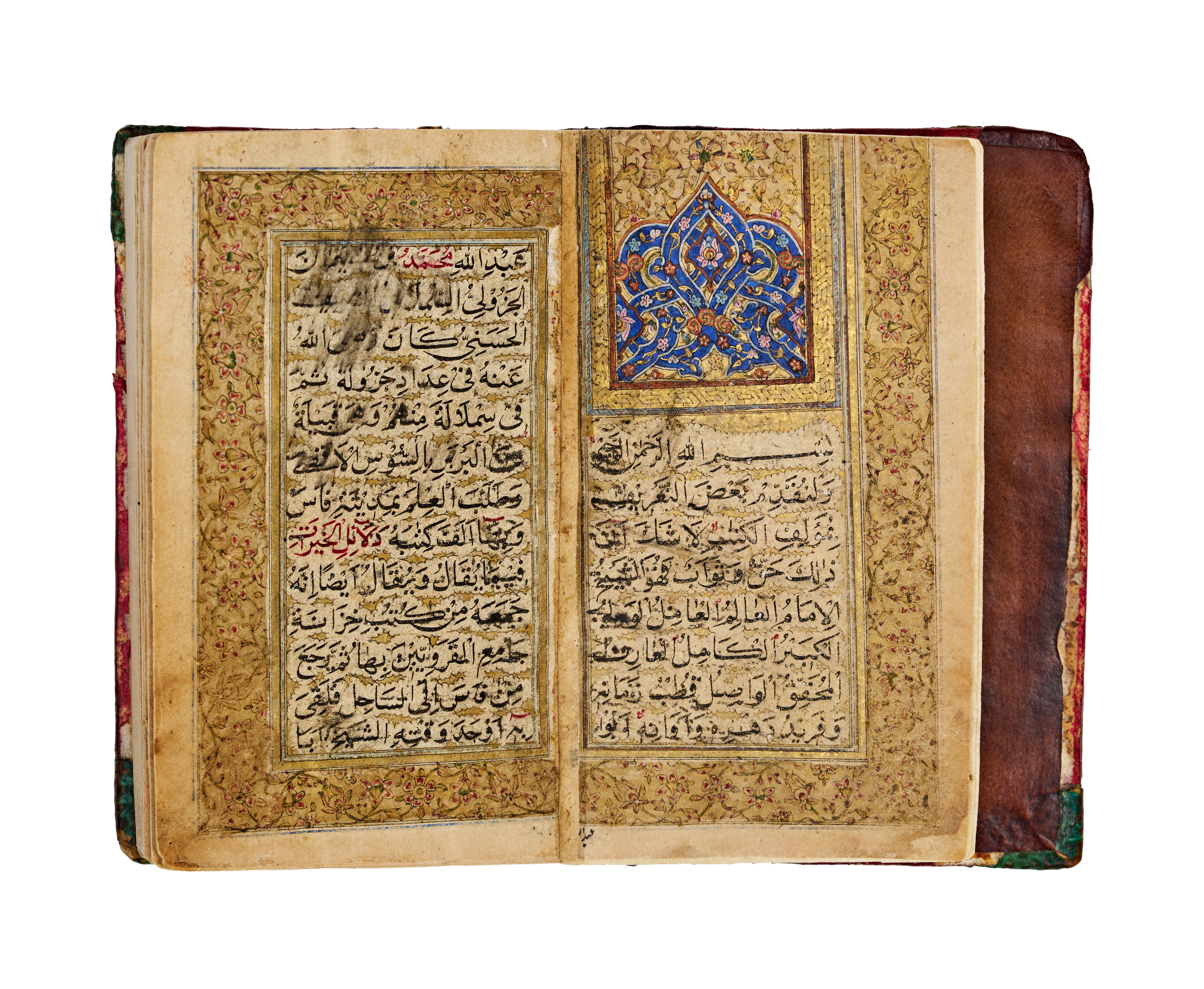 This 18th or 19th-century illuminated Arabic manuscript is a copy of Dala’il al-Khayrat, a collection of prayers. The volume is bound in brown leather featuring embossed and gilded central and corner medallions. Internally, the manuscript contains illumination with gold-leaf floral borders, blue and gold headpieces, and a detailed double-page diagram depicting the holy sanctuaries of Mecca and Medina. The text is written in a clear script with headings and key names highlighted in red and blue ink. The construction consists of ink and gold leaf on paper, housed within a leather binding.