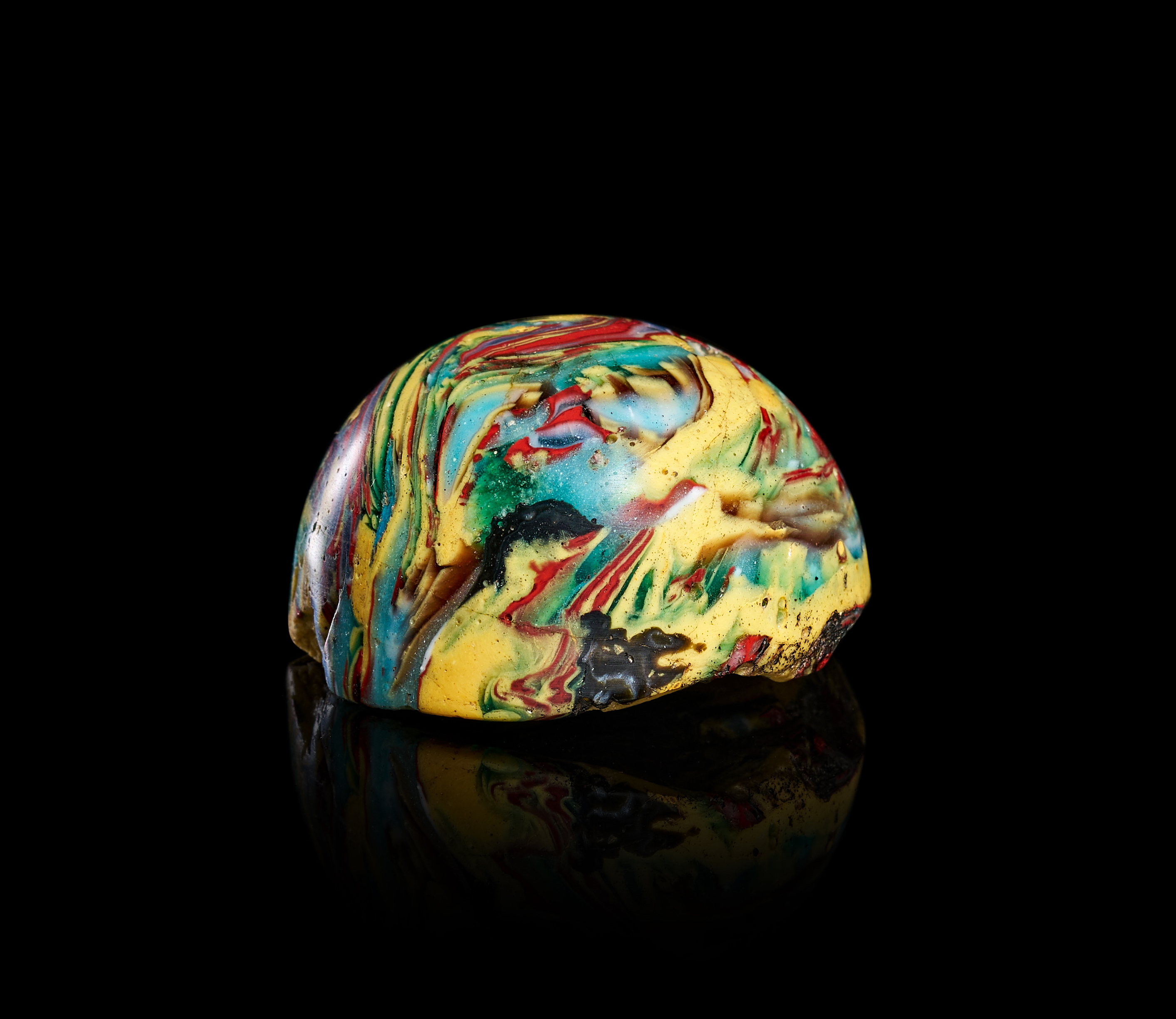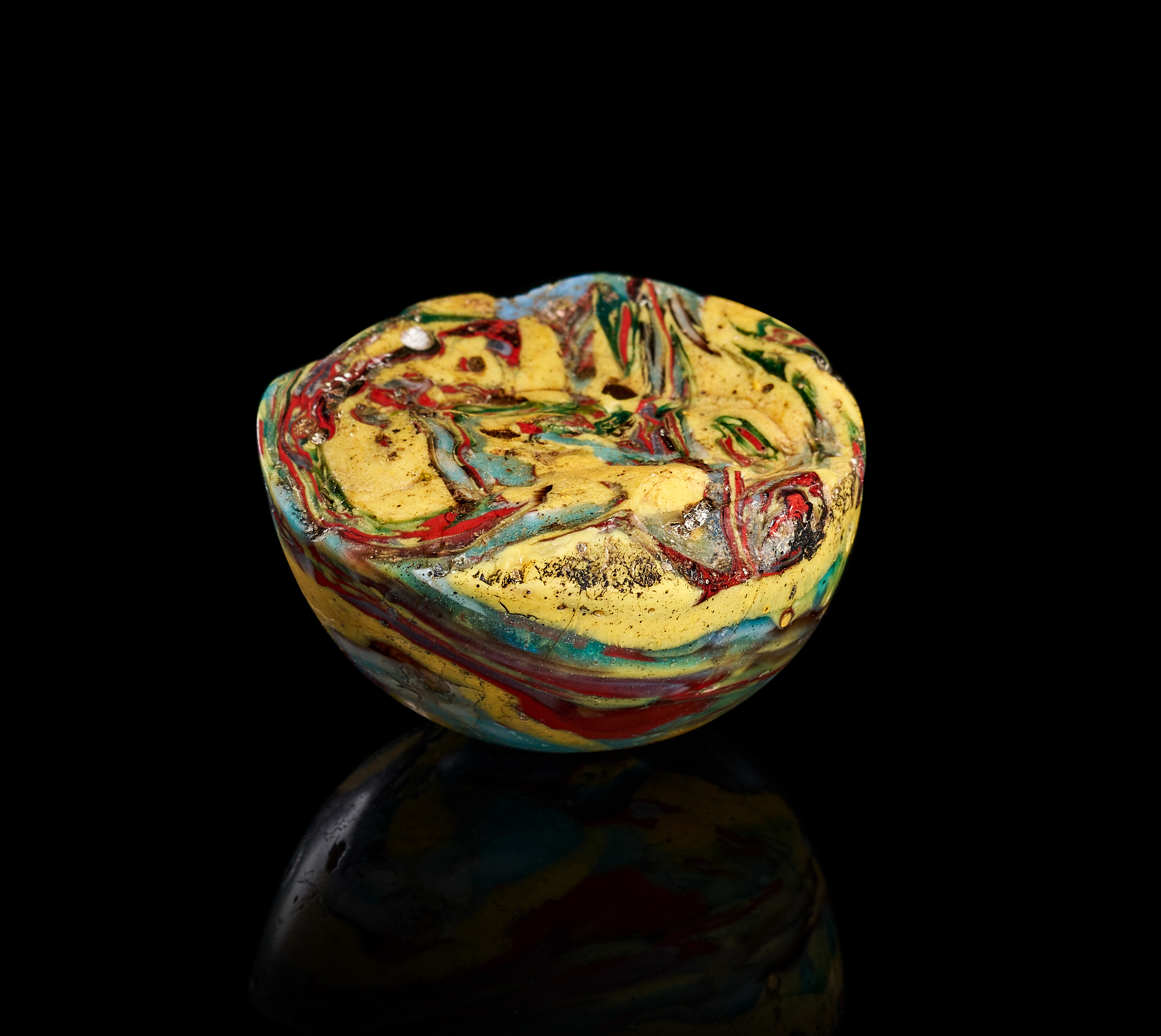 This polychrome marbled glass object is a hemispherical game piece or decorative weight, likely an example of Abbasid mosaic glasswork. The piece is fashioned from multi-colored glass featuring a swirled pattern of yellow, red, blue, and green. It is shaped into a rounded dome with a flat, circular base. The manufacturing process involves the blending of various colored glass elements to achieve the marbled effect. There are no visible markings or inscriptions.