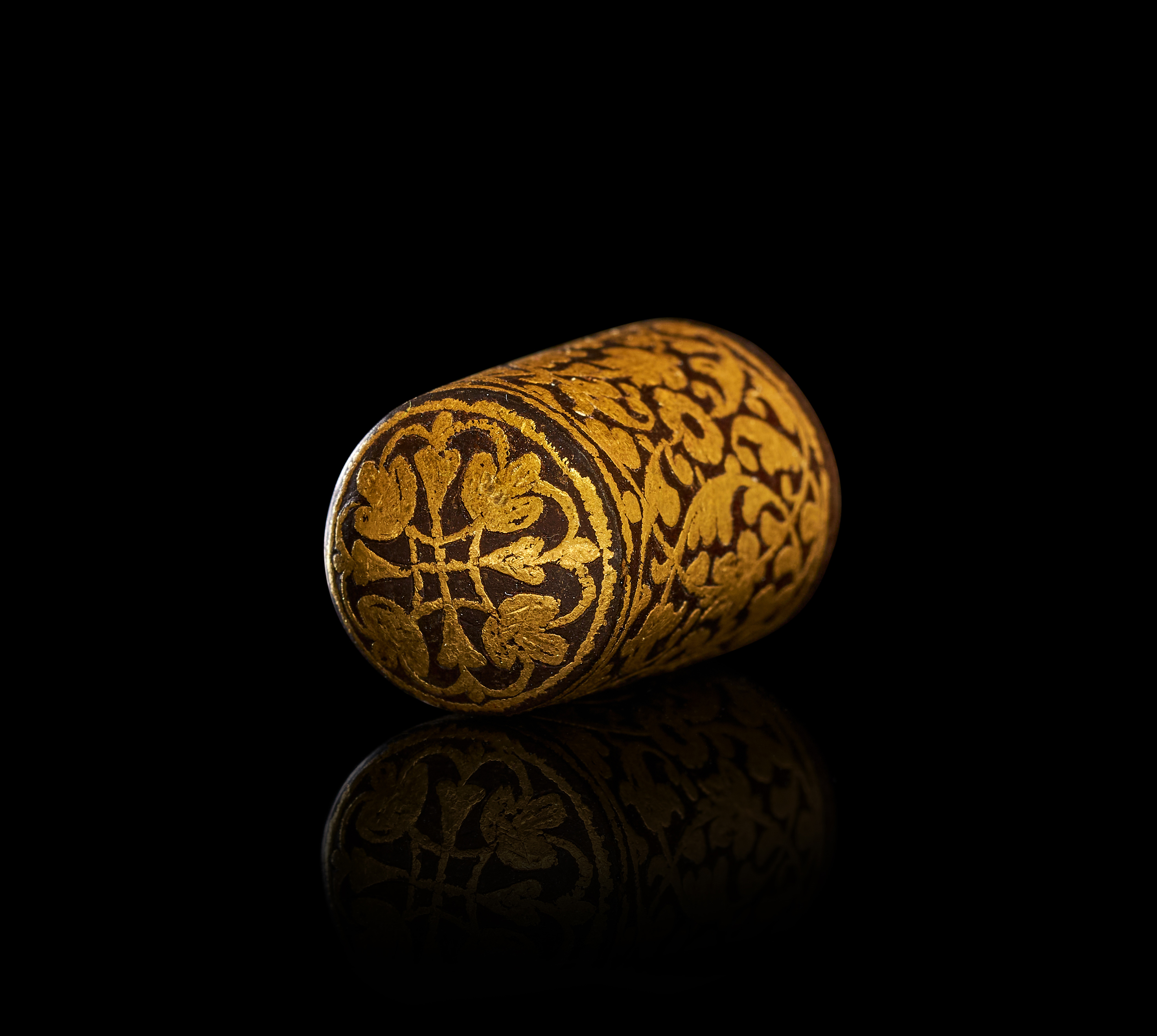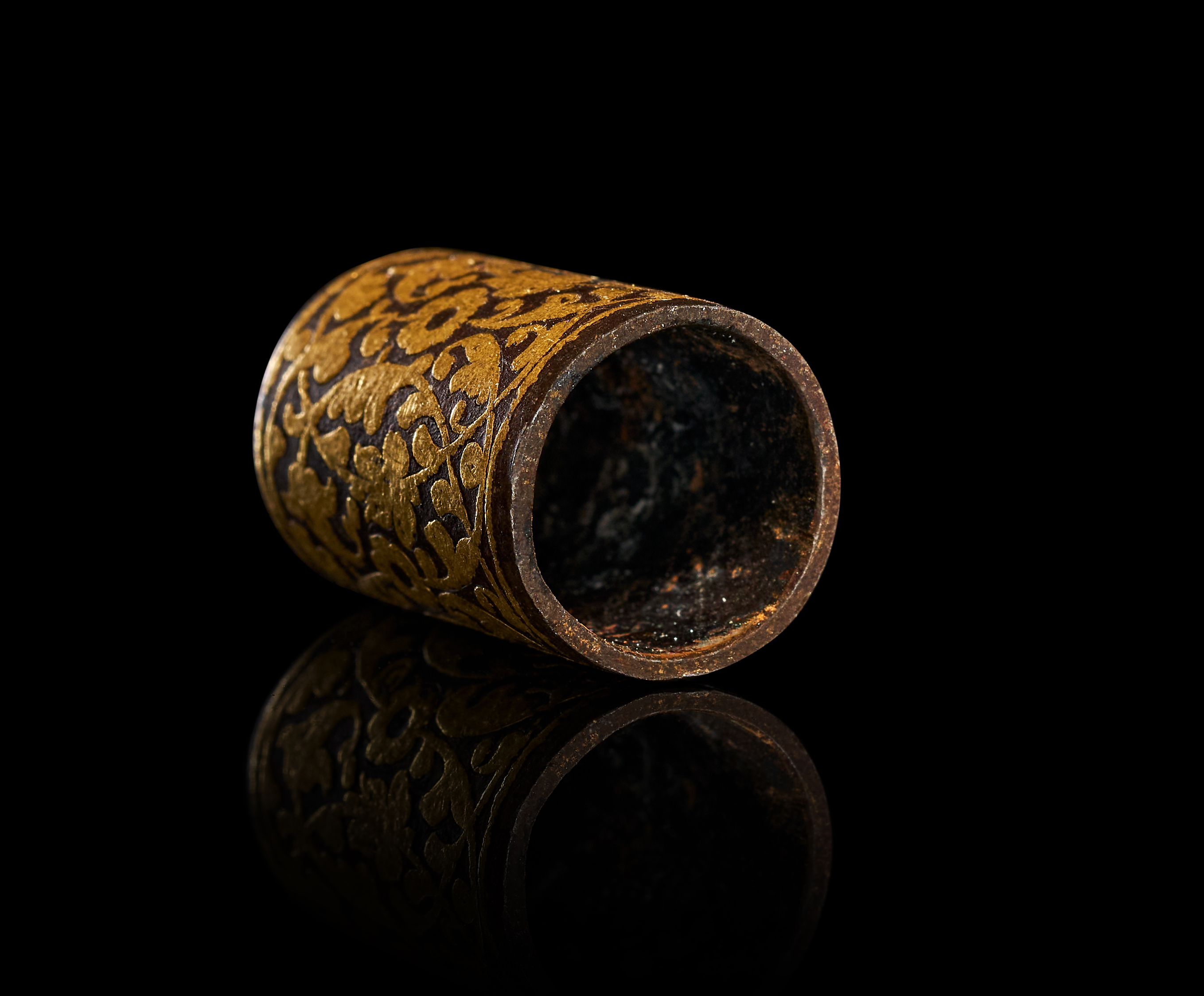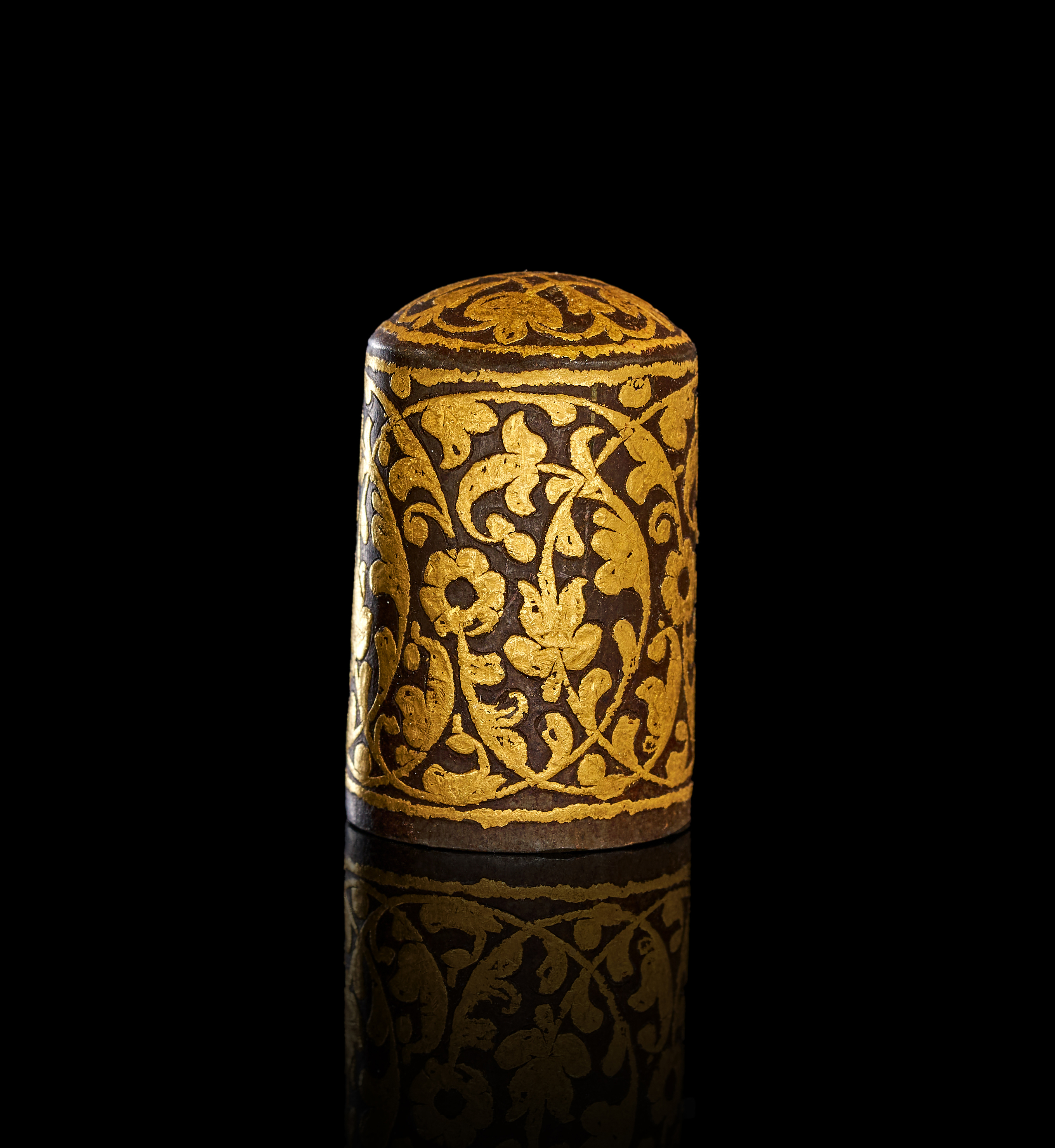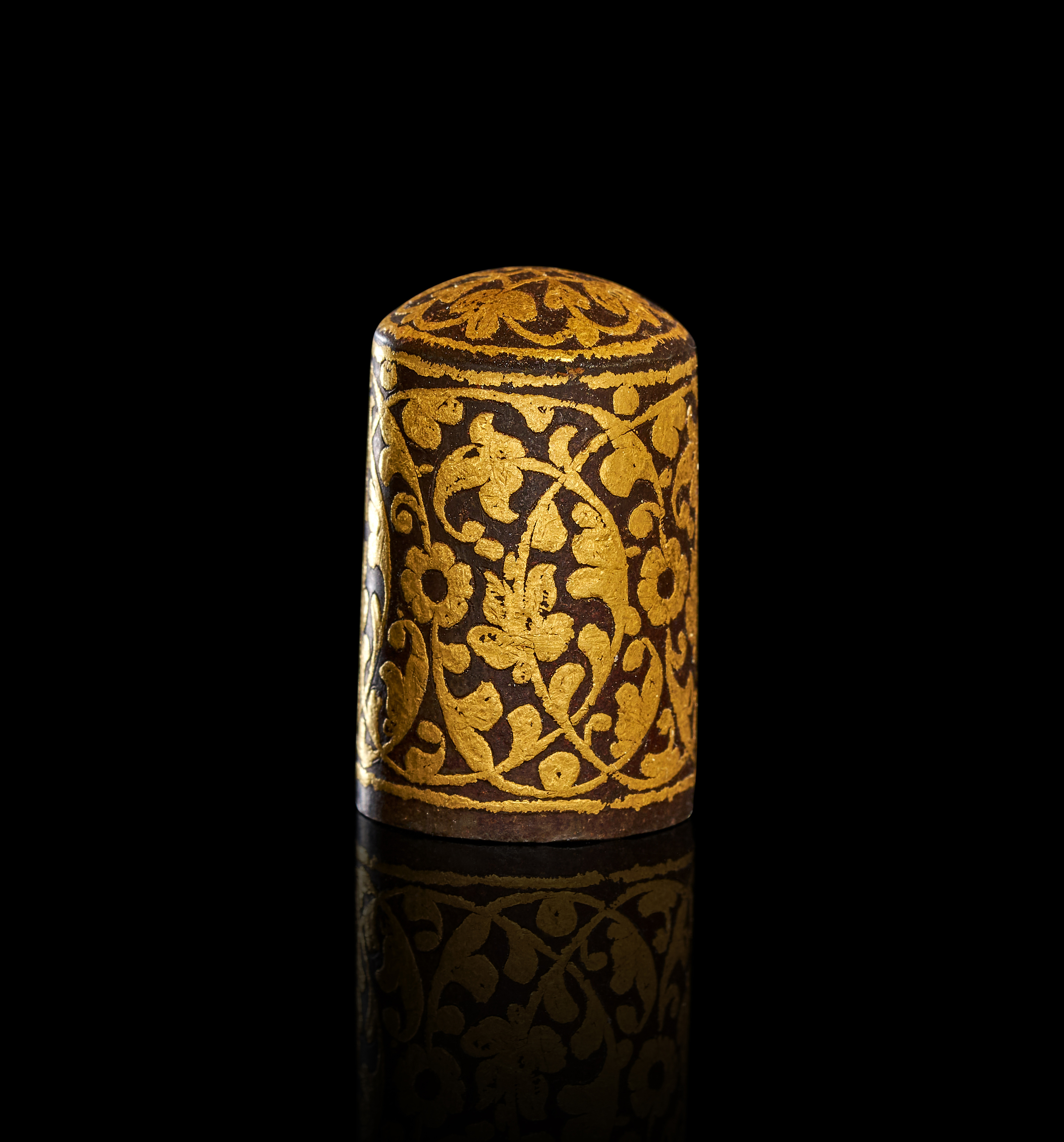 This cylindrical object, possibly of Indo-Persian origin, is constructed of dark, patinated steel with elaborate gold-damascened decoration in the koftgari style. The exterior is ornamented with gold-inlaid floral and foliate scrolls. A radiating foliate motif is centered on the slightly domed top, enclosed within a gold border. The item is hollow with an open base.