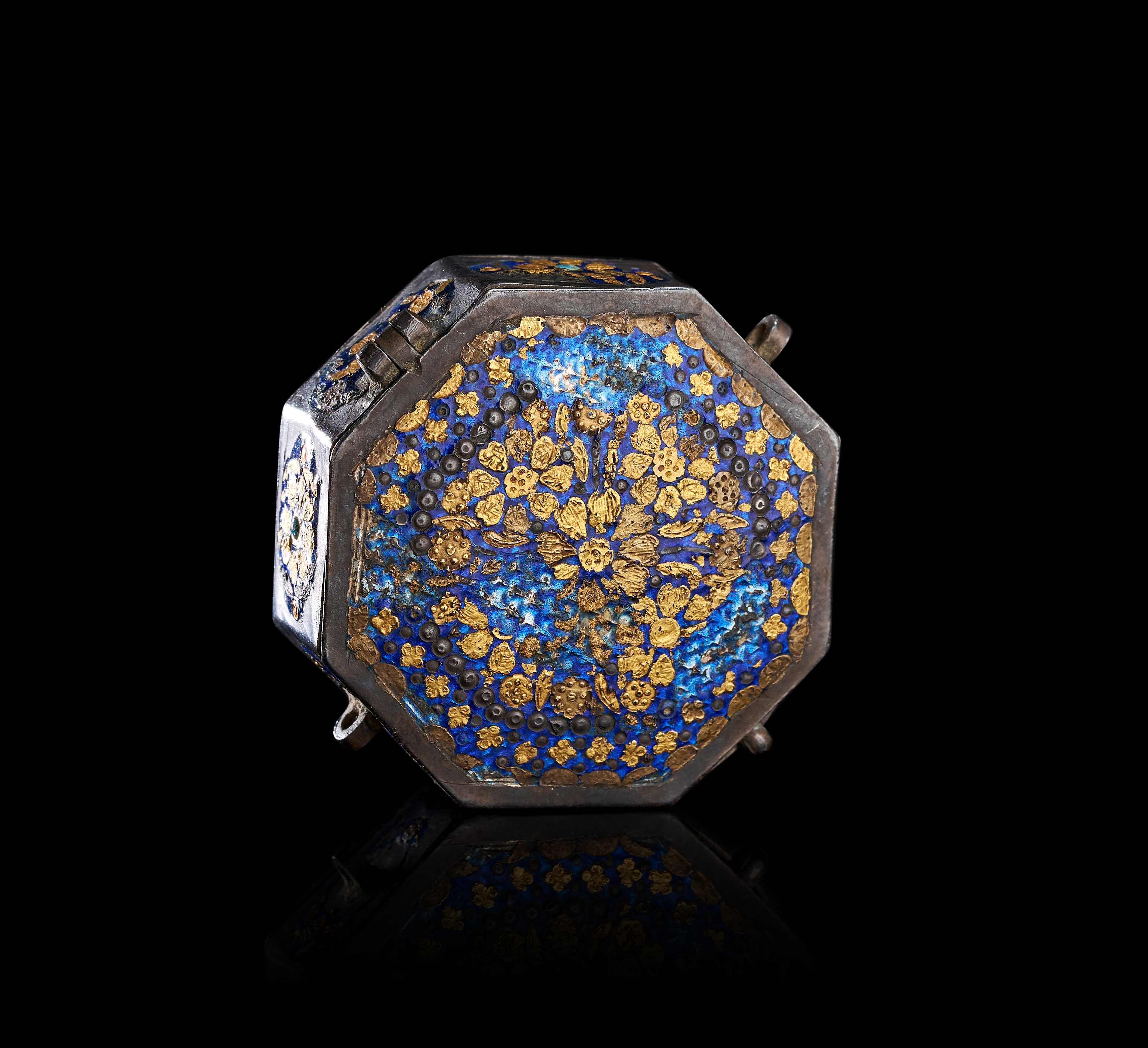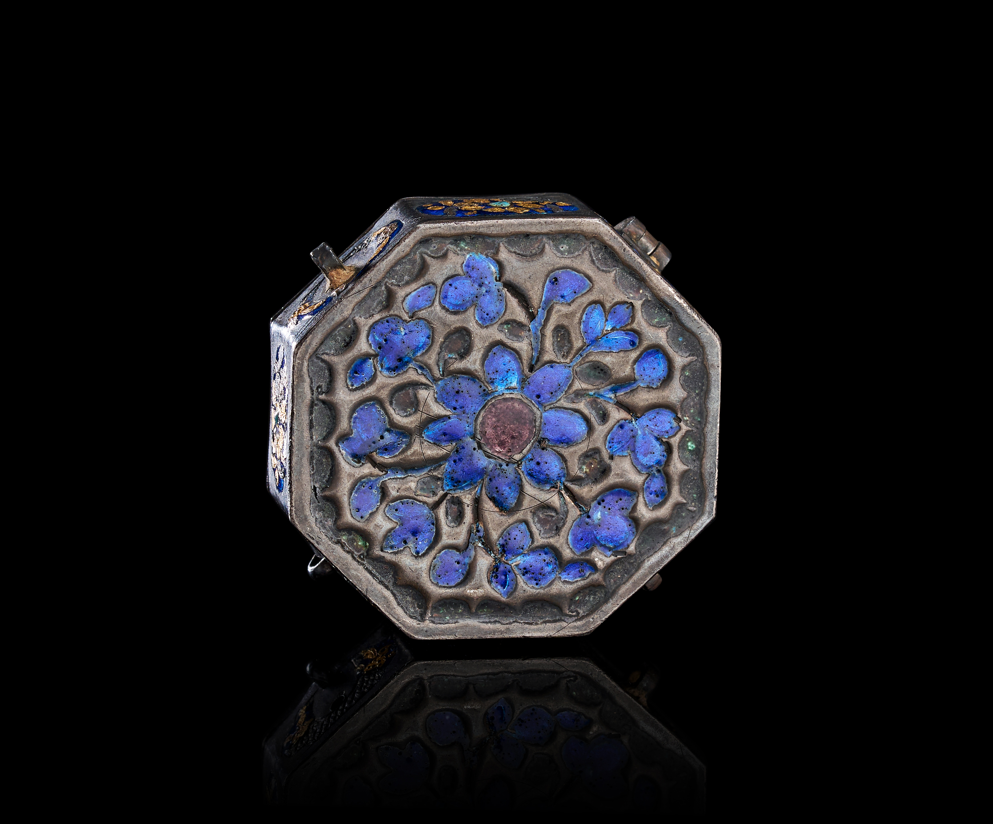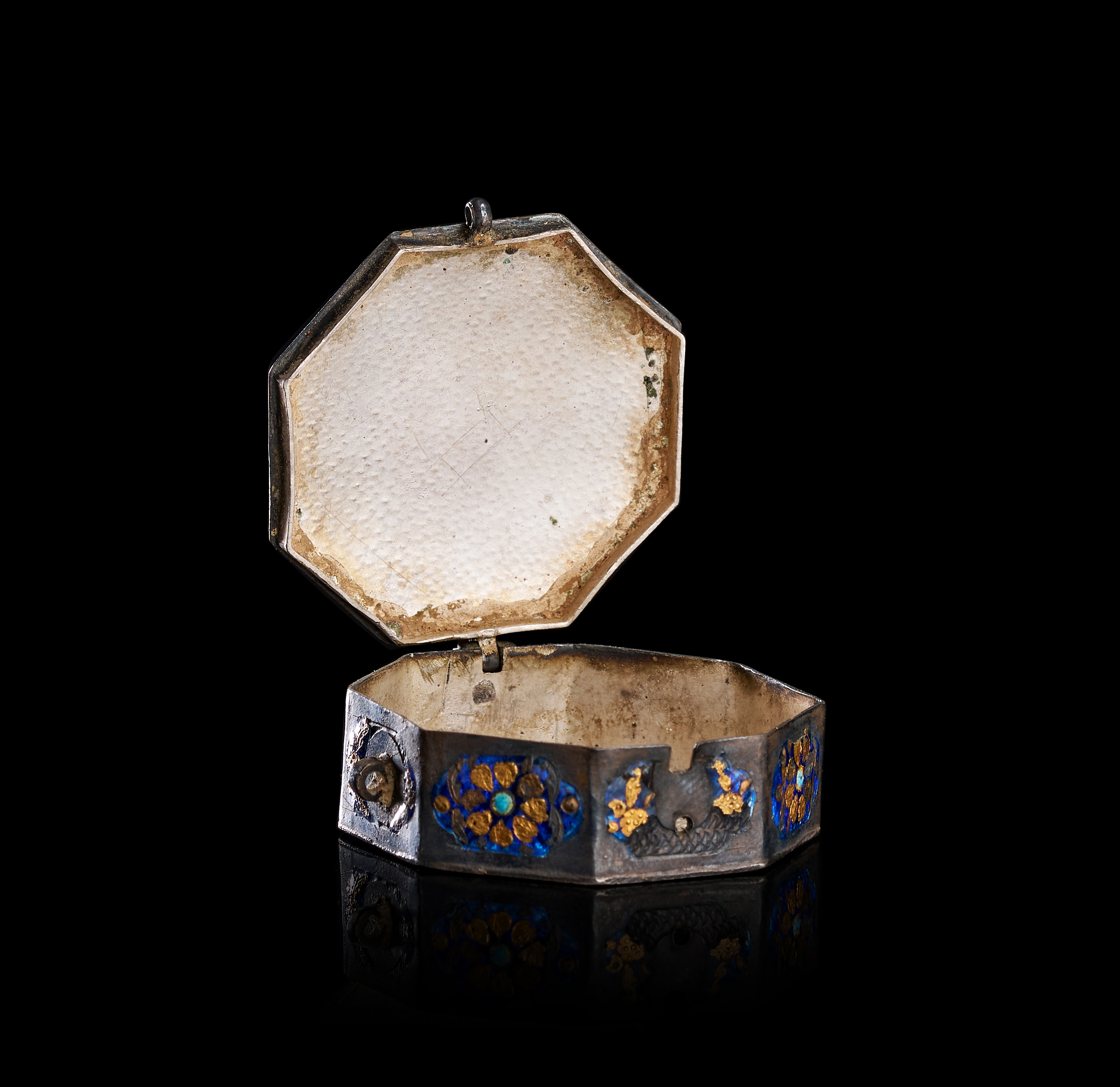 The object is constructed from a silver-toned metal with a hinged lid and a hammered interior surface. The exterior is decorated with blue enamel and gold-toned metal overlays. The lid features a central floral motif surrounded by a border of dark circular accents. The side panels contain oval cartouches with blue enamel and gold-toned floral designs, some of which are inset with small turquoise-colored stones. The base exhibits a recessed floral design in blue enamel with a central amethyst-toned cabochon. Small metal loops are attached to the sides for suspension.