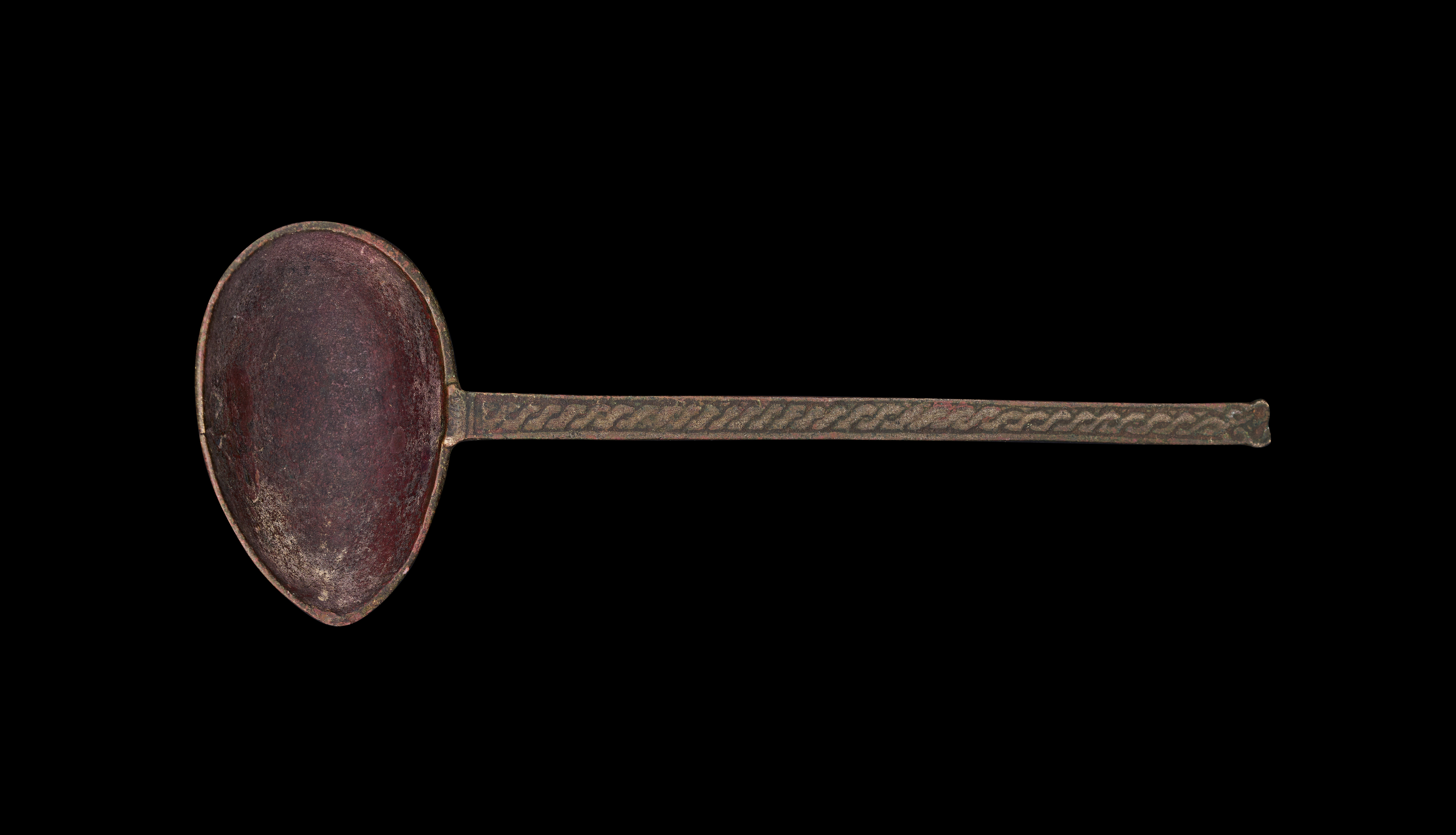 This small bronze Khorasan spoon is cast from a copper alloy and features a deep, teardrop-shaped bowl joined to a long, flat, straight handle. The handle is decorated on both sides with a repeating, incised guilloche or wave pattern, while the reverse of the bowl shows chased foliate or scrollwork motifs. A series of indistinct characters are visible along the upper rim on the exterior of the bowl. The construction and decorative program are characteristic of metalwork from the Khorasan region.