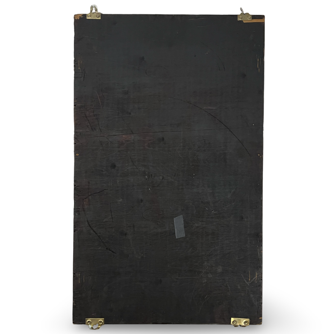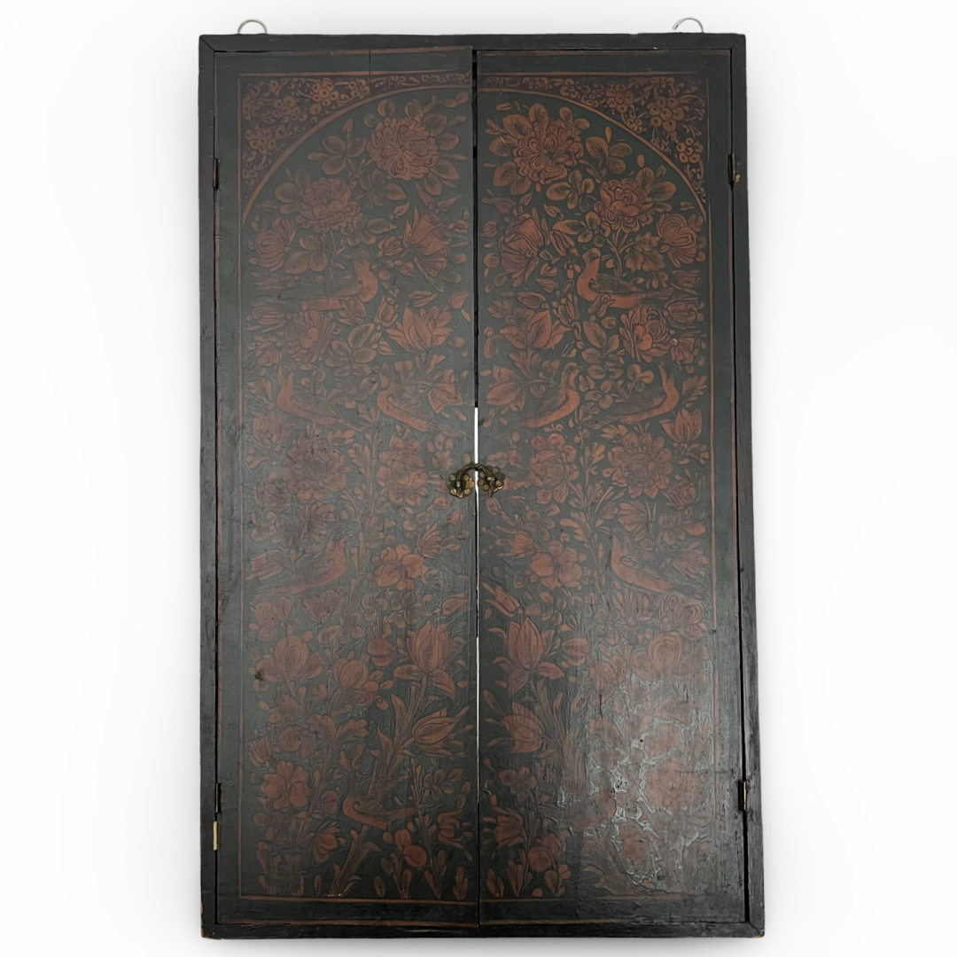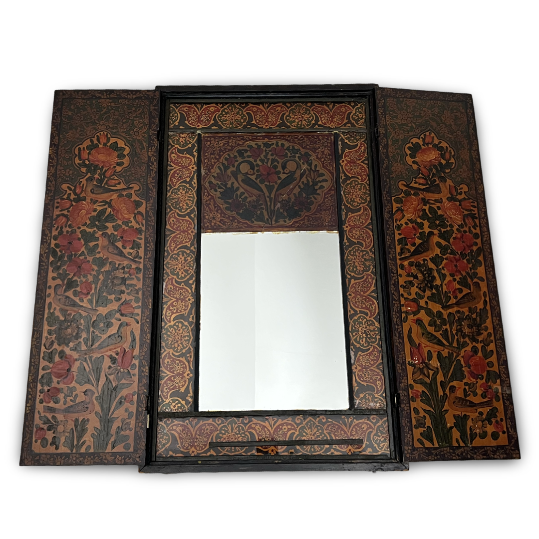 A Persian Qajar style lacquer mirror case of rectangular form constructed from wood. The exterior features two folding doors decorated in dark lacquer with reddish brown floral and bird motifs in the Gol o Morgh style, secured by a small metal latch. The interior reveals a central rectangular mirror inset within decorative borders and panels featuring hand painted birds and botanical designs in a palette of red, orange, yellow, and green. The reverse of the case consists of a plain dark stained wood panel fitted with four metal hanging loops.