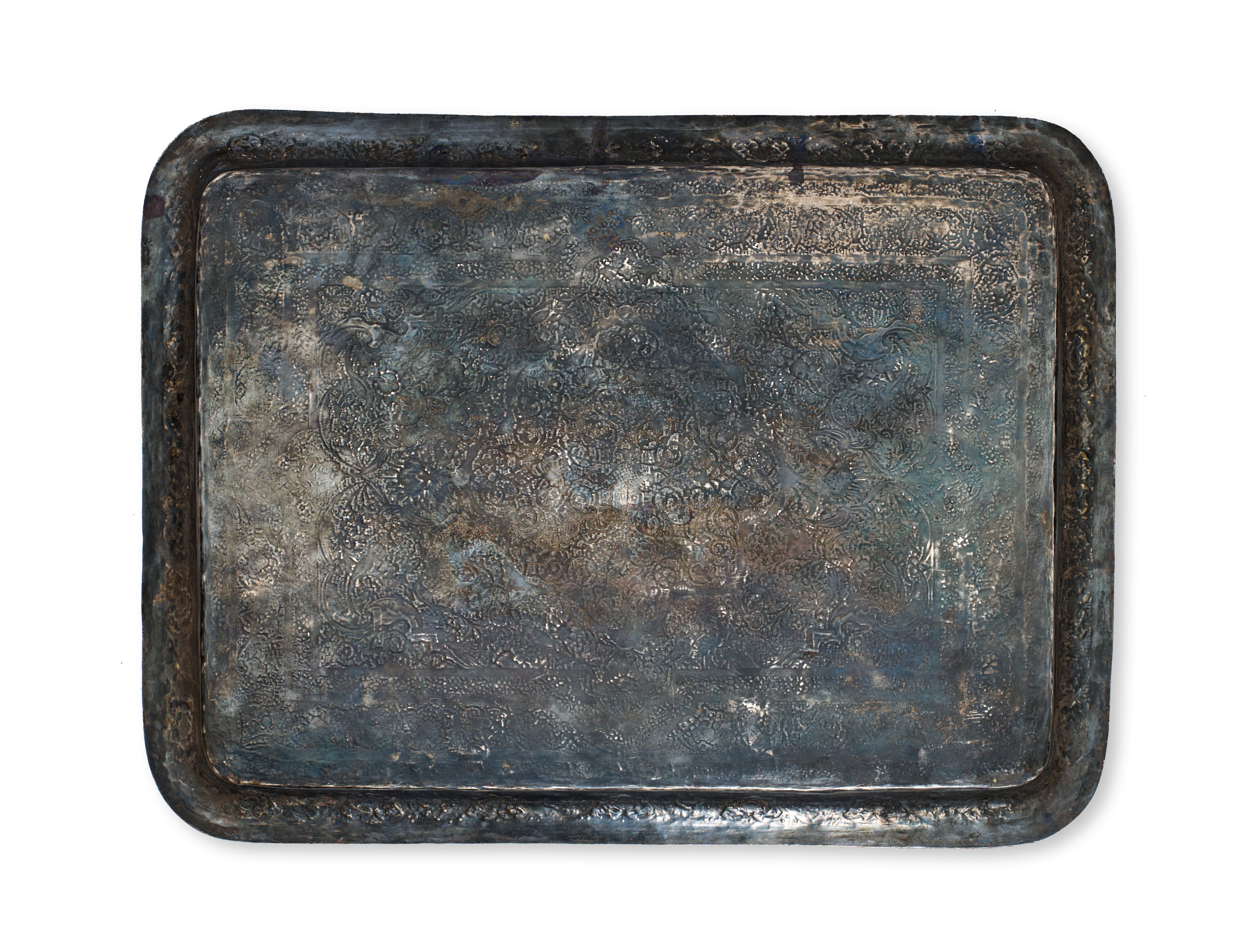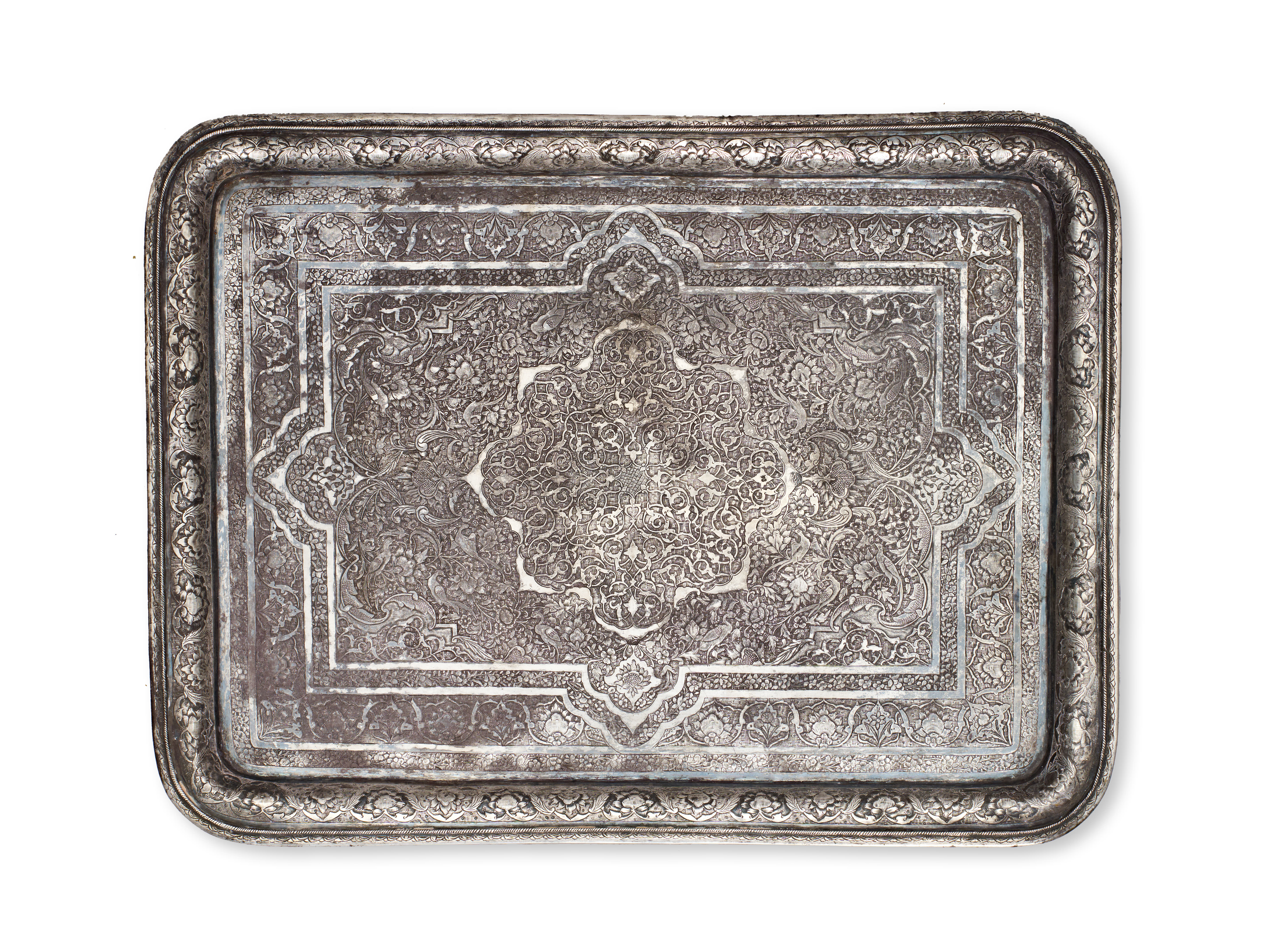 This mid-20th century Iranian silver tray is a signed example of Isfahan craftsmanship. The rectangular form features a densely hand-engraved surface in the traditional ghalamzani style. The composition is centered by a polylobed medallion set within a field of intricate arabesque scrolling foliate patterns and gol-o-morgh bird-and-flower motifs. This central field is enclosed by multiple decorative borders of varying floral and foliate patterns, terminating in a raised, gadrooned rim. The tray bears a signature, consistent with mid-century Isfahan production.