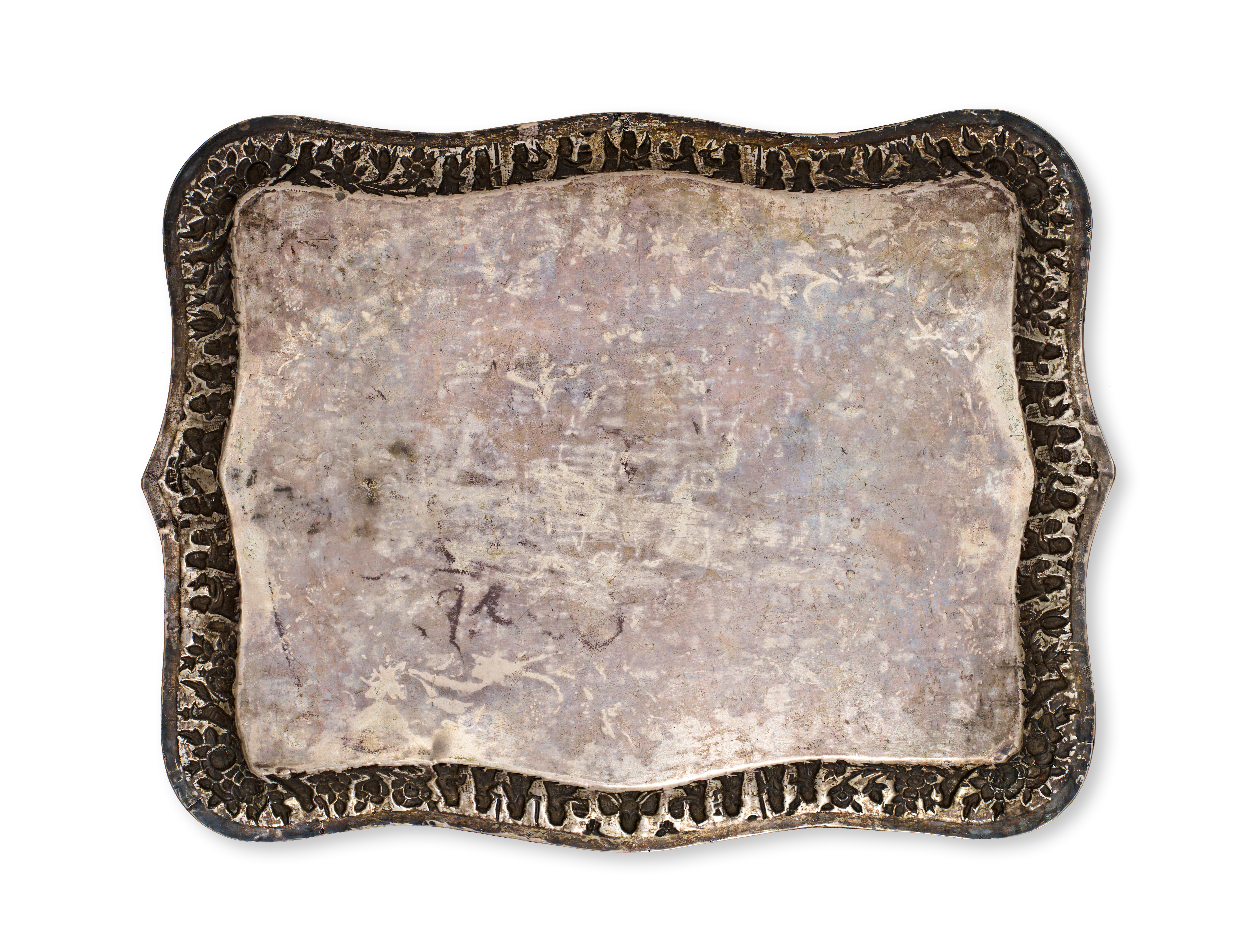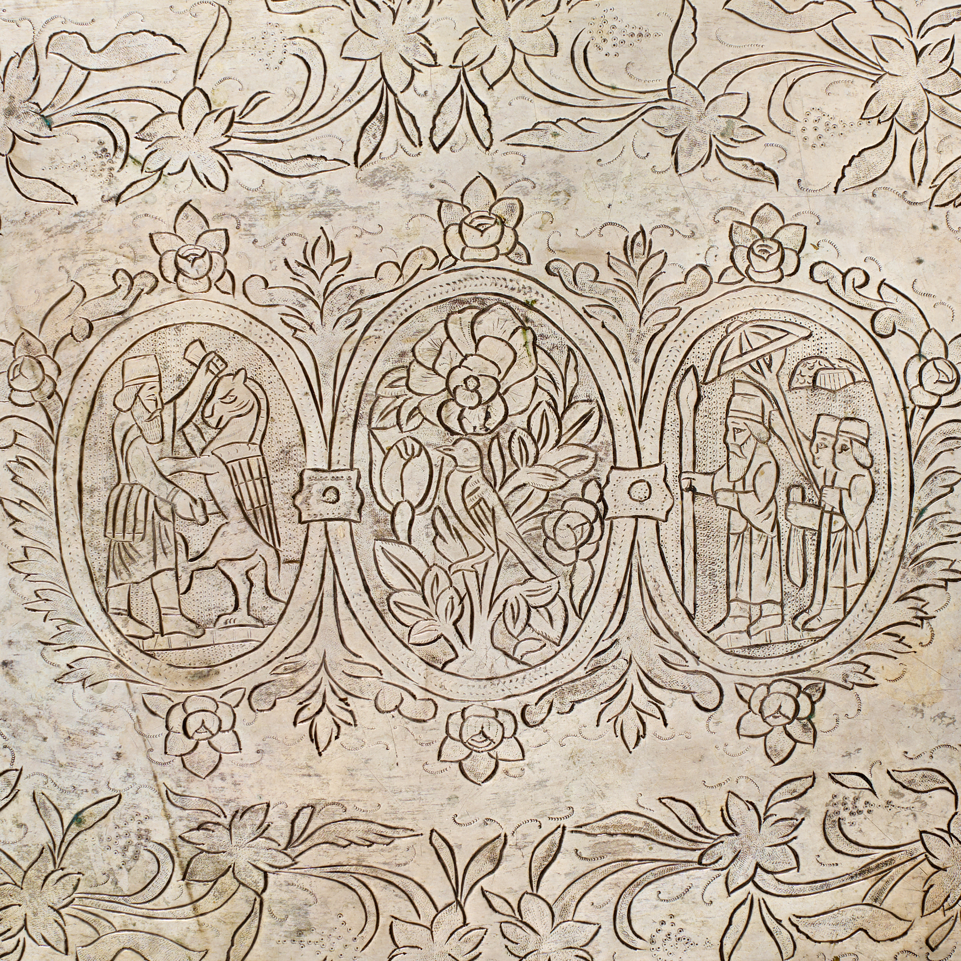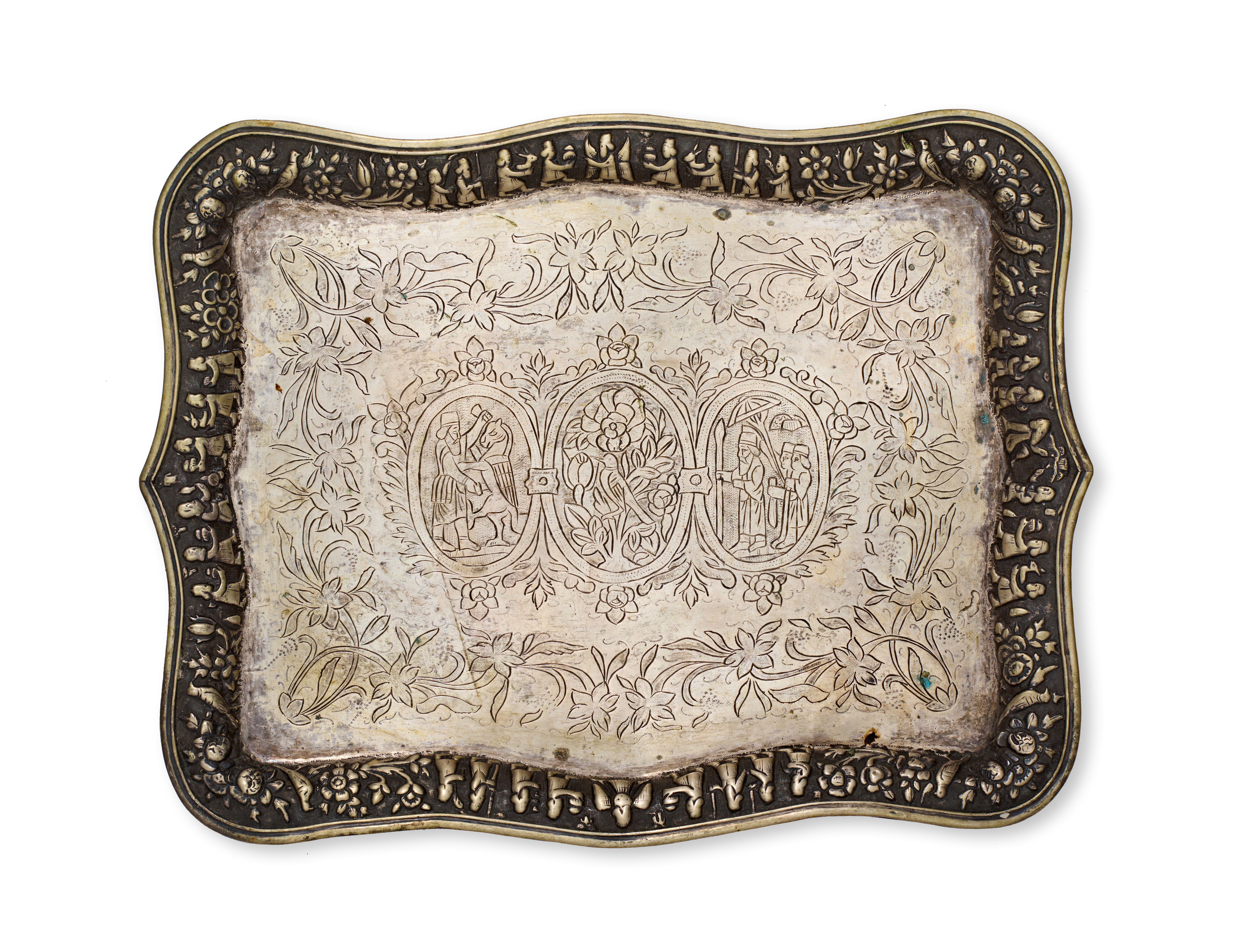 A Persian Shiraz silver tray of rectangular form with a scalloped and shaped rim. The wide border is decorated in repousse with a series of human figures and floral motifs. The central field contains three engraved oval medallions. The left medallion depicts a figure in ancient Persian-style attire slaying a winged mythical beast. The center medallion features a gol-o-bolbol rose and nightingale motif. The right medallion shows a royal audience scene under a parasol. The medallions are surrounded by dense foliate and floral engraving.