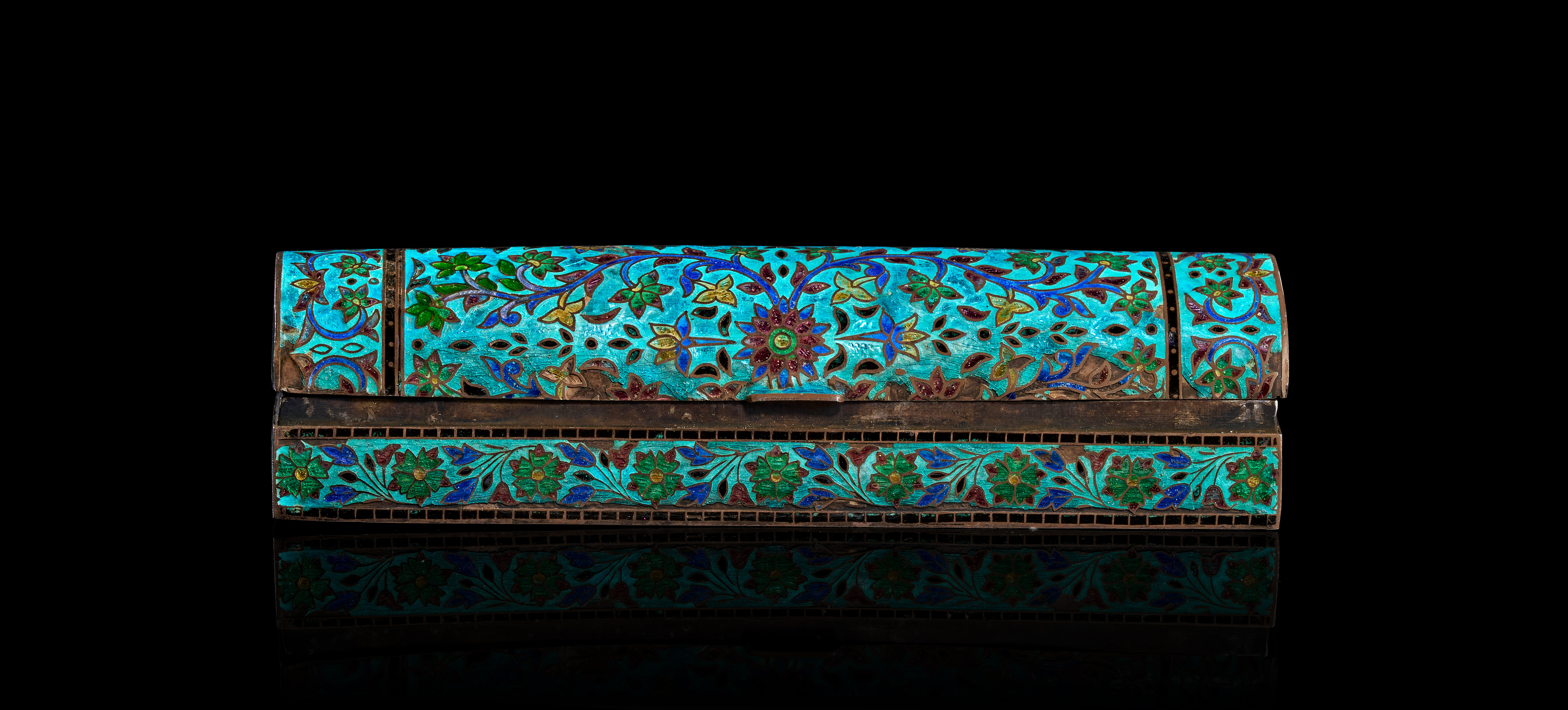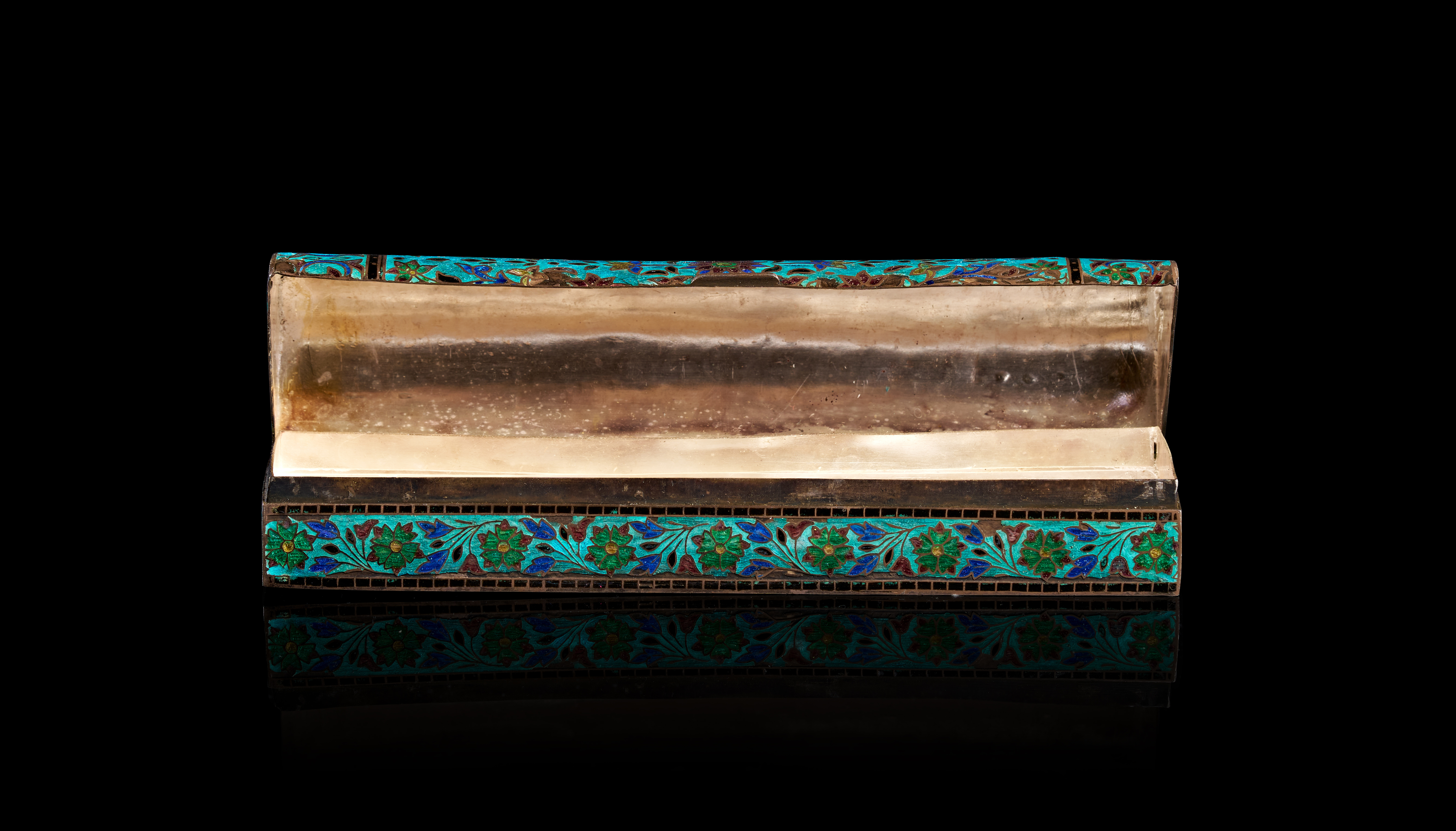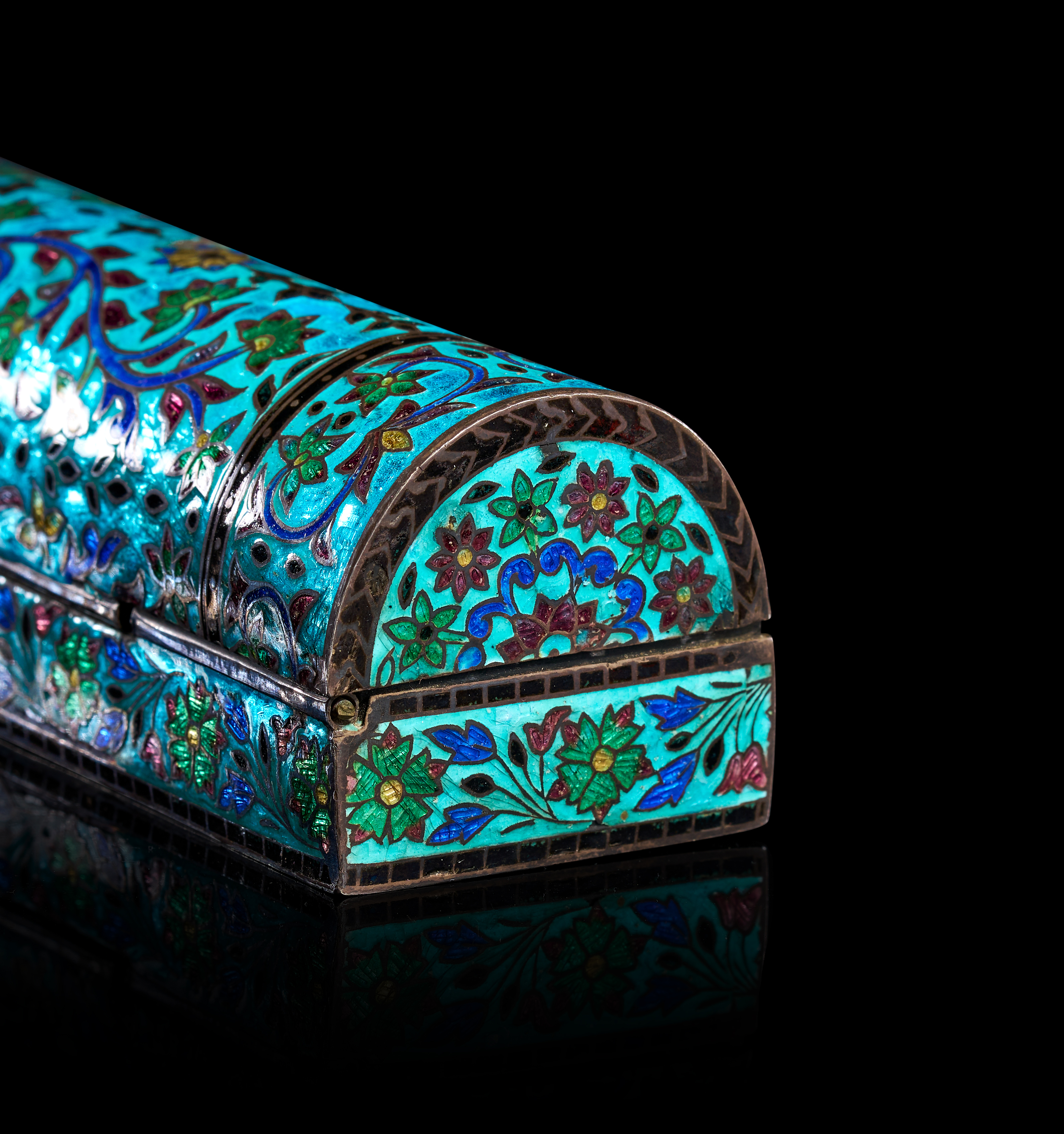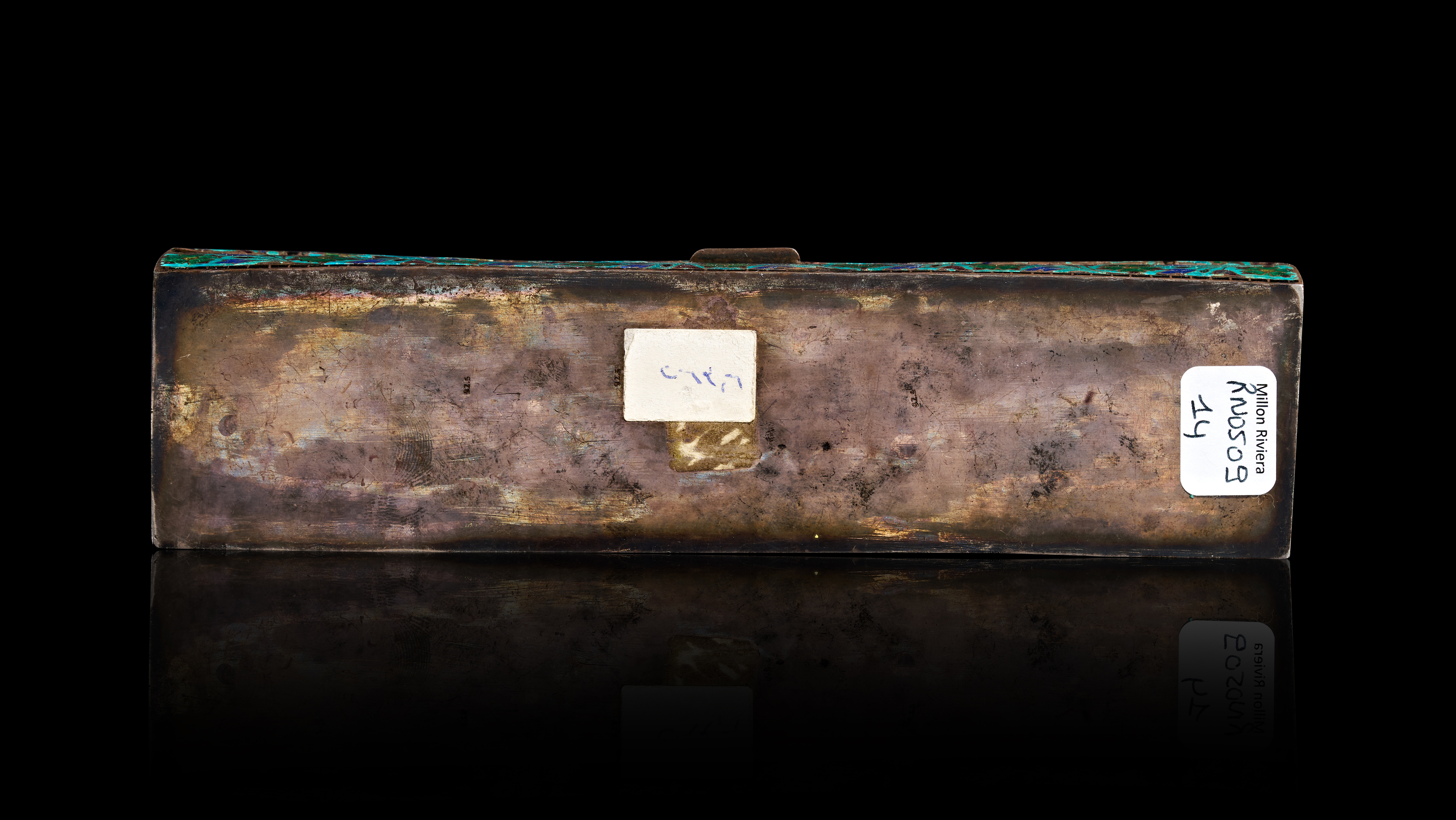 A silver and cloisonne enamel box of rectangular form with a domed hinged lid. The exterior is decorated with polychrome floral and foliate motifs in green, dark red, and blue against a turquoise blue ground. The underside is stamped with a 925 hallmark and retains two paper auction labels, one marked Millon Riviera RN0509 14. The interior and base are constructed of silver.