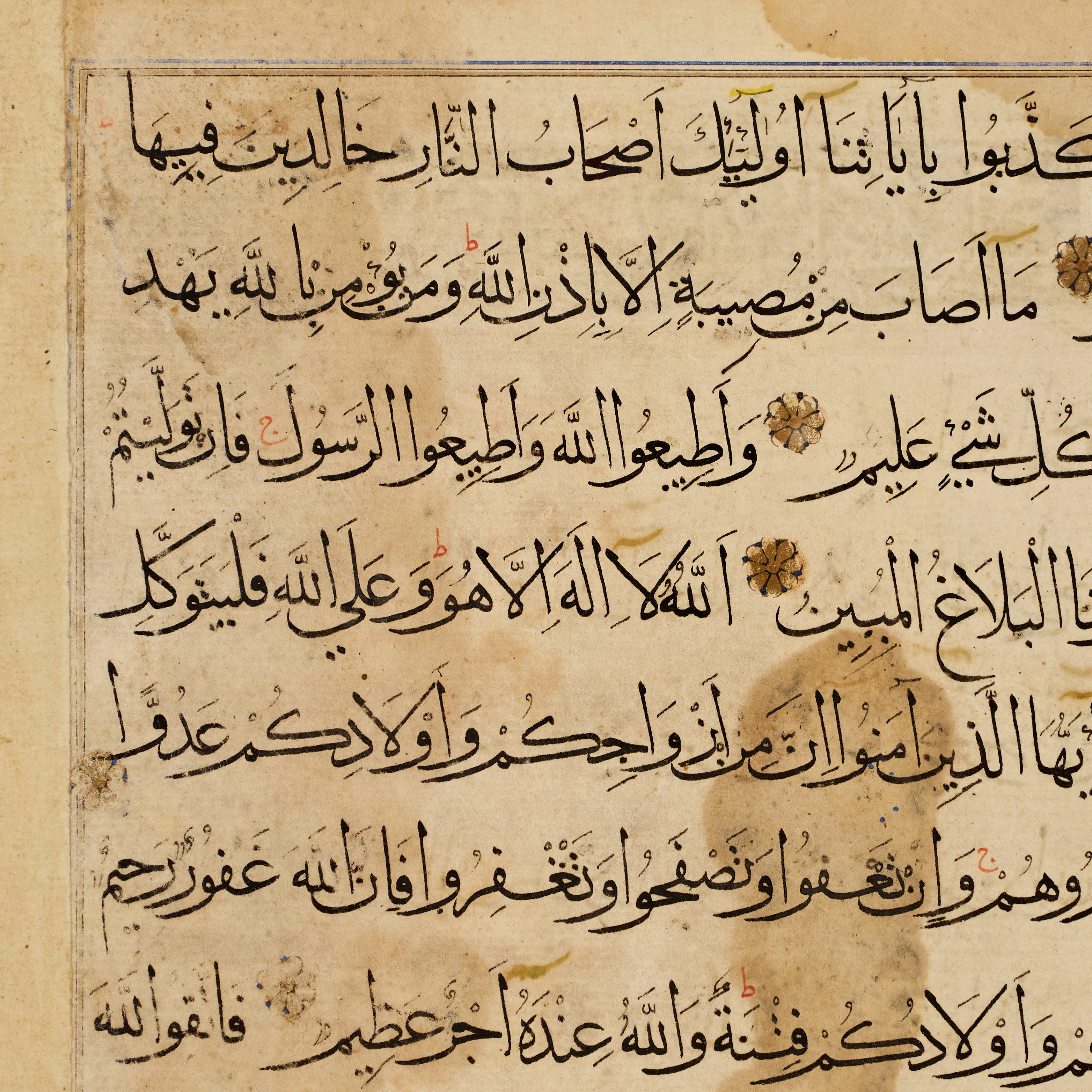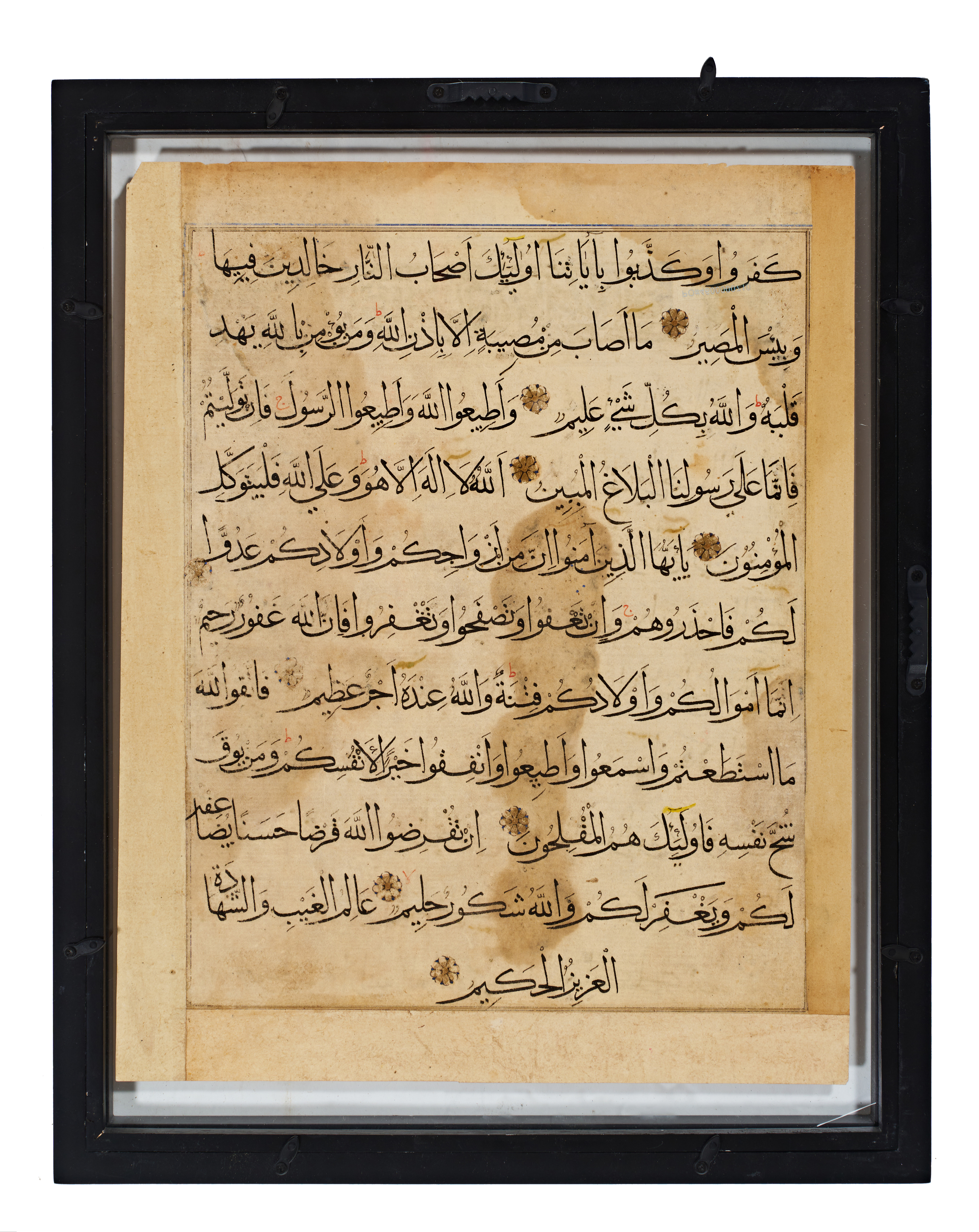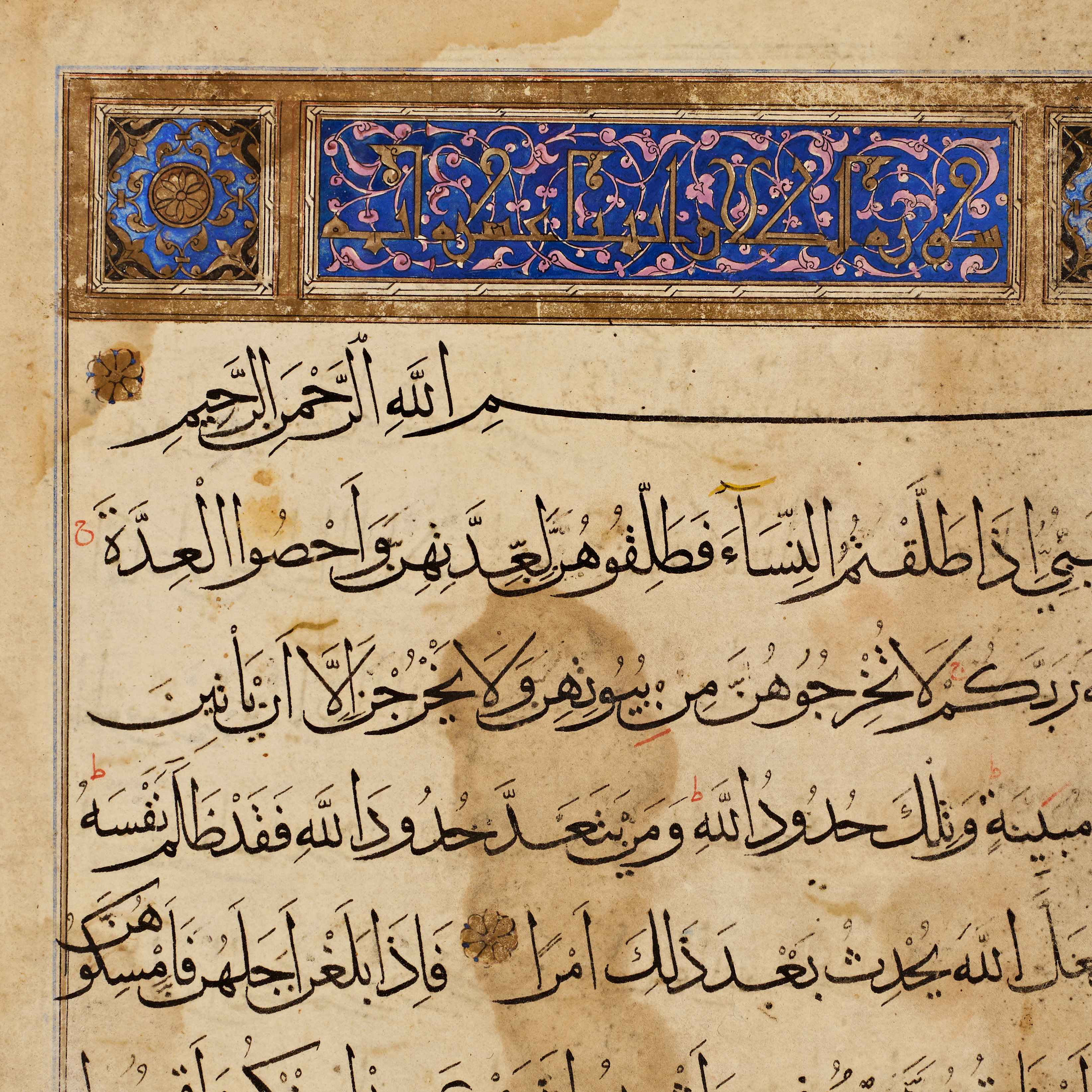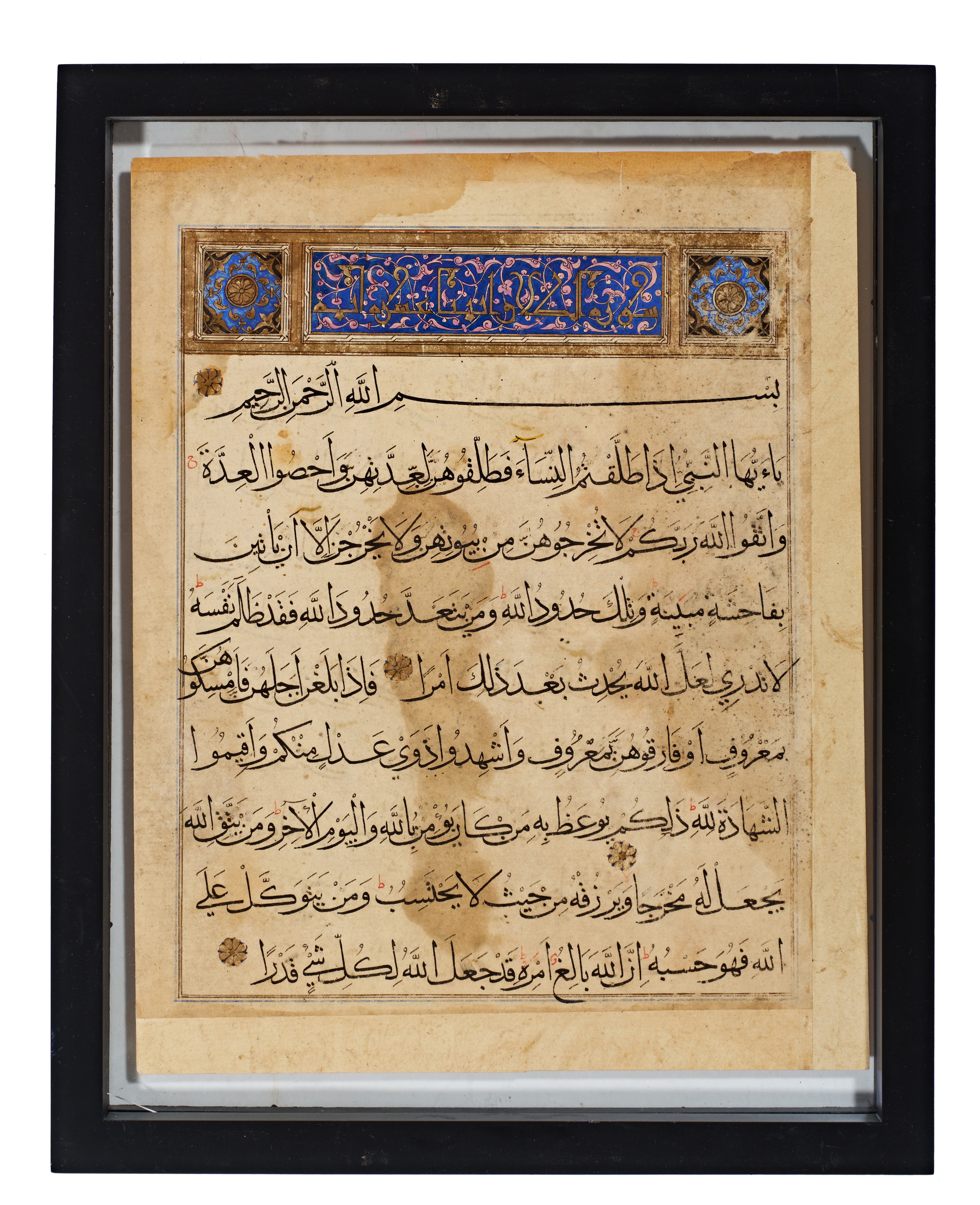 One side presents an illuminated heading for Surat al-Talaq (Chapter of Divorce), executed in blue, gold, and pink pigments with floral and geometric motifs. The text includes the Basmala and is punctuated throughout with small, gold-leaf floral verse markers. The reverse side continues the script in the same hand with additional rosettes. The leaf is housed in a modern black frame with a double-sided glass mount for viewing both recto and verso.