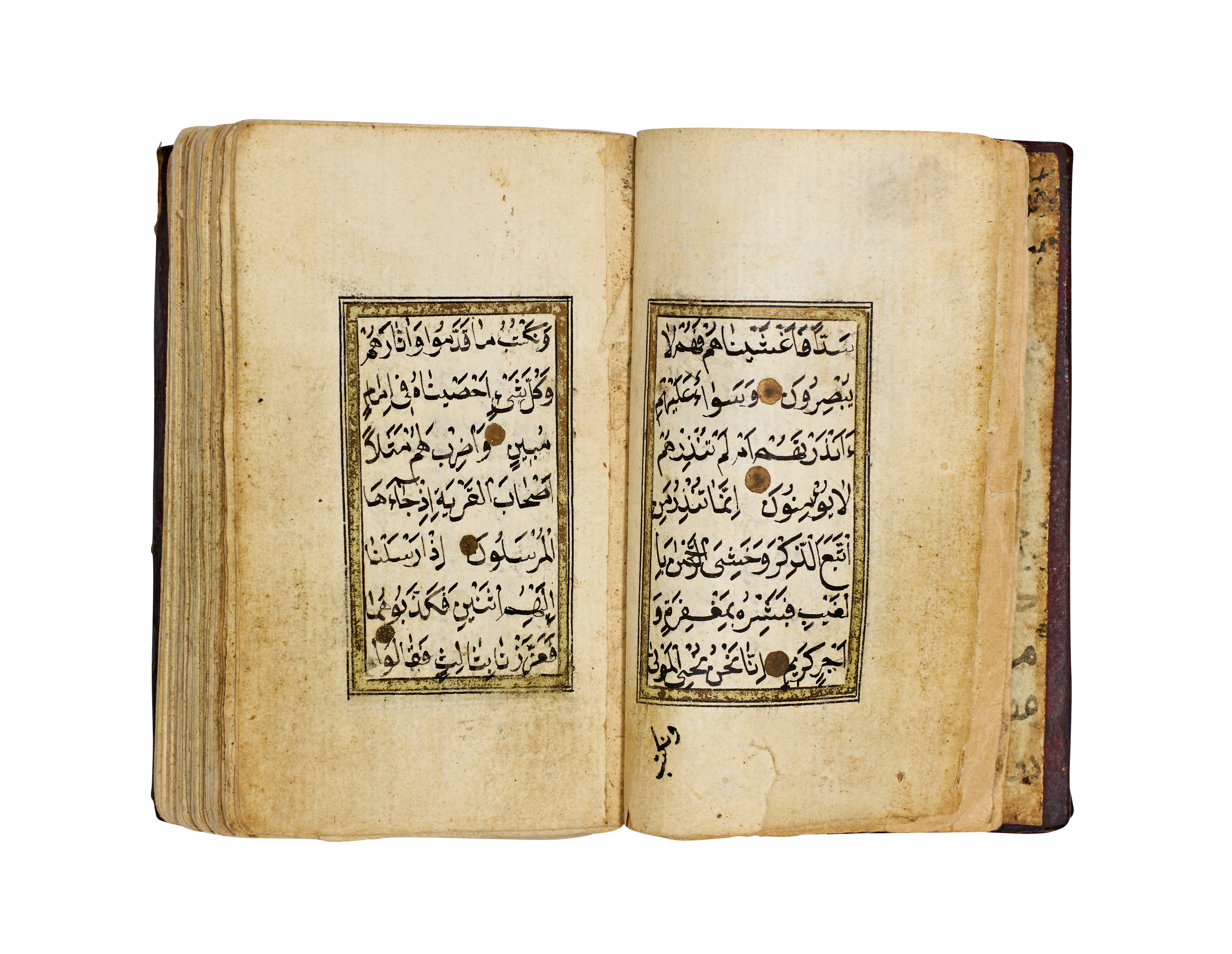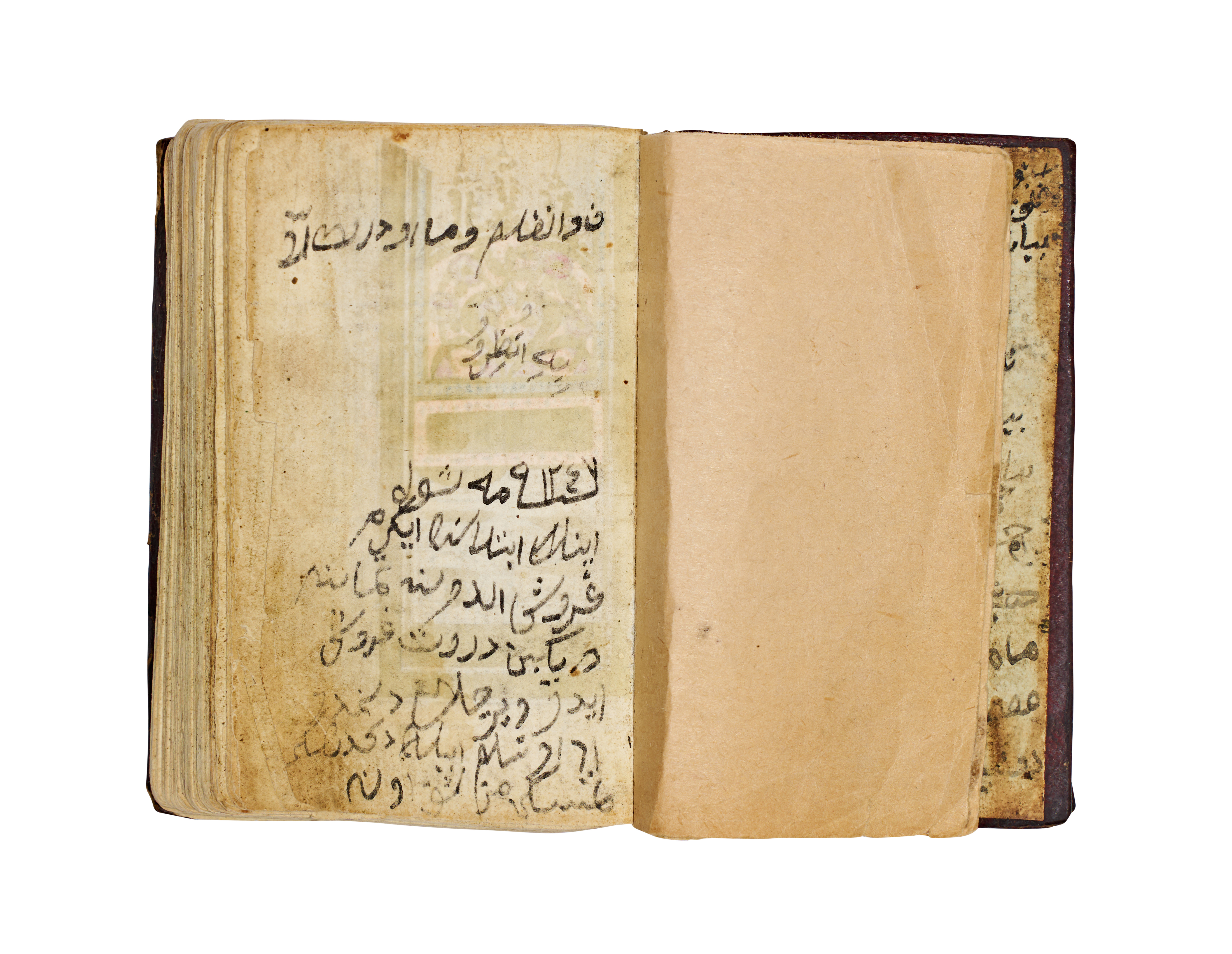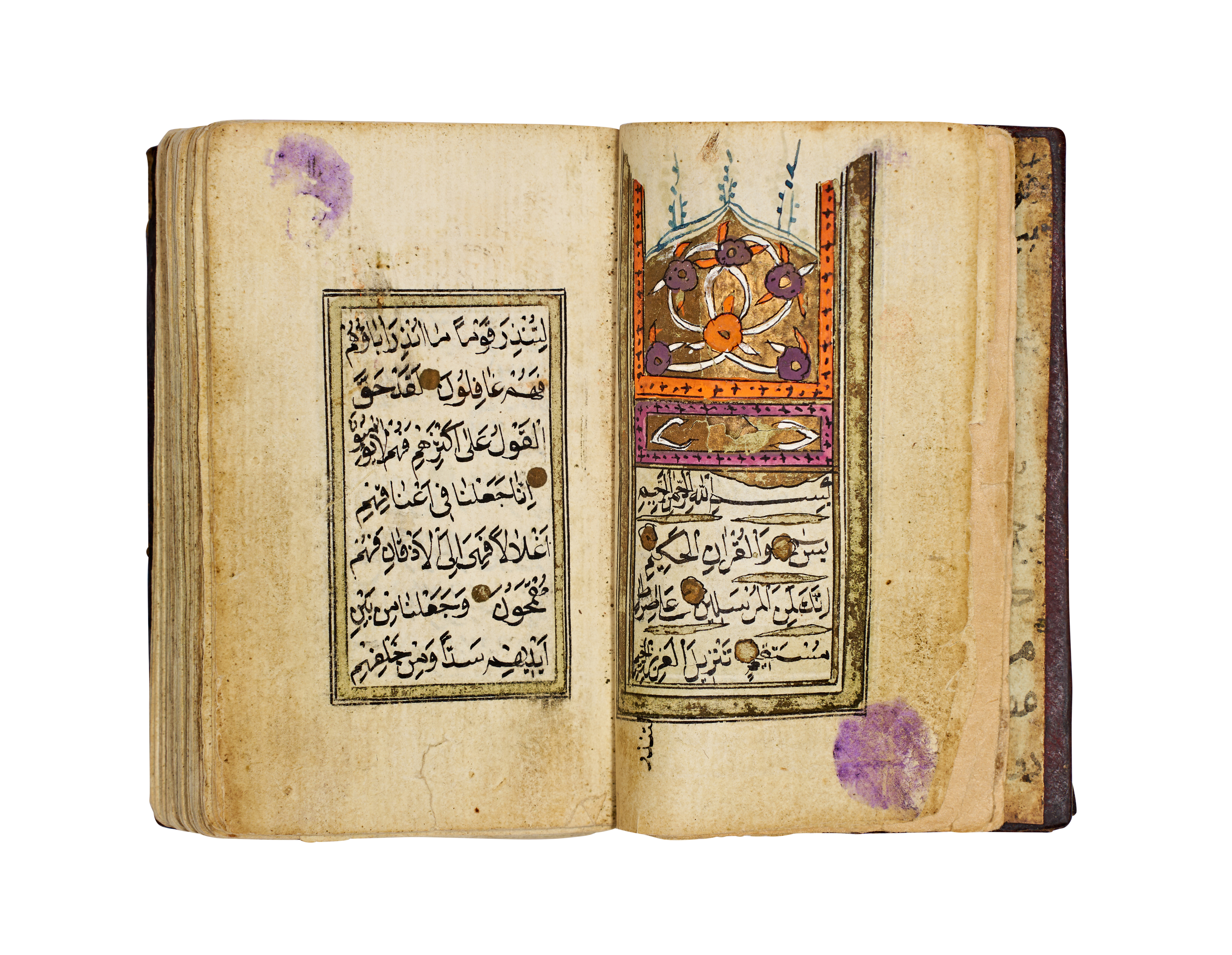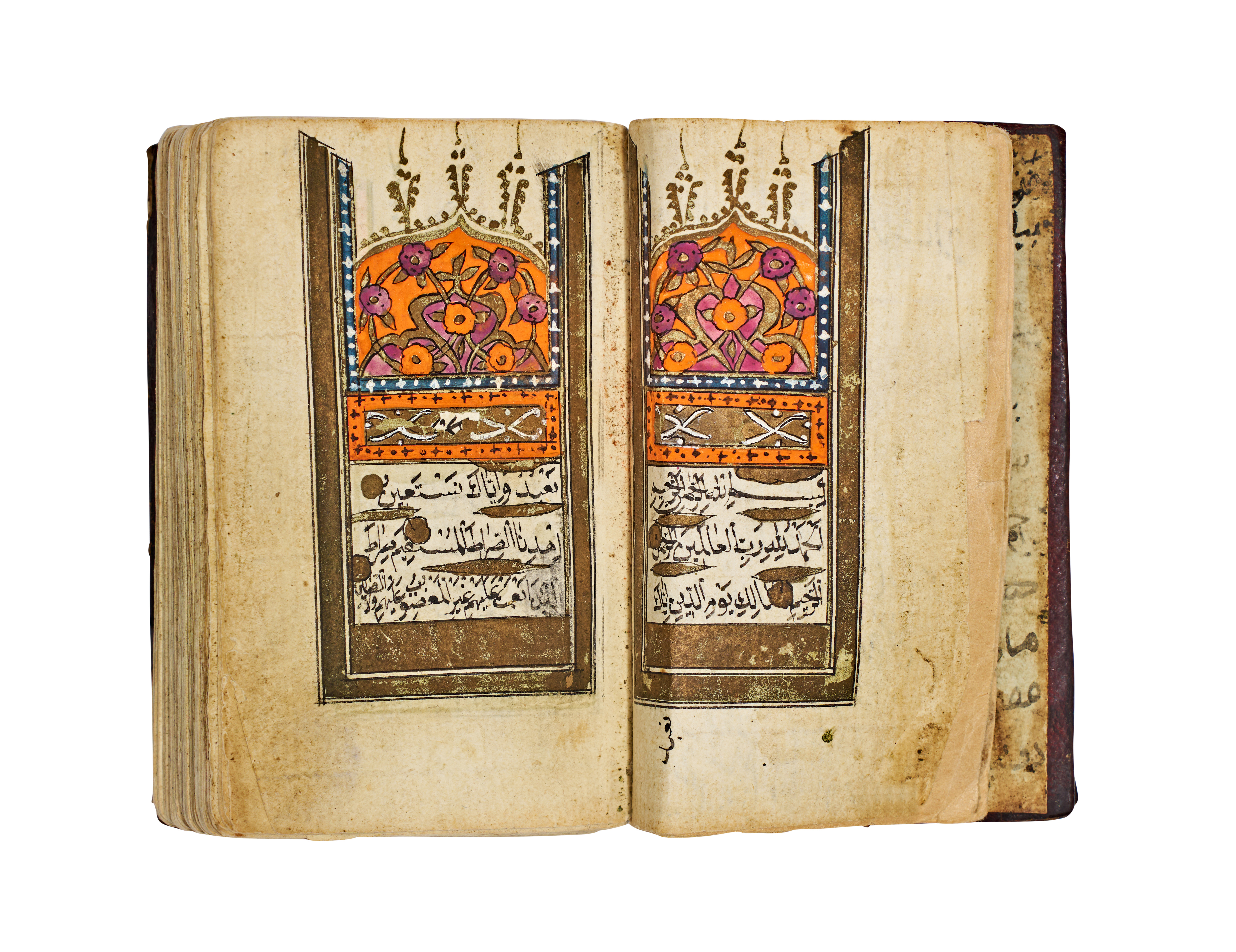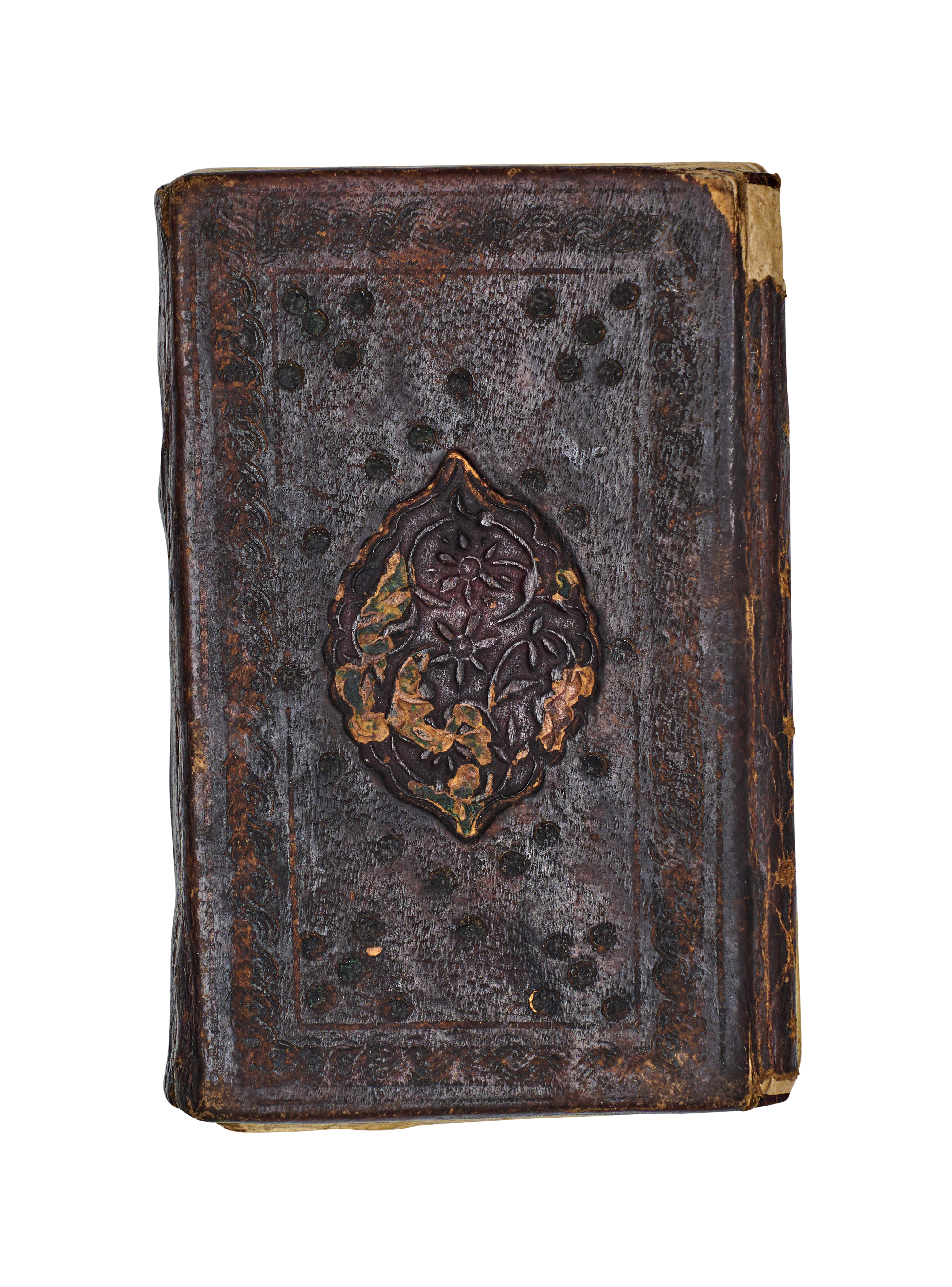 This Islamic illuminated manuscript is an Ottoman prayer book or Quranic selection, likely dating to the 19th century. The volume is bound in dark brown tooled leather featuring a central floral medallion and stamped borders. The interior consists of paper leaves with text hand-written in black ink using a formal Naskh script. Decoration includes gold-leaf verse markers and polychrome illuminations with stylized floral and geometric motifs in shades of orange, purple, and gold. The endpapers contain informal handwritten notes in Ottoman Turkish, including text referencing the 1200s AH.