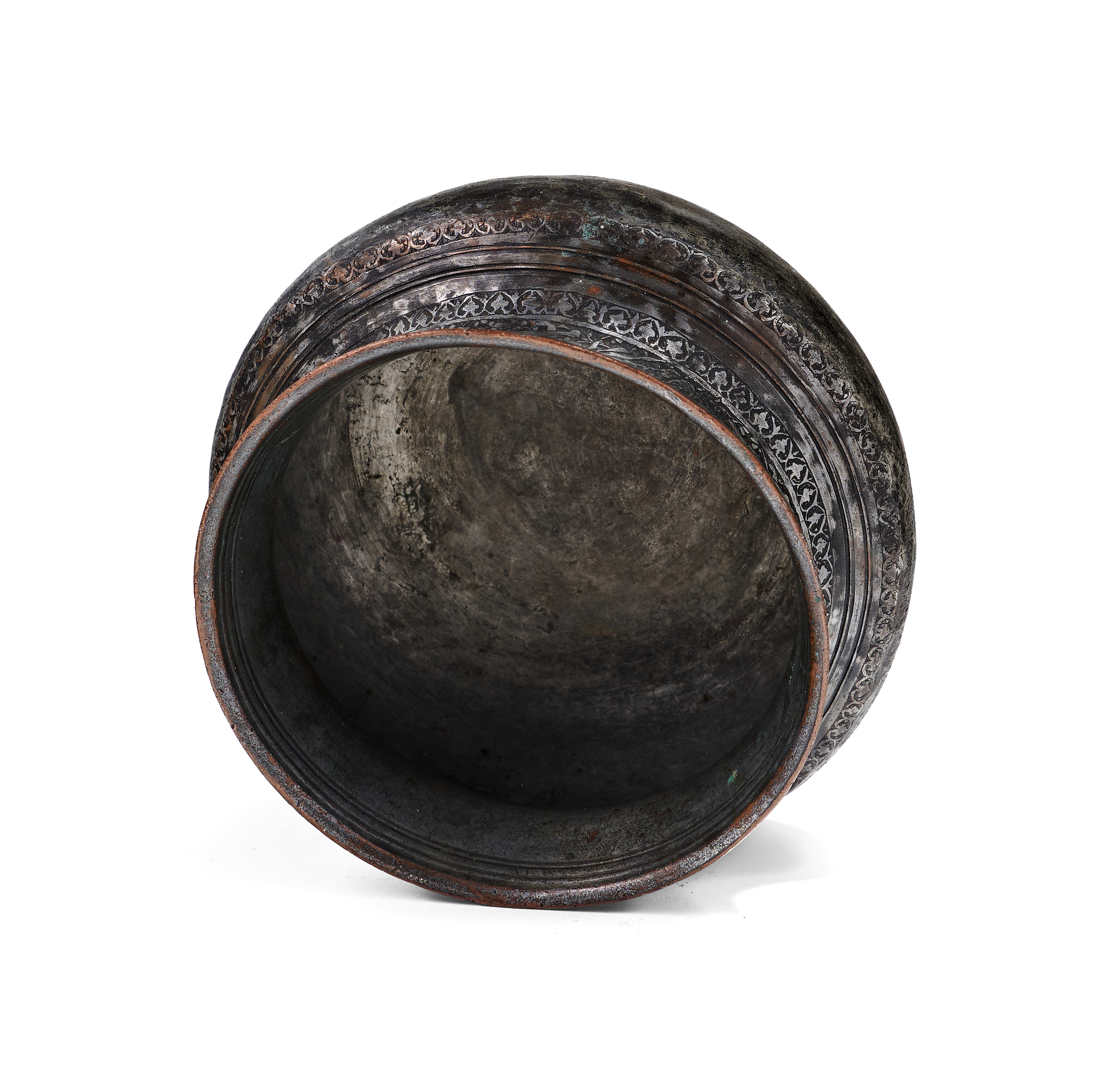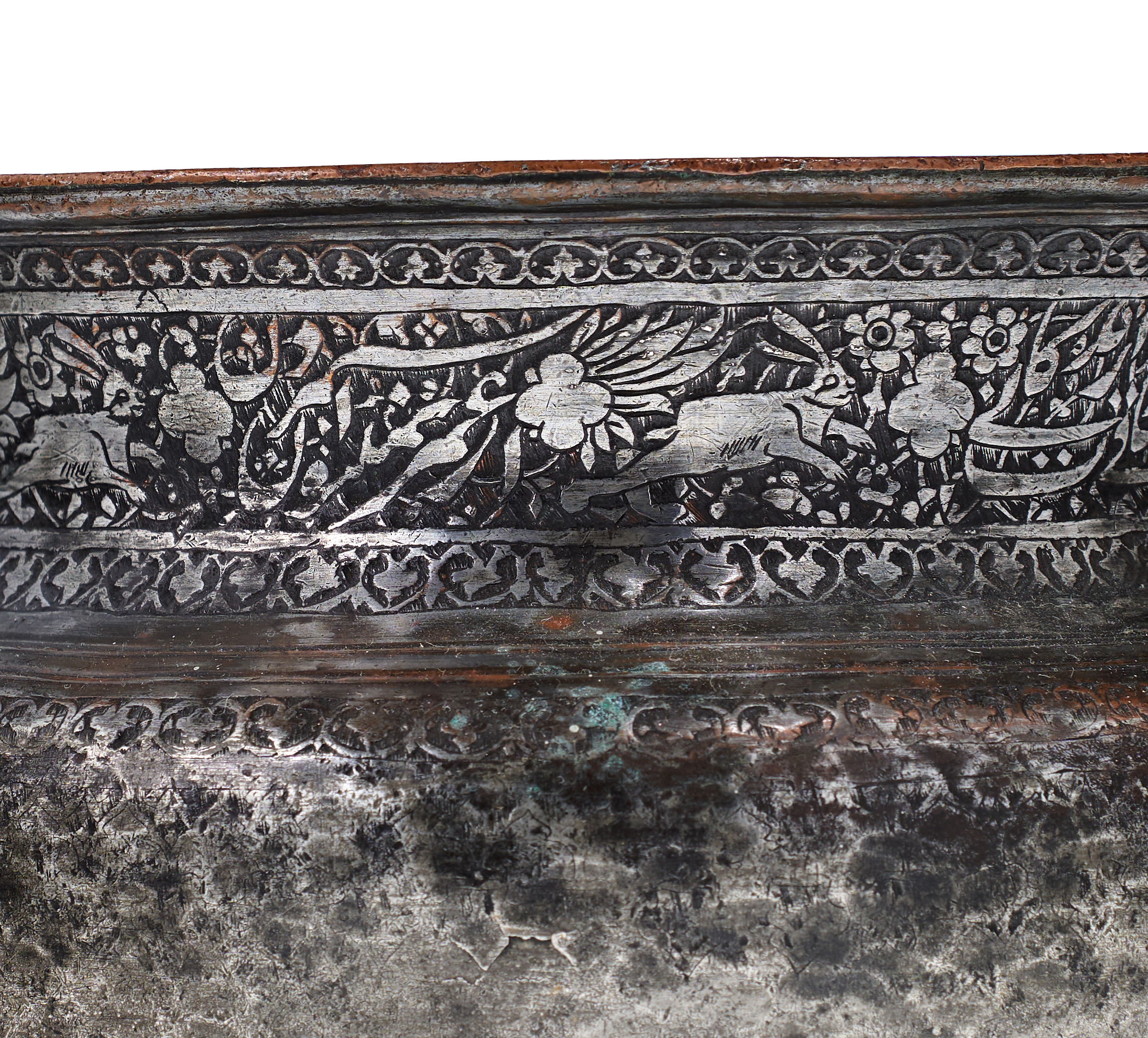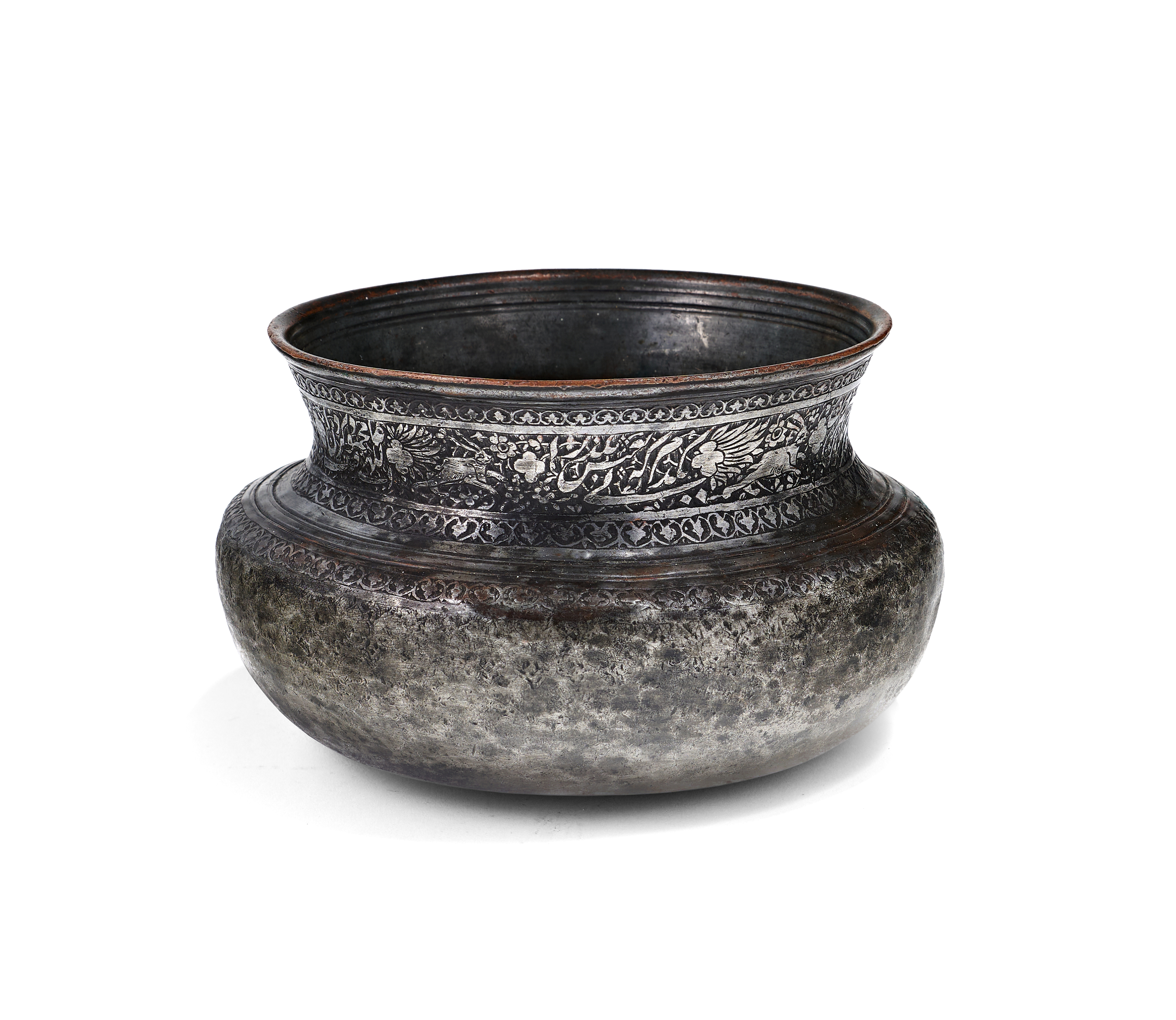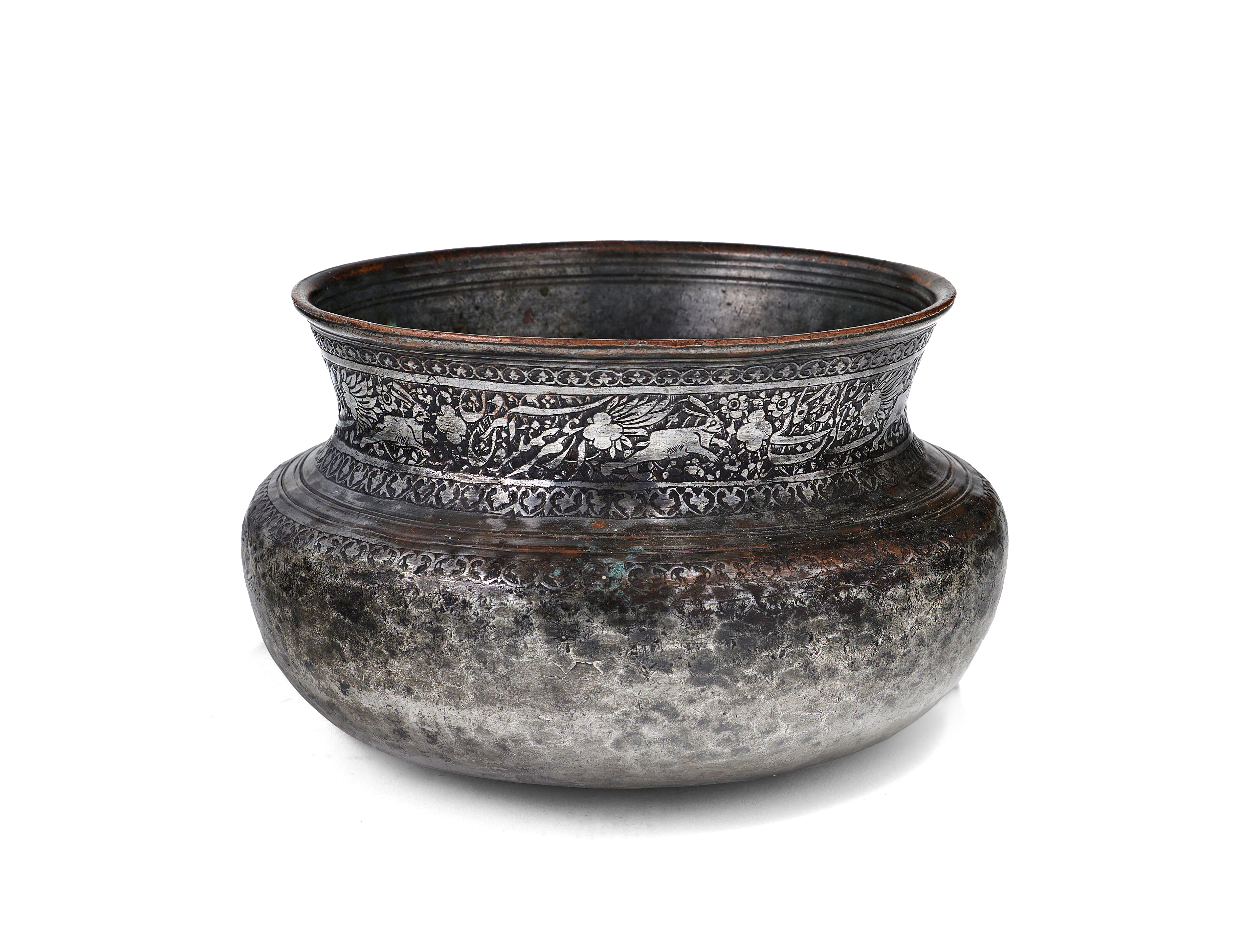 This Persian tinned copper vessel, identified as a badiya, features a hand hammered bulbous body and a wide flared rim. The exterior neck is decorated with a broad horizontal band of chased and engraved ornamentation depicting hares and birds set within a field of scrolling floral and foliate motifs. This central band includes panels of calligraphic script in the Nastaliq style and is bordered by secondary bands of repeating stylized heart shaped motifs. The construction shows evidence of traditional metalworking techniques.