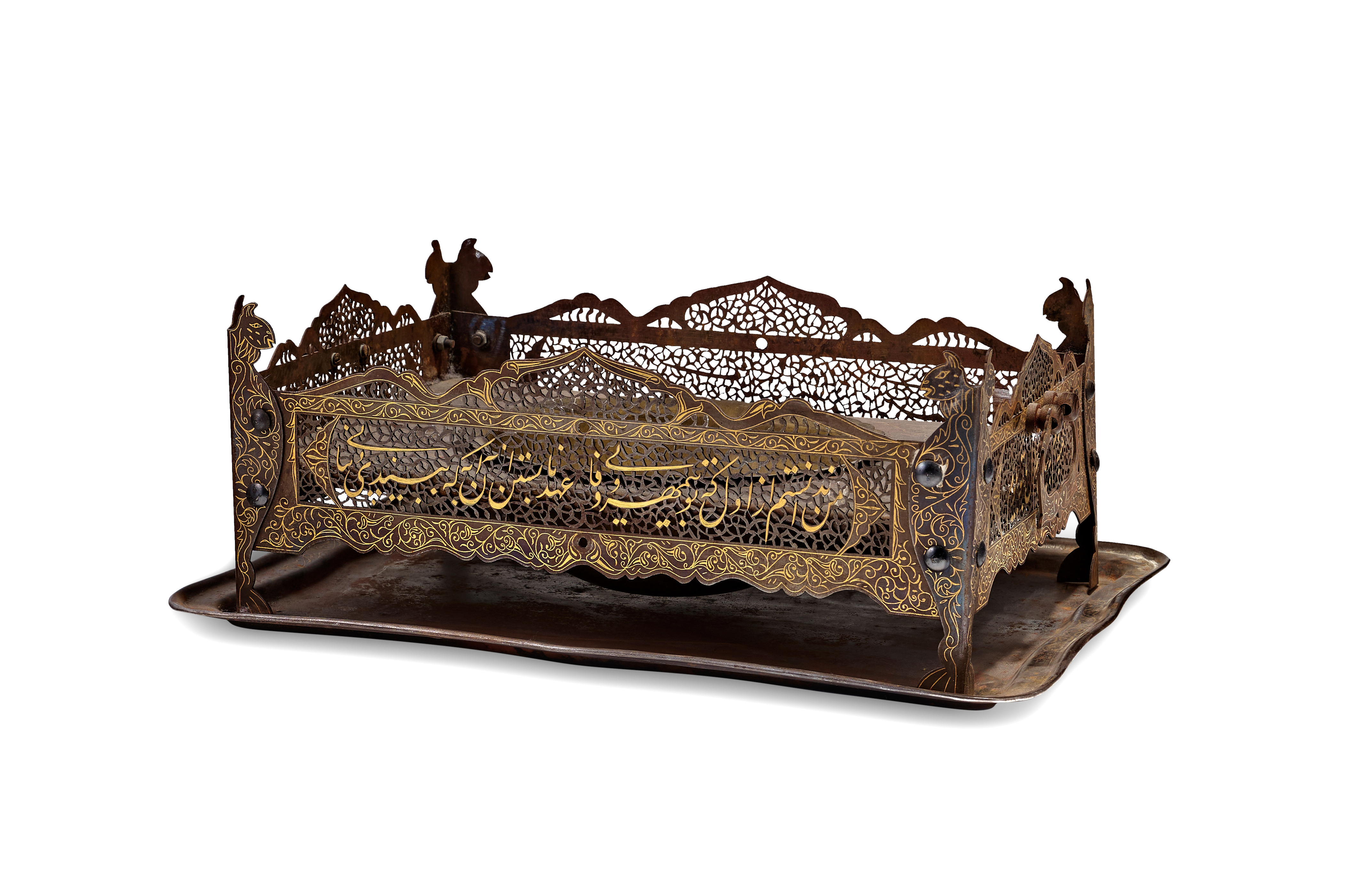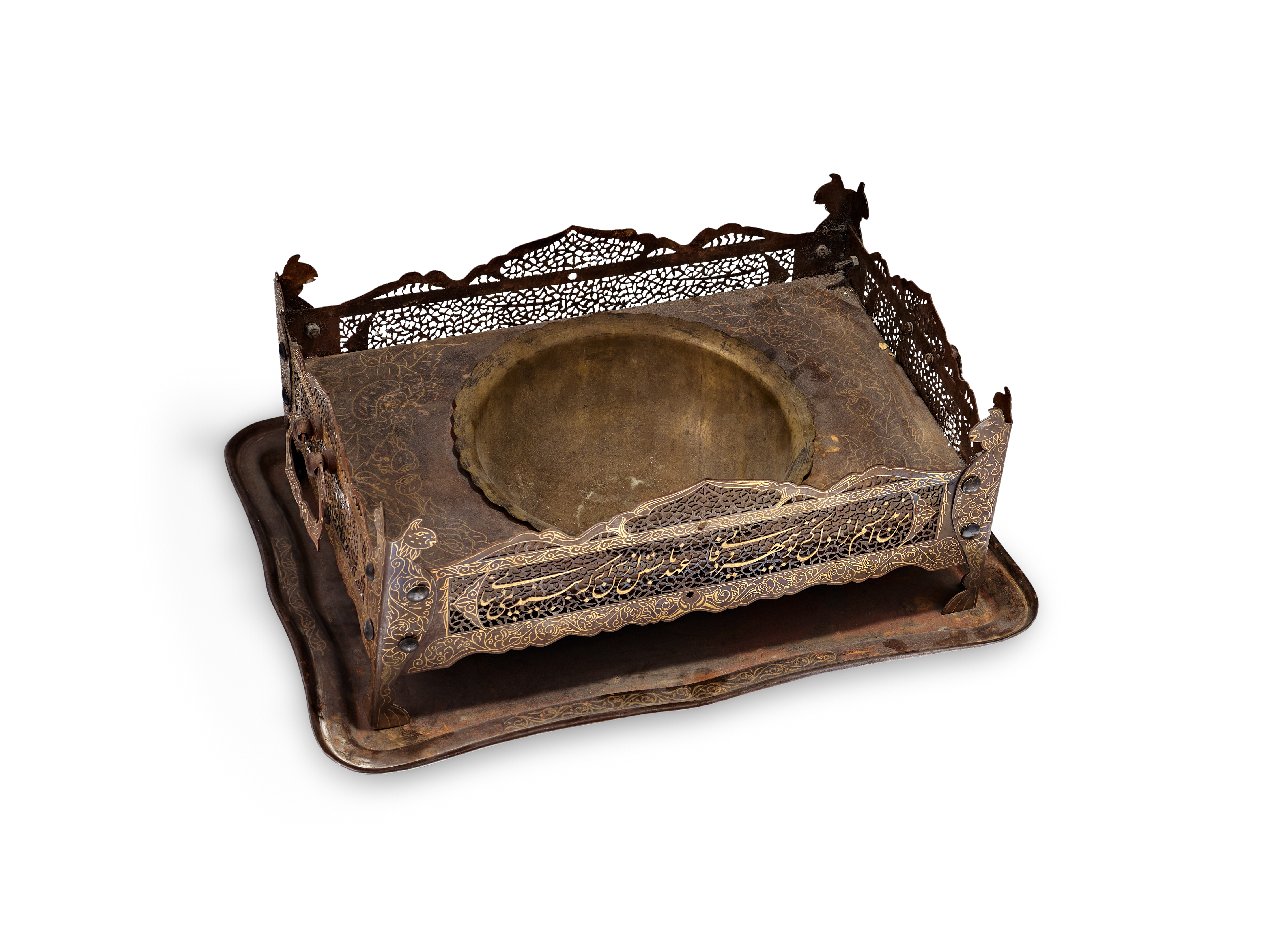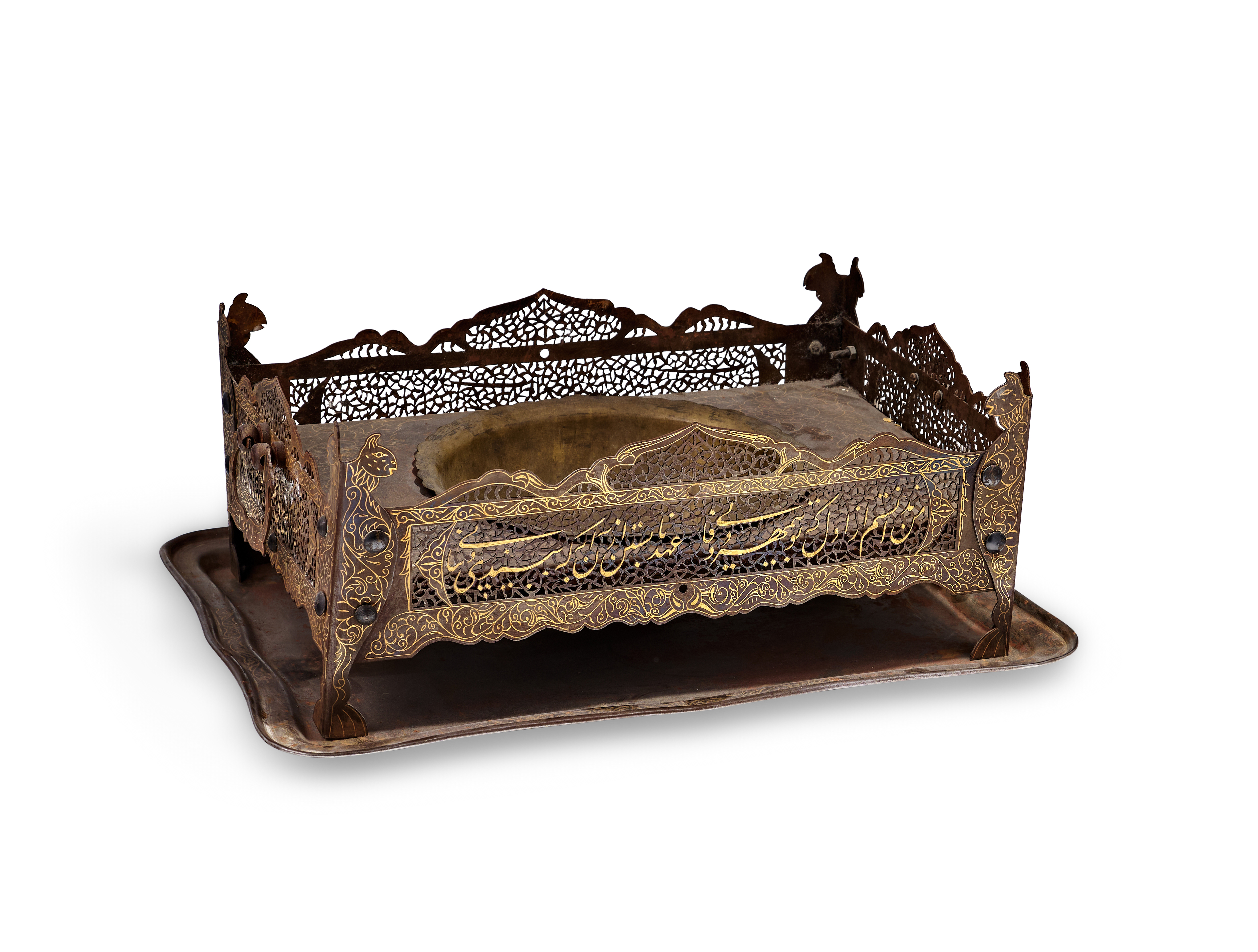 A Persian steel brazier and matching rectangular tray from the Qajar period. The assembly features a rectangular frame with intricate openwork pierced with arabesque and floral patterns, surrounding a central recessed bowl for hot coals or incense. The frame is supported by four integrated legs ending in stylized animal-head finials, possibly depicting felines. The exterior surfaces are decorated with gold-inlaid damascened scrolling foliate motifs and prominent Persian inscriptions in Nasta’liq script across the front panels. The matching tray features a raised, shaped rim.