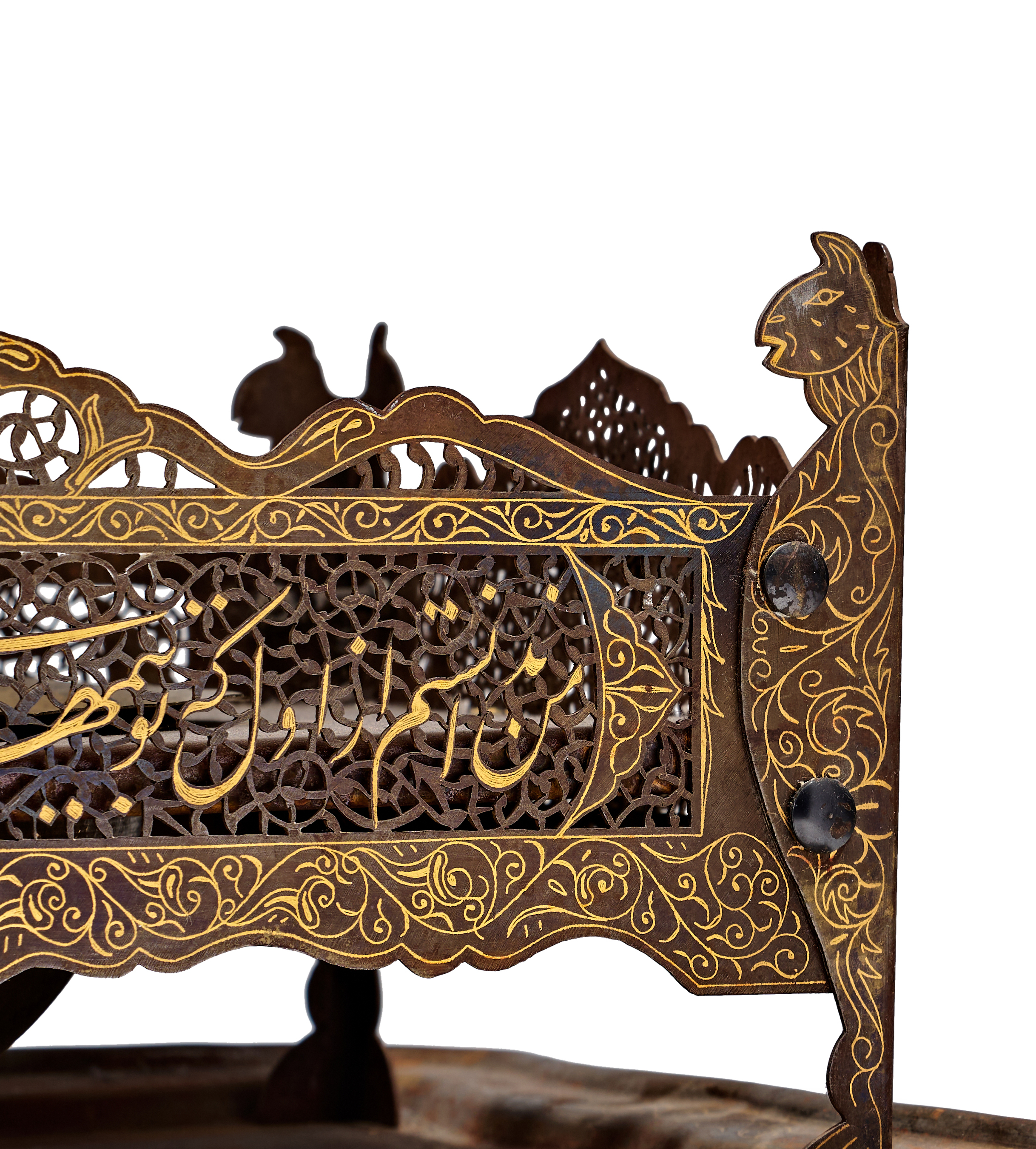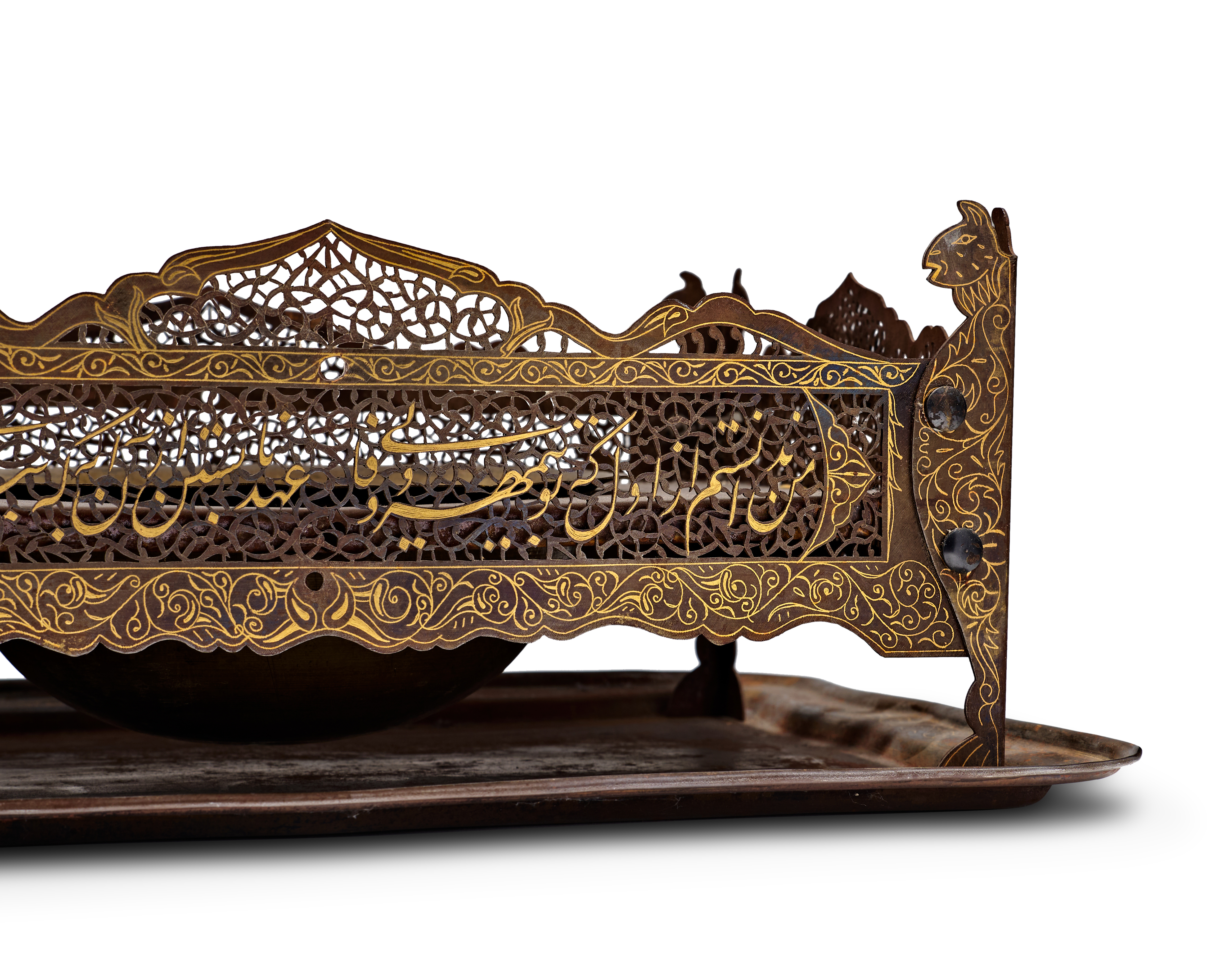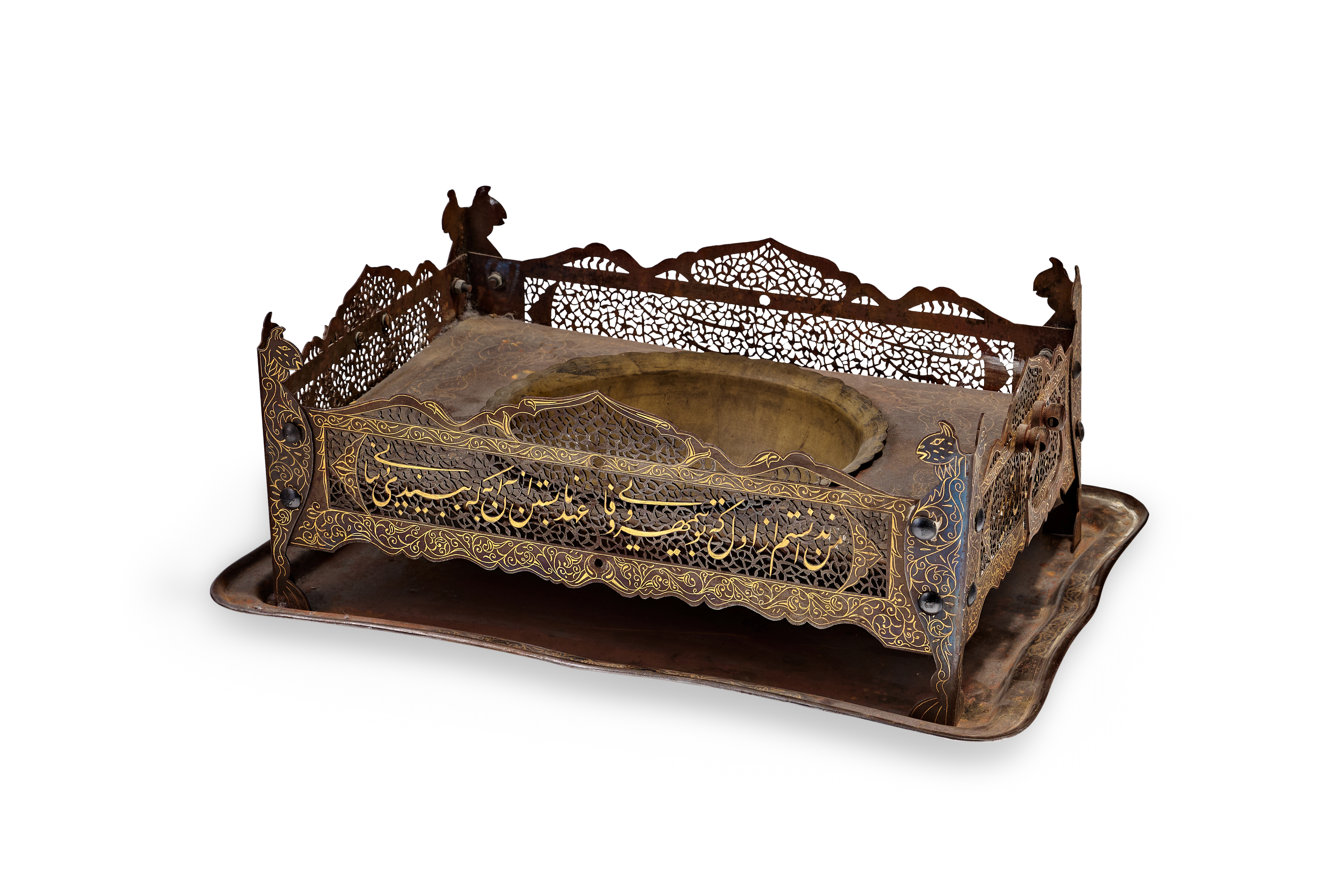 A Persian steel brazier and matching rectangular tray from the Qajar period. The assembly features a rectangular frame with intricate openwork pierced with arabesque and floral patterns, surrounding a central recessed bowl for hot coals or incense. The frame is supported by four integrated legs ending in stylized animal-head finials, possibly depicting felines. The exterior surfaces are decorated with gold-inlaid damascened scrolling foliate motifs and prominent Persian inscriptions in Nasta’liq script across the front panels. The matching tray features a raised, shaped rim.