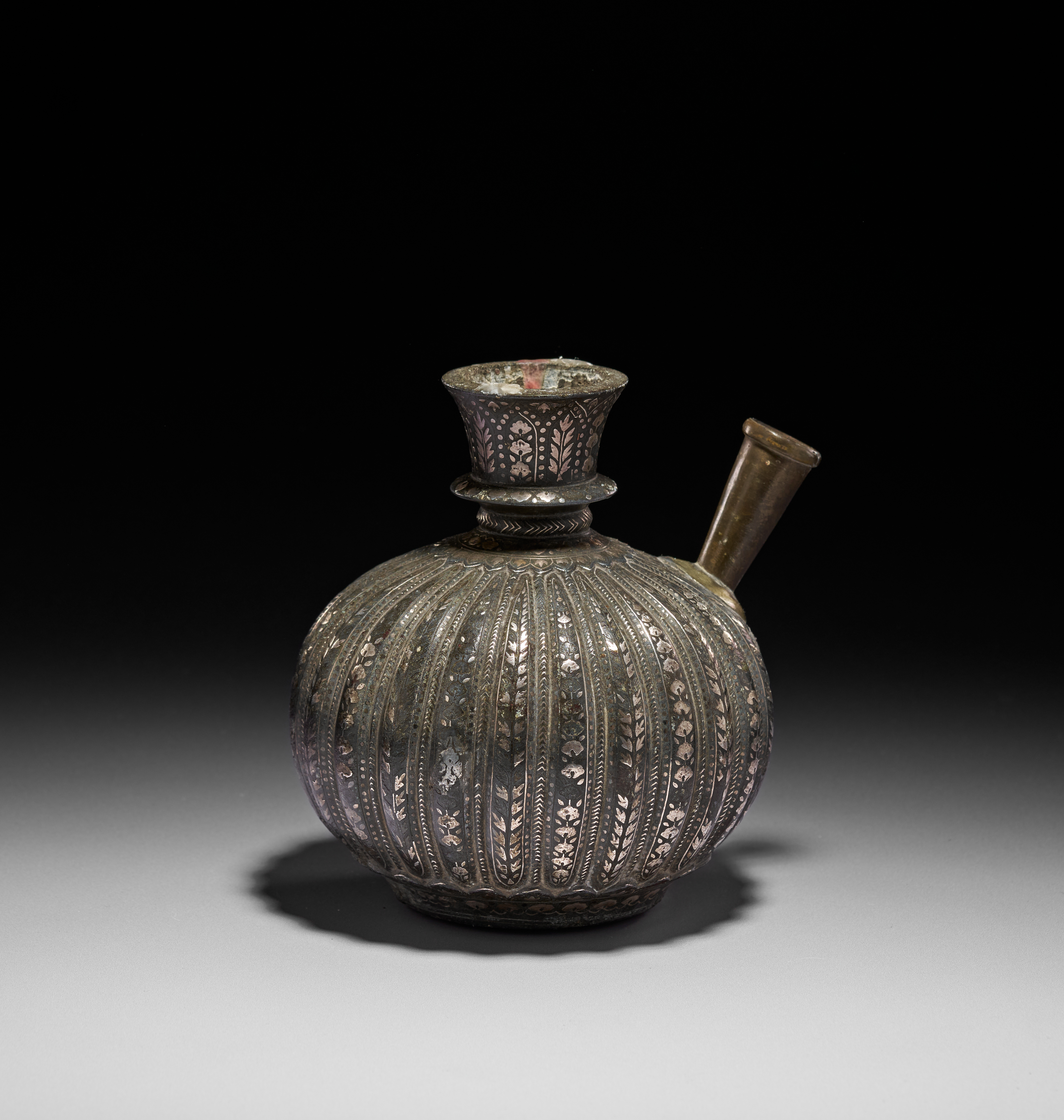 This impressive huqqa base is a fine and early example of Bidri metalwork from Bidar in the Deccan, dating to the 17th century. Of globular form with a short flaring neck and angled nozzle, the surface is richly decorated with elegant, vertically arranged panels of silver inlay. Each panel contains alternating motifs of delicate foliate sprays, serrated leaves, and stylised flowerheads, all executed in the refined linear idiom associated with high-quality early Bidri production.