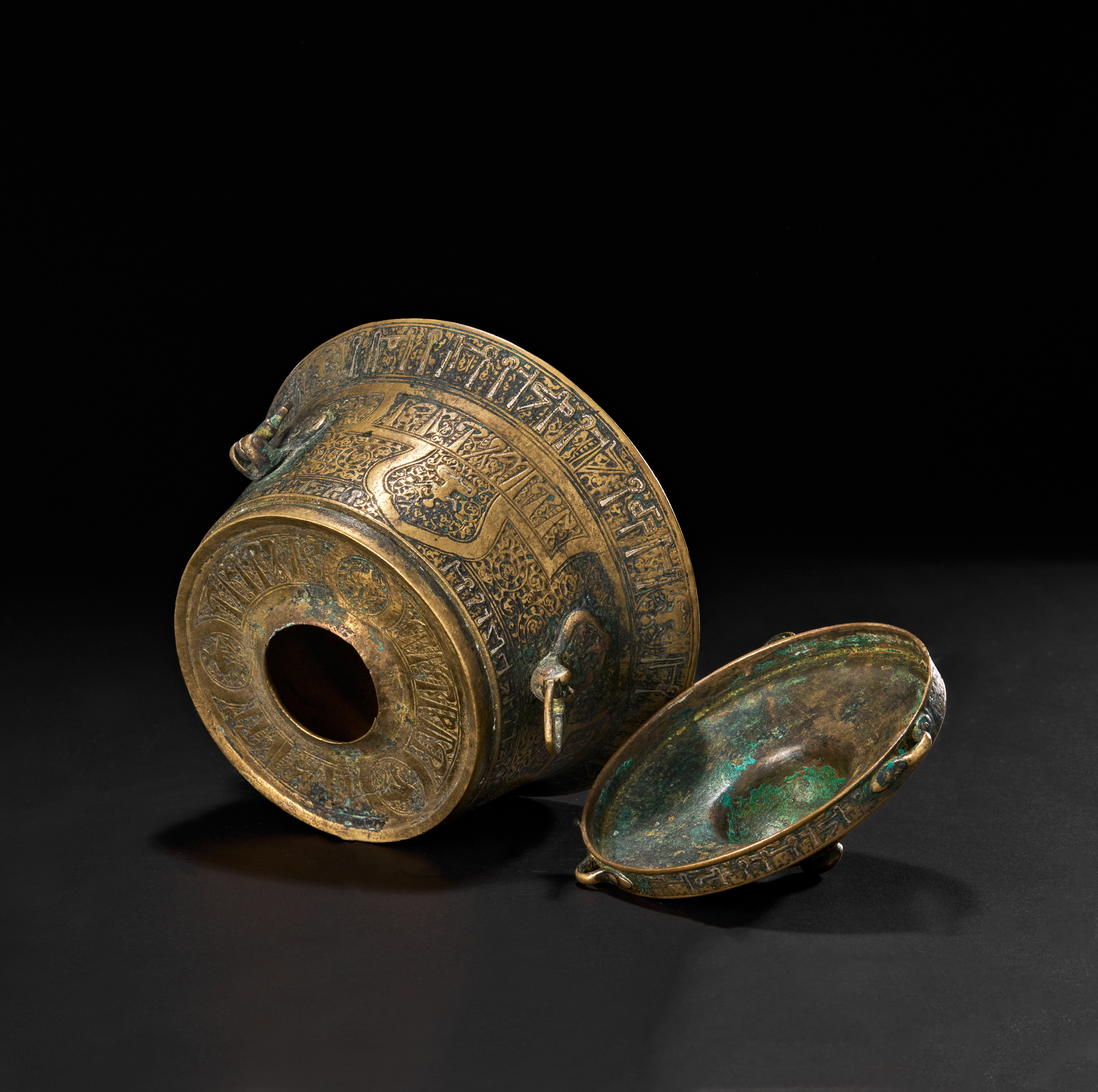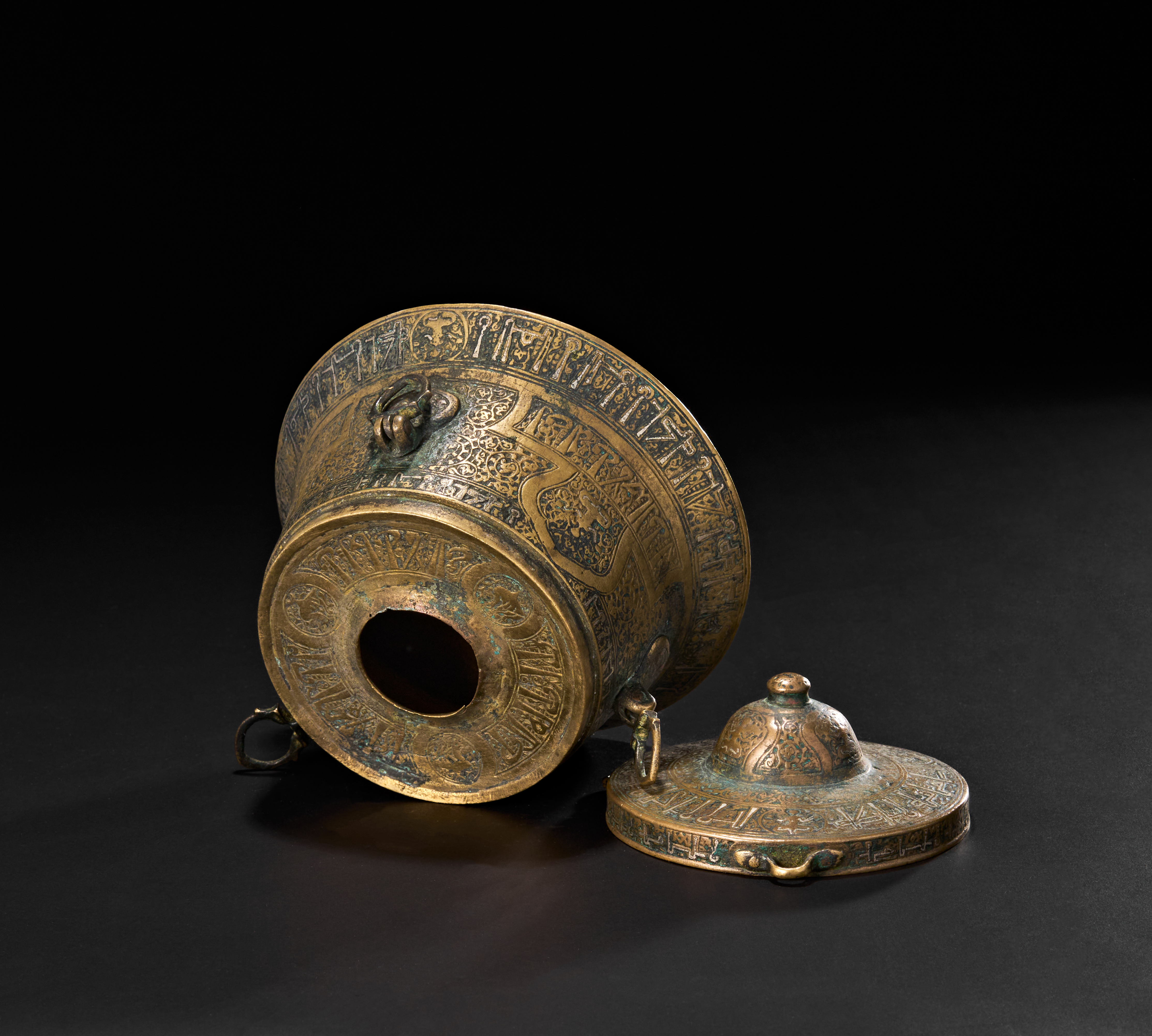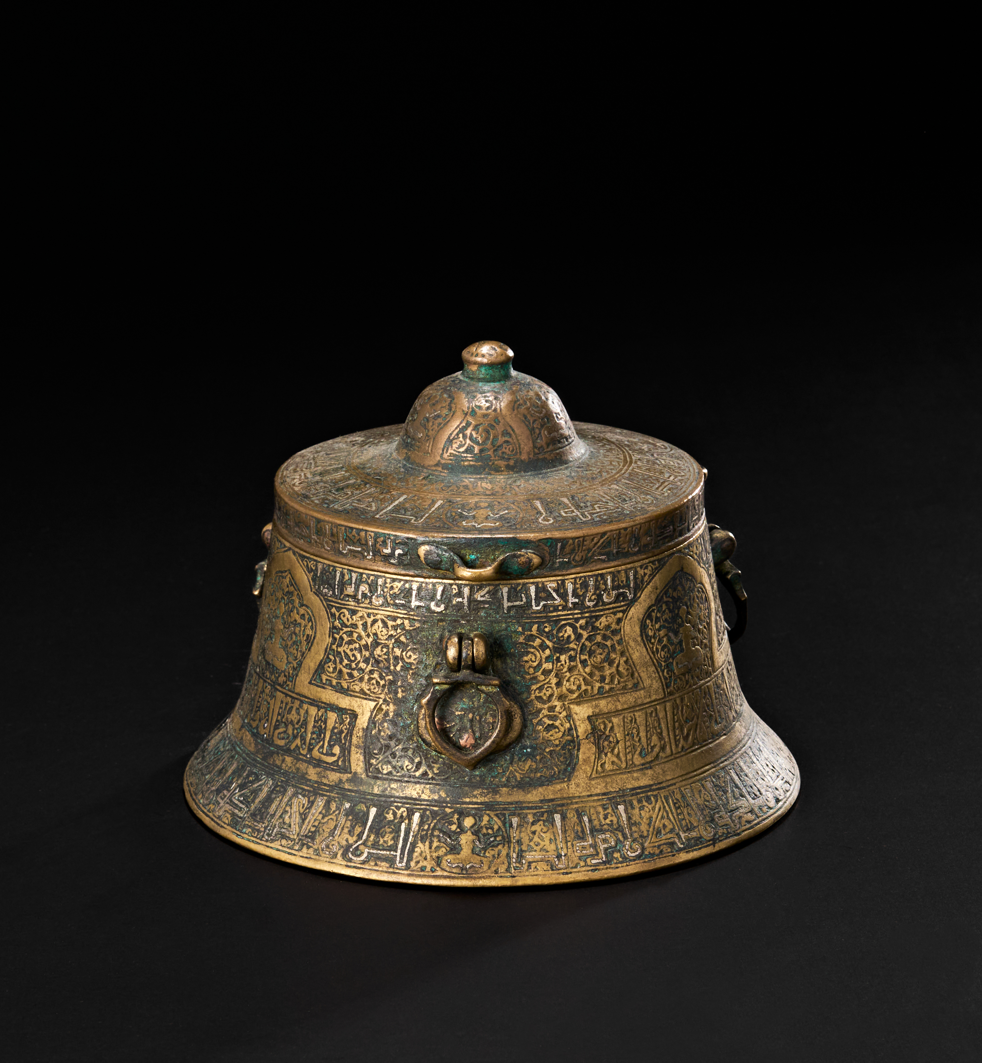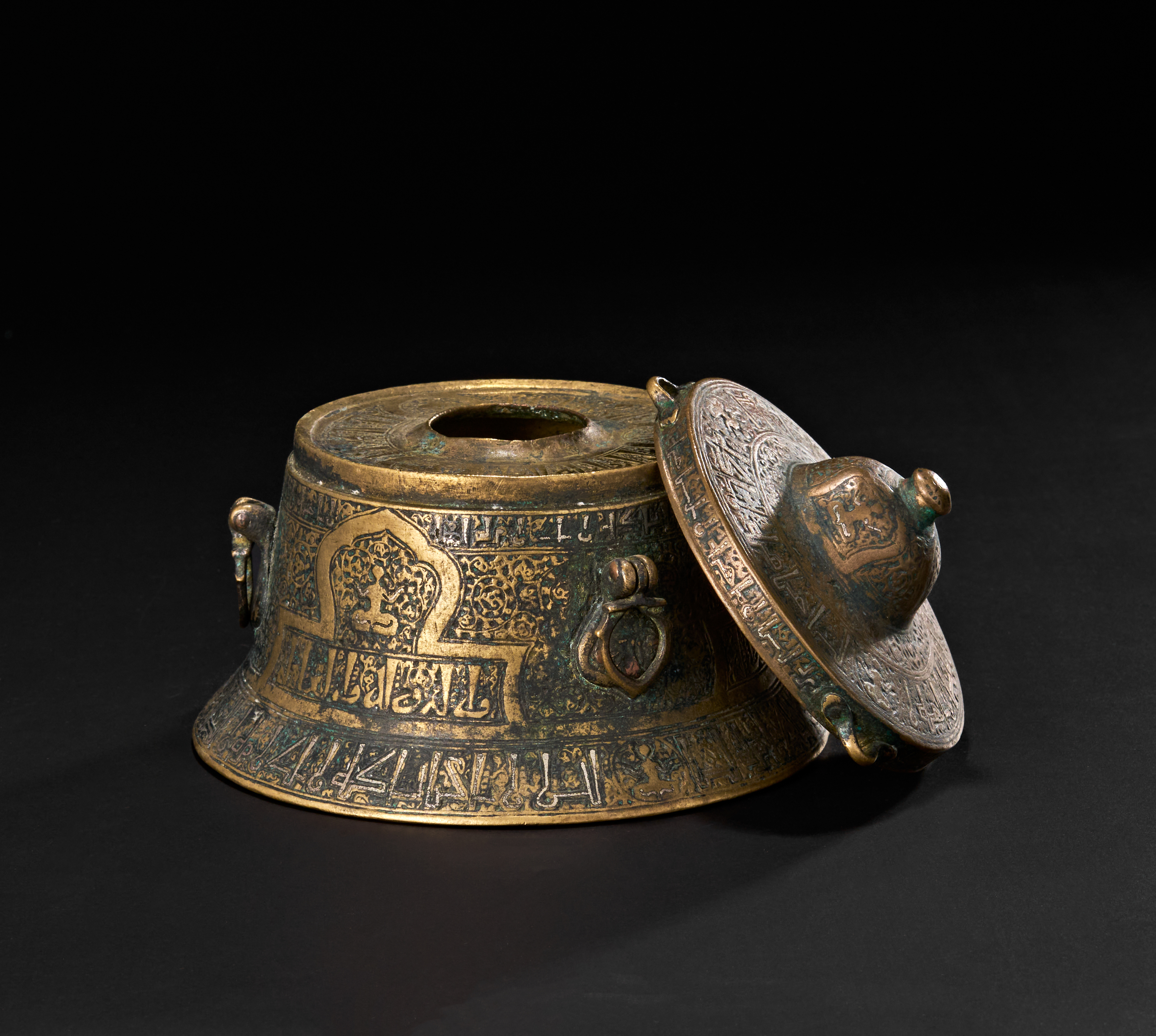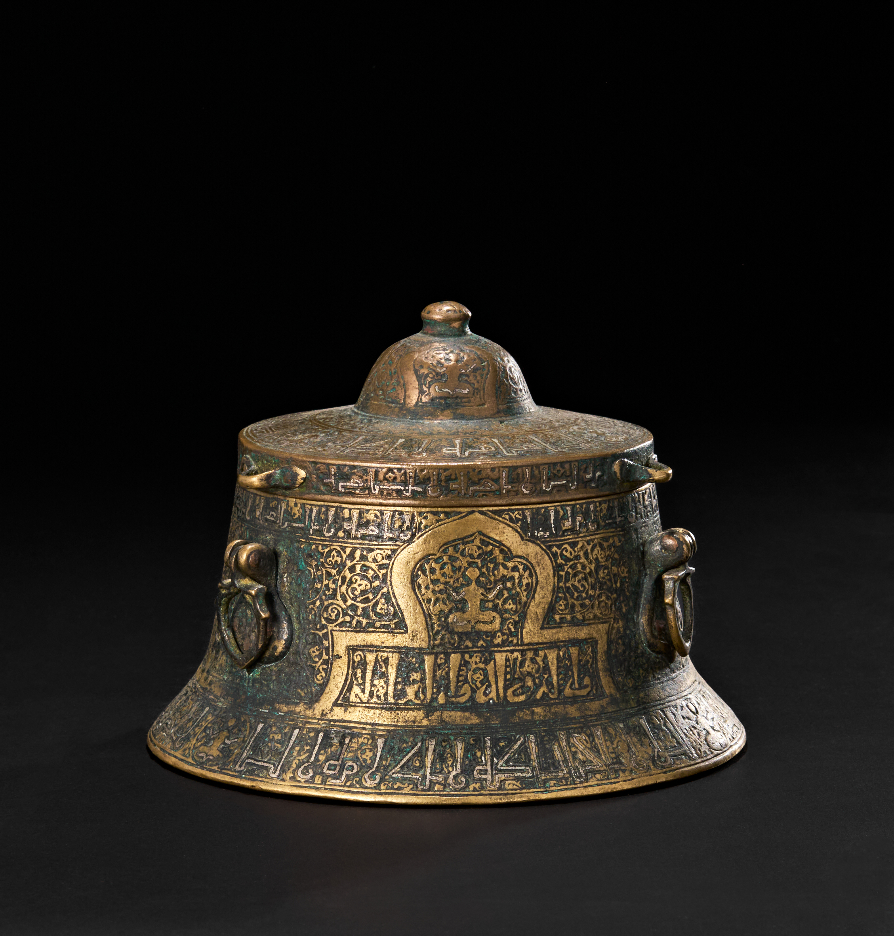 The flared cylindrical form with domed lid is adorned with panels of vegetal arabesques and cartouches enclosing inscriptions, including decorative friezes in Kufic script. The lid opens to reveal the hollow interior for storing ink, while the side is equipped with suspension rings, indicating its portability and use by a scholar or scribe. The base bears additional inscriptions and geometric motifs, with a worn but still legible six-pointed star at the centre.