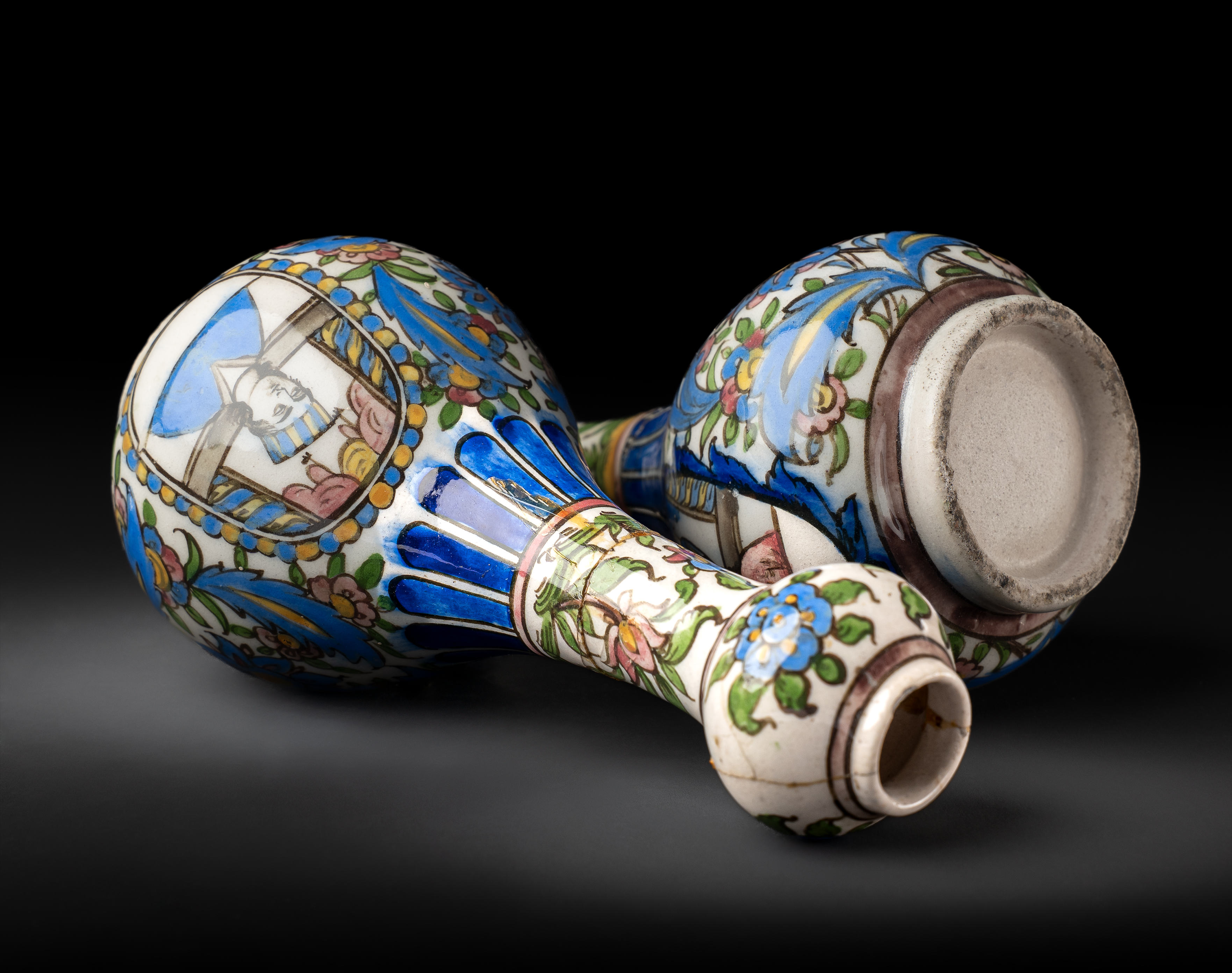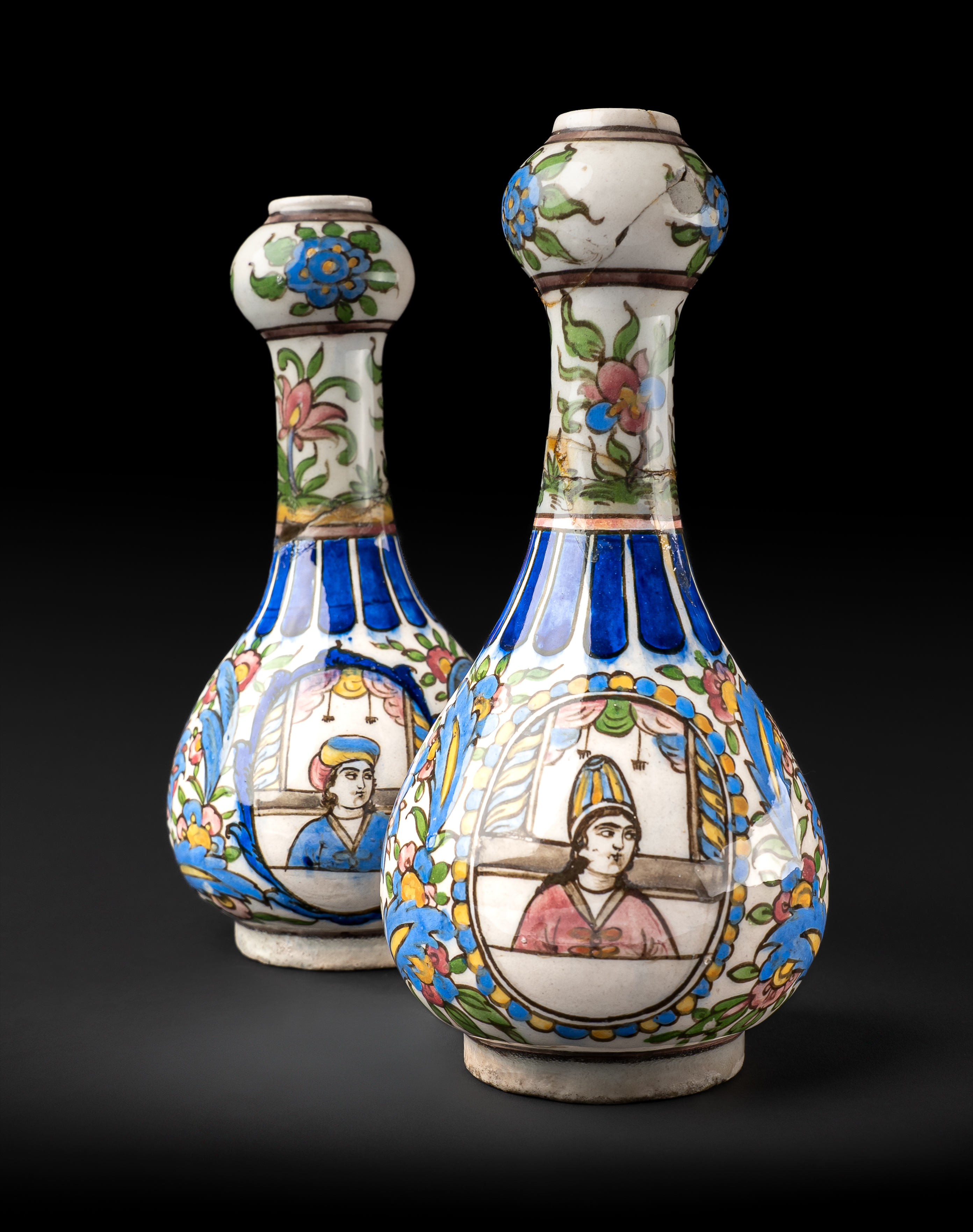 Of baluster form with tapering necks and rounded knops, painted in polychrome enamels beneath a clear glaze. The bodies alternate between oval portrait medallions of courtly figures and panels of floral sprays, framed by bold cobalt-blue scrolls. The necks are decorated with blossoms and foliage. Typical of Tehran production in the Qajar period.
