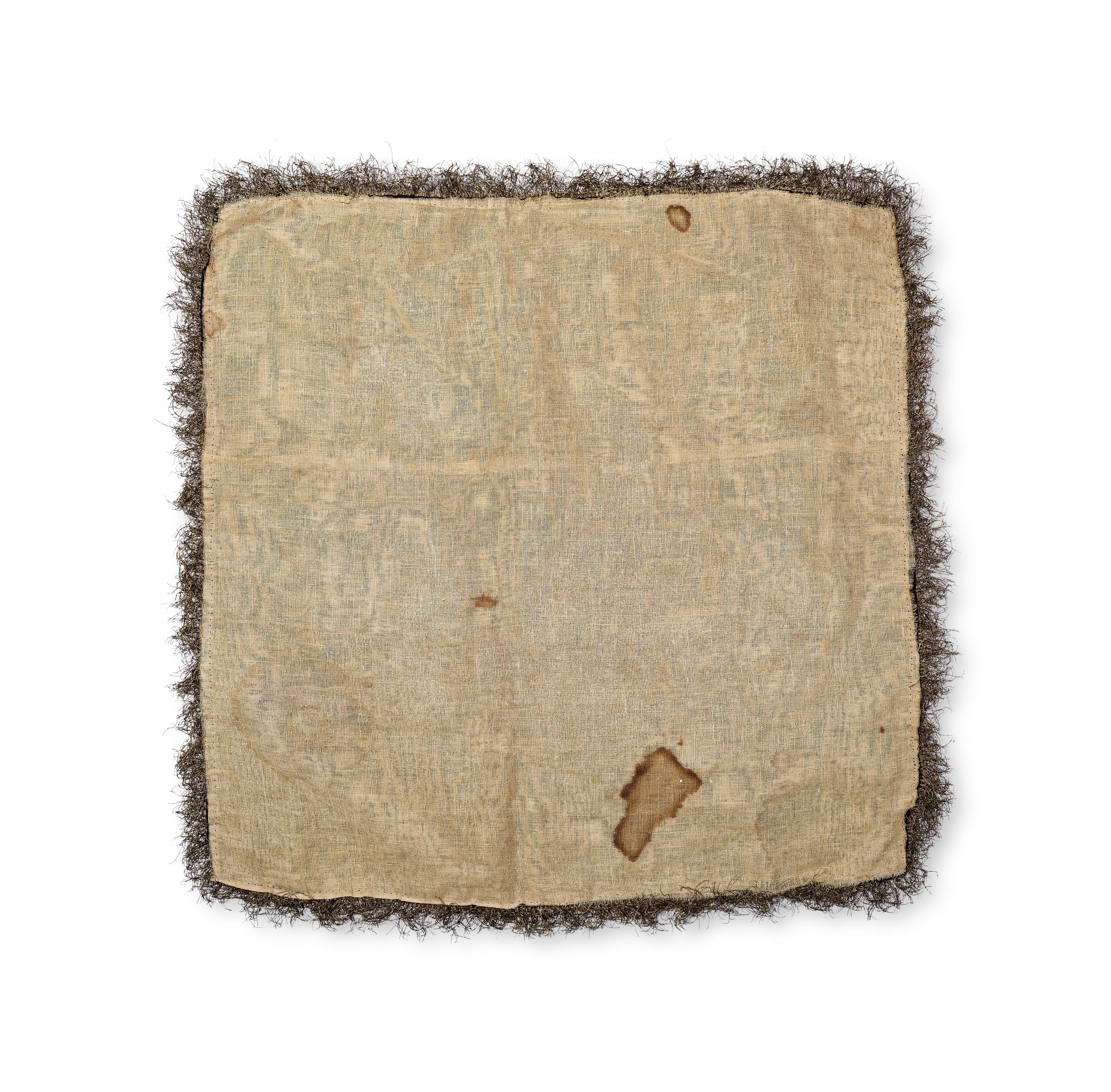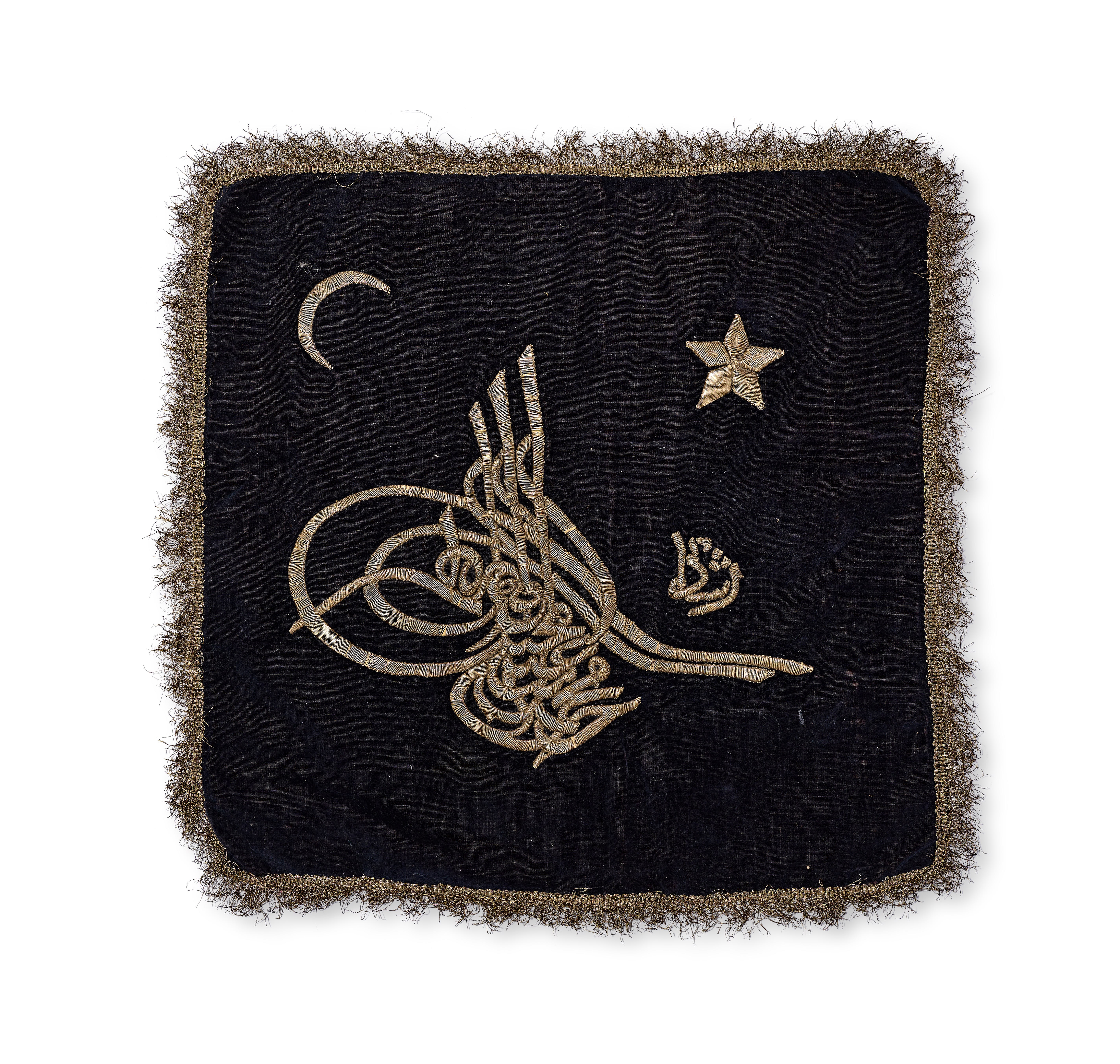 This Ottoman embroidered textile panel, likely a cushion cover, is composed of a dark velvet ground decorated with gold-colored metallic thread. The central design features the imperial tughra of Sultan Mehmed V (r. 1909–1918), accompanied by the calligraphic inscription Rashad. The field is further embellished with a crescent moon and a five-pointed star. The edges are finished with a metallic fringe. The piece is backed with a plain-woven natural fabric lining.