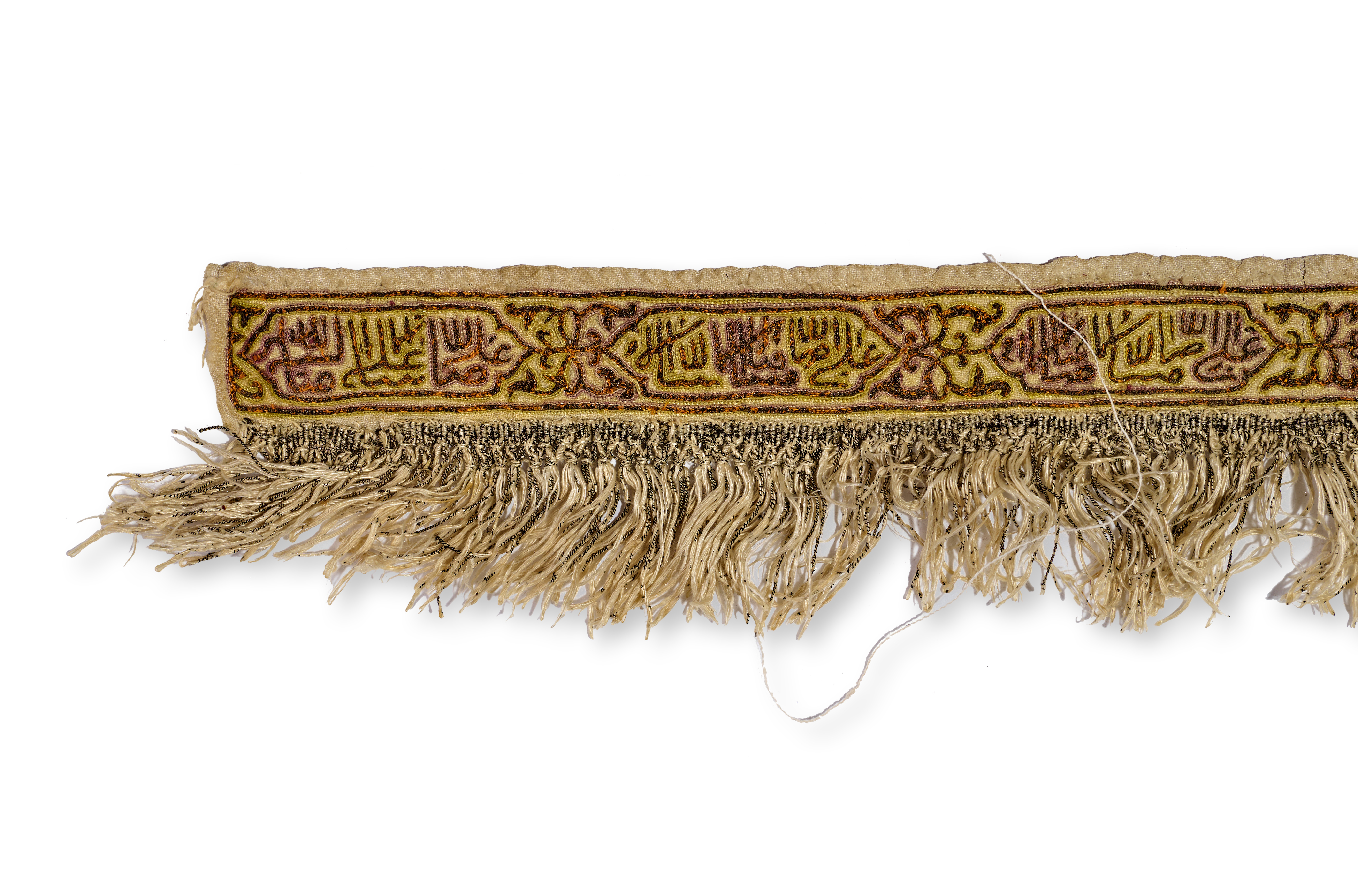 This textile fragment consists of a narrow rectangular band of cream-colored fabric featuring heavy embroidery in colored silk threads. The design is organized into a series of decorative cartouches containing Arabic calligraphy, including religious invocations such as Ya Allah, separated by stylized floral and foliate motifs. A long, dense fringe composed of metallic-wrapped and silk threads is attached along the lower edge. The piece is constructed using traditional hand-embroidery techniques.