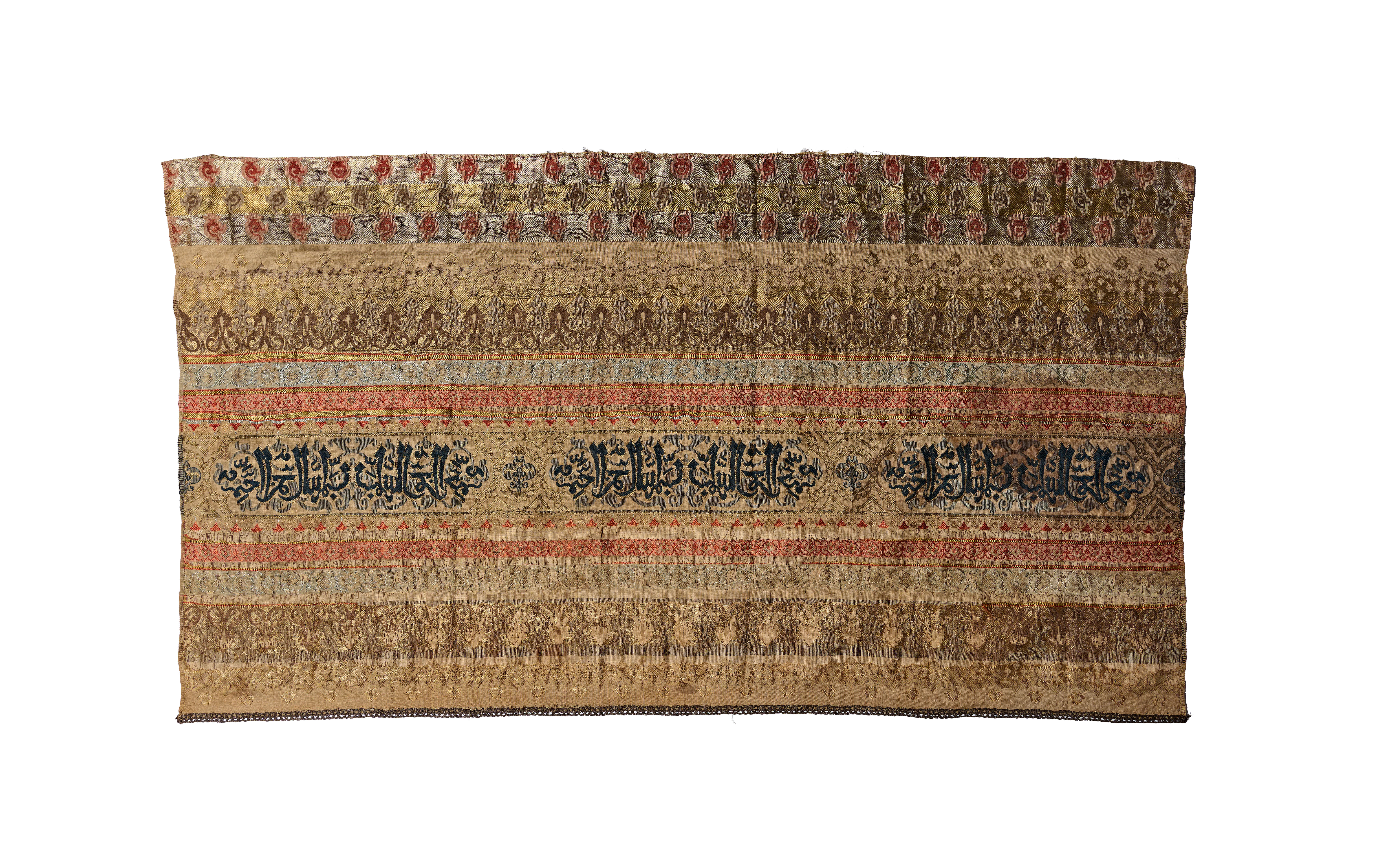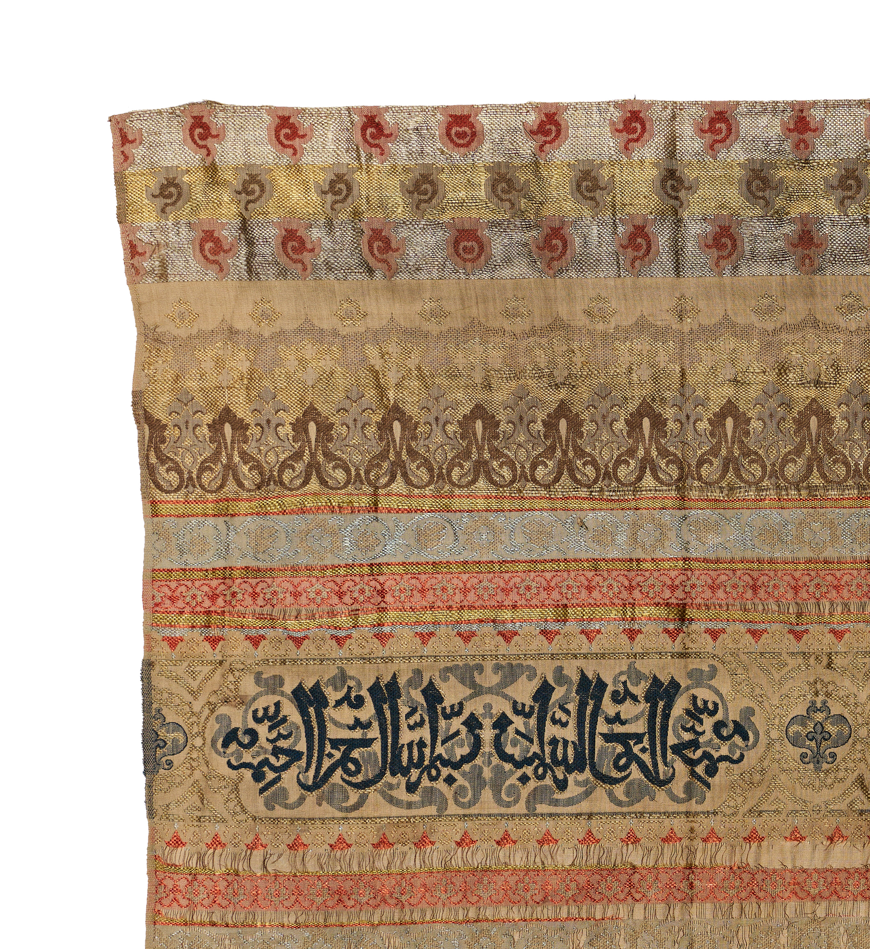 AN ISLAMIC TIRAZ STYLE LAMPAS WOVEN TEXTILE PANEL WITH ARABIC INSCRIPTIONS, ANATOLIA TURKEY, 18TH – 19TH CENTURY