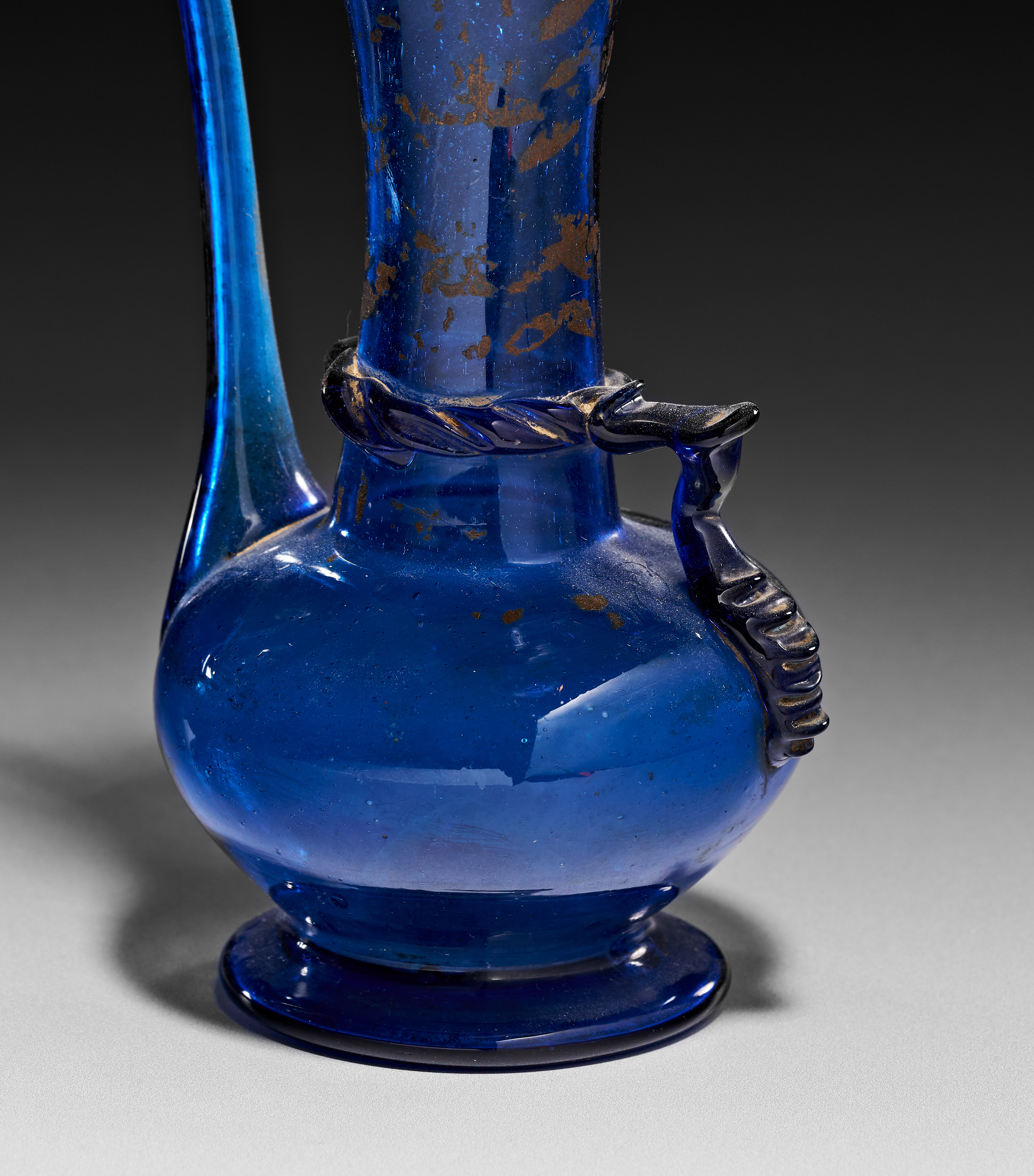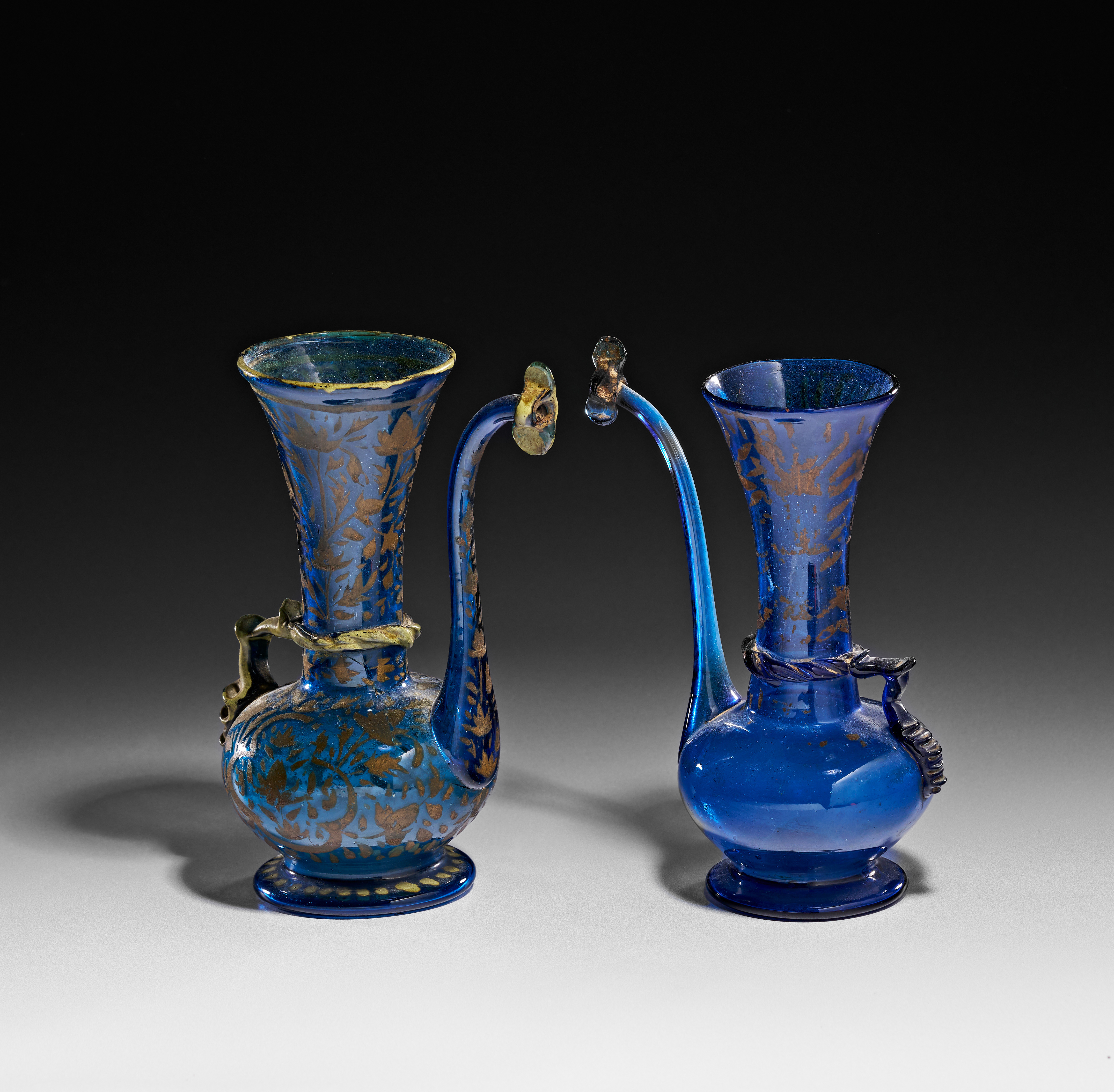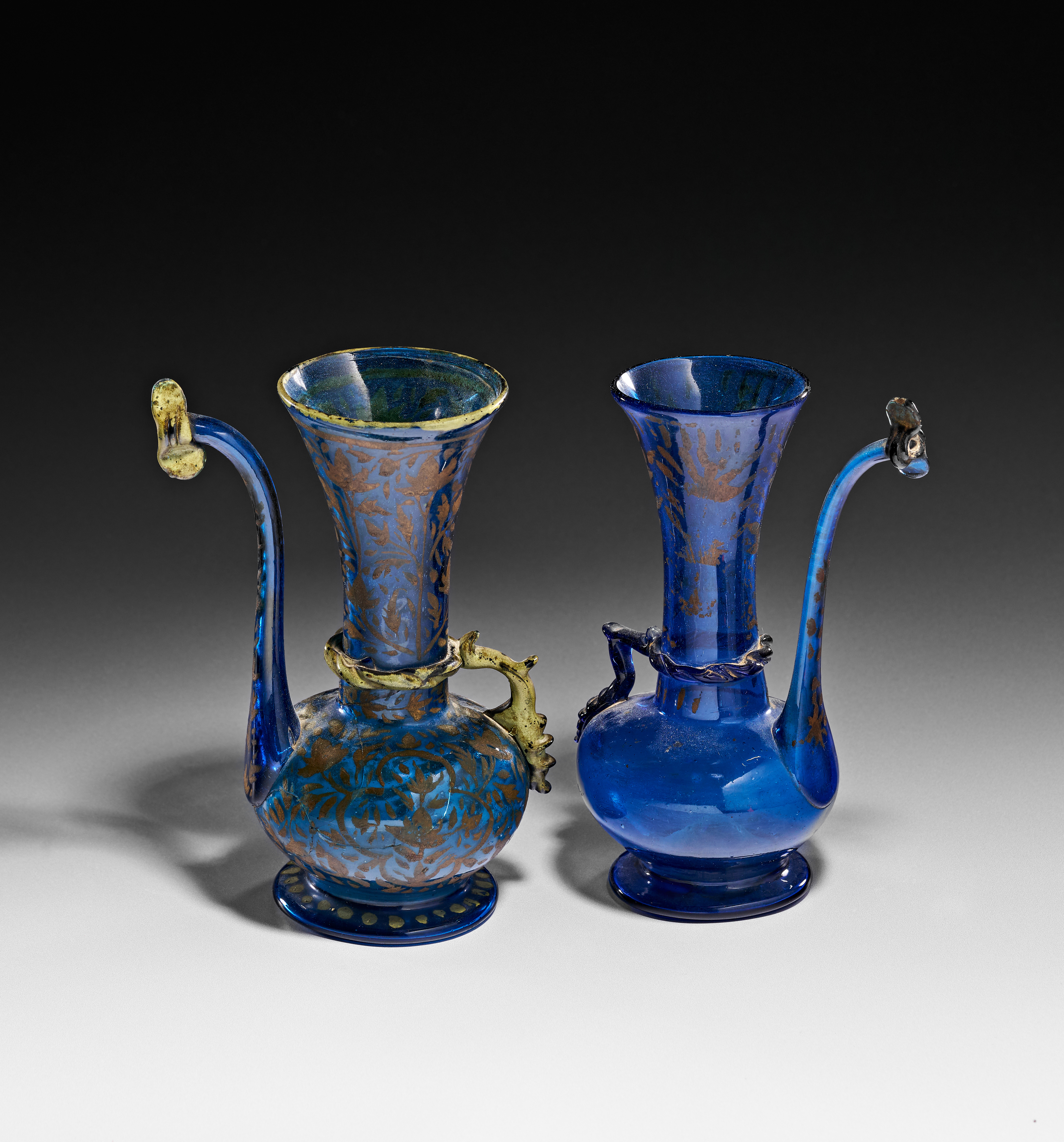 A pair of Safavid glass rosewater sprinklers, known as gulabdans, attributed to 17th century Persia. Each vessel is constructed from cobalt blue glass and features a globular body set upon a flared circular foot. The anatomy of each piece includes a tall tapering neck with a wide flared rim, a slender curved spout, and an applied decorative handle. The vessels are embellished with gilded floral and foliate motifs. A twisted glass band encircles the base of the neck on both examples. One vessel displays significantly more extensive overall gilding than the other. The decorative handles are executed in contrasting tones of yellowish and dark glass, with the yellowish handle featuring a textured, ribbed design.