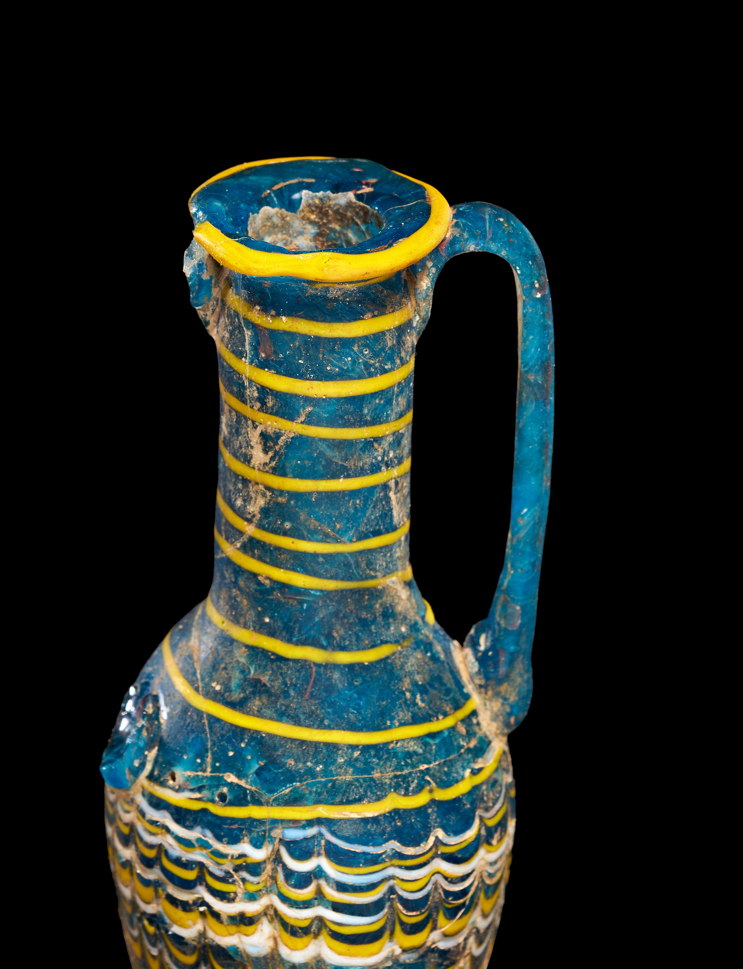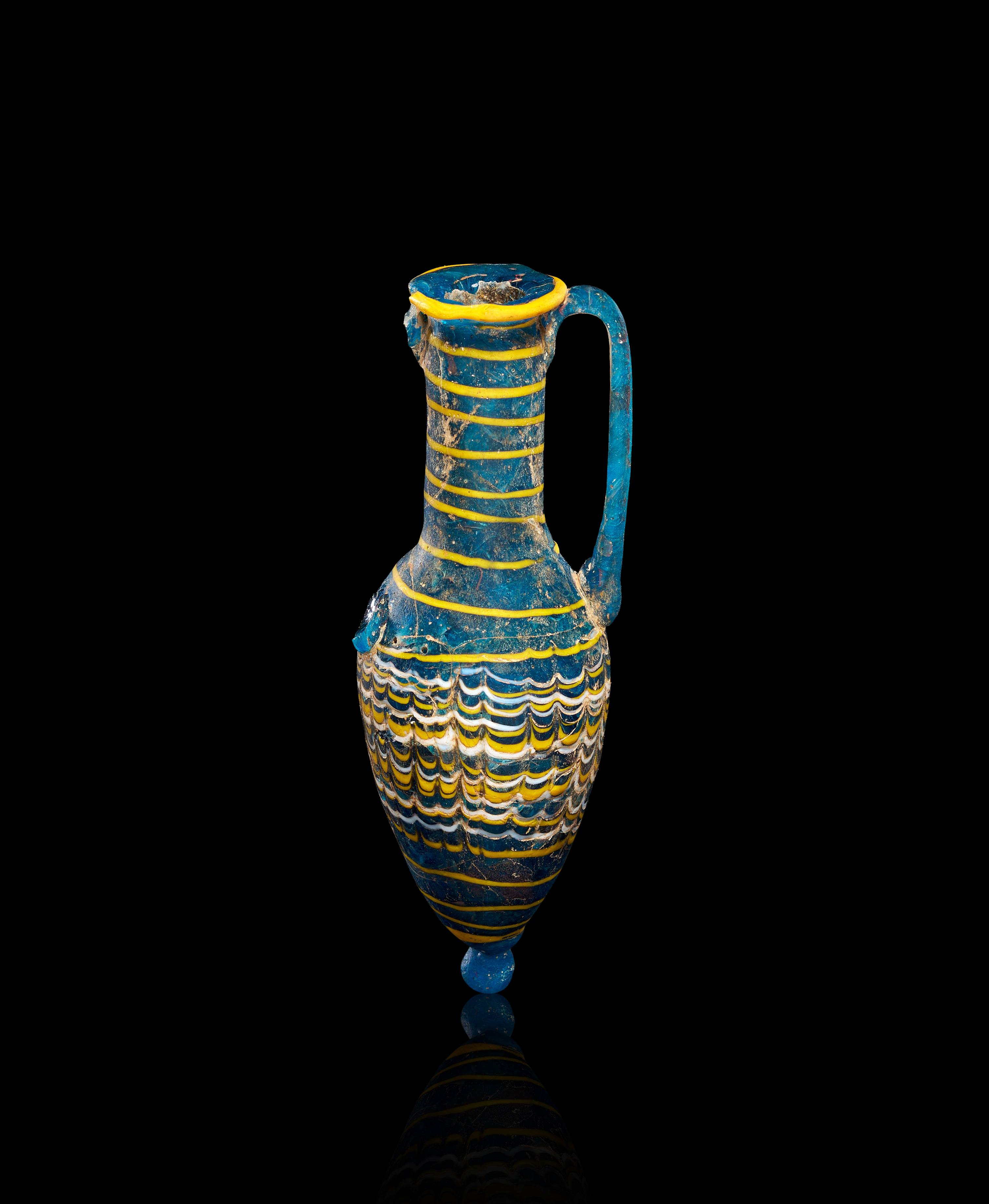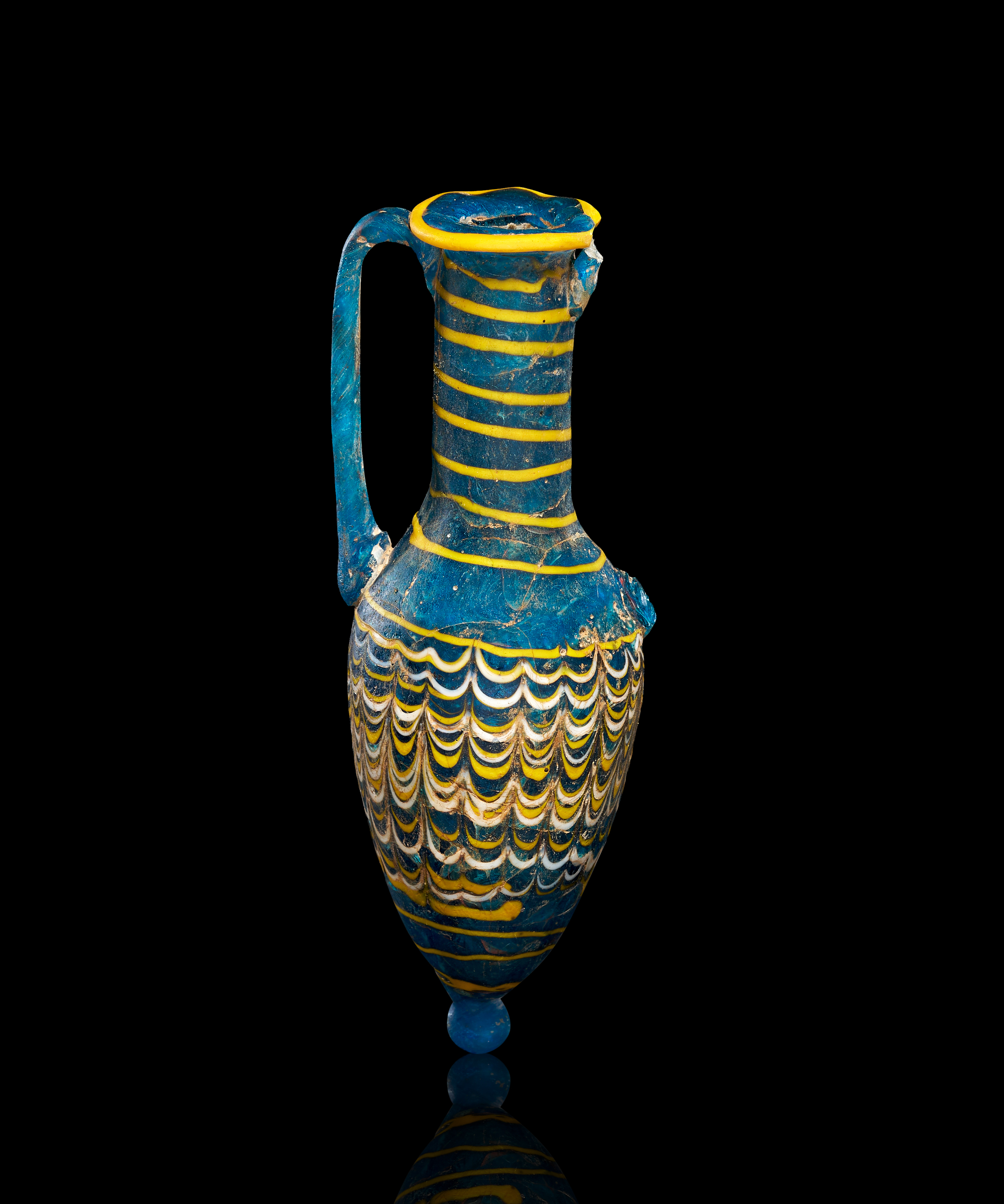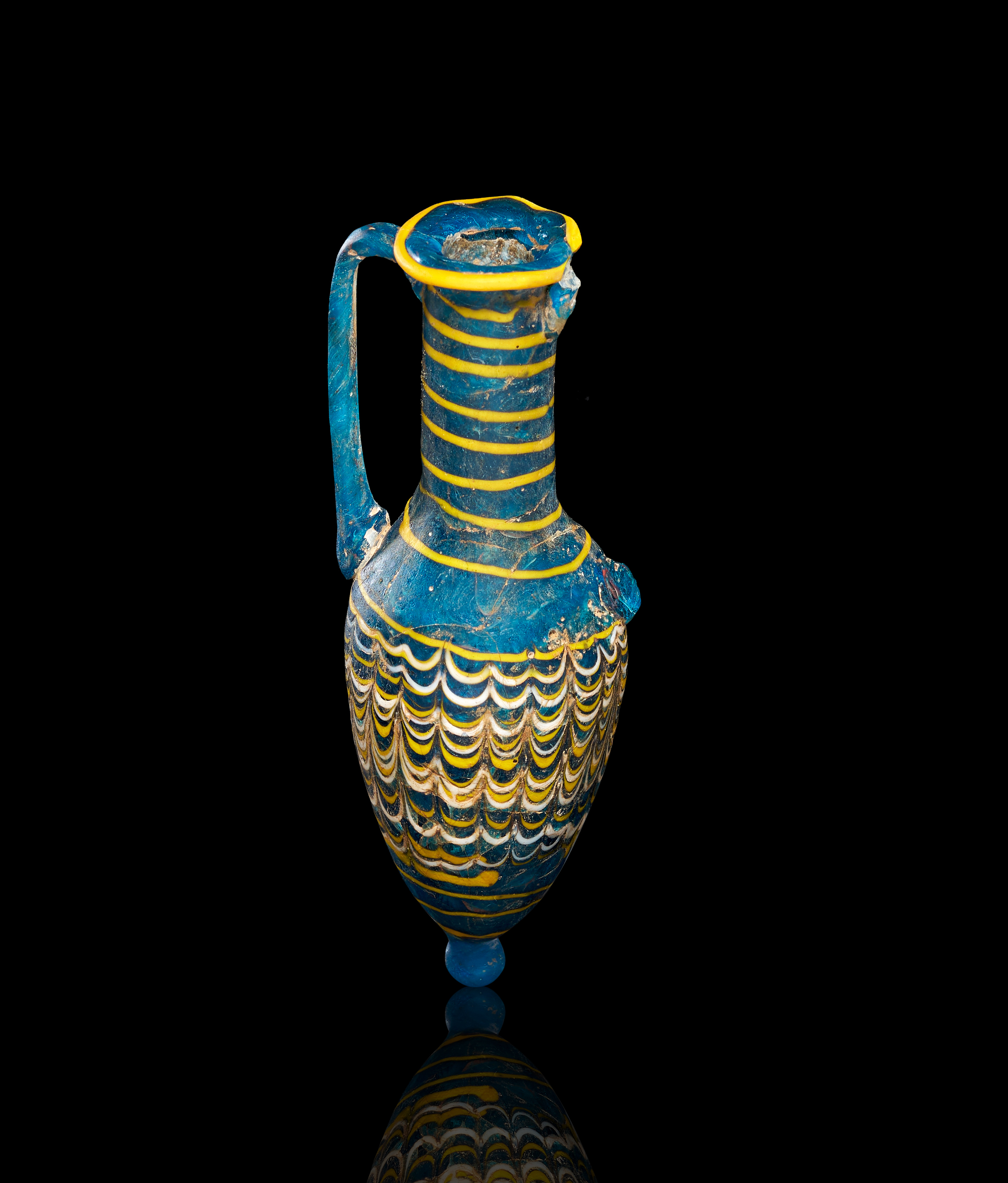 This core-formed glass vessel is an oinochoe, a type of perfume jug, originating from the Eastern Mediterranean region. The piece is crafted from translucent turquoise blue glass. It features a flared rim with an applied yellow thread and a tall neck decorated with horizontal yellow trailing. The piriform body displays a marvered zig-zag or feathered pattern in yellow and white glass. The vessel is finished with a single vertical handle extending from the shoulder to the rim and a small, rounded knob at the base. The construction follows the ancient core-forming technique common in the Hellenistic period.