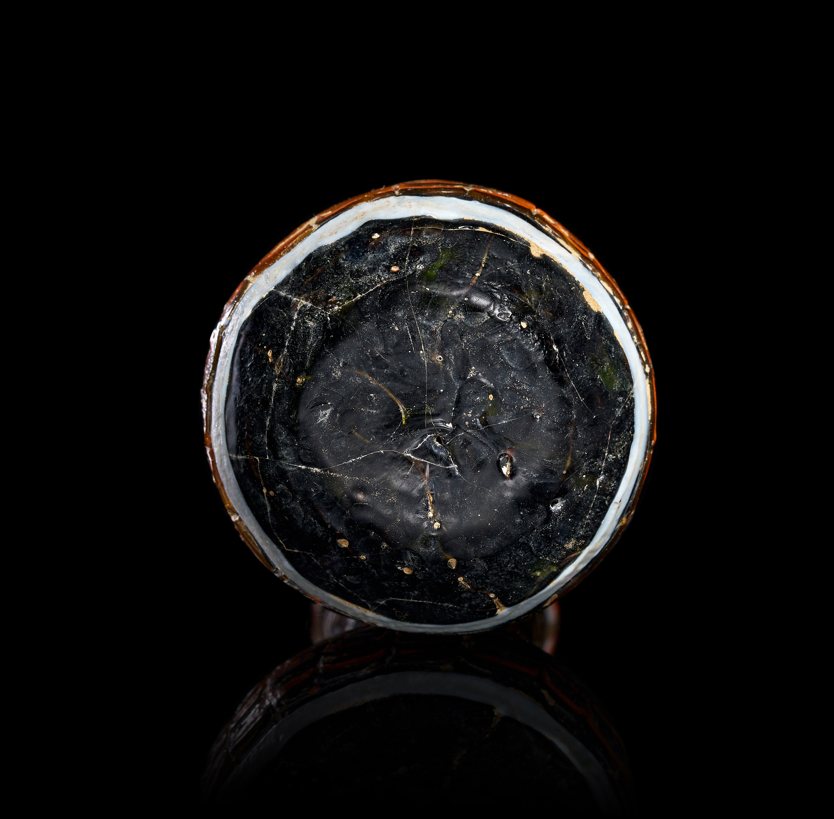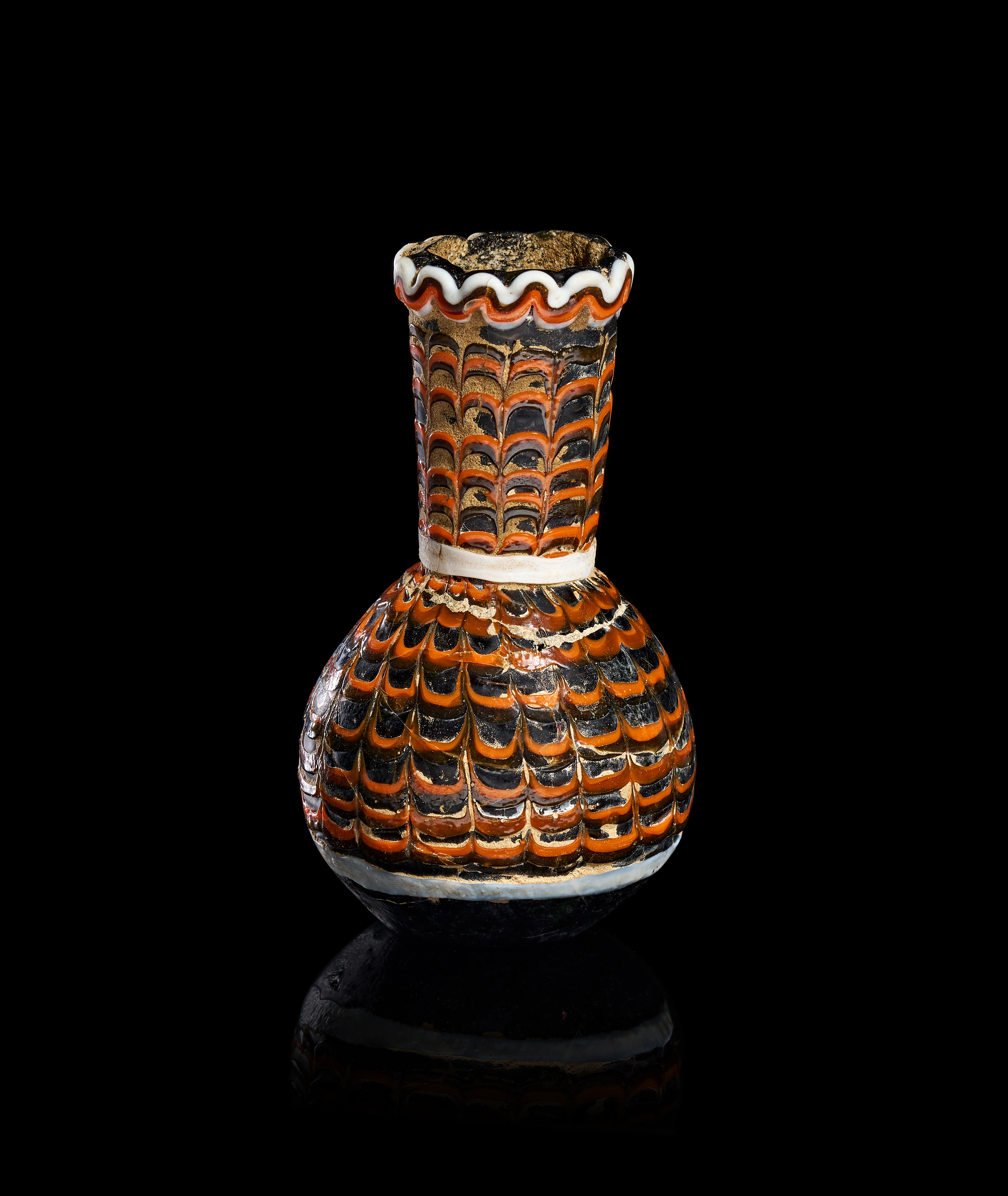 The body and neck are decorated with trailed and combed marvered threads of orange and white glass in a feathered pattern. A solid white band encircles the base of the neck and the lower portion of the body. The vessel features a bulbous body and a cylindrical neck topped with a wavy, flared rim. The circular base is dark and slightly irregular, showing evidence of the core-forming process.