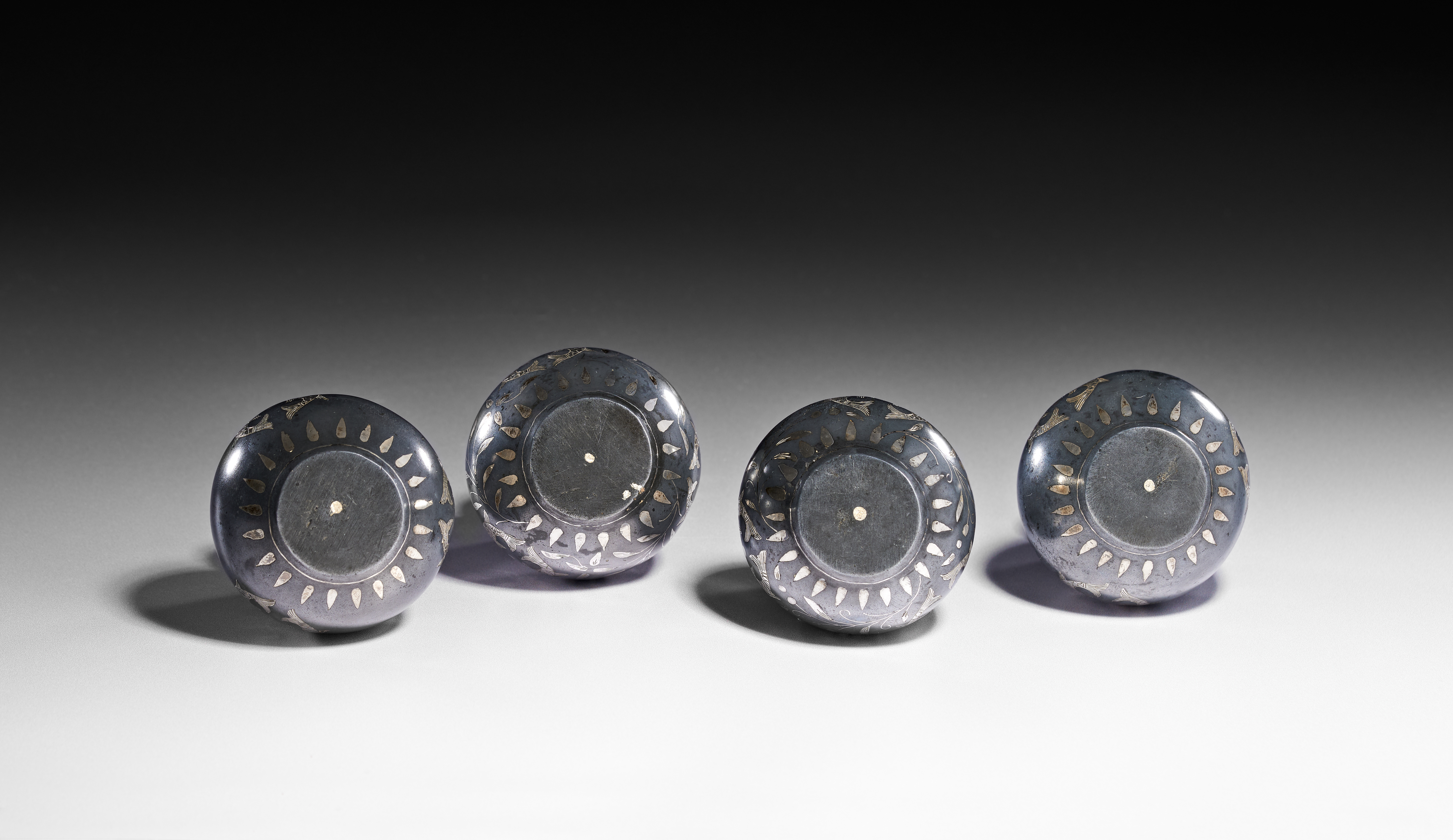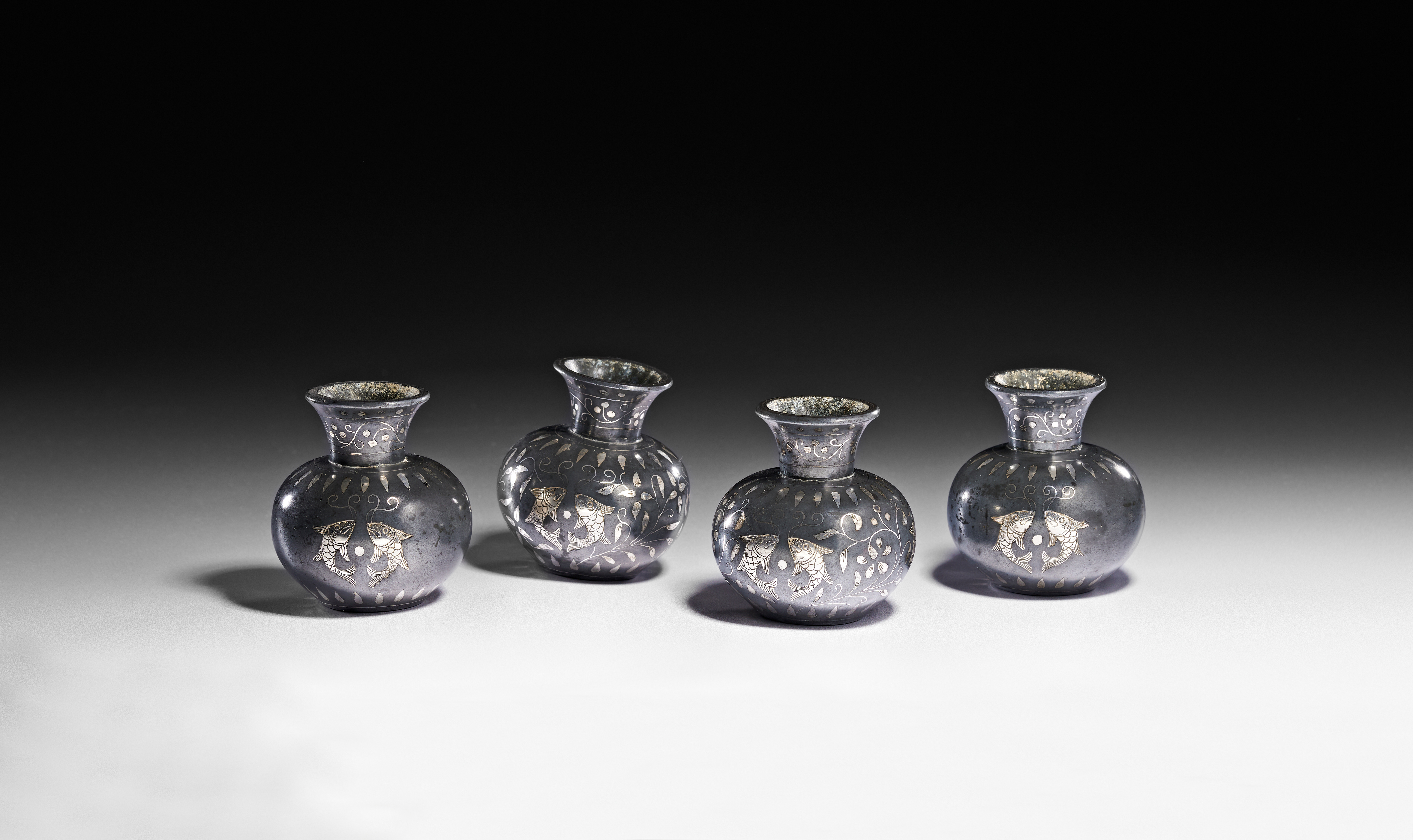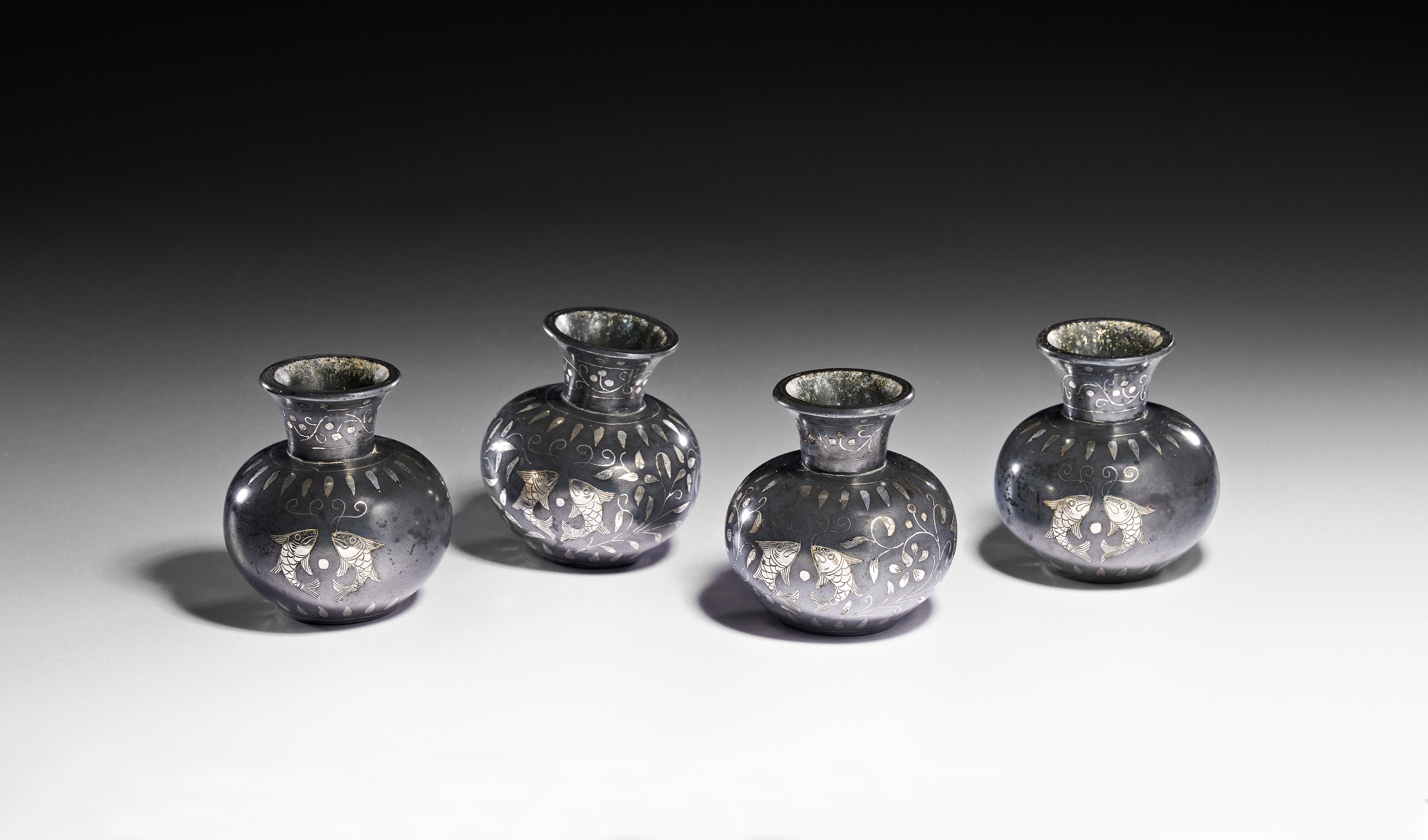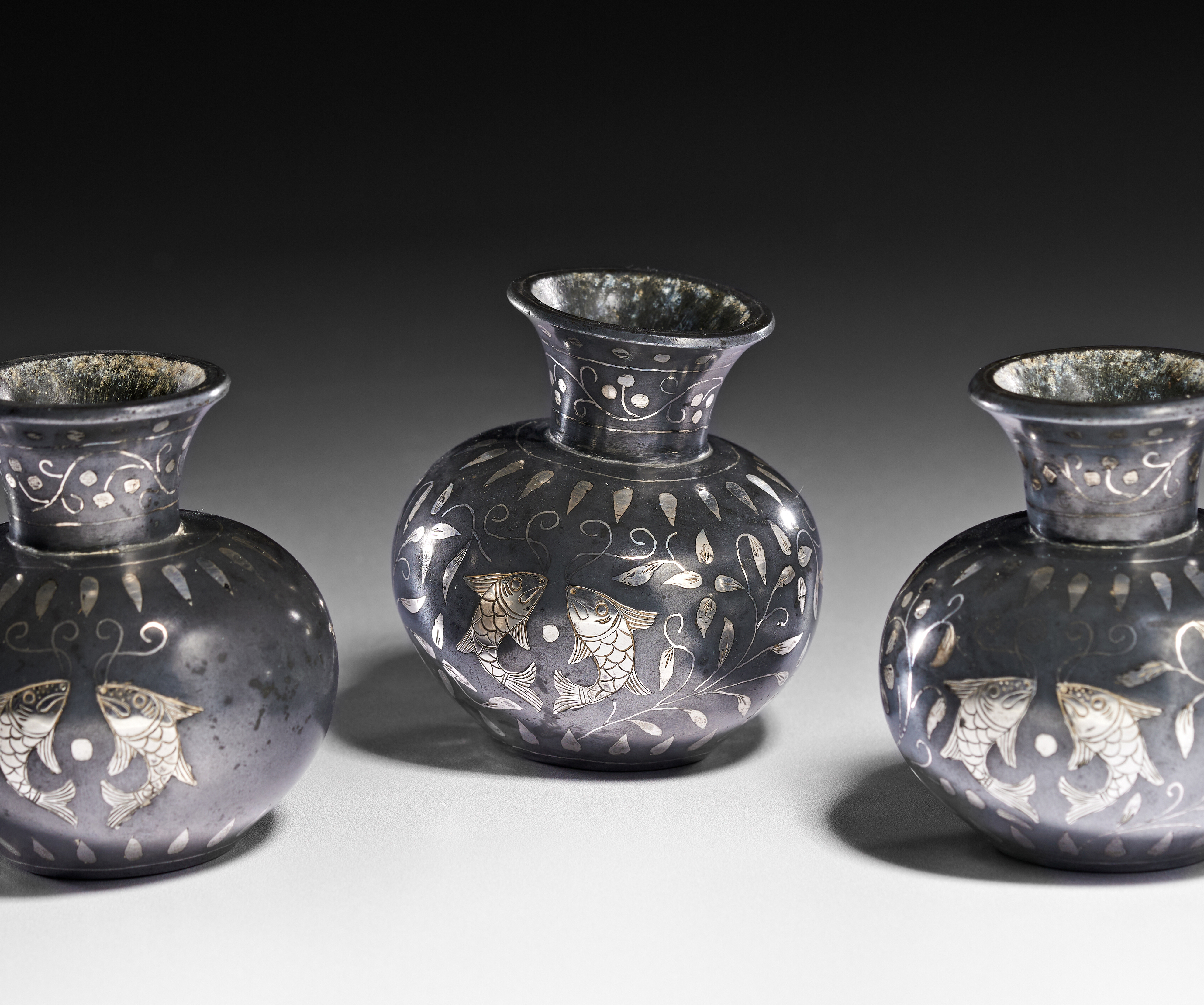 A group of Indian Bidriware vessels featuring silver-colored inlay on a dark metal alloy ground. Each vessel is of bulbous form with a flared neck. The decorative program includes a central motif of two stylized fish facing one another, set within scrolling floral and foliate patterns. A band of scrollwork ornaments the neck, while a radiating petal border is positioned on the shoulder. The underside of each vessel is flat with a central pin or plug. This metalwork technique is characteristic of the Deccan region of India.