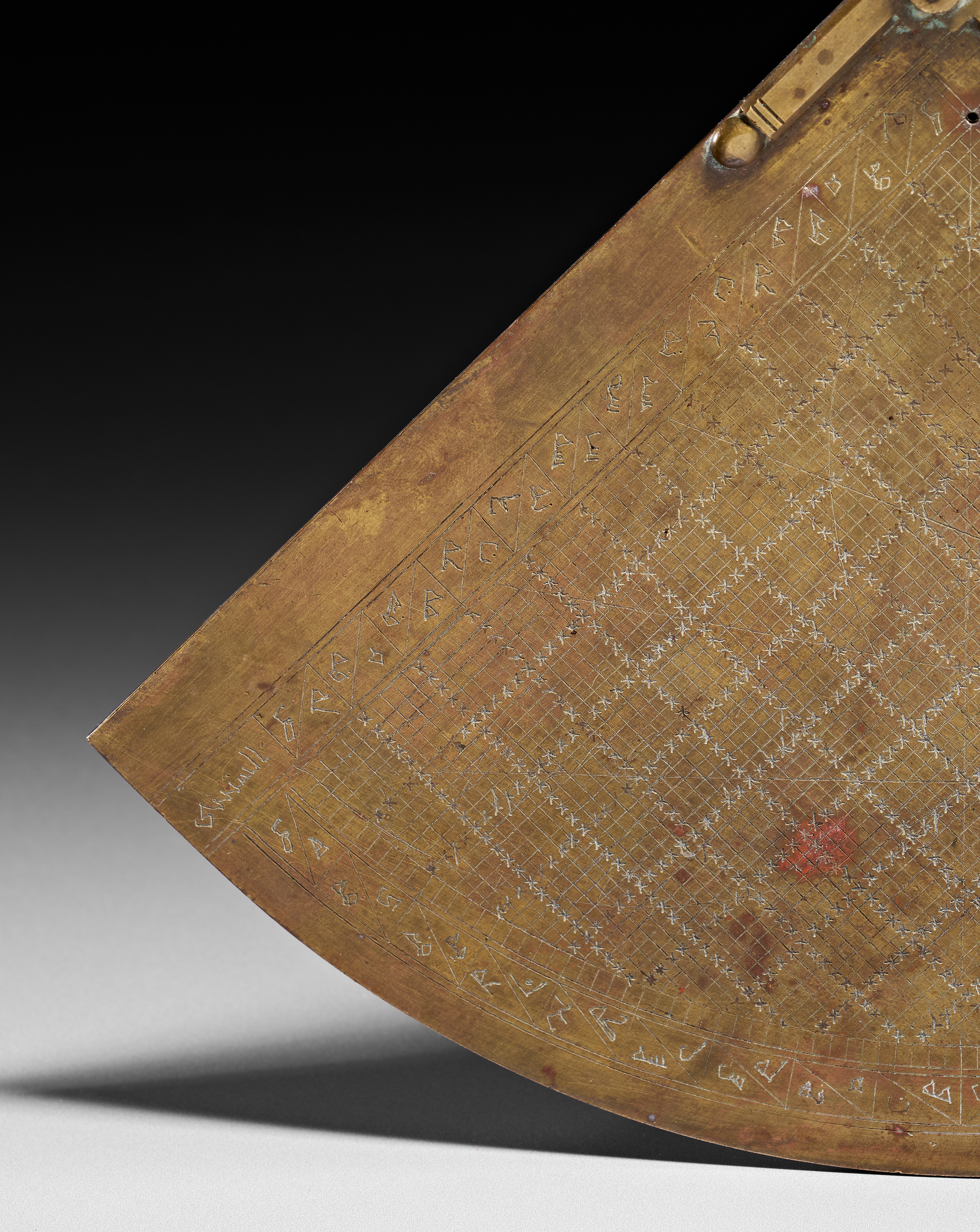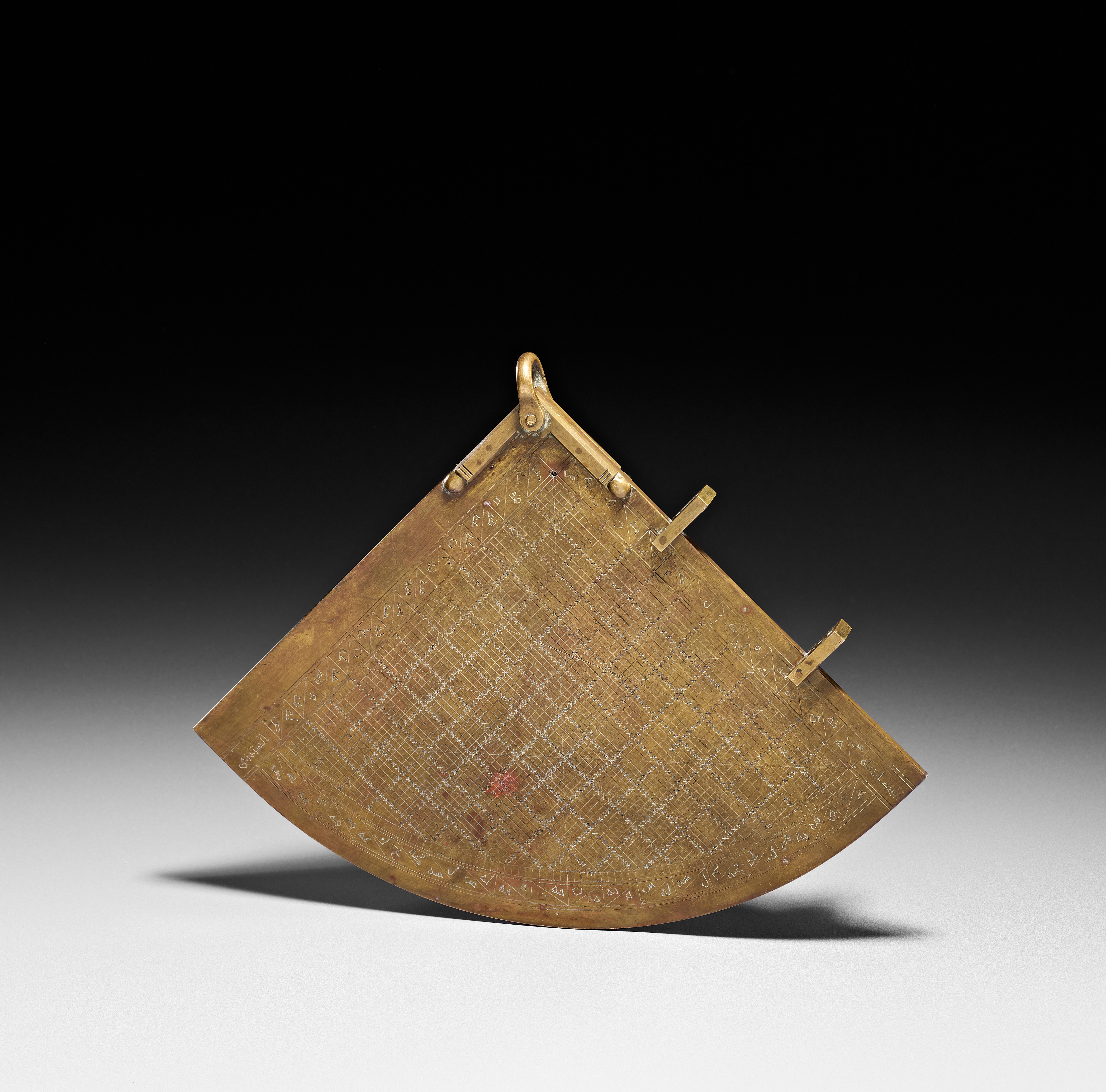 A North African brass astrolabic quadrant, likely 19th century. The instrument features a fan-shaped body engraved on both faces with mathematical scales and Arabic script. One side displays a detailed sine-cosine grid, while the reverse shows concentric altitude arcs and radial lines. The instrument is equipped with a suspension loop at its apex and two integral sighting vanes positioned along one of its straight edges. The surface is incised with abjad numerals and astronomical data.