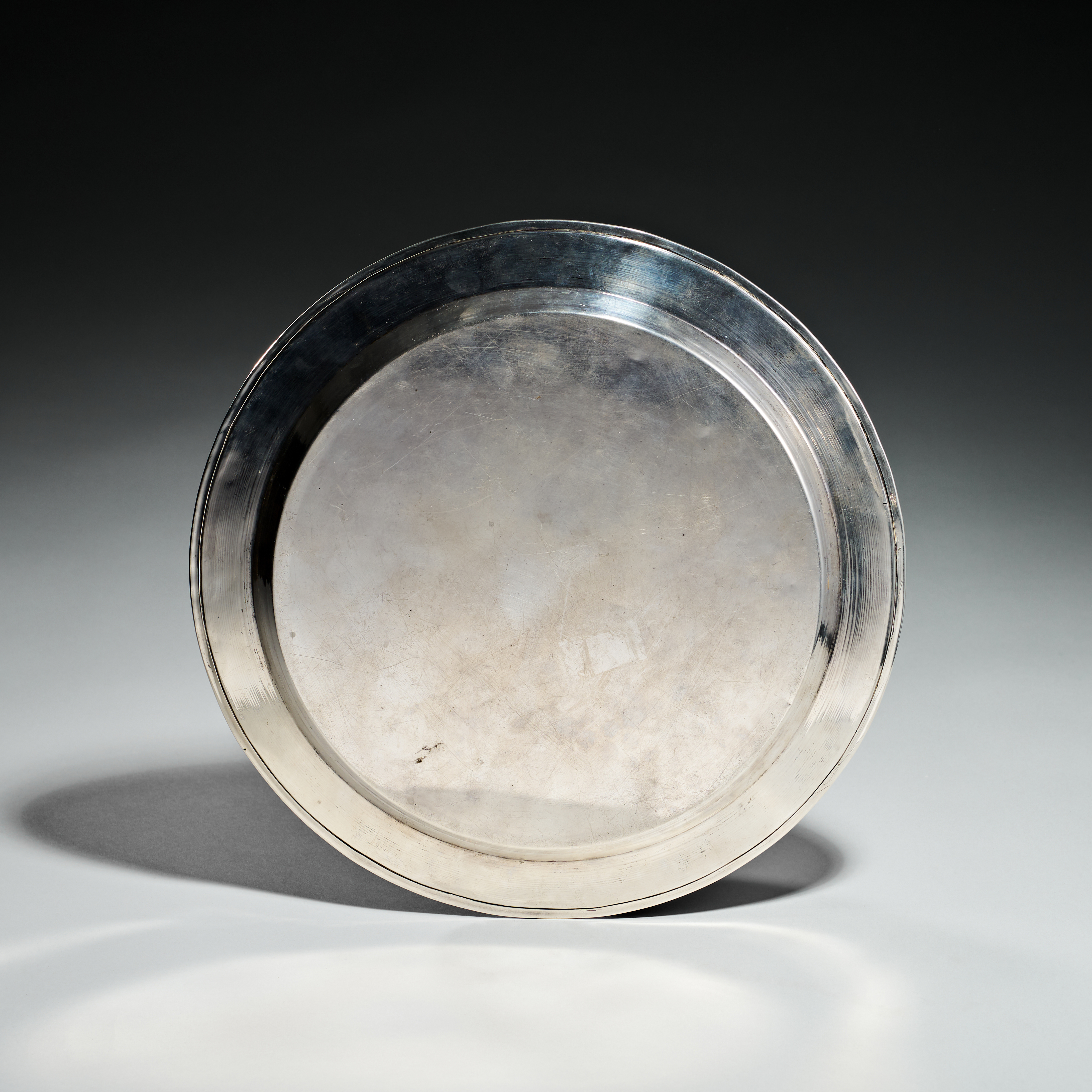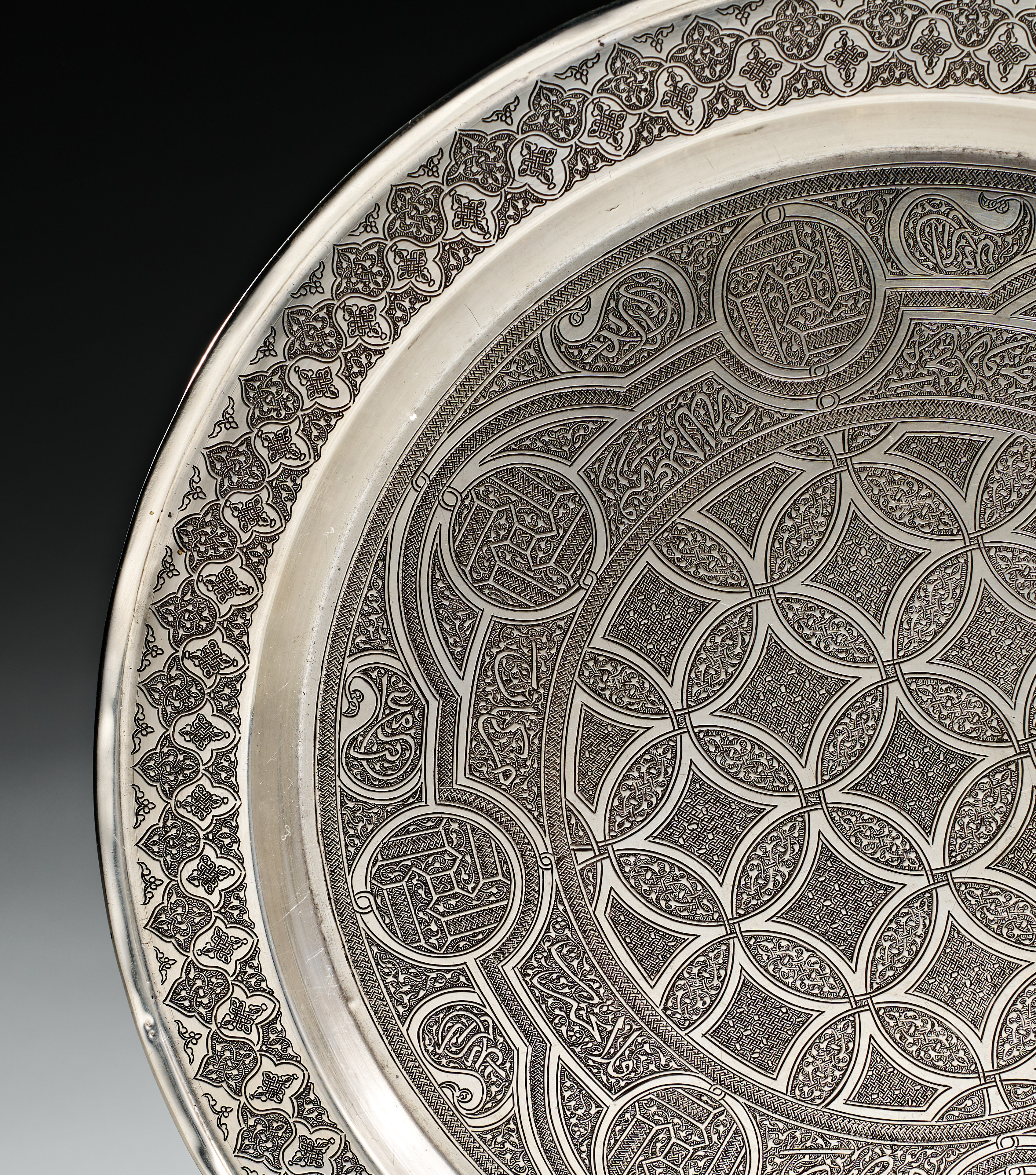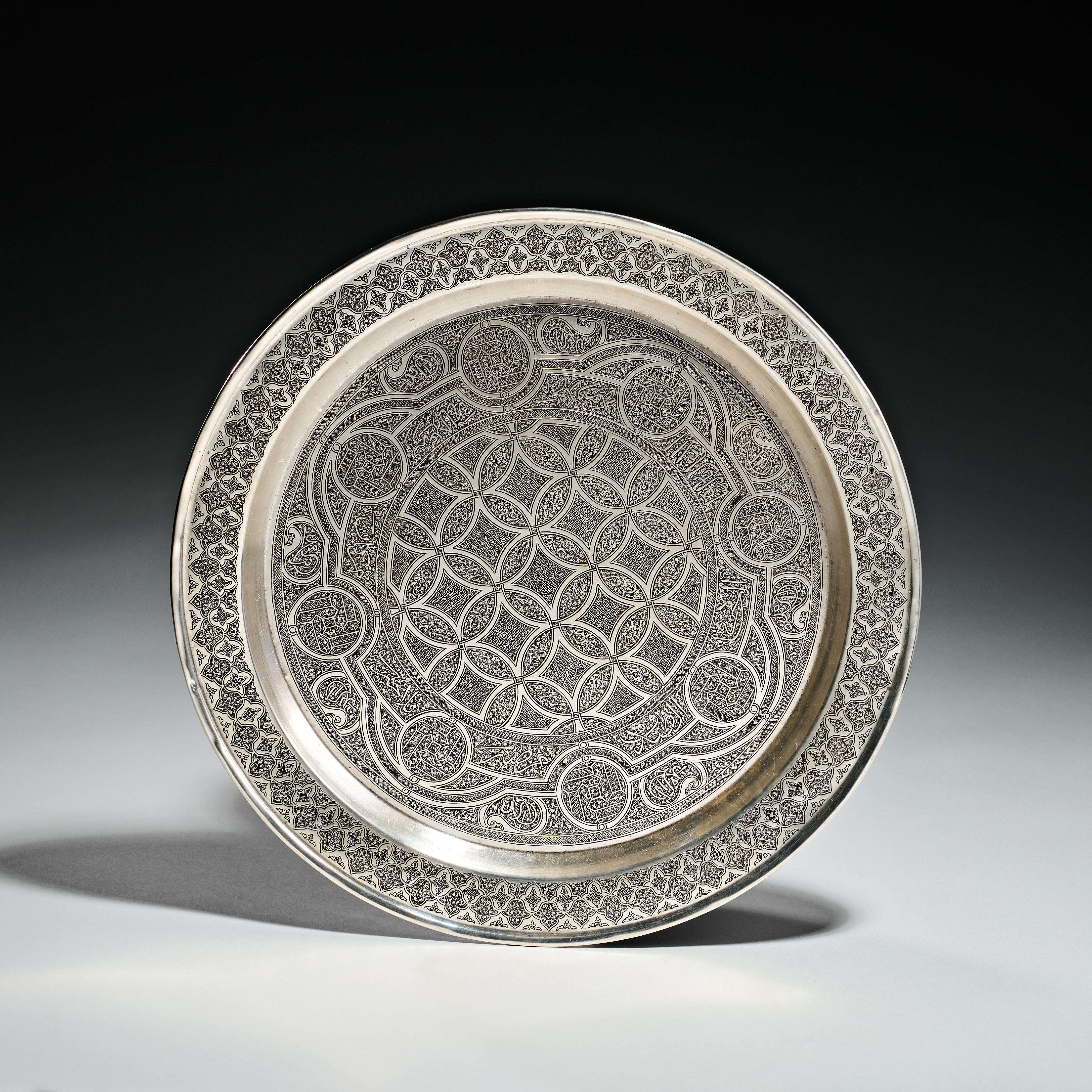 This circular tray is made of silver and decorated with traditional Islamic engraved motifs. The interior surface features a central field of interlocking geometric circles and lozenges. This area is surrounded by a wide band containing circular medallions with Arabic calligraphic inscriptions. These medallions are interspersed with scrolling foliate and arabesque designs. The entire composition is framed by a border of repeating stylized floral patterns. The reverse of the tray is plain and features a slightly raised rim.