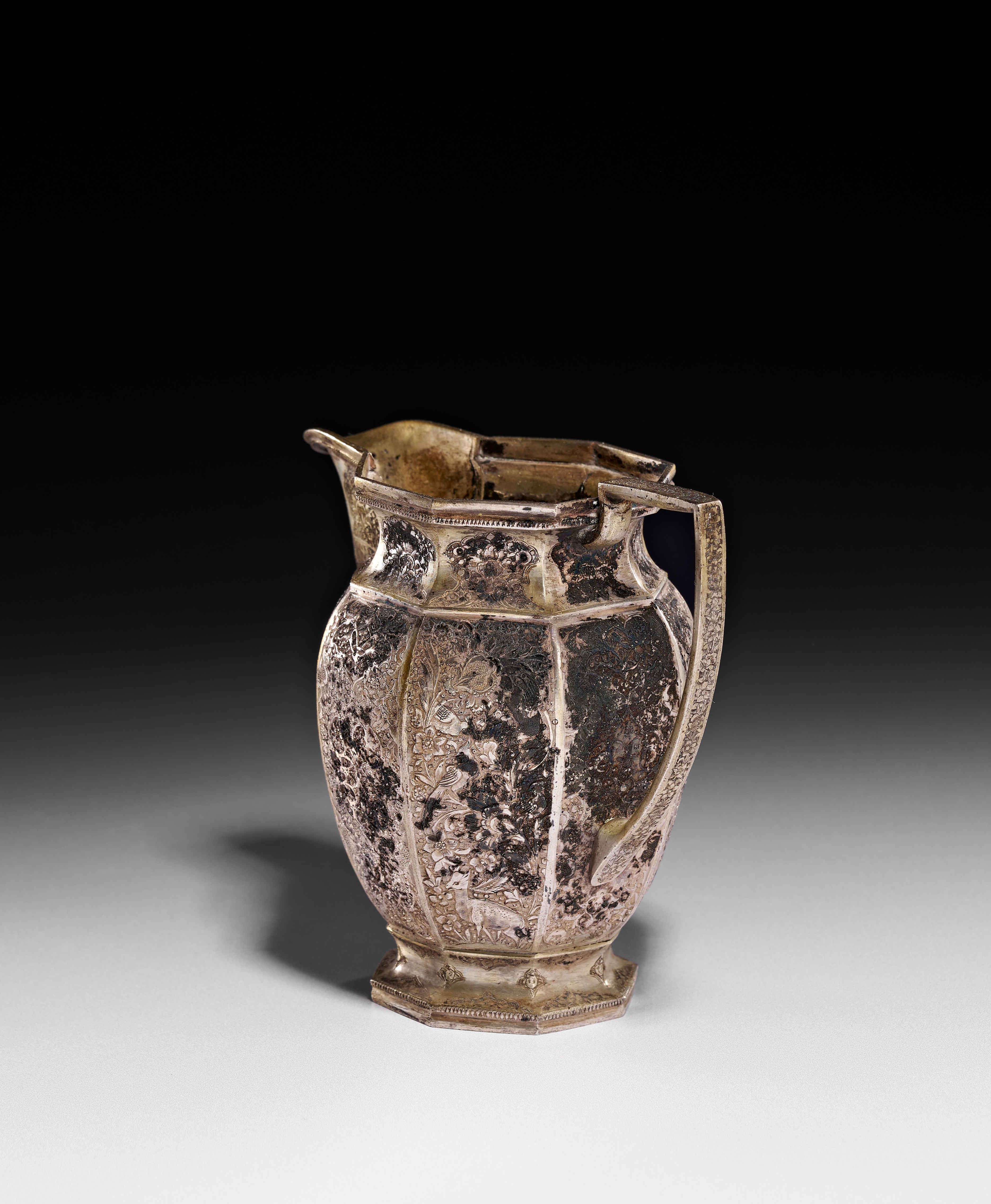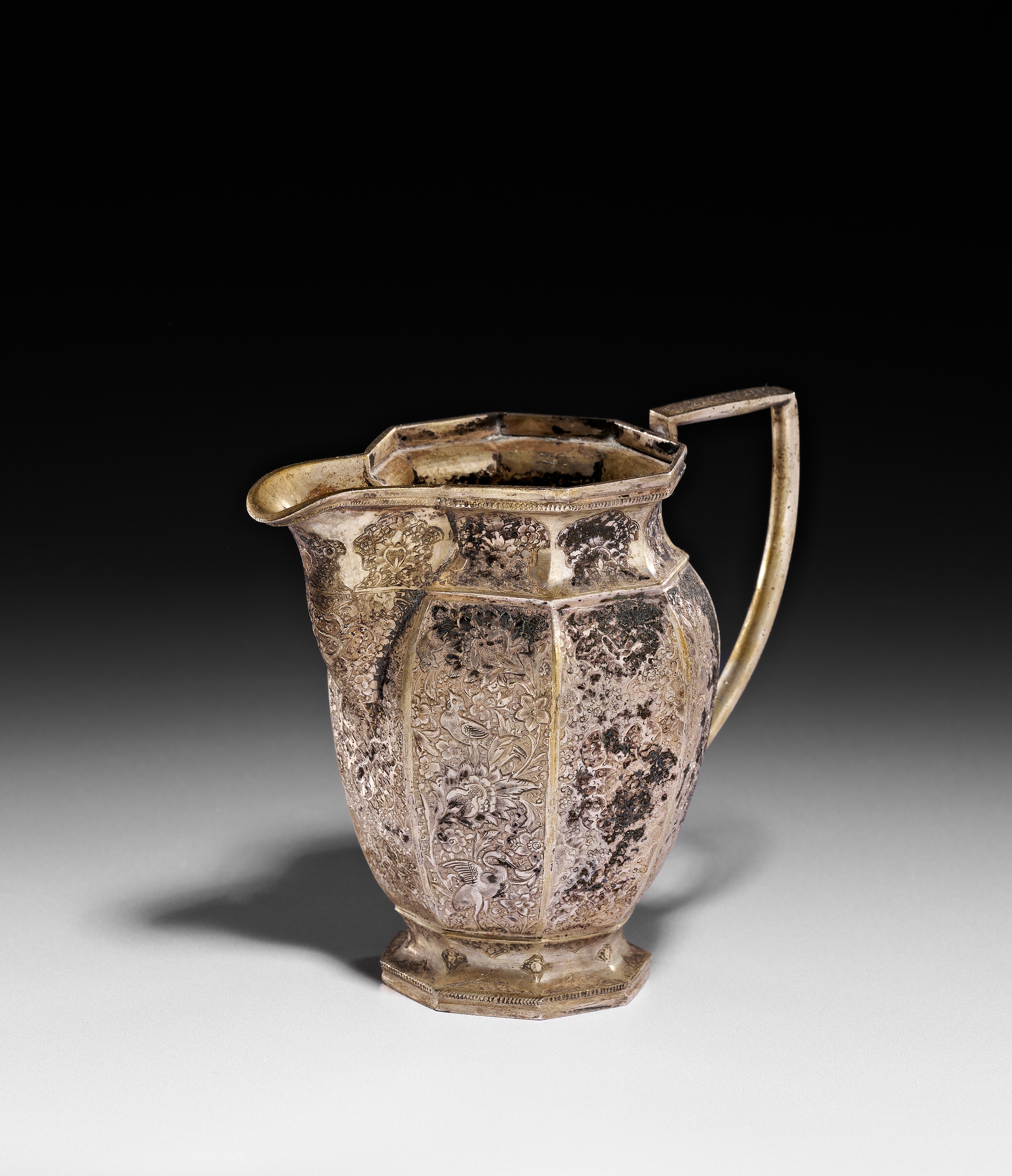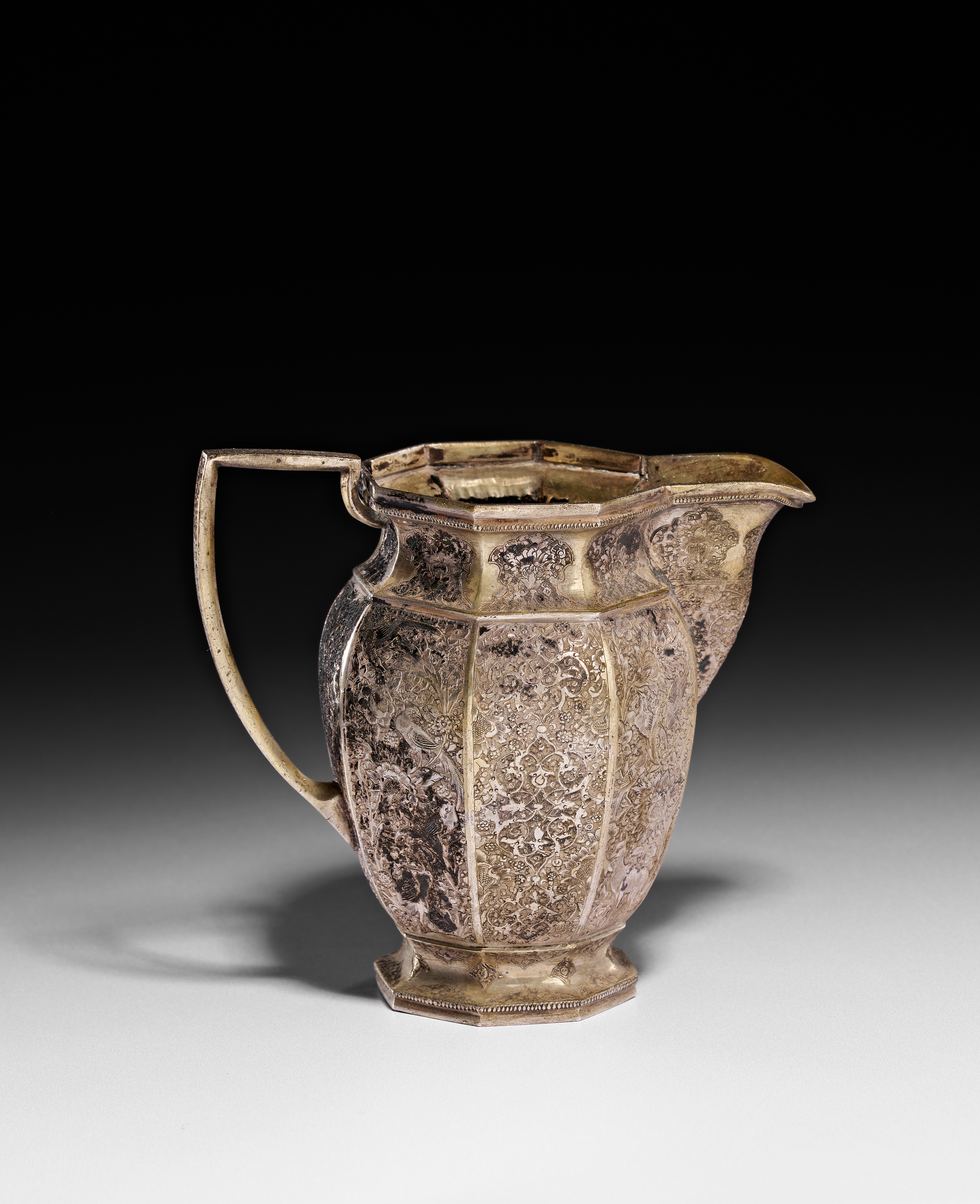This Persian silver pitcher features an octagonal faceted body with an angular handle and a flared spout, all resting on a matching octagonal footed base. The exterior is decorated with dense hand-engraved floral arabesques, birds, and animals, characteristic of the Qajar period. The decoration includes small cartouches near the rim and complex pattern work within the faceted panels. The vessel shows evidence of a silver-gilt finish. No hallmarks or maker marks are visible on the exterior or the underside of the base.