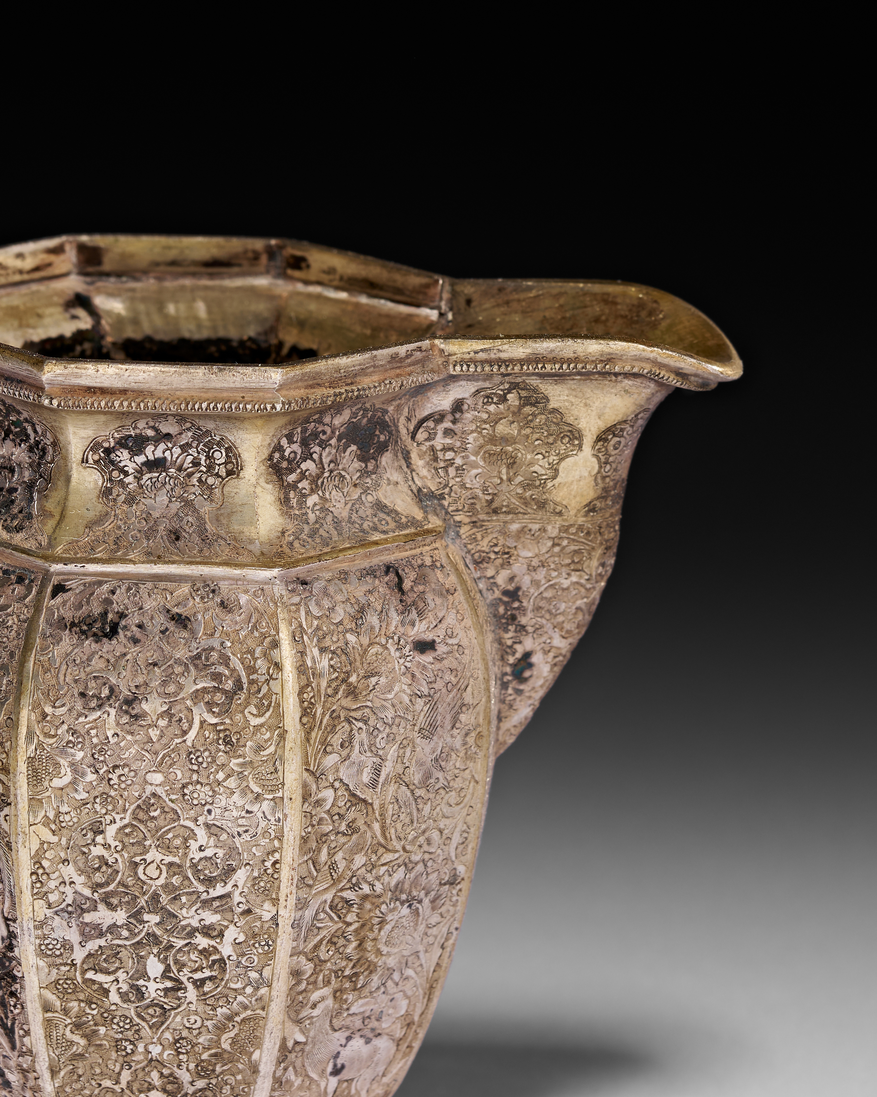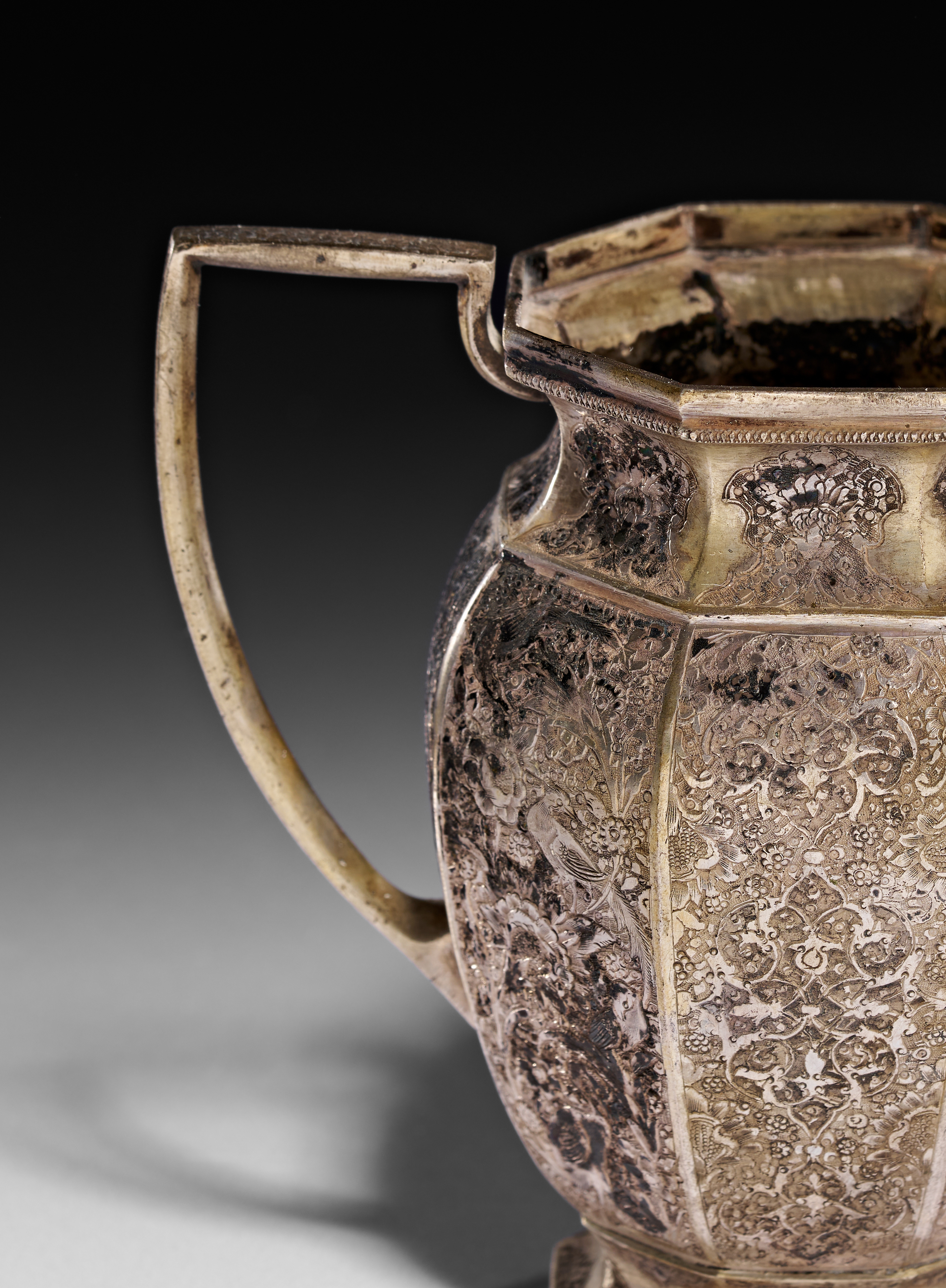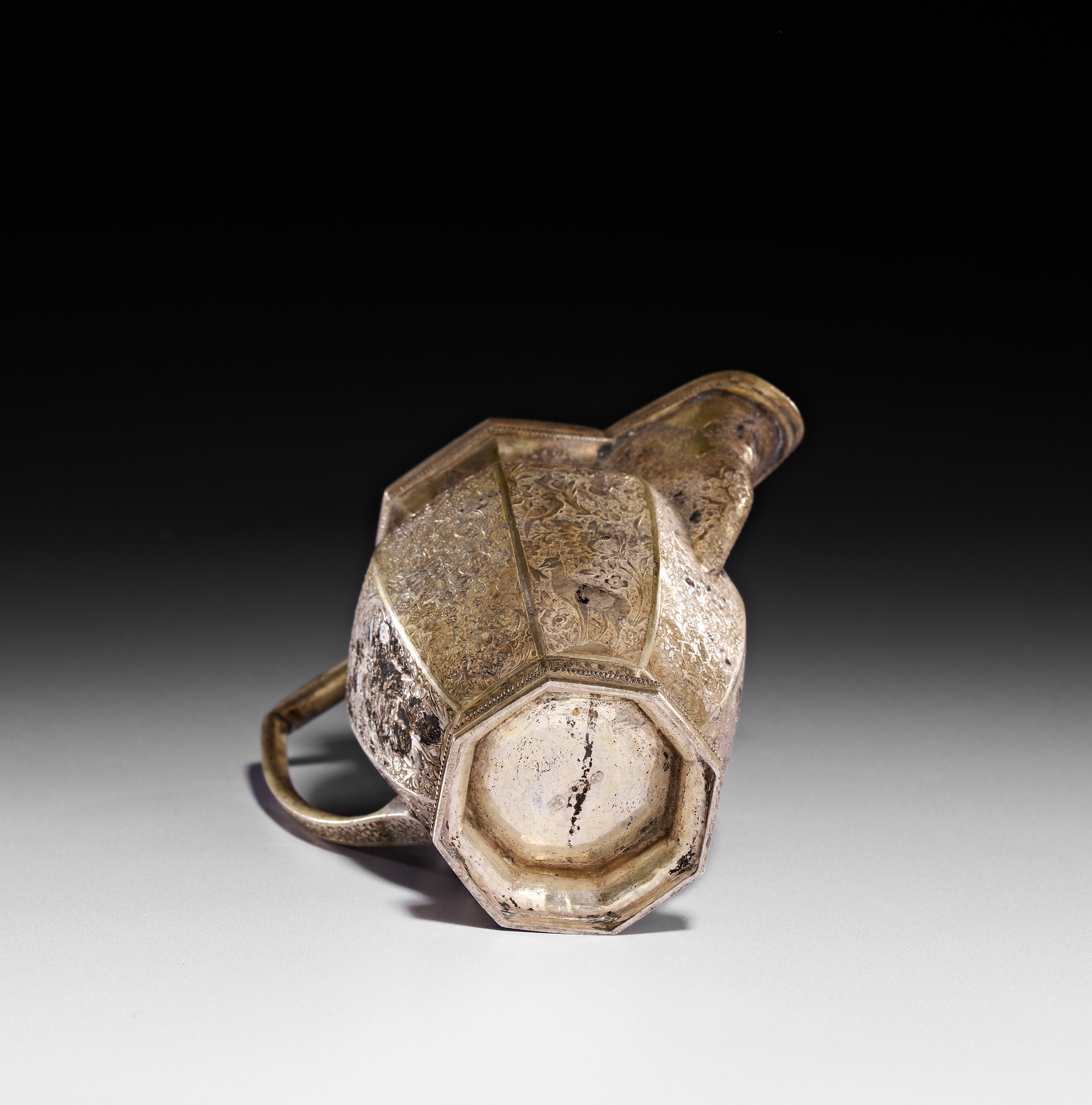 This Persian silver pitcher features an octagonal faceted body with an angular handle and a flared spout, all resting on a matching octagonal footed base. The exterior is decorated with dense hand-engraved floral arabesques, birds, and animals, characteristic of the Qajar period. The decoration includes small cartouches near the rim and complex pattern work within the faceted panels. The vessel shows evidence of a silver-gilt finish. No hallmarks or maker marks are visible on the exterior or the underside of the base.