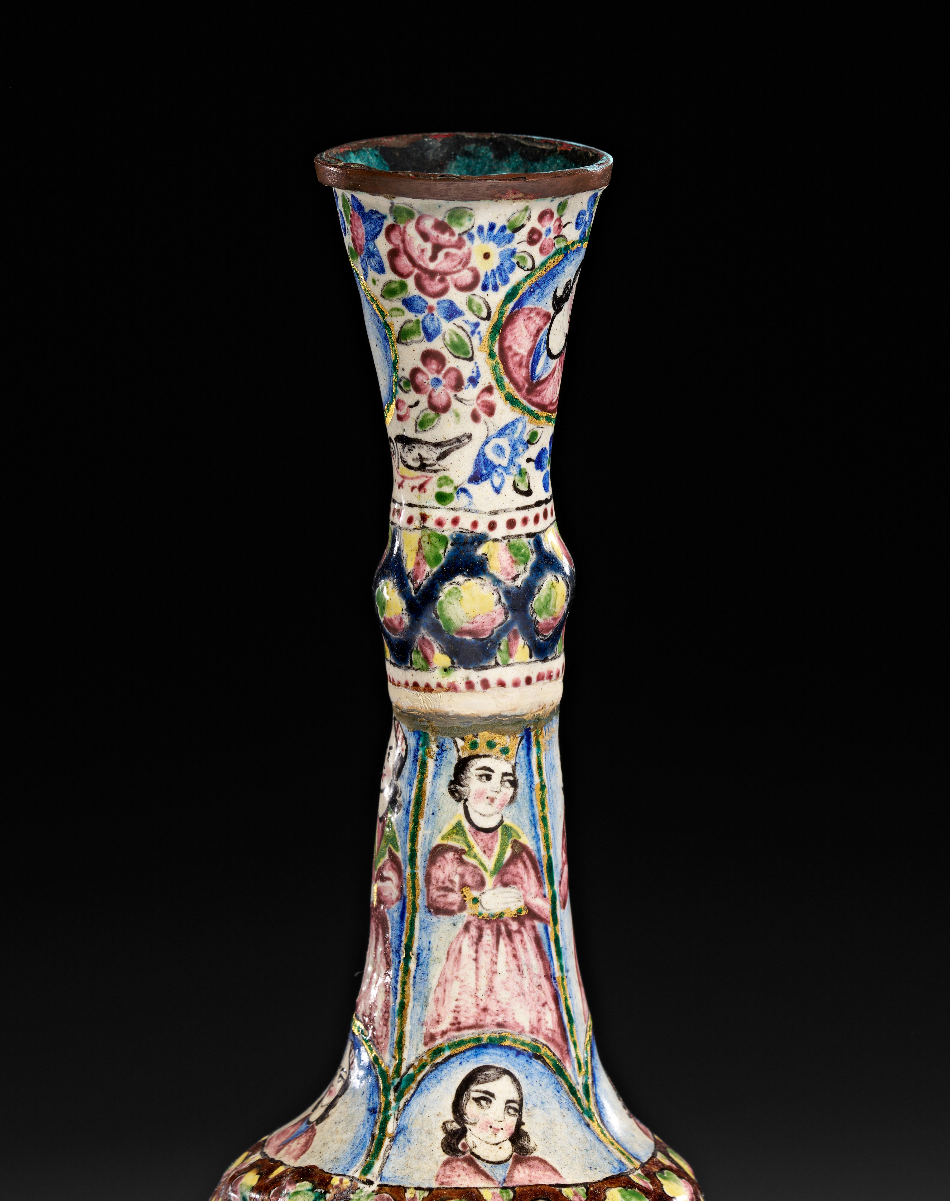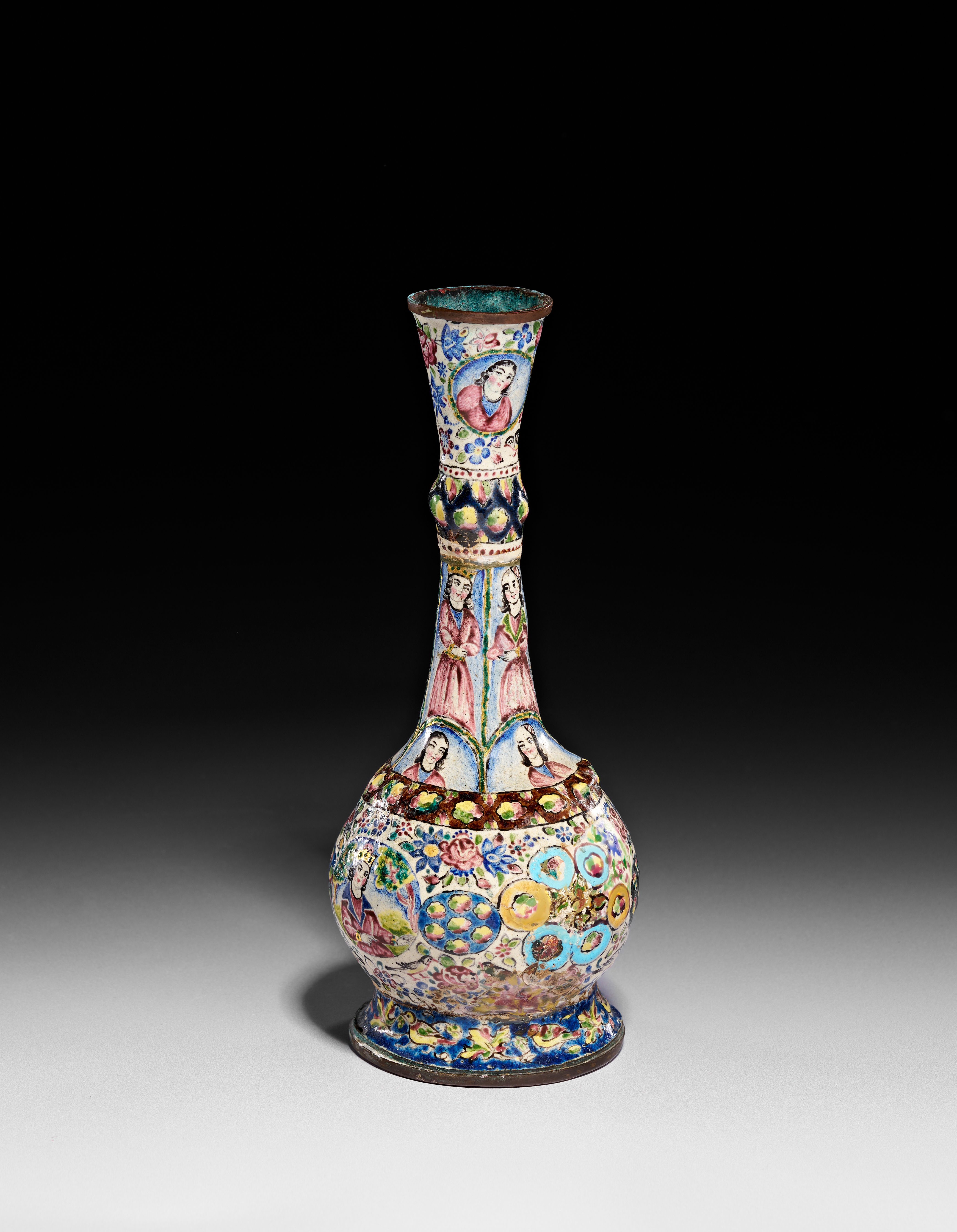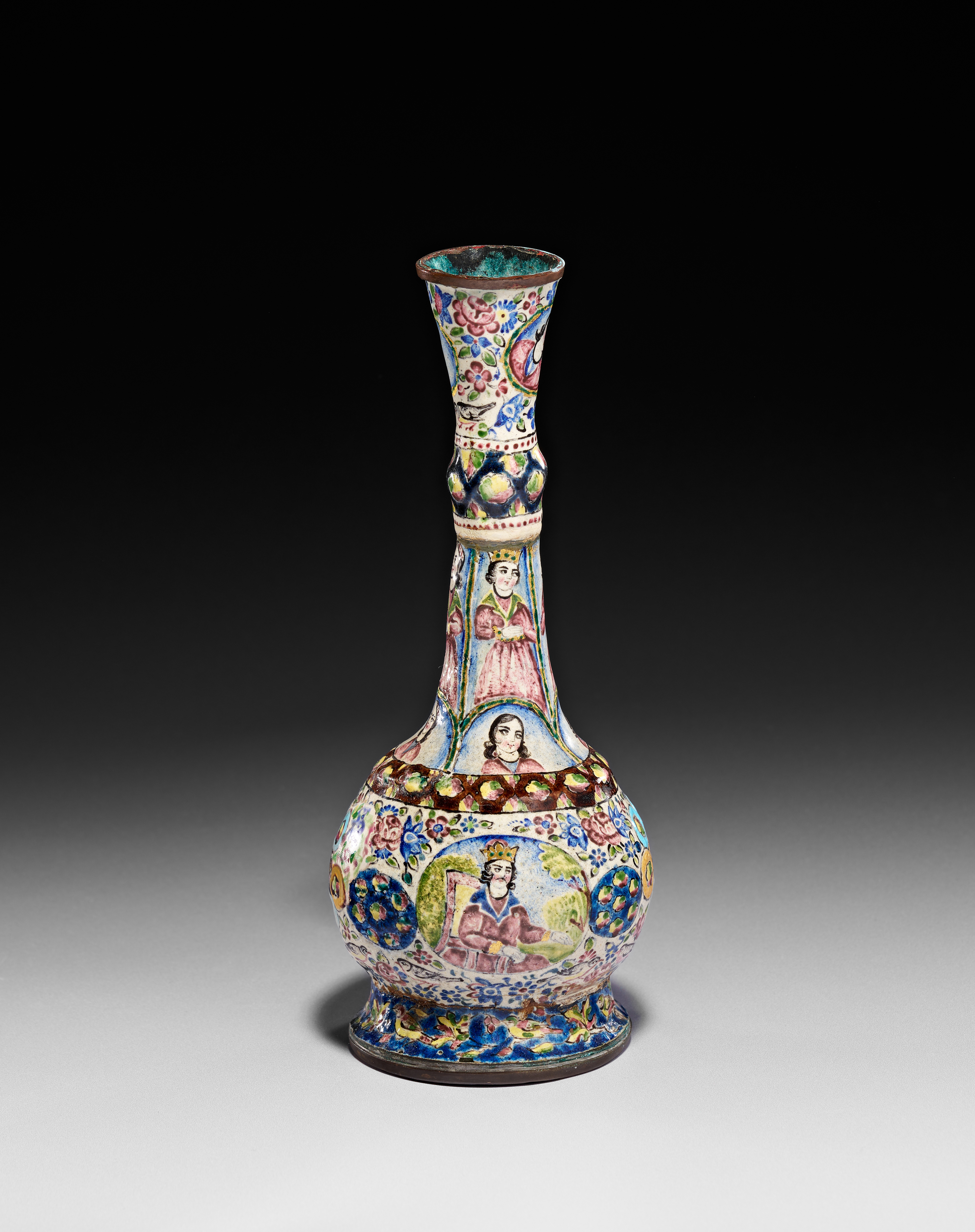 This Qajar period Persian Minakari enamel on copper vase features a slender, tapered neck with a central knop, a bulbous body, and a flared circular foot. The exterior is decorated with hand-painted polychrome scenes and motifs on a cream-colored ground. A large central medallion depicts a seated male figure in royal attire wearing a crown, surrounded by floral sprays and birds. The neck is divided into registers featuring standing female figures and portrait busts within arched panels. The piece is finished with floral patterns, geometric borders, and a green-enameled interior visible at the mouth. The underside of the foot retains remnants of a paper inventory label.