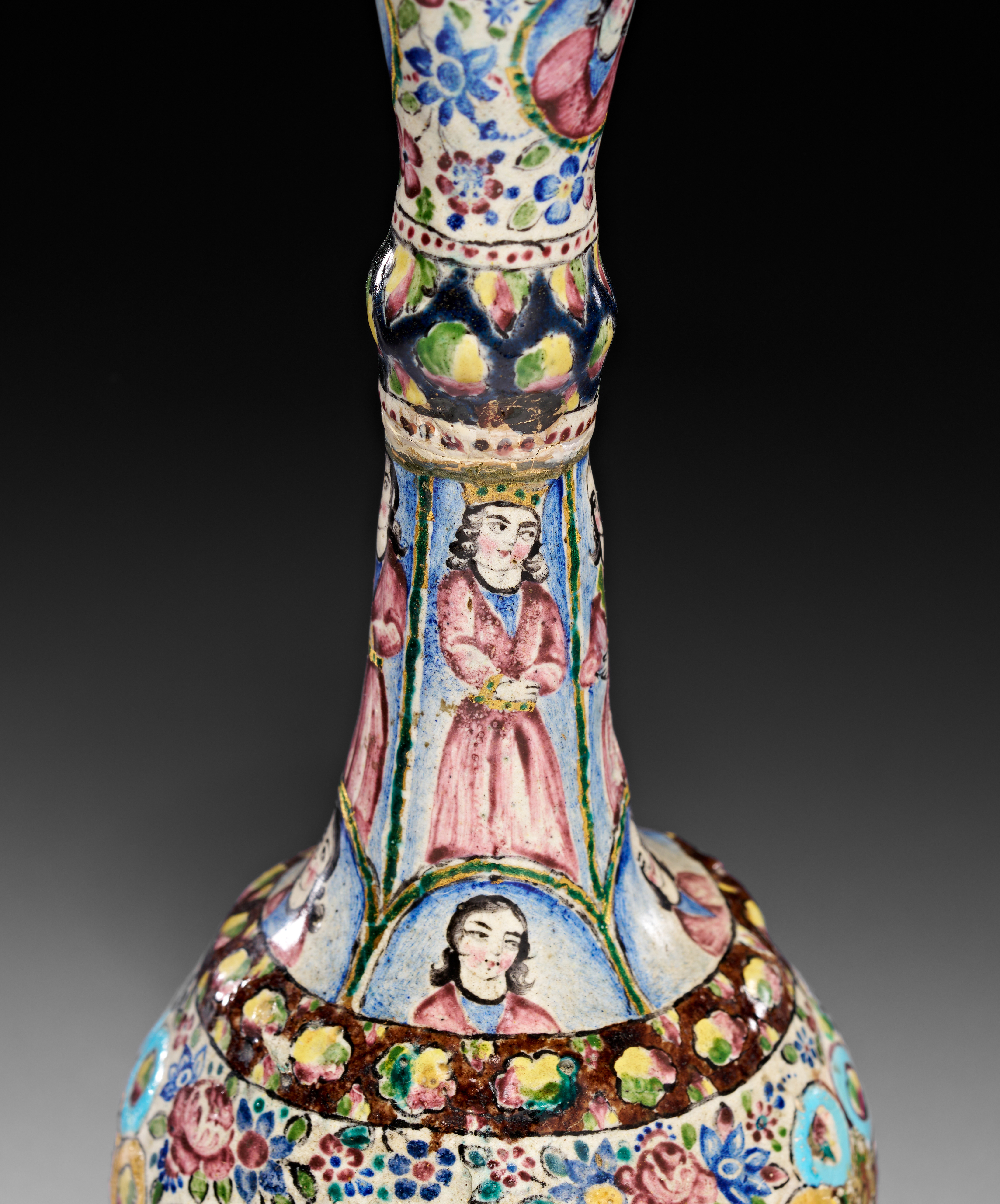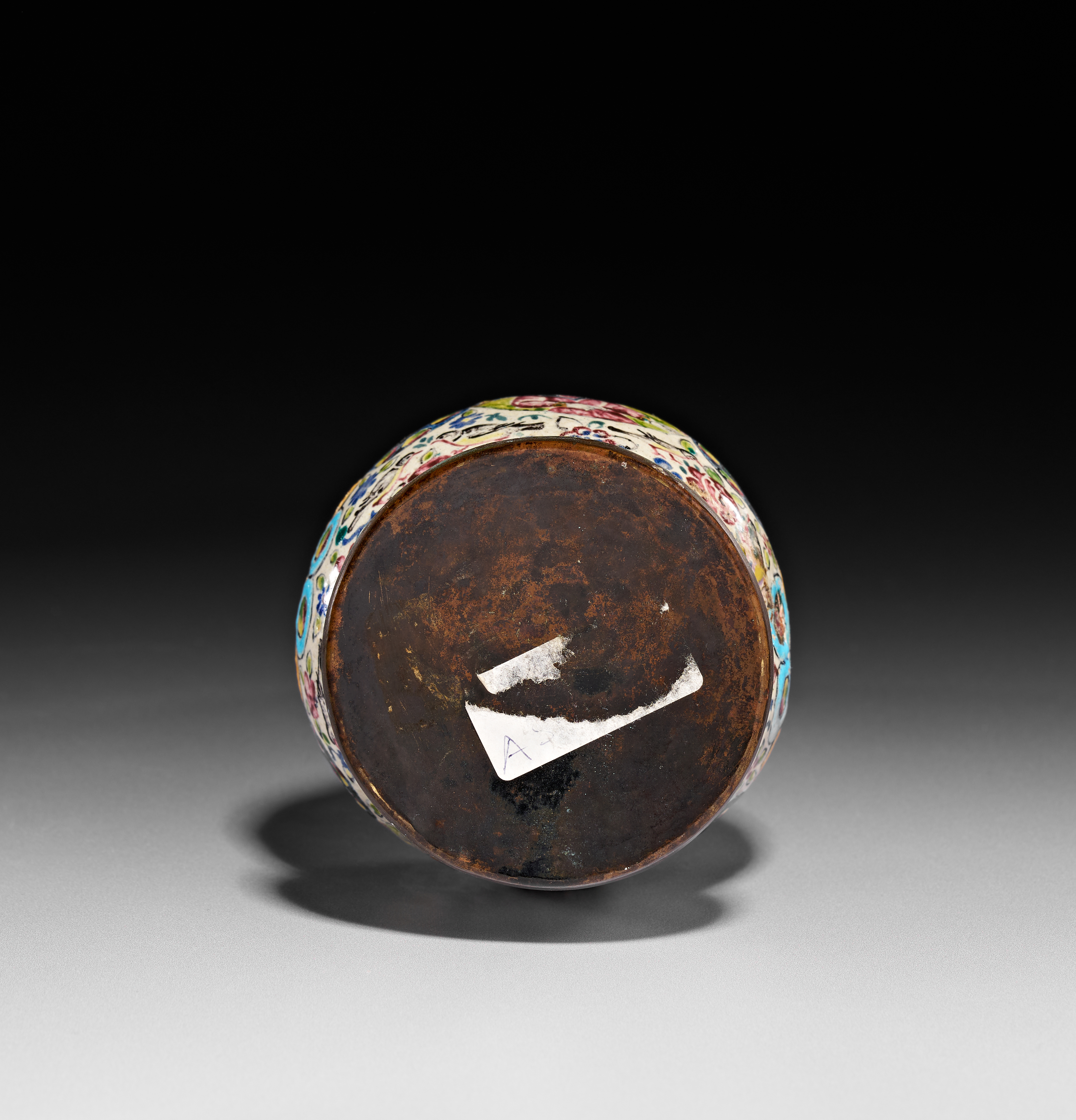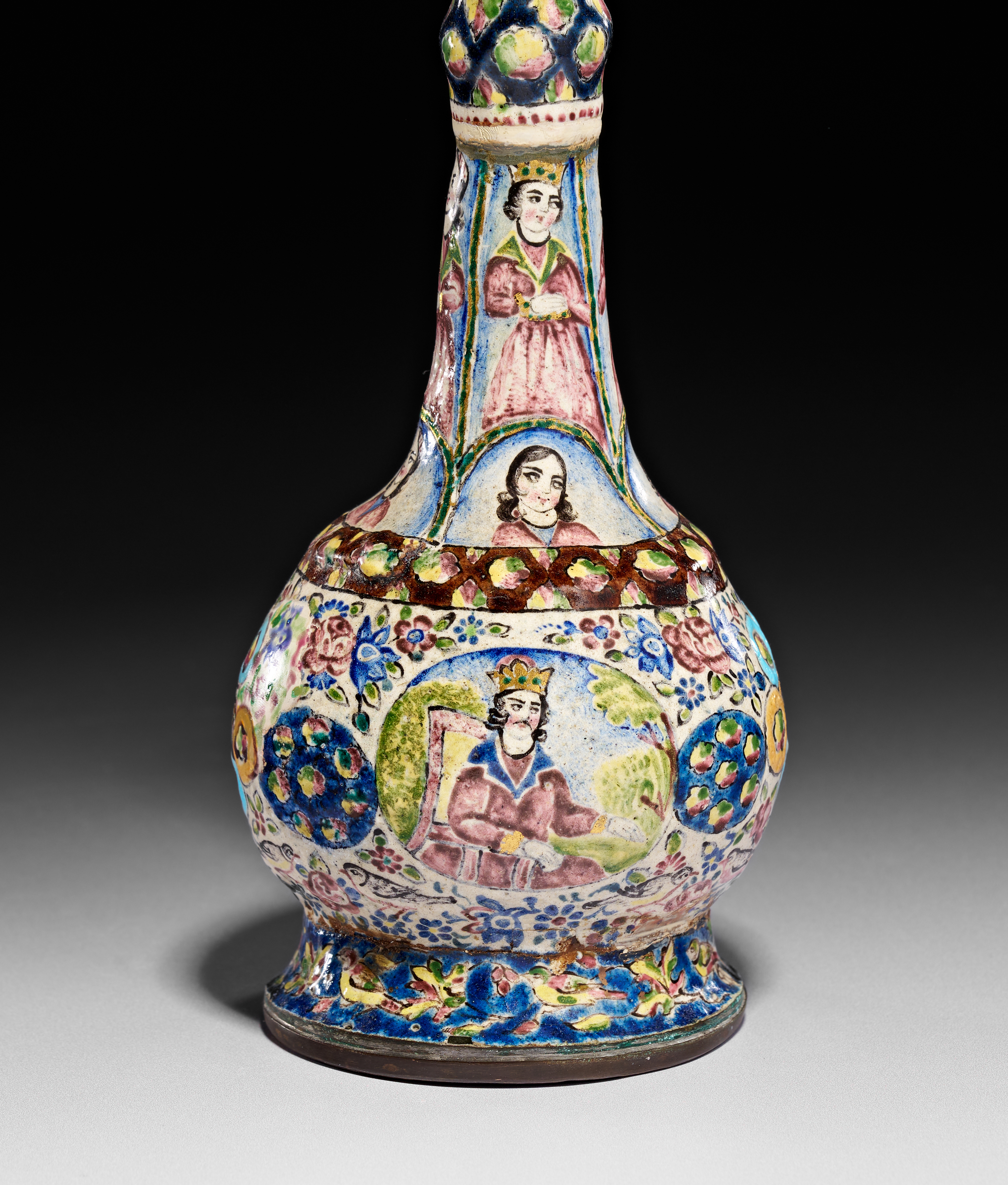 This Qajar period Persian Minakari enamel on copper vase features a slender, tapered neck with a central knop, a bulbous body, and a flared circular foot. The exterior is decorated with hand-painted polychrome scenes and motifs on a cream-colored ground. A large central medallion depicts a seated male figure in royal attire wearing a crown, surrounded by floral sprays and birds. The neck is divided into registers featuring standing female figures and portrait busts within arched panels. The piece is finished with floral patterns, geometric borders, and a green-enameled interior visible at the mouth. The underside of the foot retains remnants of a paper inventory label.