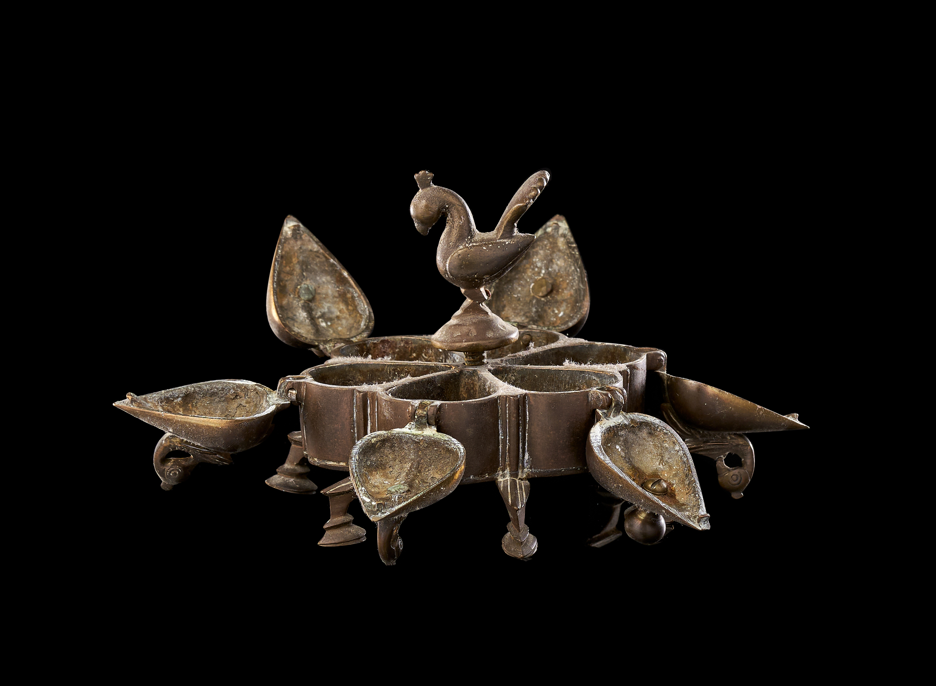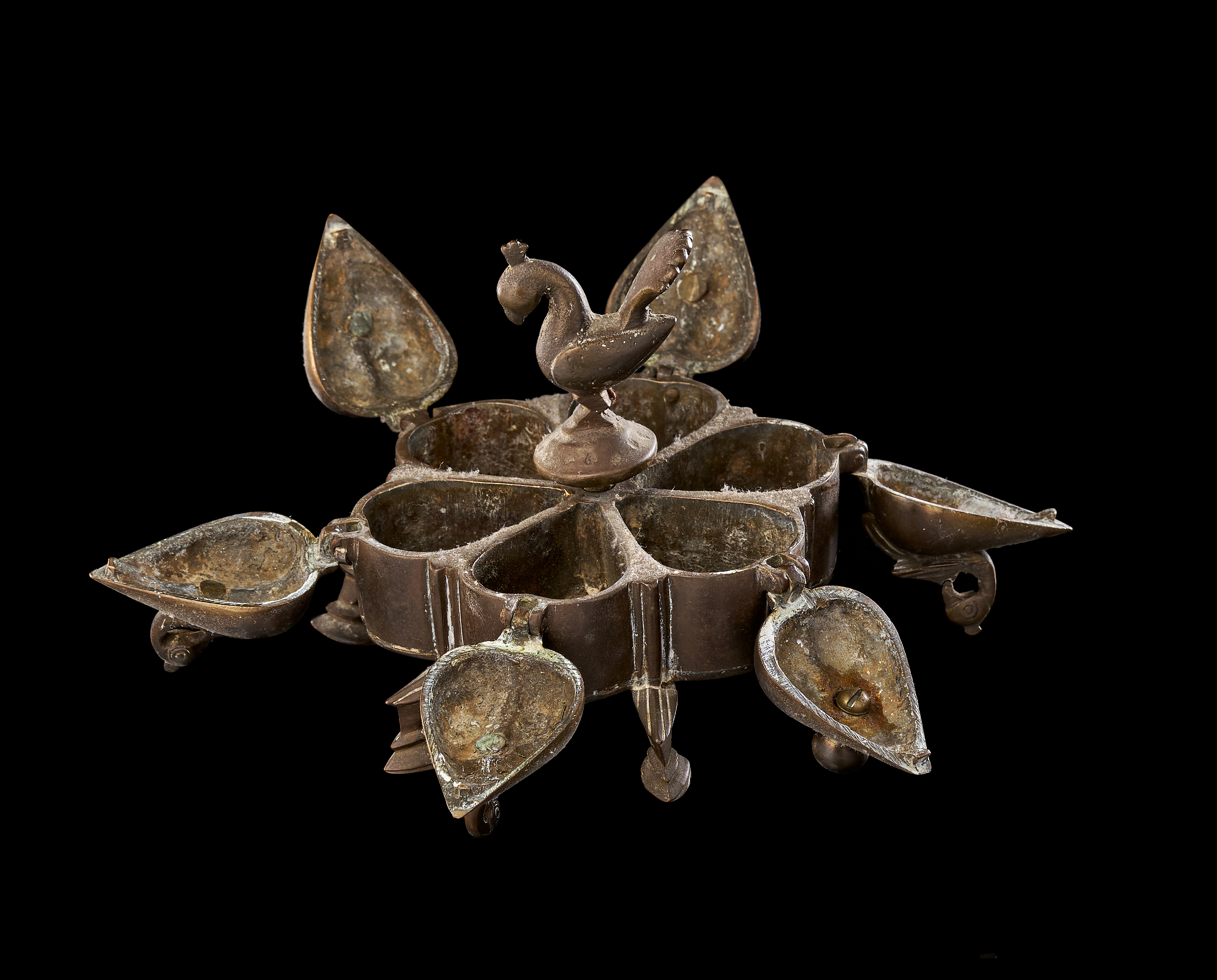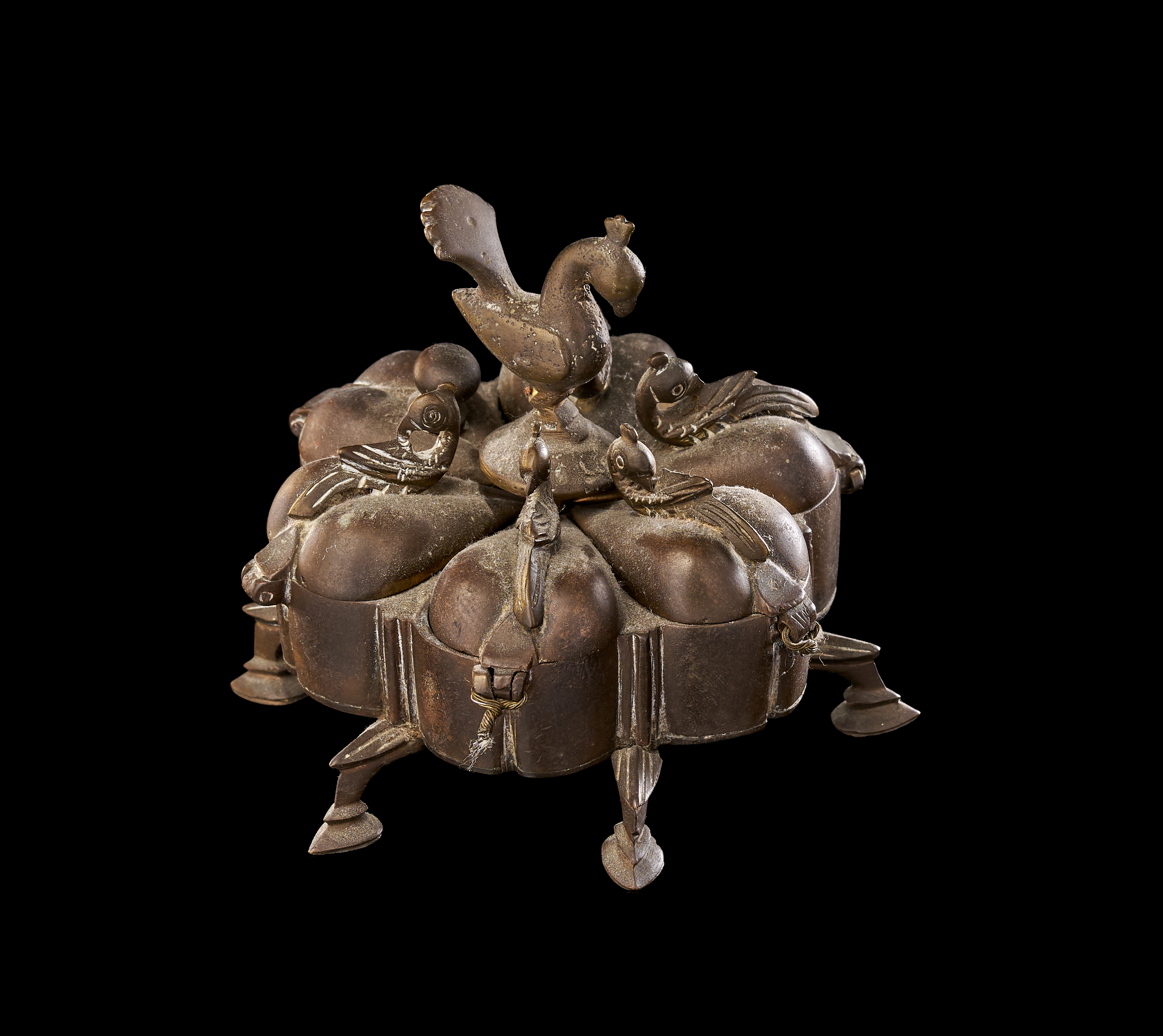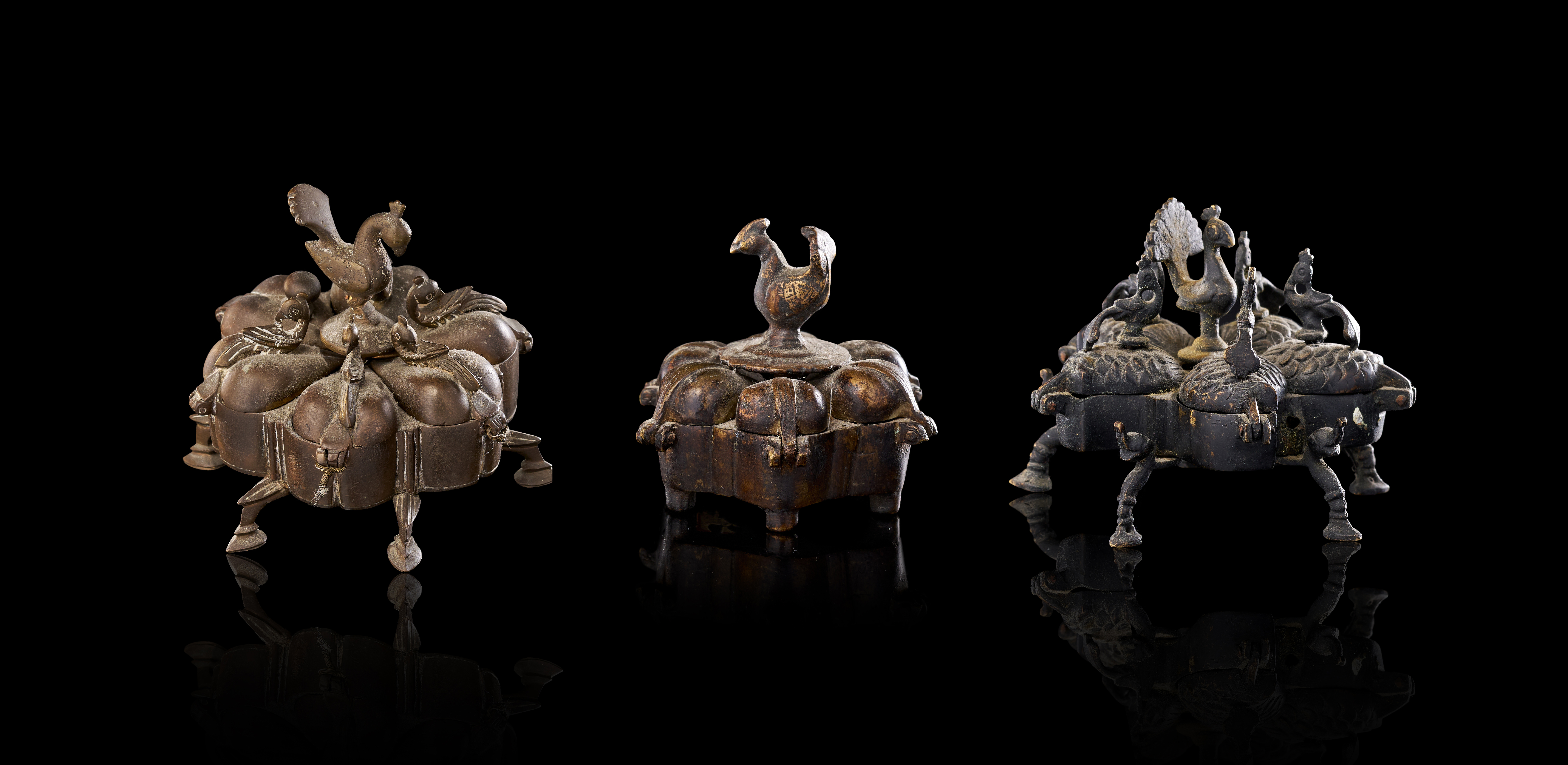 This group consists of three Indian cast copper-alloy vessels, identified as kumkum or spice boxes. Each box is designed with multiple lobed compartments arranged in a circular or polyhedral formation. The lids are surmounted by avian finials, primarily depicting peacocks with stylized plumage, which serve as central handles. The individual compartments are equipped with hinged or fitted lids. Each vessel is supported by integrated decorative feet of varying designs. The construction utilizes traditional casting techniques typical of Indian metalwork, featuring a dark, aged patina.