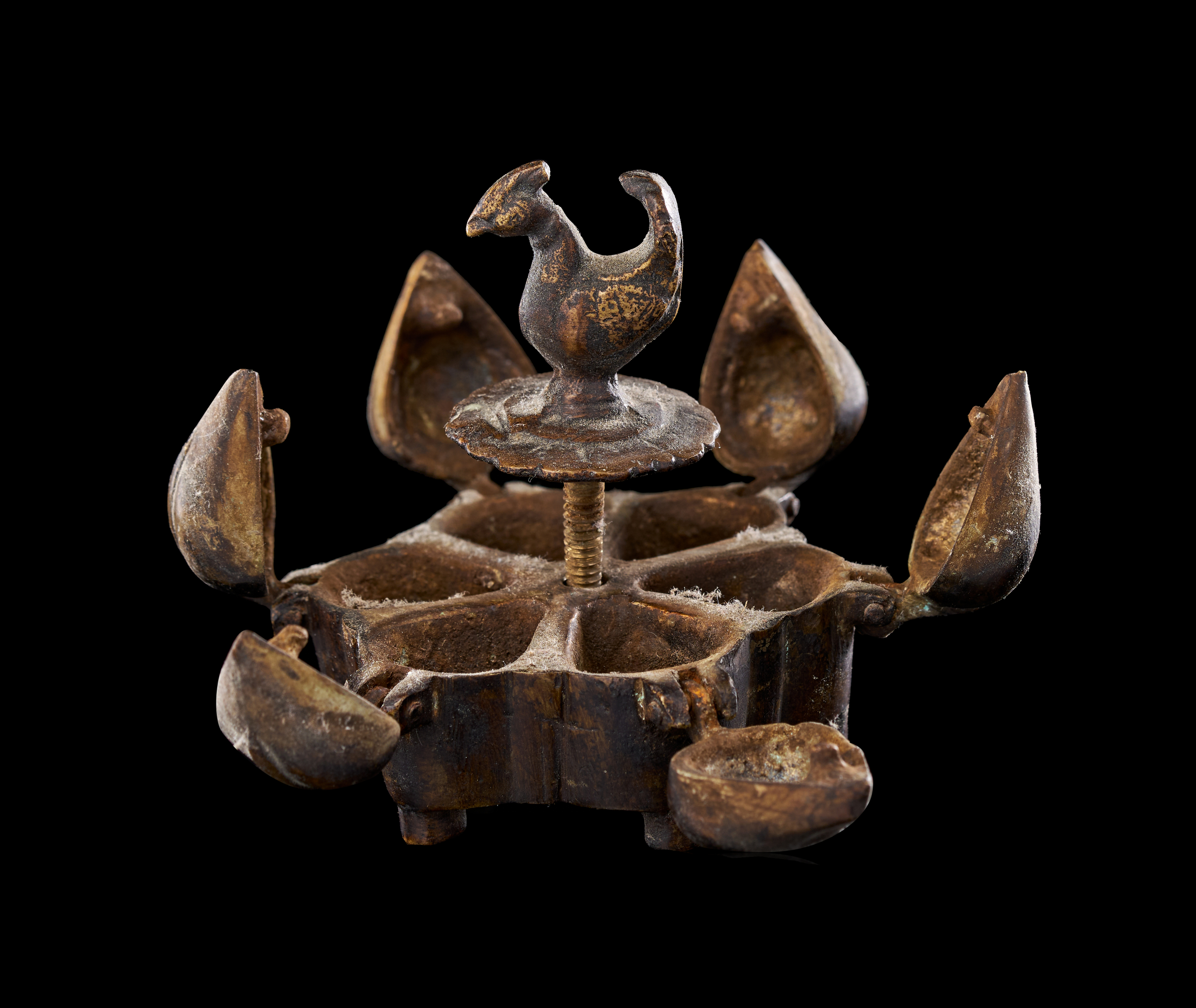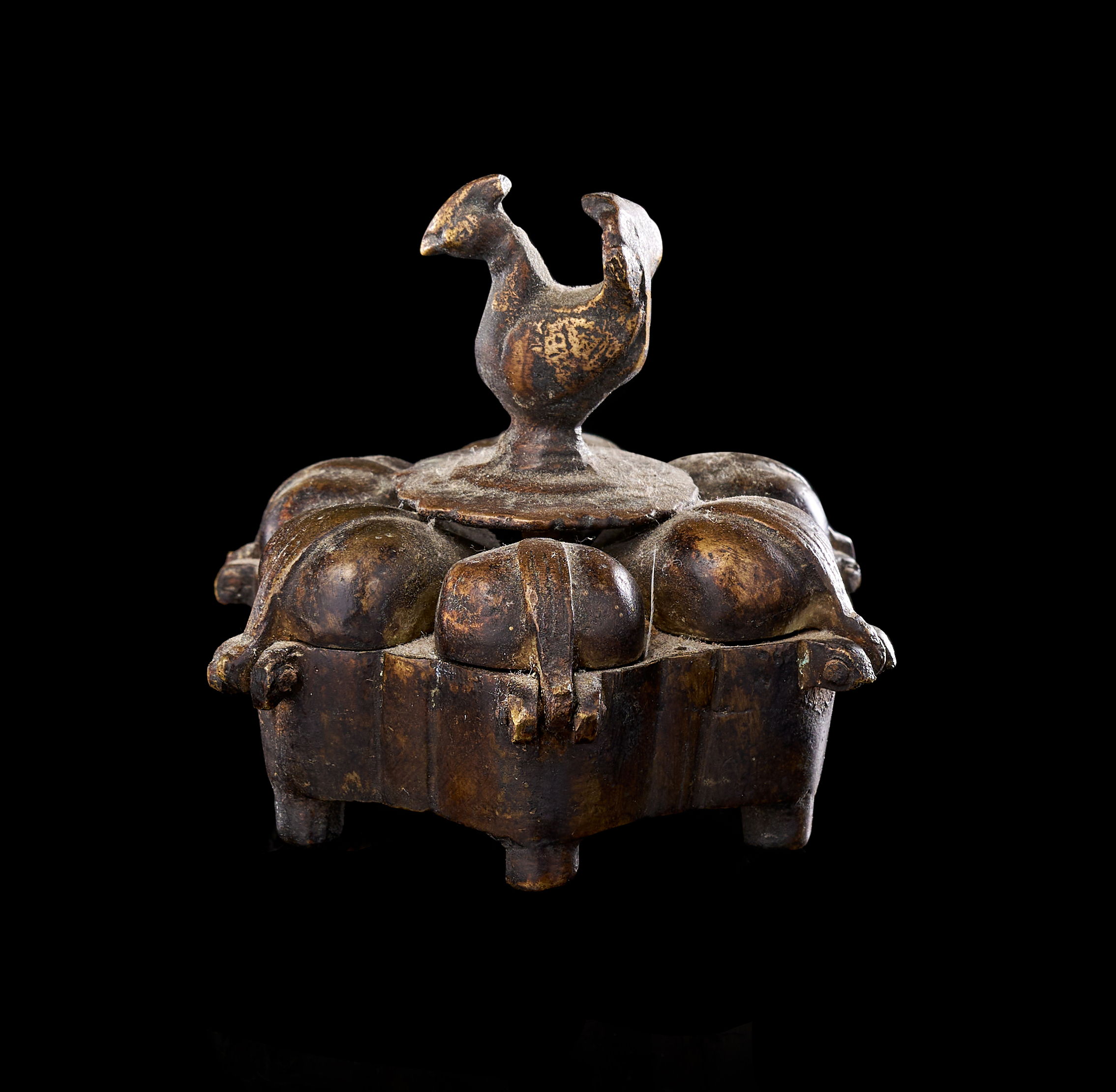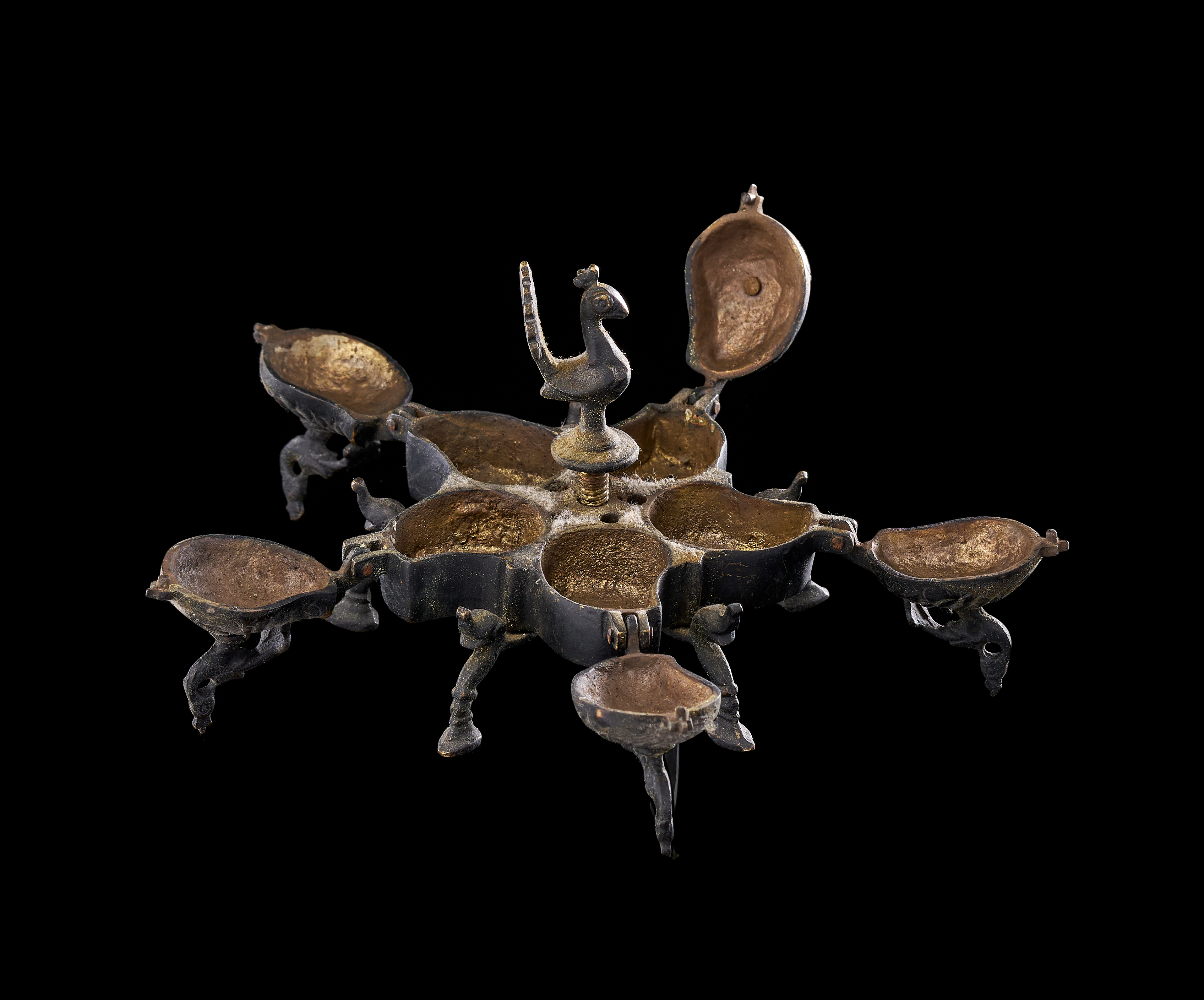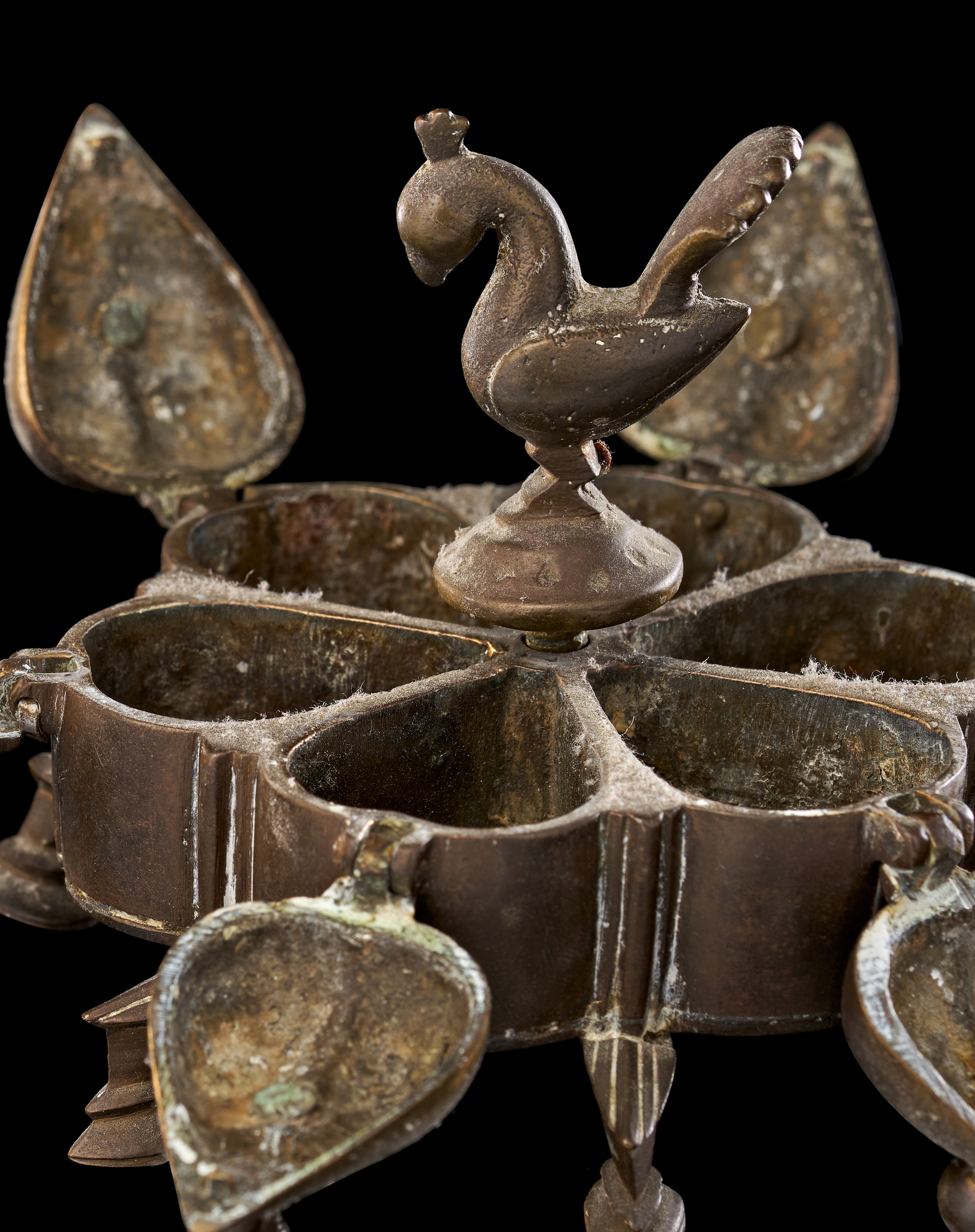 This group consists of three Indian cast copper-alloy vessels, identified as kumkum or spice boxes. Each box is designed with multiple lobed compartments arranged in a circular or polyhedral formation. The lids are surmounted by avian finials, primarily depicting peacocks with stylized plumage, which serve as central handles. The individual compartments are equipped with hinged or fitted lids. Each vessel is supported by integrated decorative feet of varying designs. The construction utilizes traditional casting techniques typical of Indian metalwork, featuring a dark, aged patina.