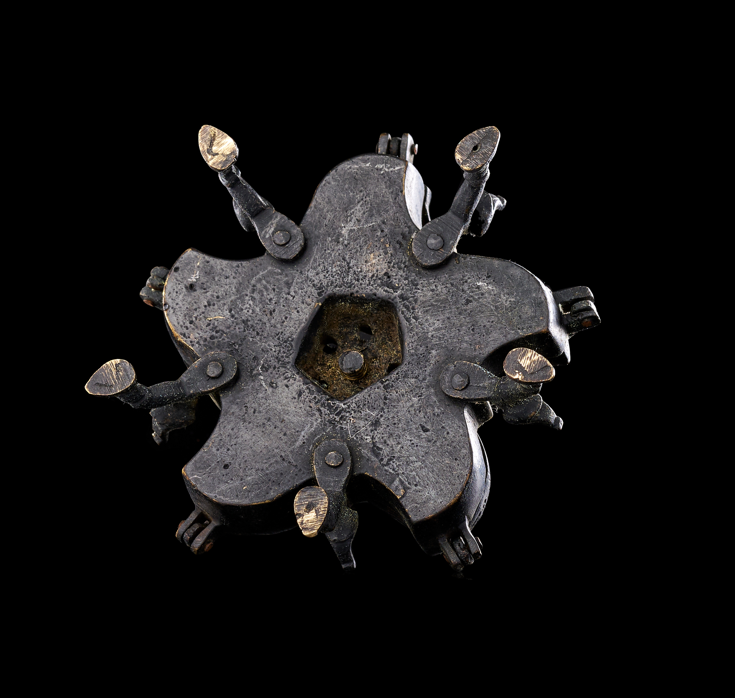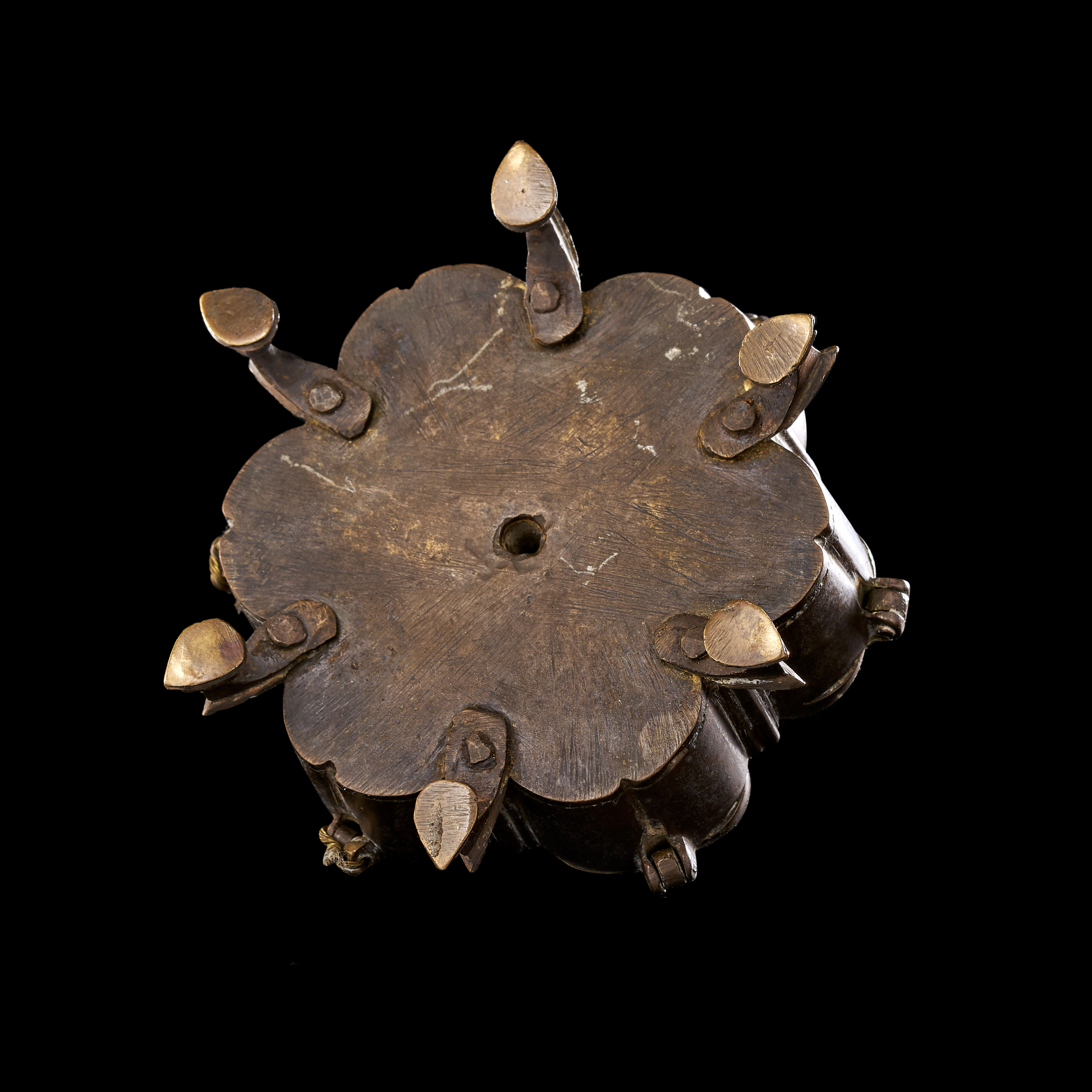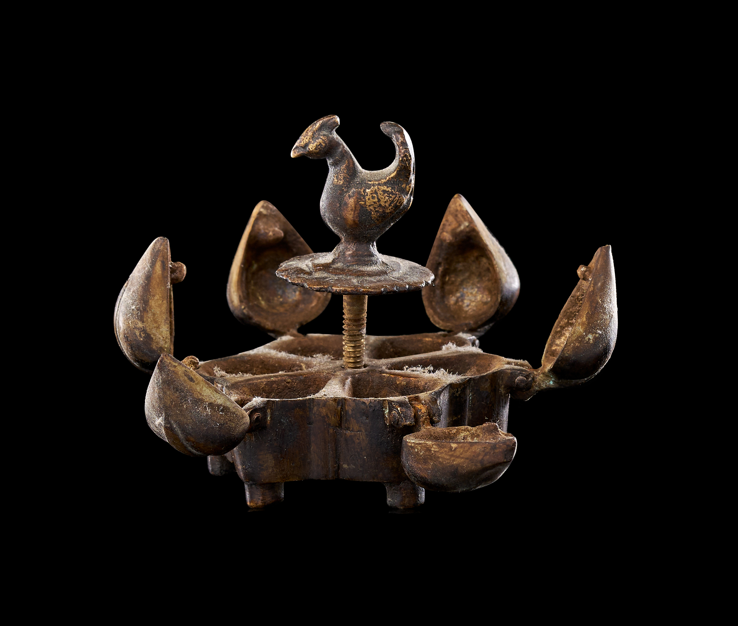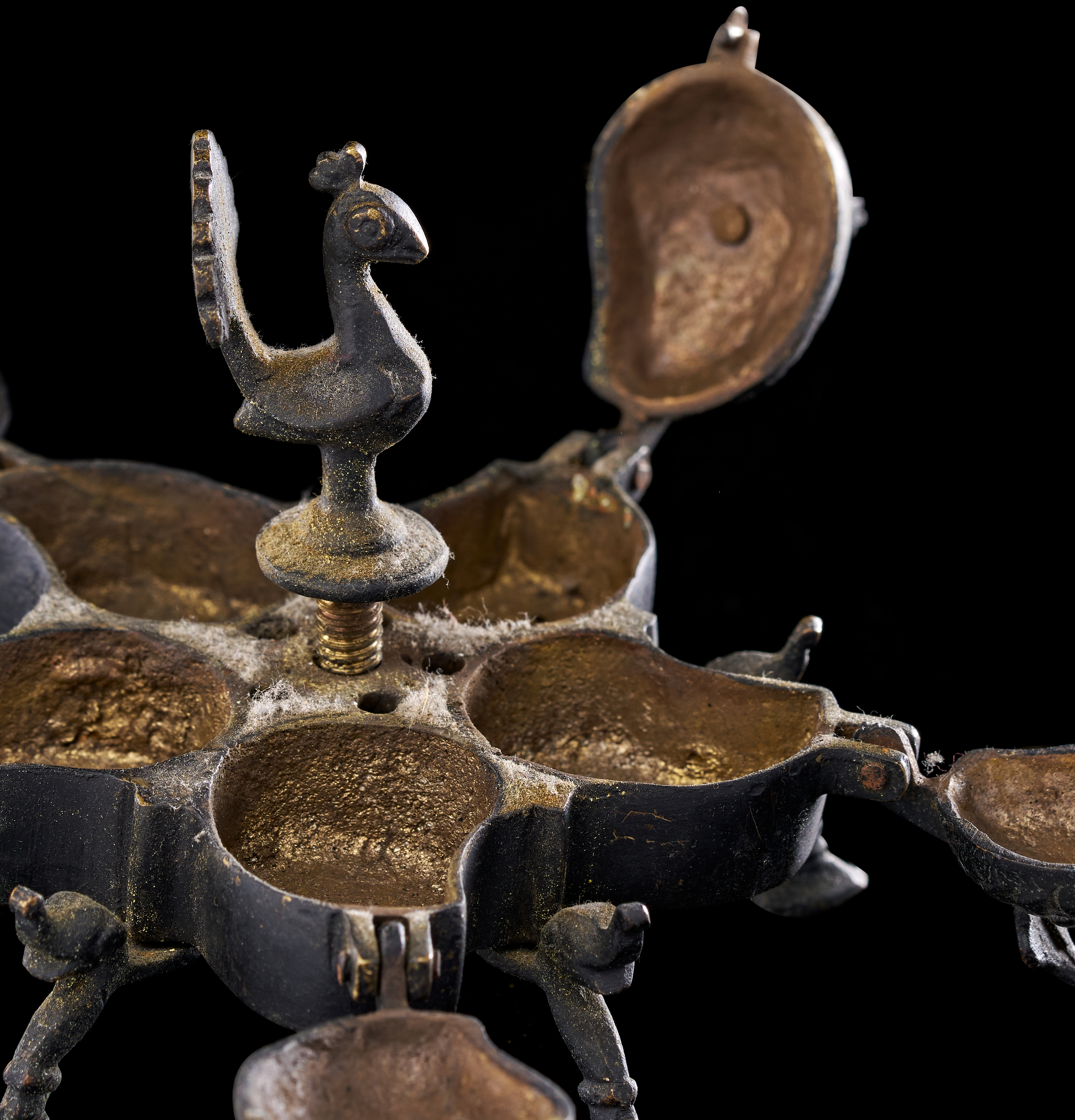 This group consists of three Indian cast copper-alloy vessels, identified as kumkum or spice boxes. Each box is designed with multiple lobed compartments arranged in a circular or polyhedral formation. The lids are surmounted by avian finials, primarily depicting peacocks with stylized plumage, which serve as central handles. The individual compartments are equipped with hinged or fitted lids. Each vessel is supported by integrated decorative feet of varying designs. The construction utilizes traditional casting techniques typical of Indian metalwork, featuring a dark, aged patina.