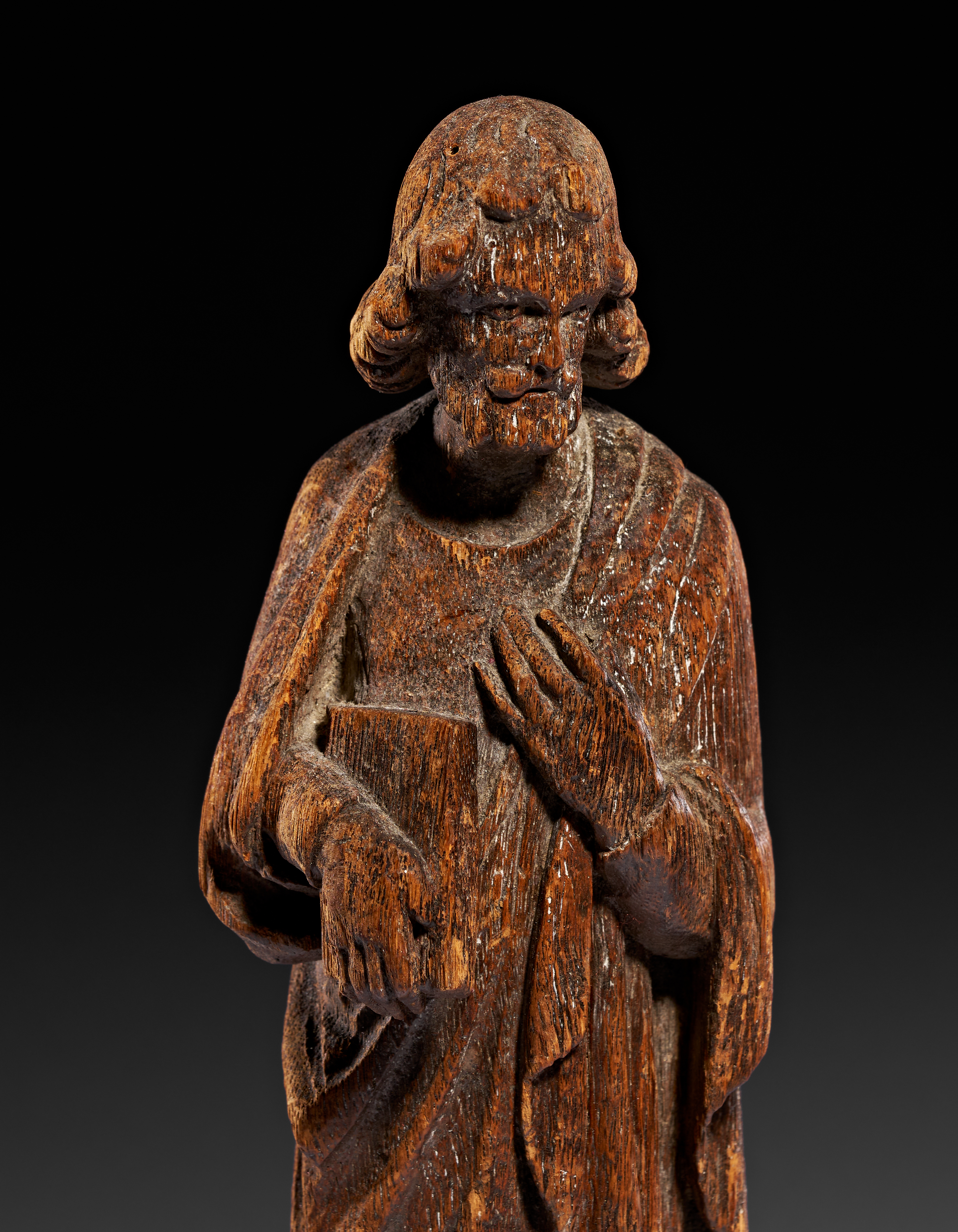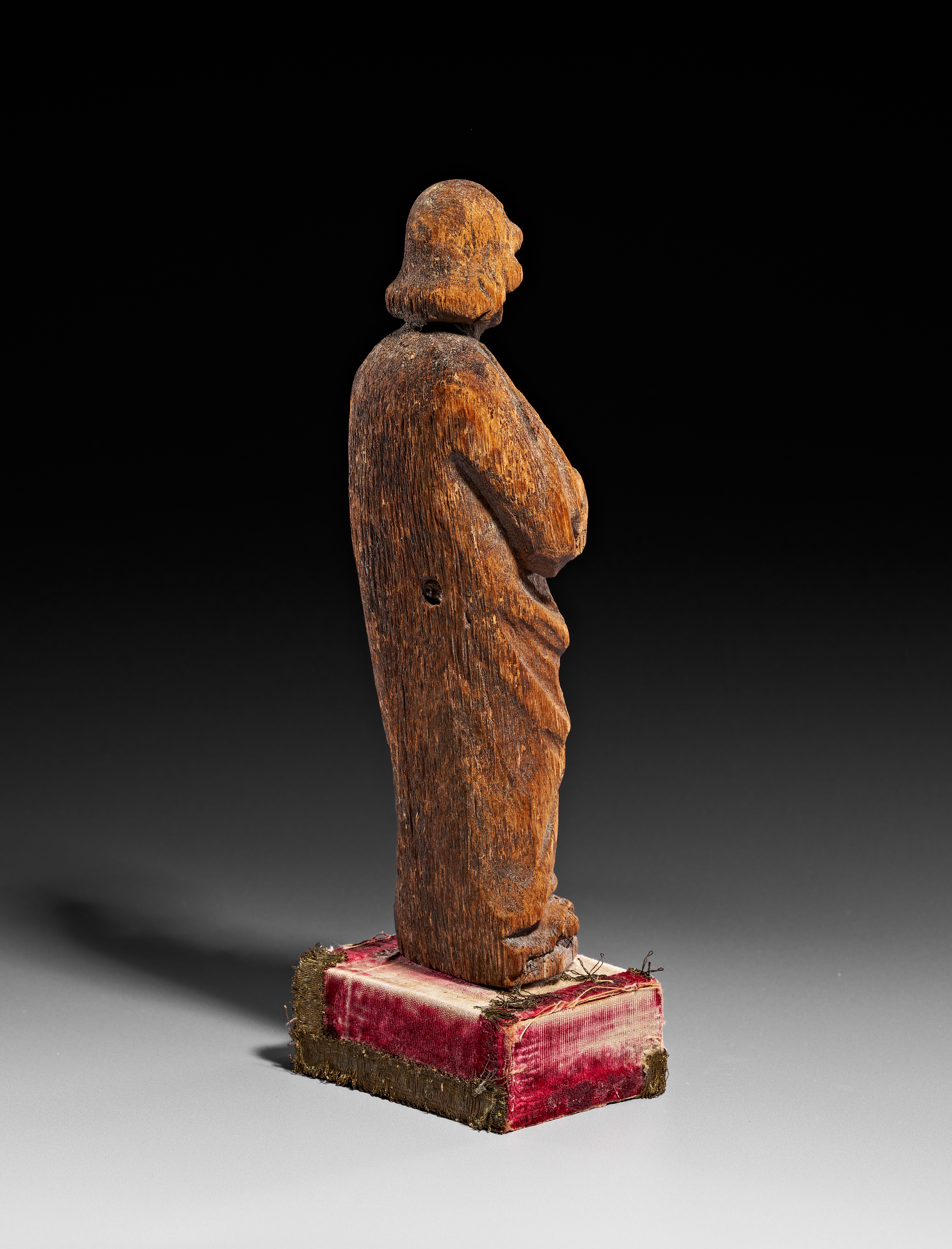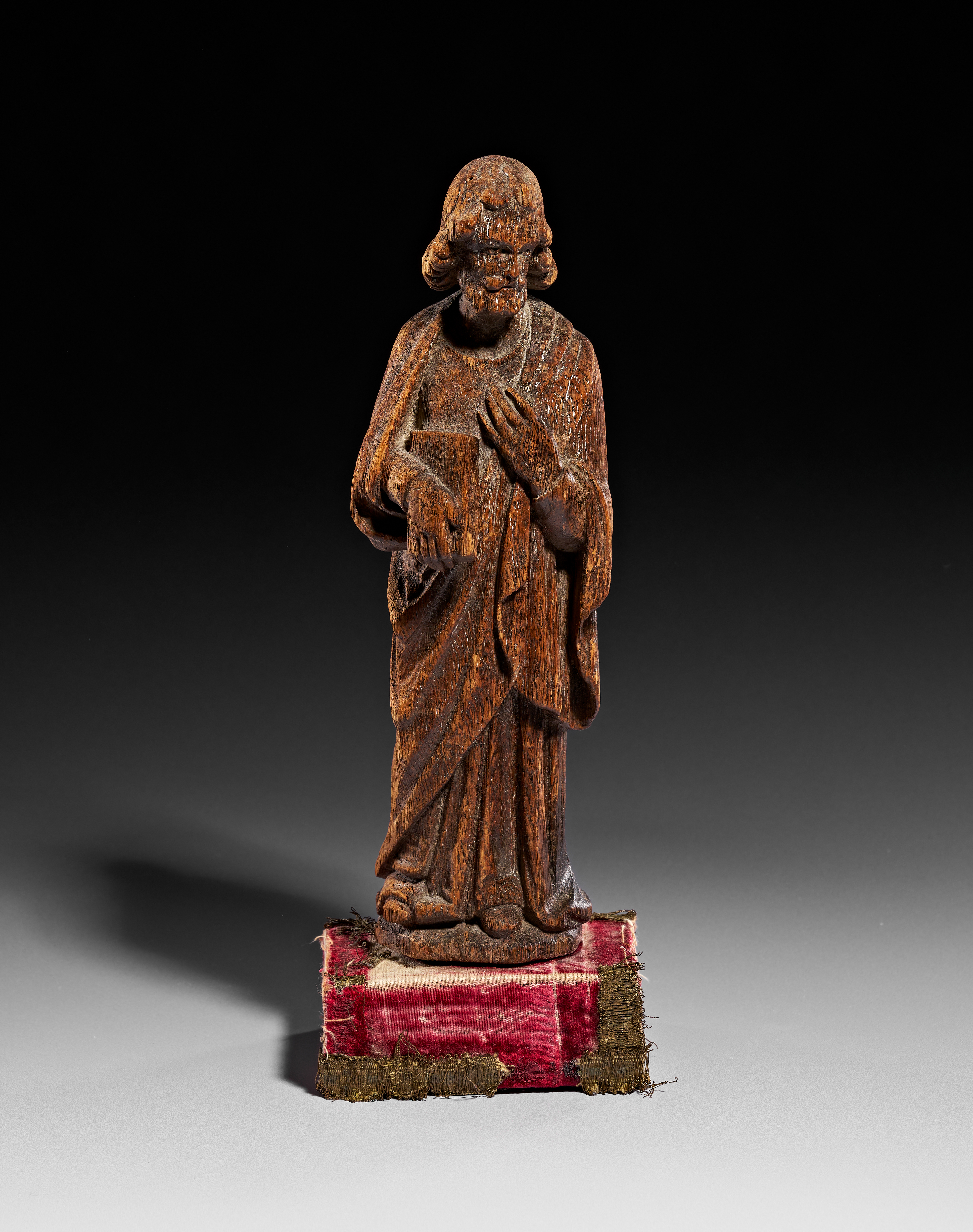 A carved oak figure of an apostle, executed in the late Gothic style and probably dating to the 15th or 16th century. The standing male figure is depicted with a full beard and shoulder-length hair, wearing long, draped robes. The figure holds a closed book in the left hand while the right hand is placed over the chest. The sculpture is carved from oak and exhibits a deep, naturally weathered patina with visible grain. A small circular hole is present on the reverse, likely for mounting. The figure is mounted on a later rectangular base upholstered in red velvet with gold-toned metallic fringe.