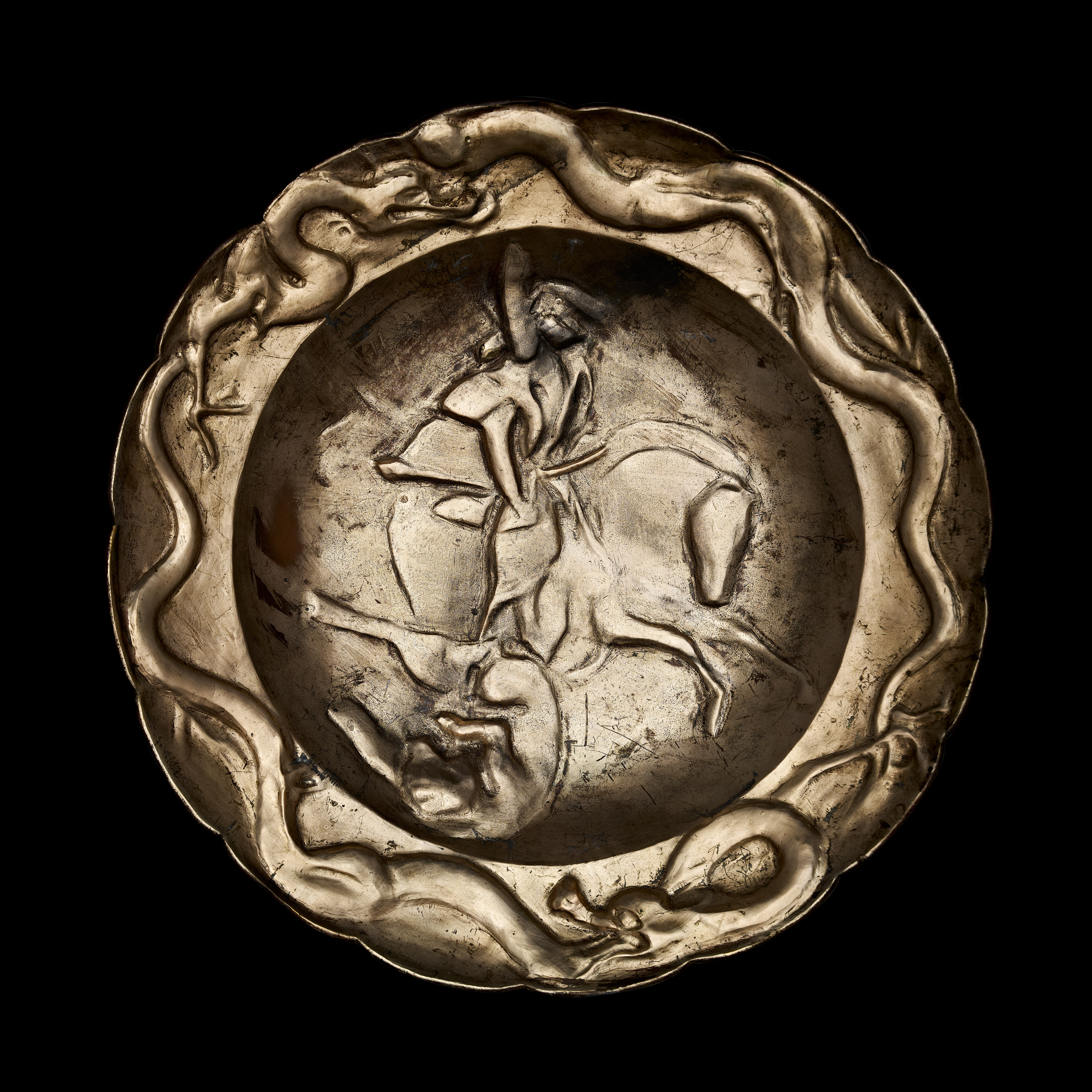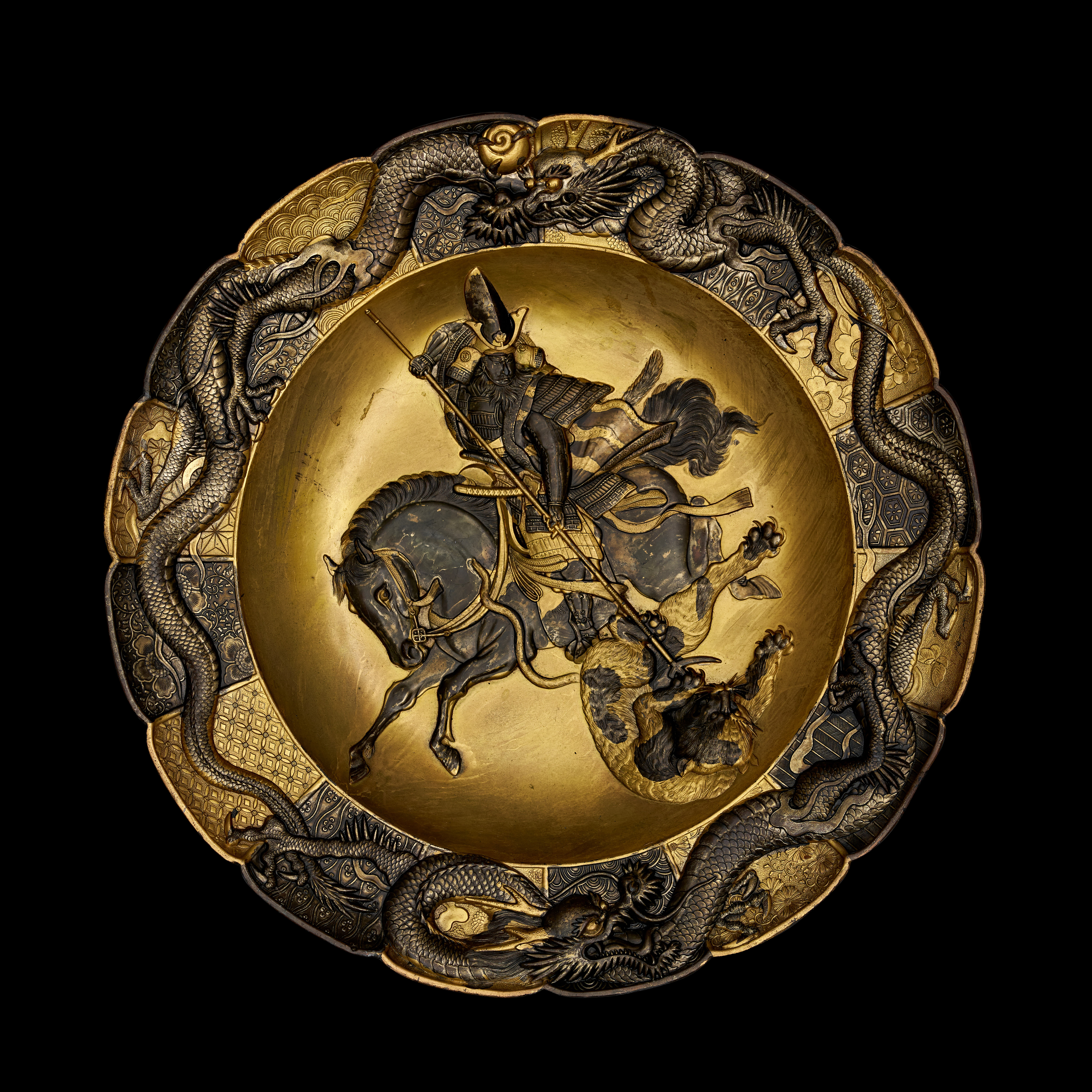 A Japanese Meiji period circular mixed-metal dish featuring high-relief and inlaid decoration. The central well depicts a mounted samurai in armor battling a tiger with a spear. The construction utilizes gold, silver, and alloys including shakudo and shibuichi. The wide, lobed rim is decorated with two dragons chasing a flaming pearl amidst geometric diaper patterns. The reverse displays the repoussé technique used to create the dimensional figures.