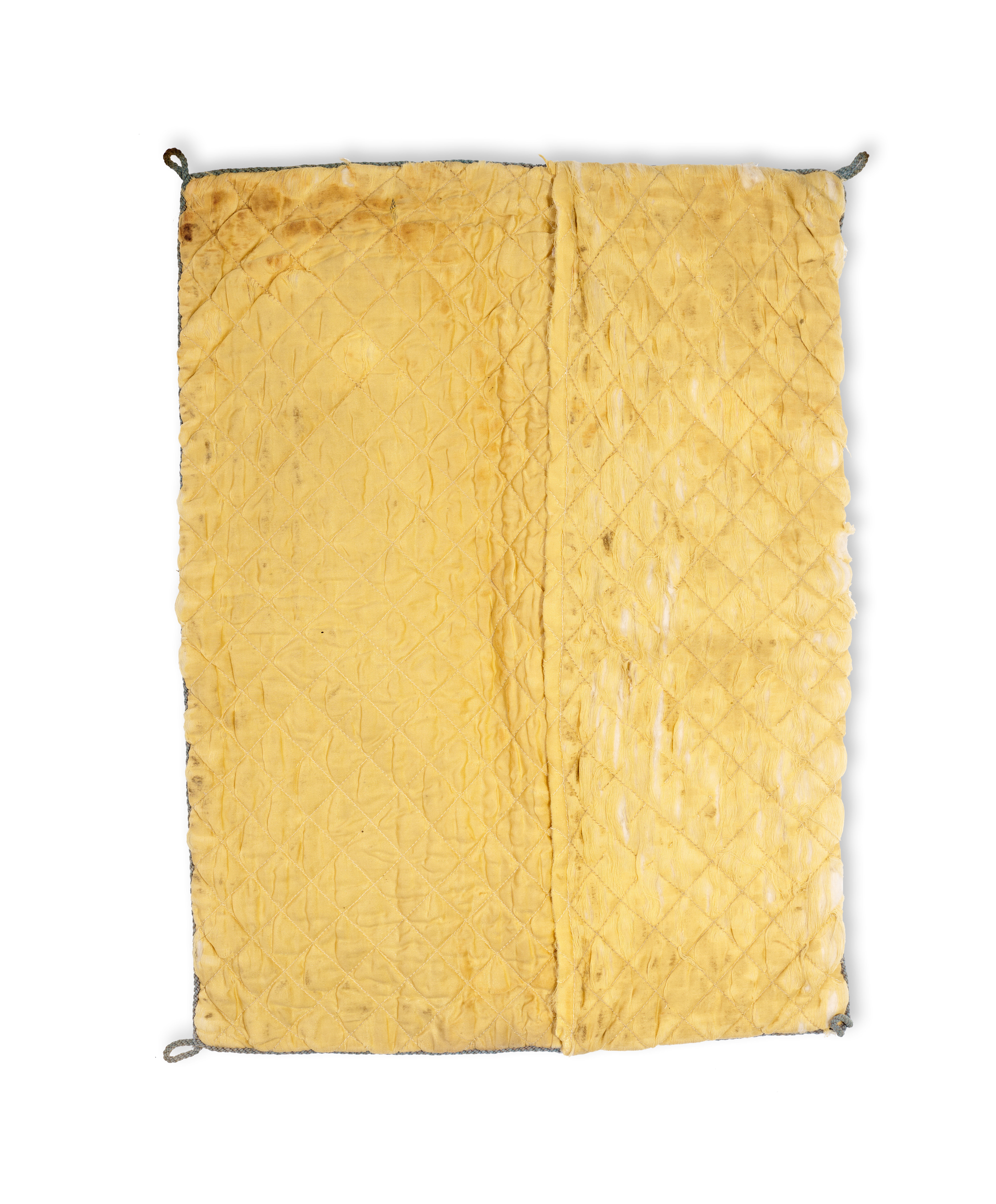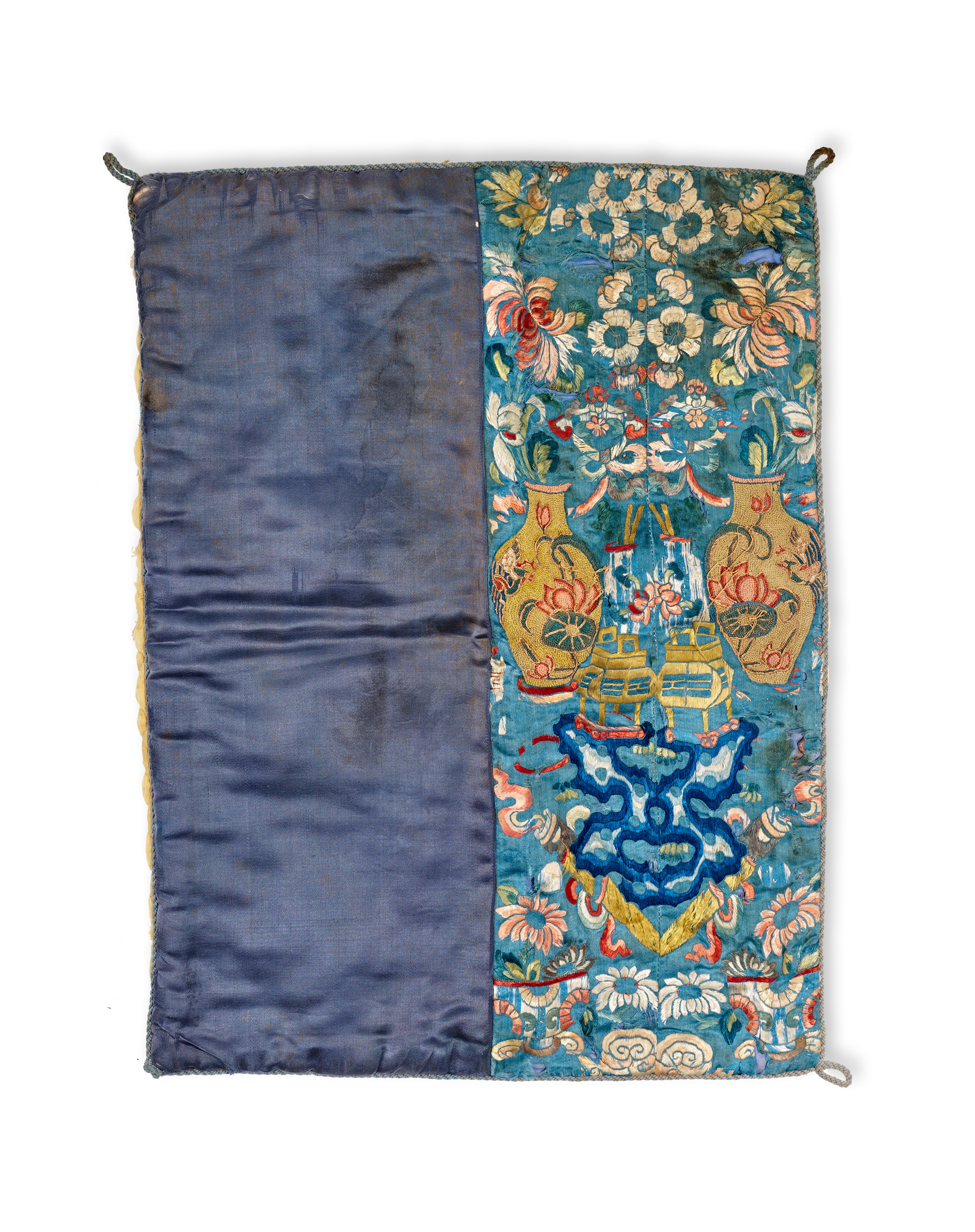 An antique Chinese embroidered silk textile dating to the late Qing Dynasty, constructed as a small padded mat or cover. The front face is divided vertically, featuring a plain dark blue silk satin panel adjacent to a heavily embroidered panel on a turquoise-blue silk ground. The embroidery is executed in a palette of blues, reds, yellows, and greens, depicting traditional auspicious motifs including vases containing lotuses, stylized vessels, and various floral sprays. The reverse consists of a yellow diamond-quilted fabric. Small gray twisted cord loops are attached at the four corners.