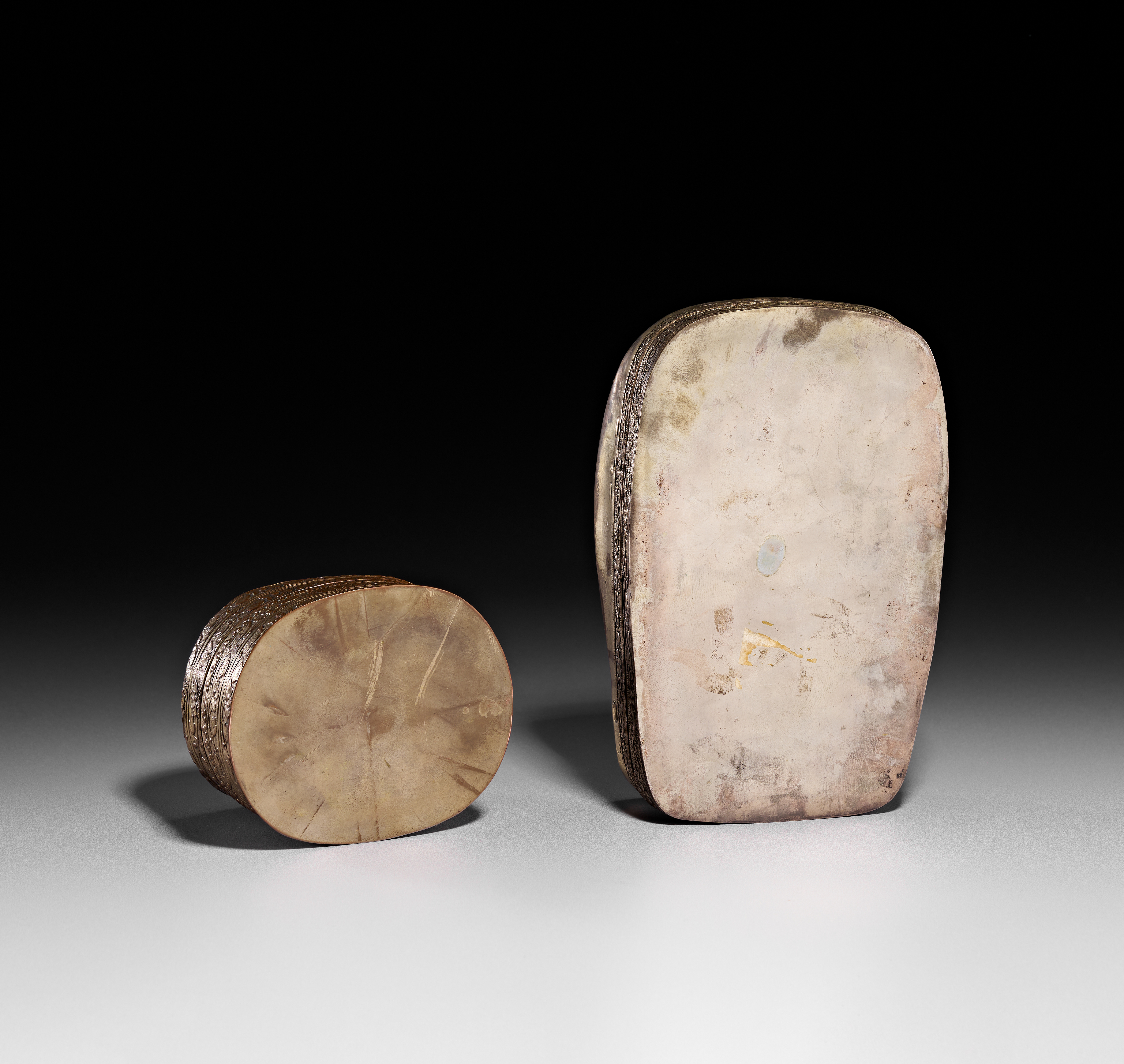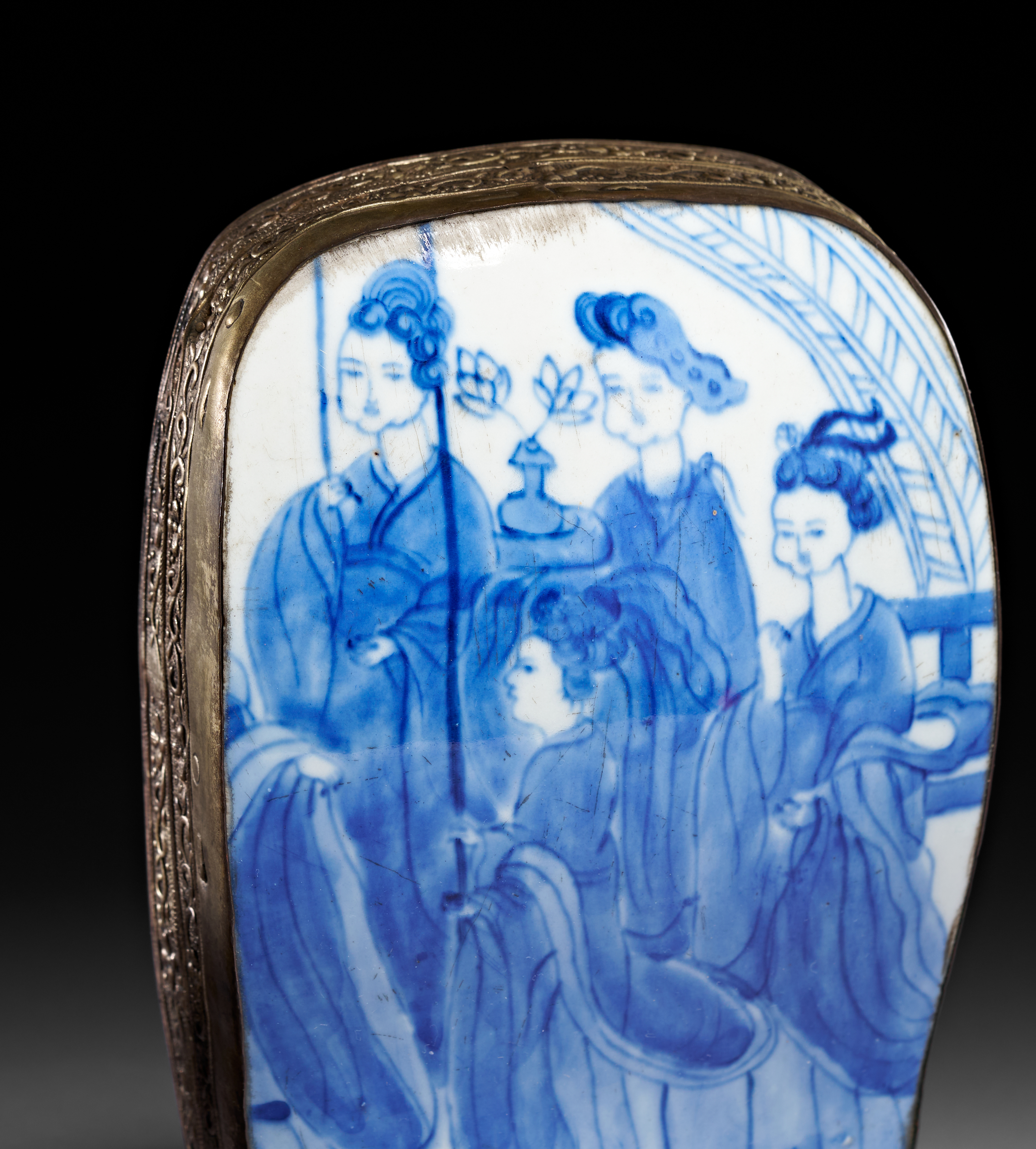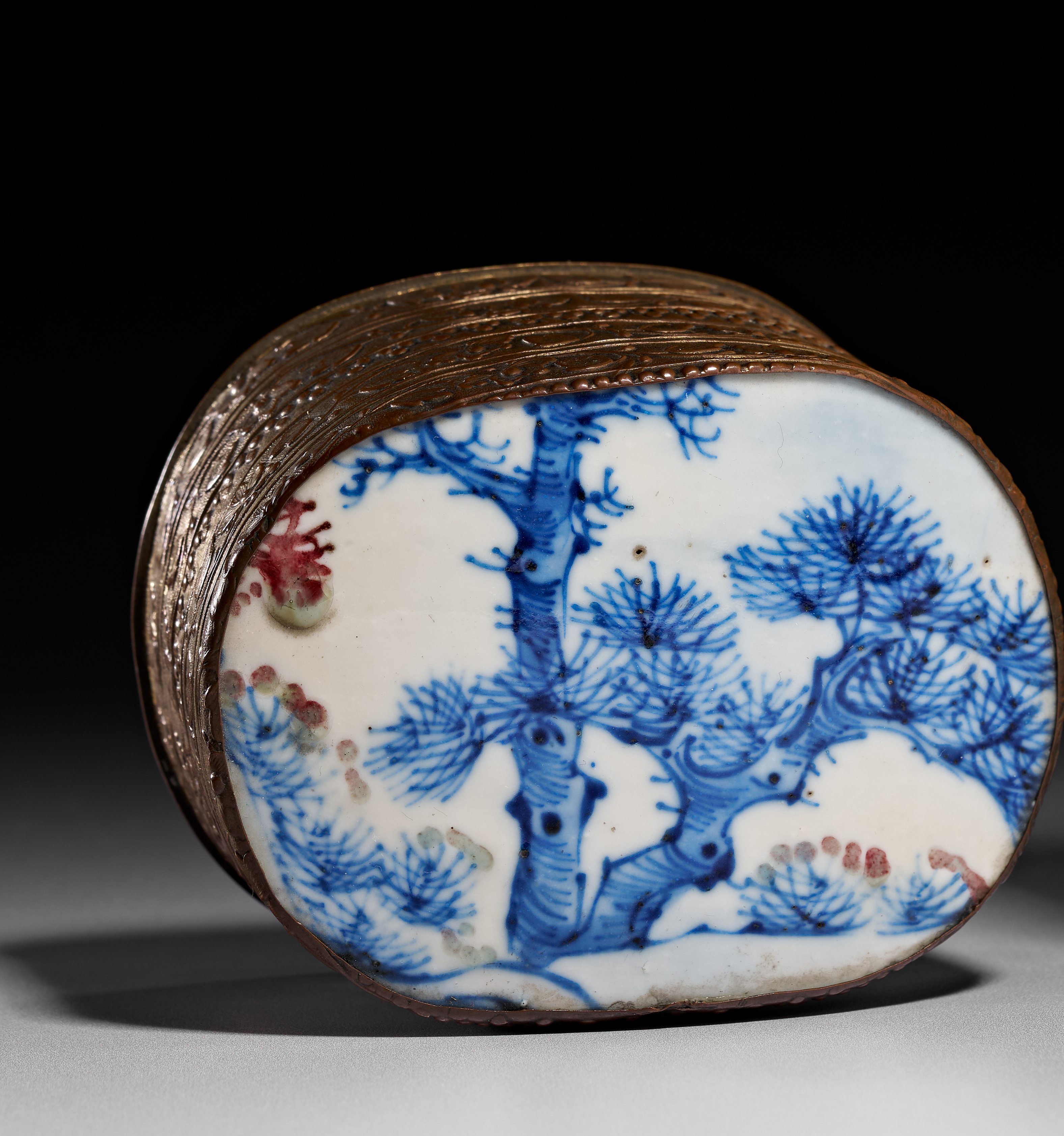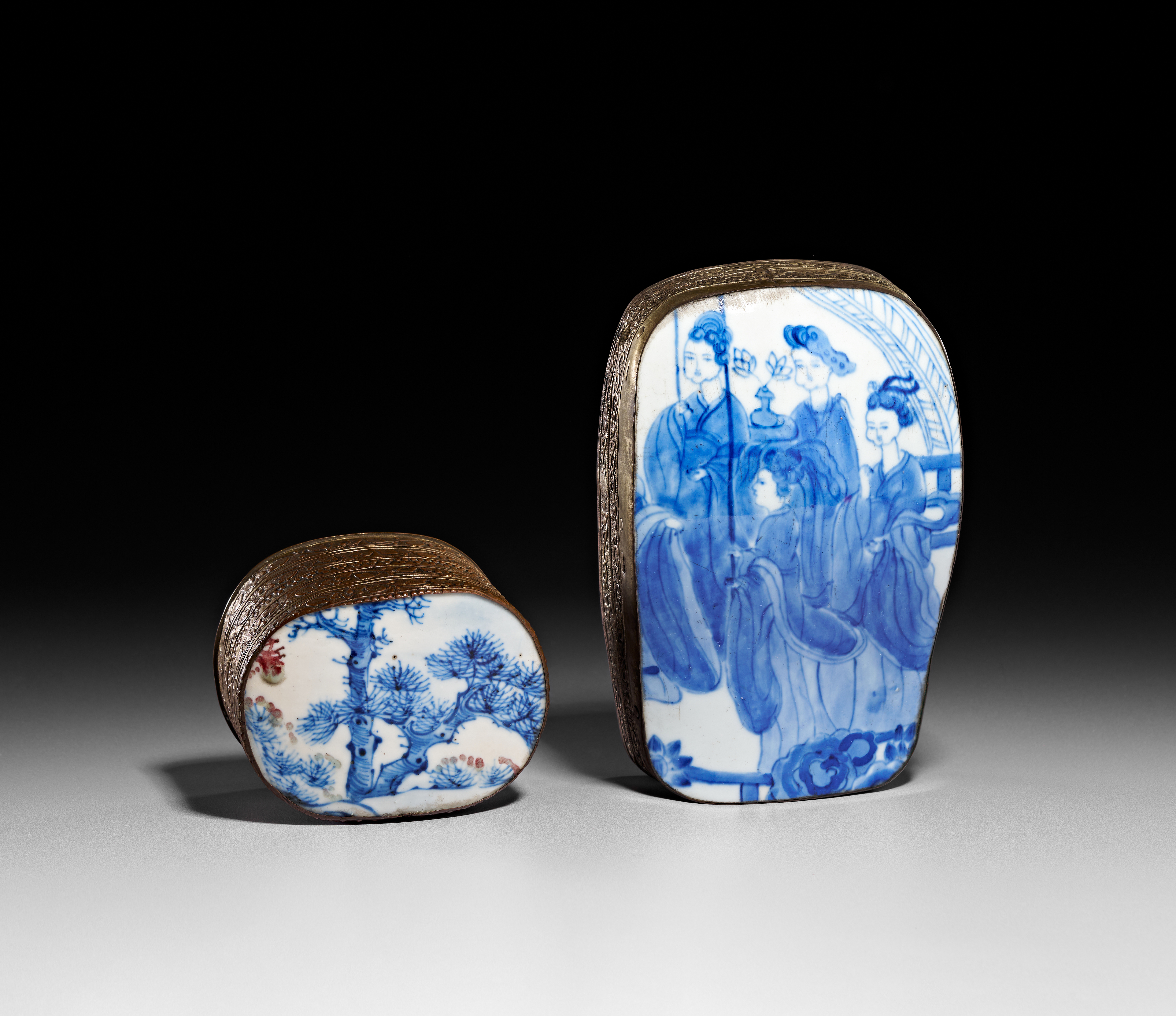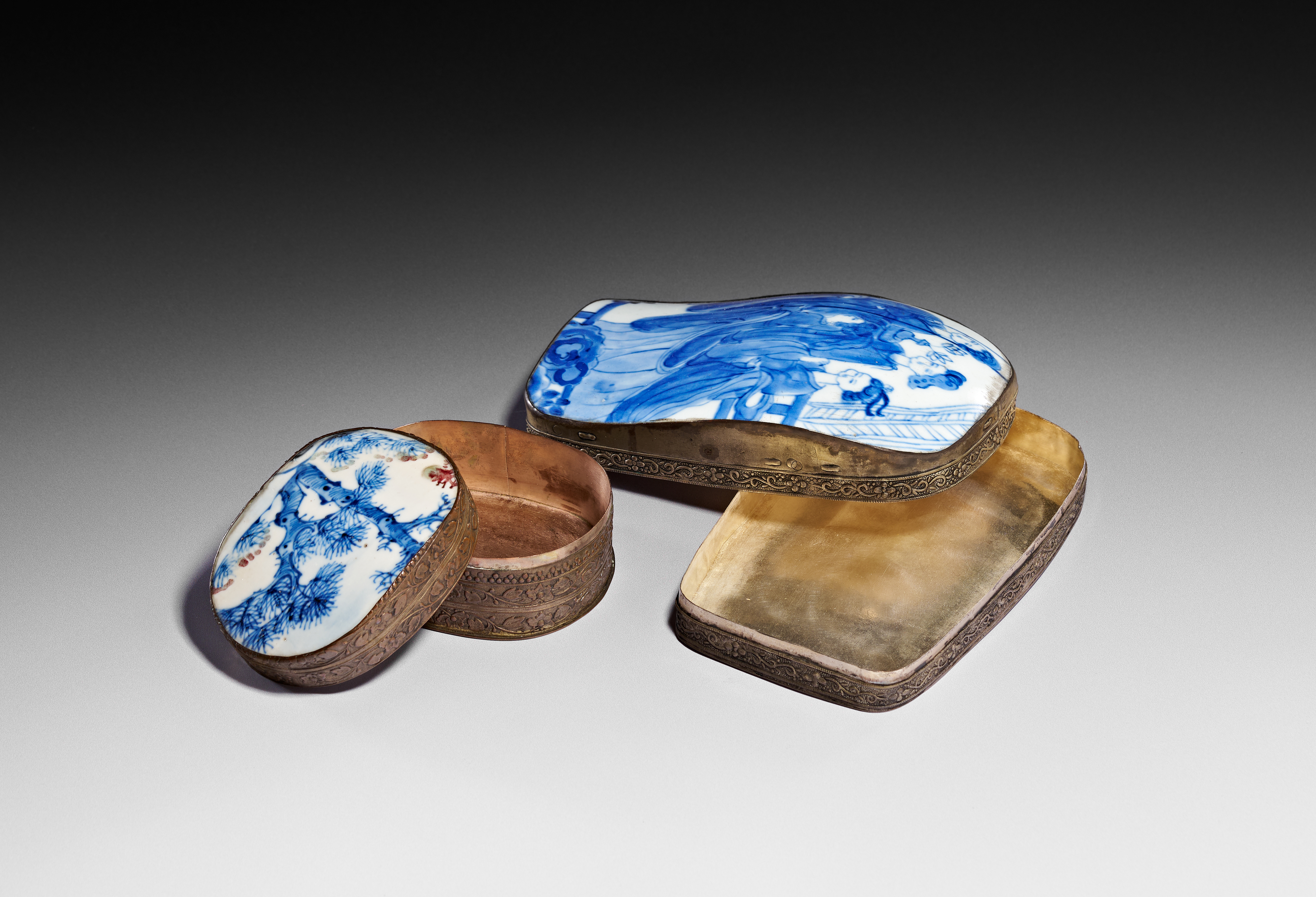 Two Chinese lidded boxes featuring blue and white porcelain plaques in the Kangxi style. The larger box is of an irregular rectangular form with a porcelain plaque depicting four figures in traditional dress within a garden setting. The smaller oval box features a porcelain plaque decorated with a stylized pine tree and accented with red and green pigments. Both plaques are set into metal frames featuring foliate and scrollwork engraving along the sides. The interiors and undersides of the boxes display a golden-toned finish.