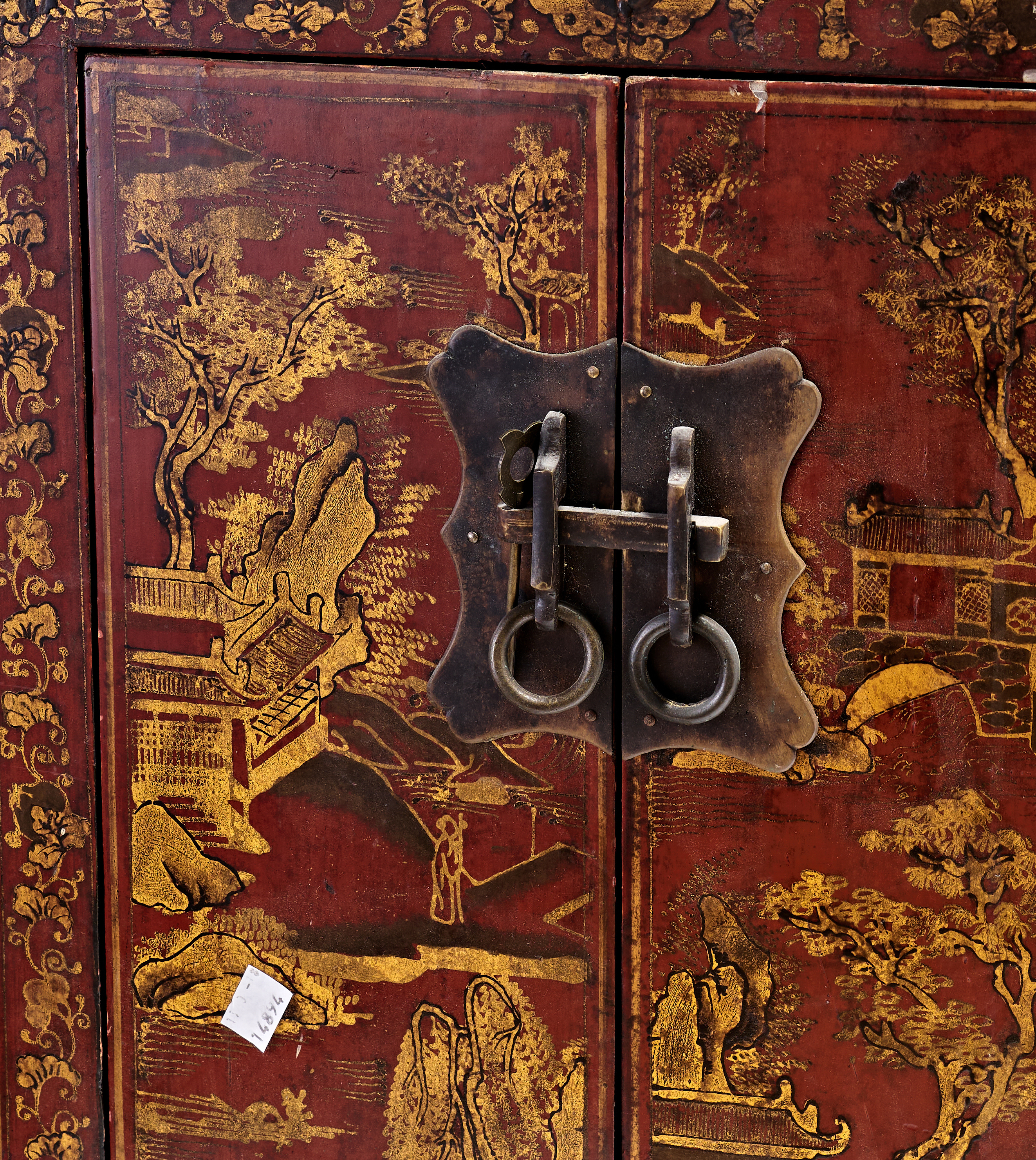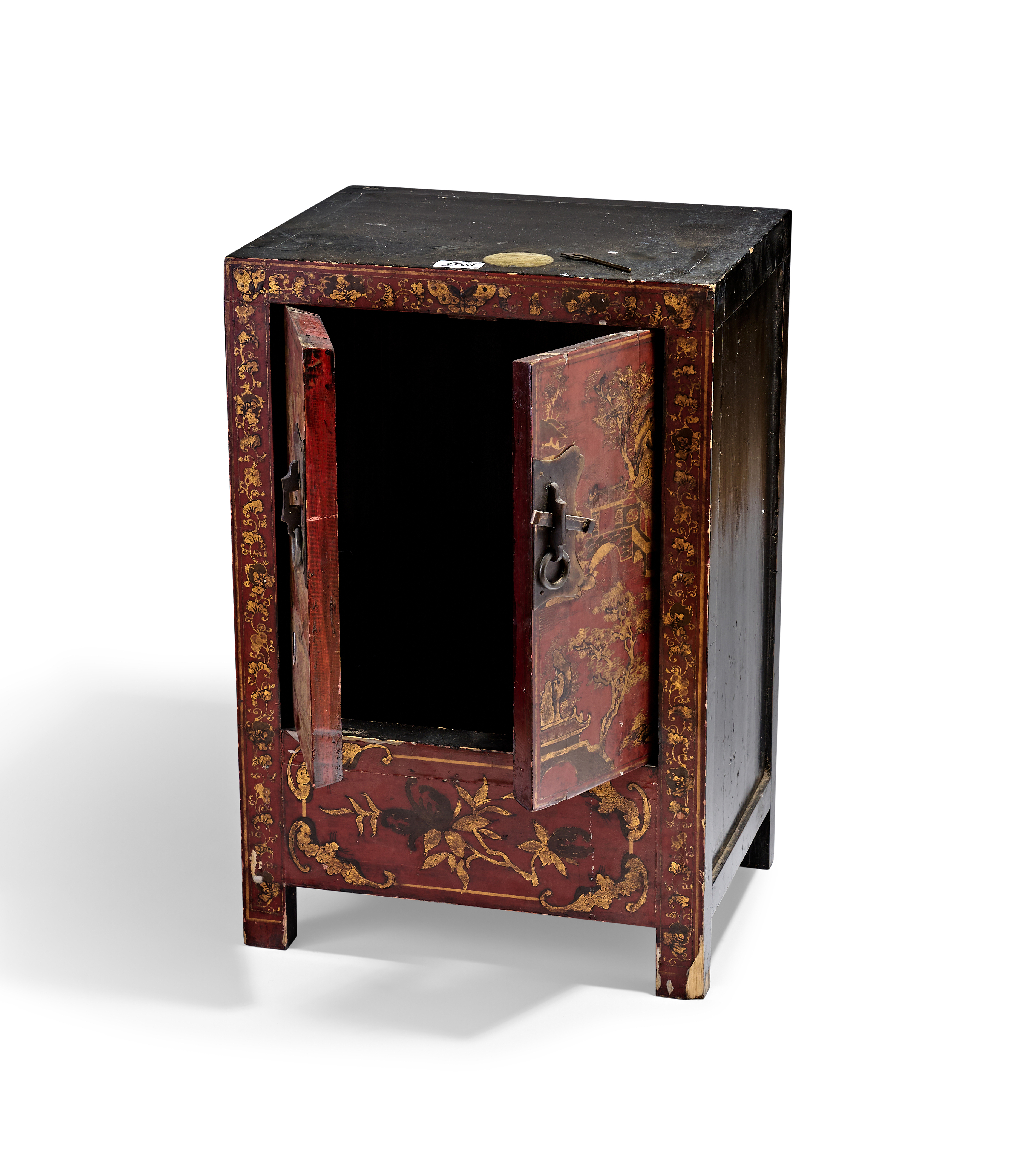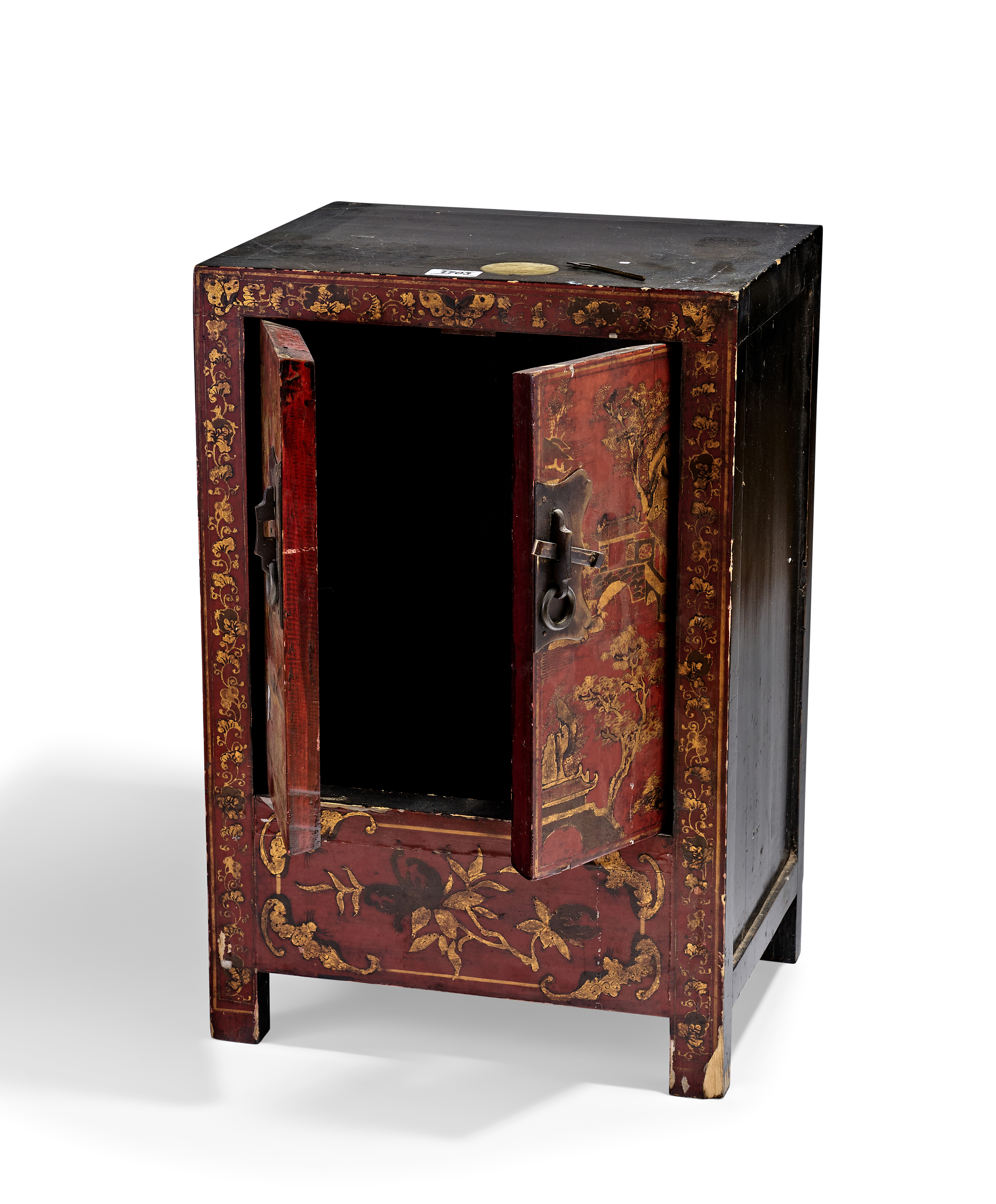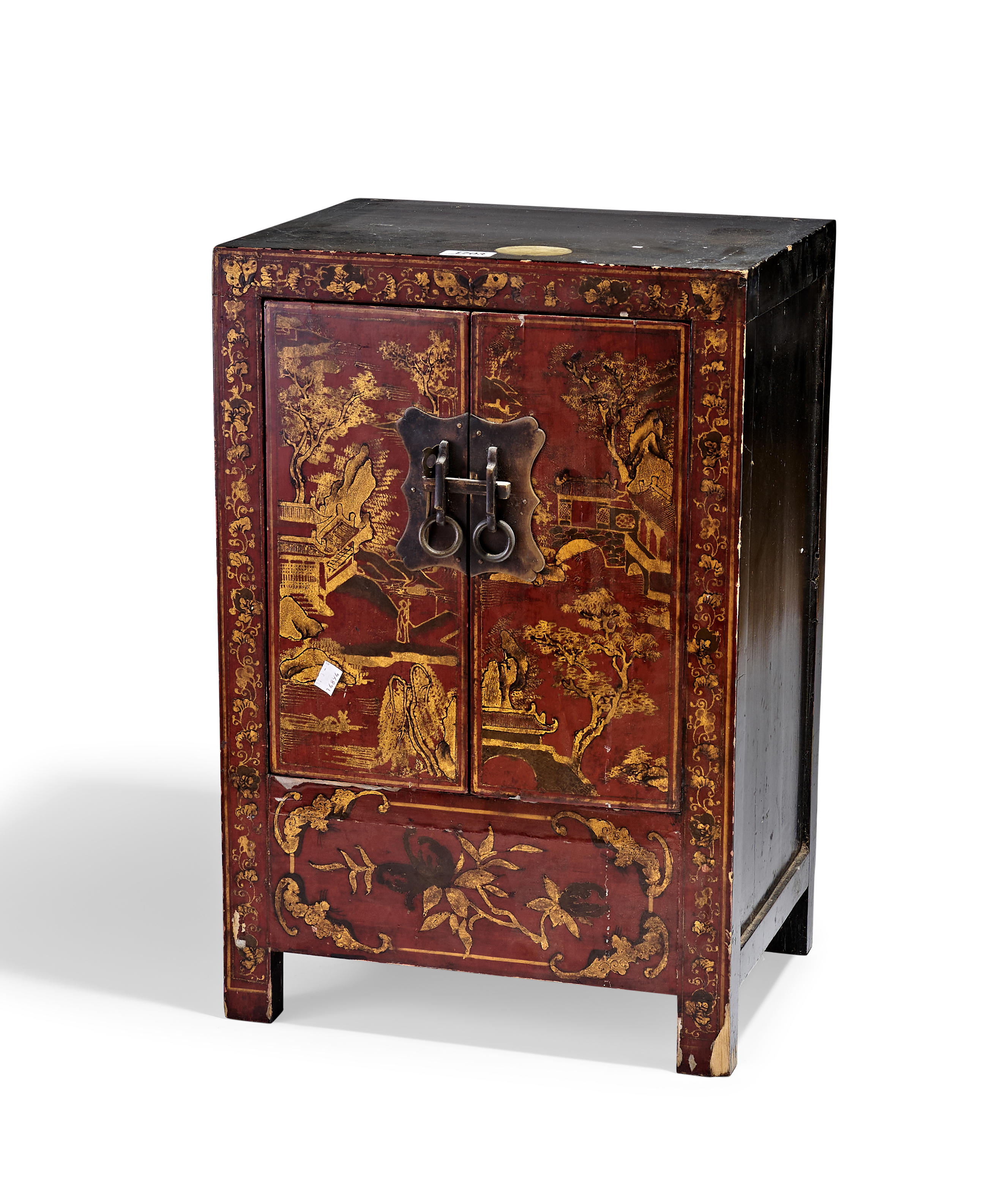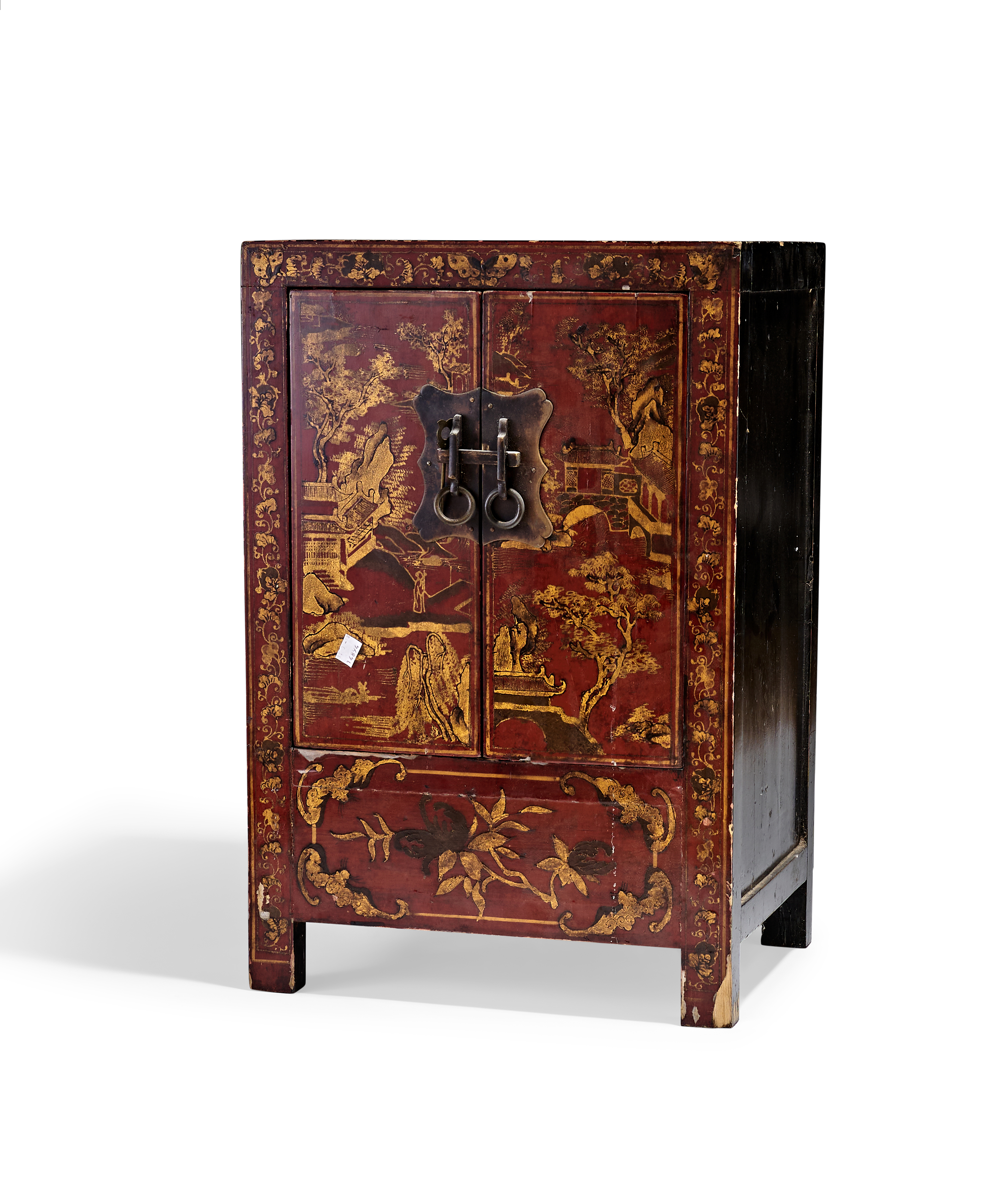 A Chinese red and black lacquer cabinet of rectangular form featuring two hinged doors above a stationary lower panel. The front is decorated with gilt landscape scenes depicting mountains, pagodas, and figures, all framed by a floral scroll border. The lower section is adorned with a central floral spray. The cabinet is fitted with a shaped brass lock plate with a horizontal sliding bolt and twin ring pulls. The top and sides are finished in black lacquer, while the back consists of dark stained wood panels.