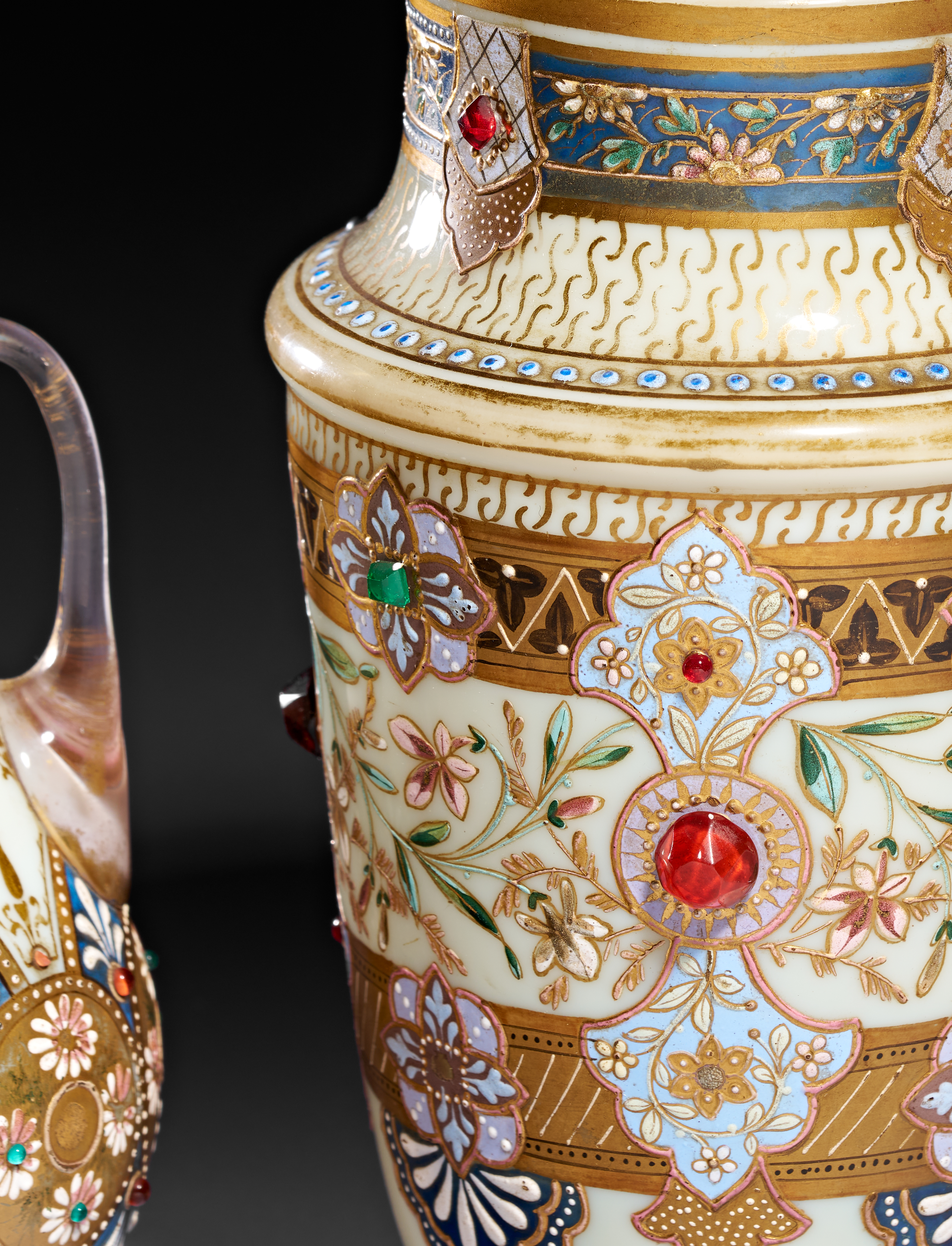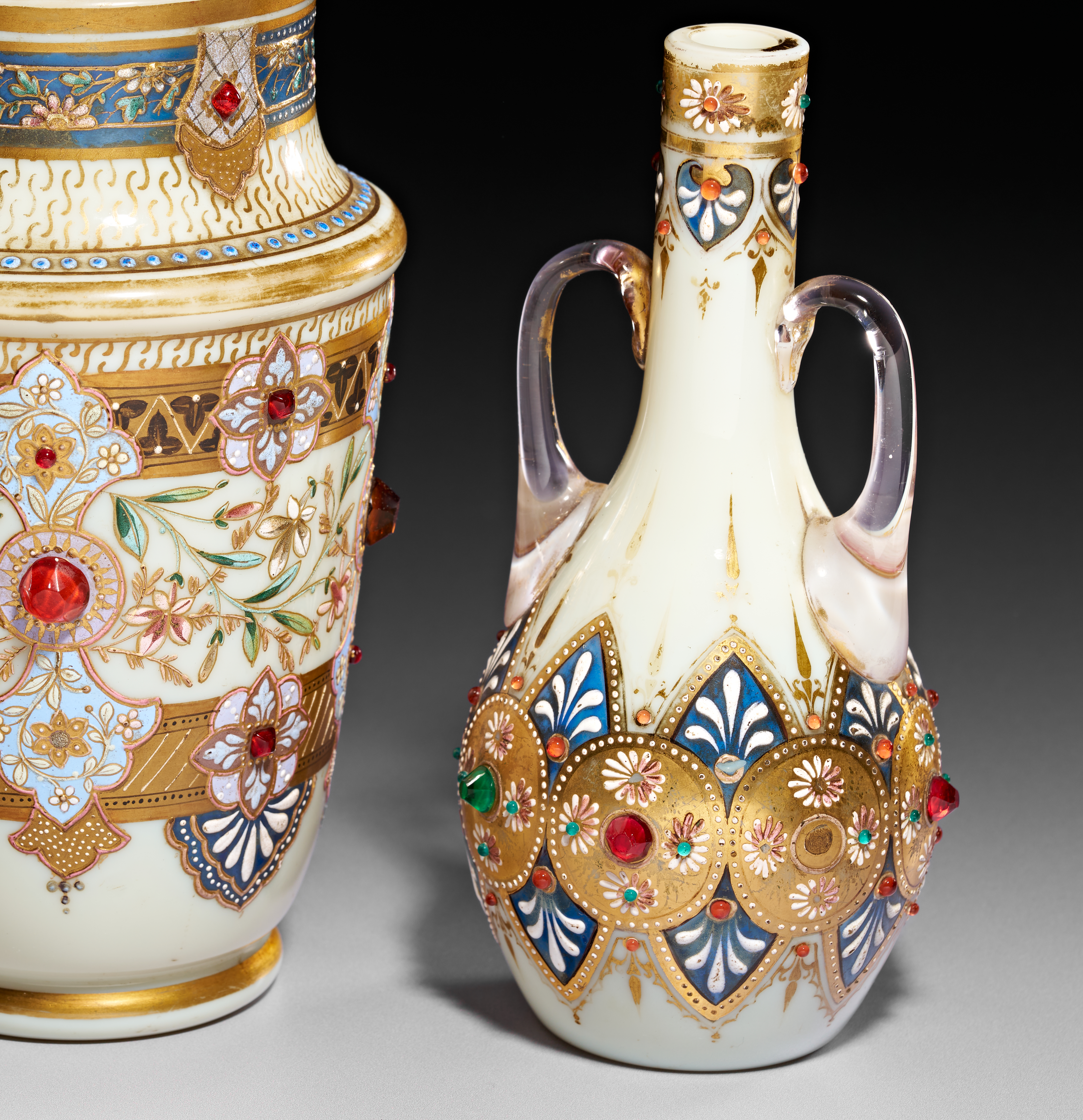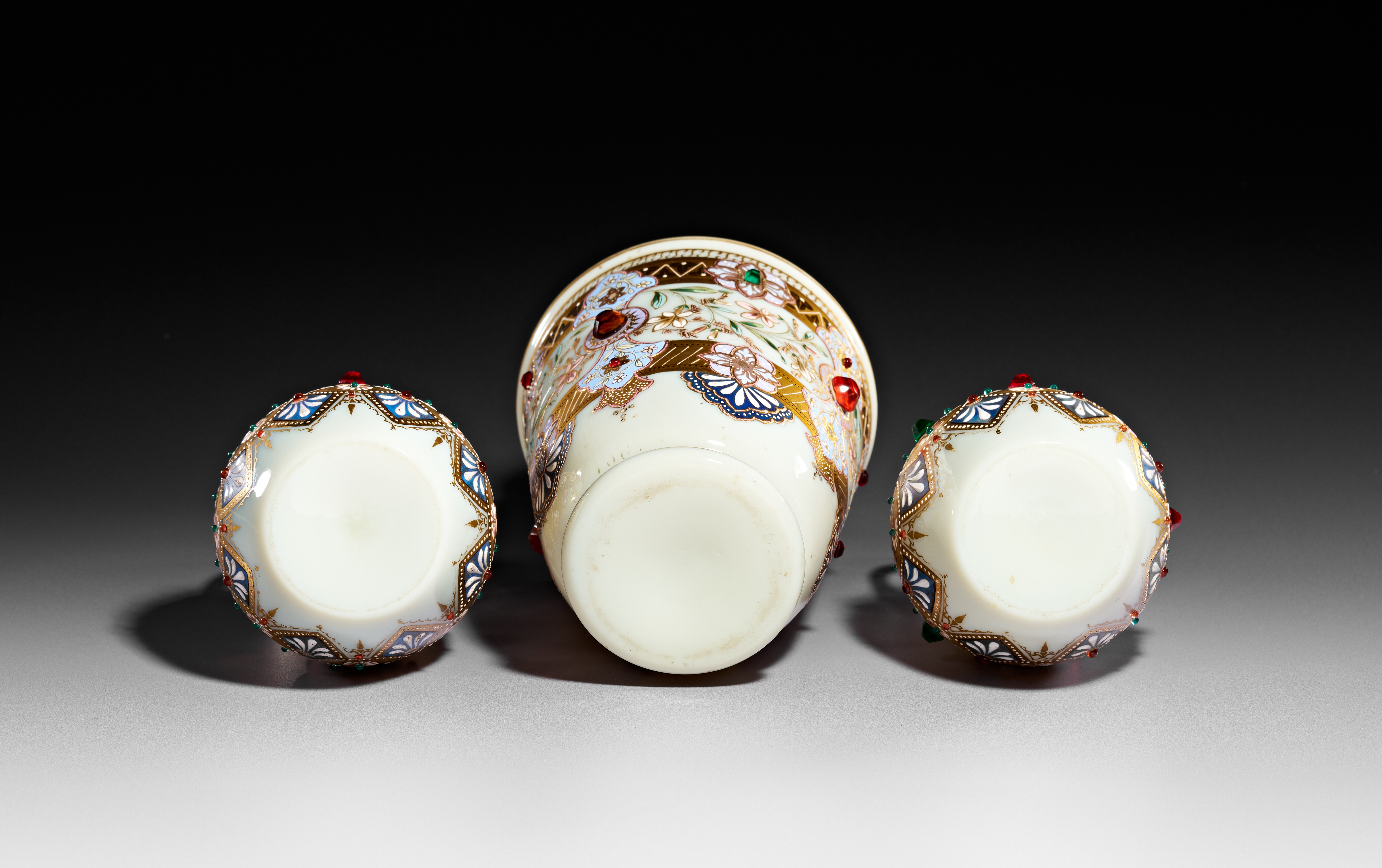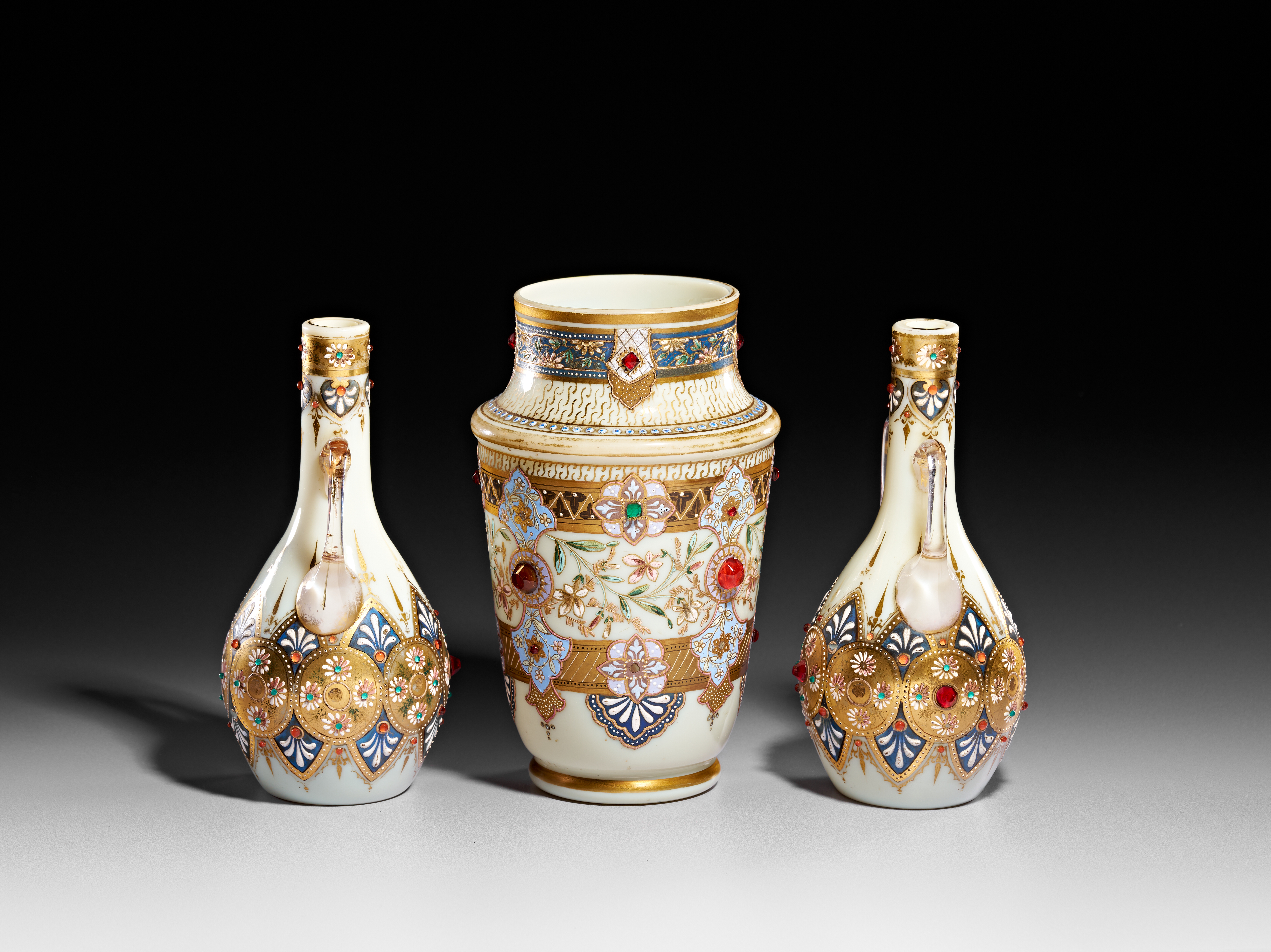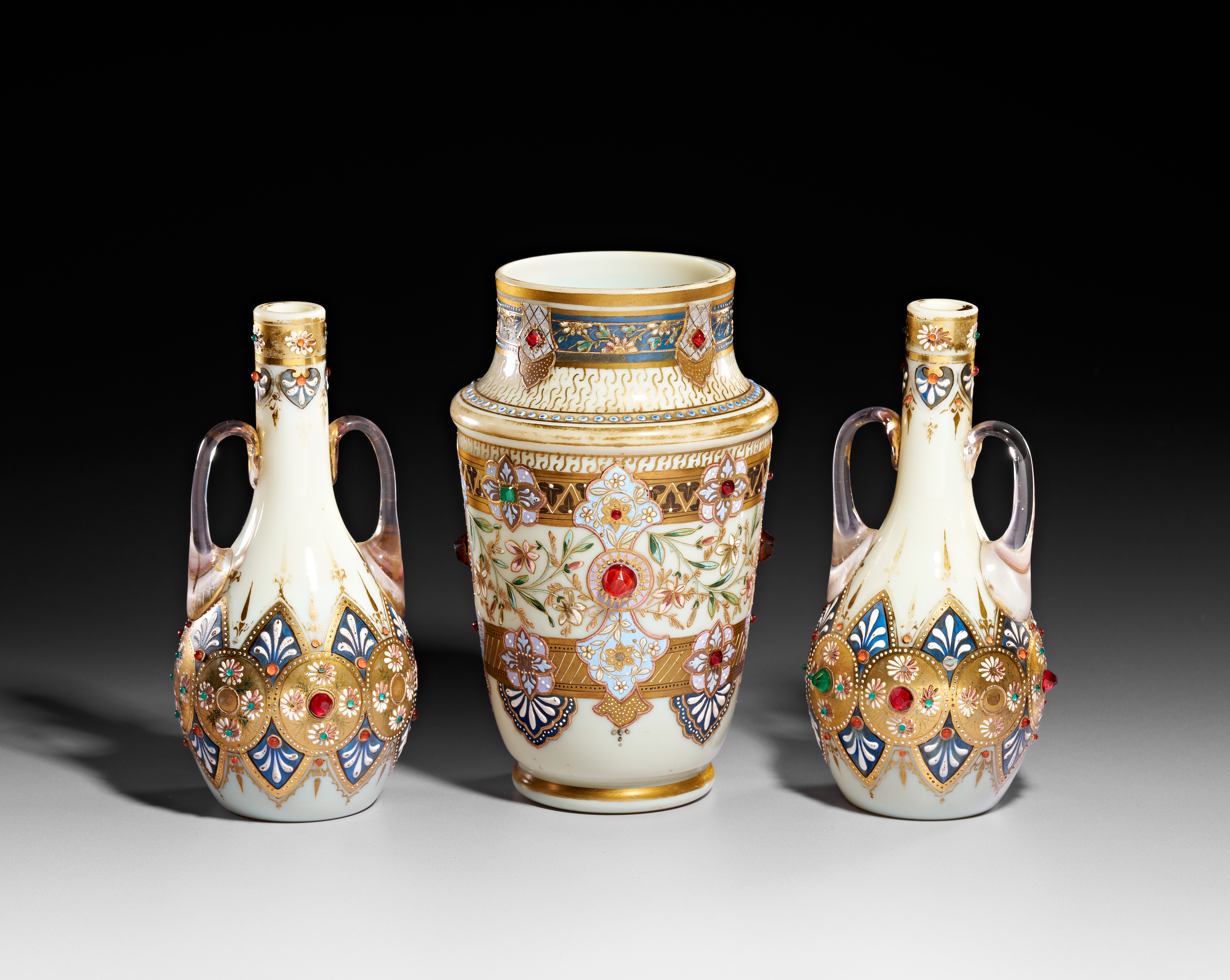 A set of three jeweled Bohemian opaline vases, comprising a central ovoid vase and two smaller flanking vases with handles. Each vessel is crafted from opaque white glass and features intricate polychrome enamel decoration in floral and geometric motifs. The decorative program is heavily accented with gilding and embellished with numerous raised glass cabochons in red, green, and blue, designed to simulate encrusted gemstones. The two smaller vases possess clear glass handles and mirror the ornamental style of the central piece. The undersides are plain and circular with no visible manufacturer markings.