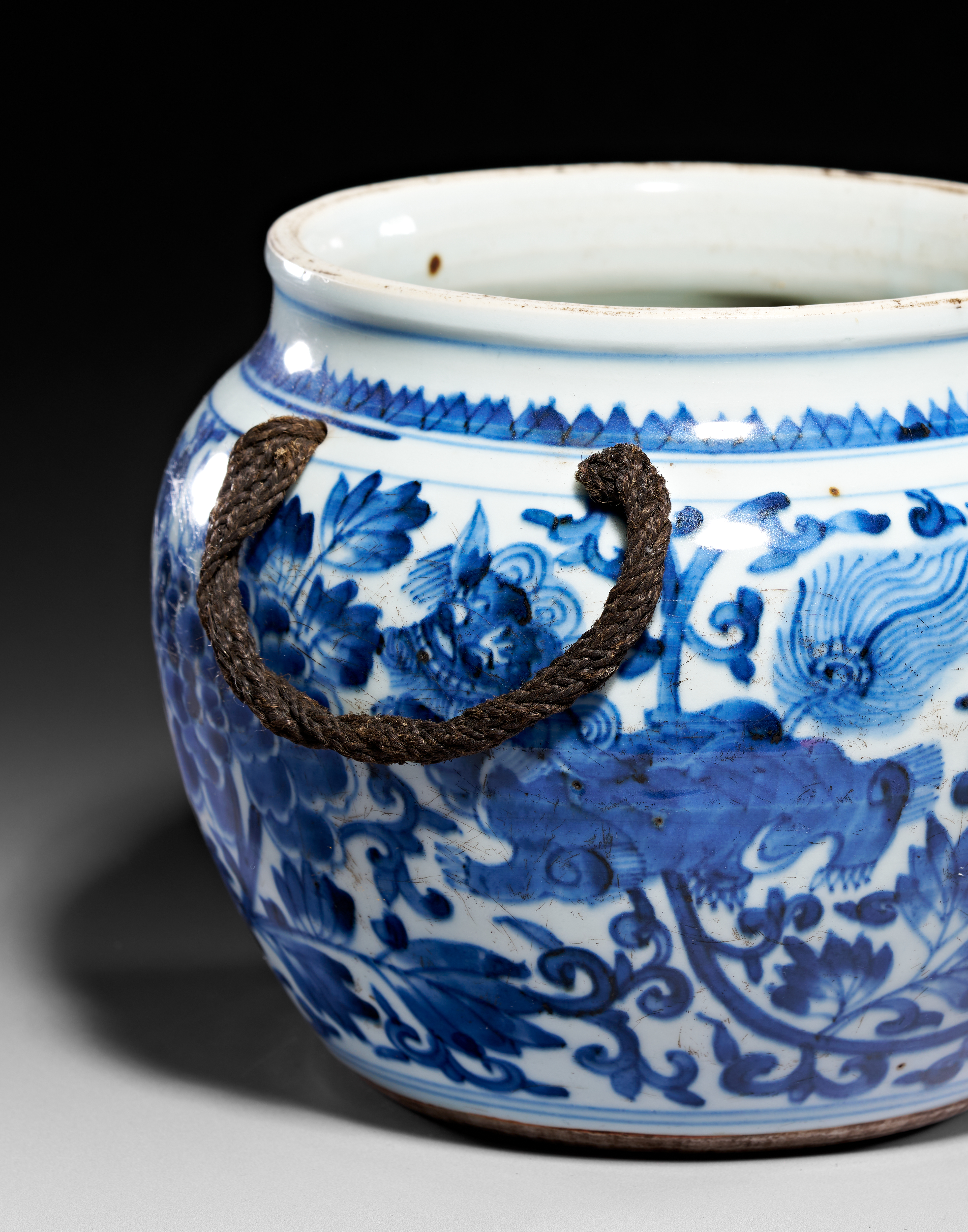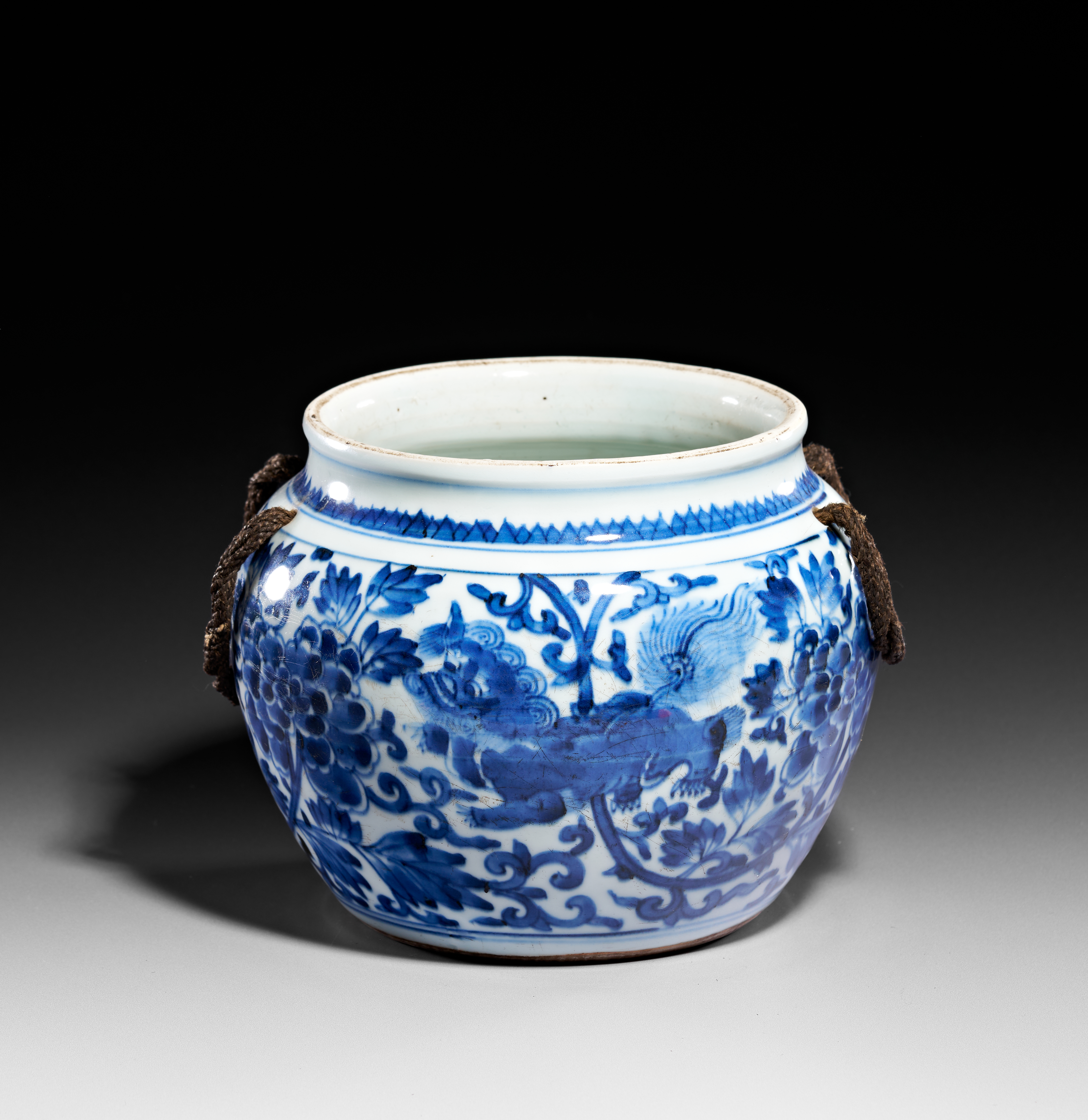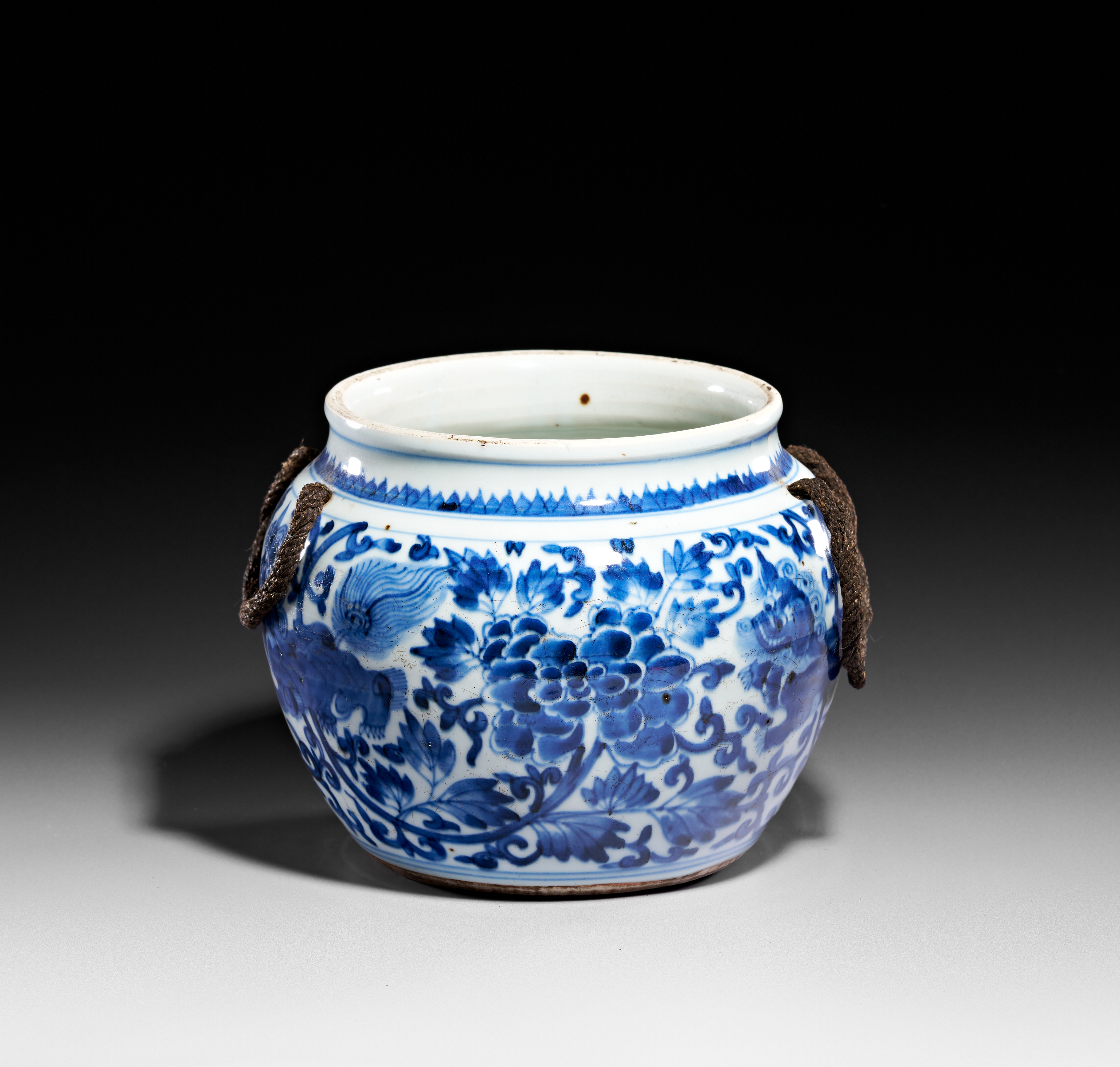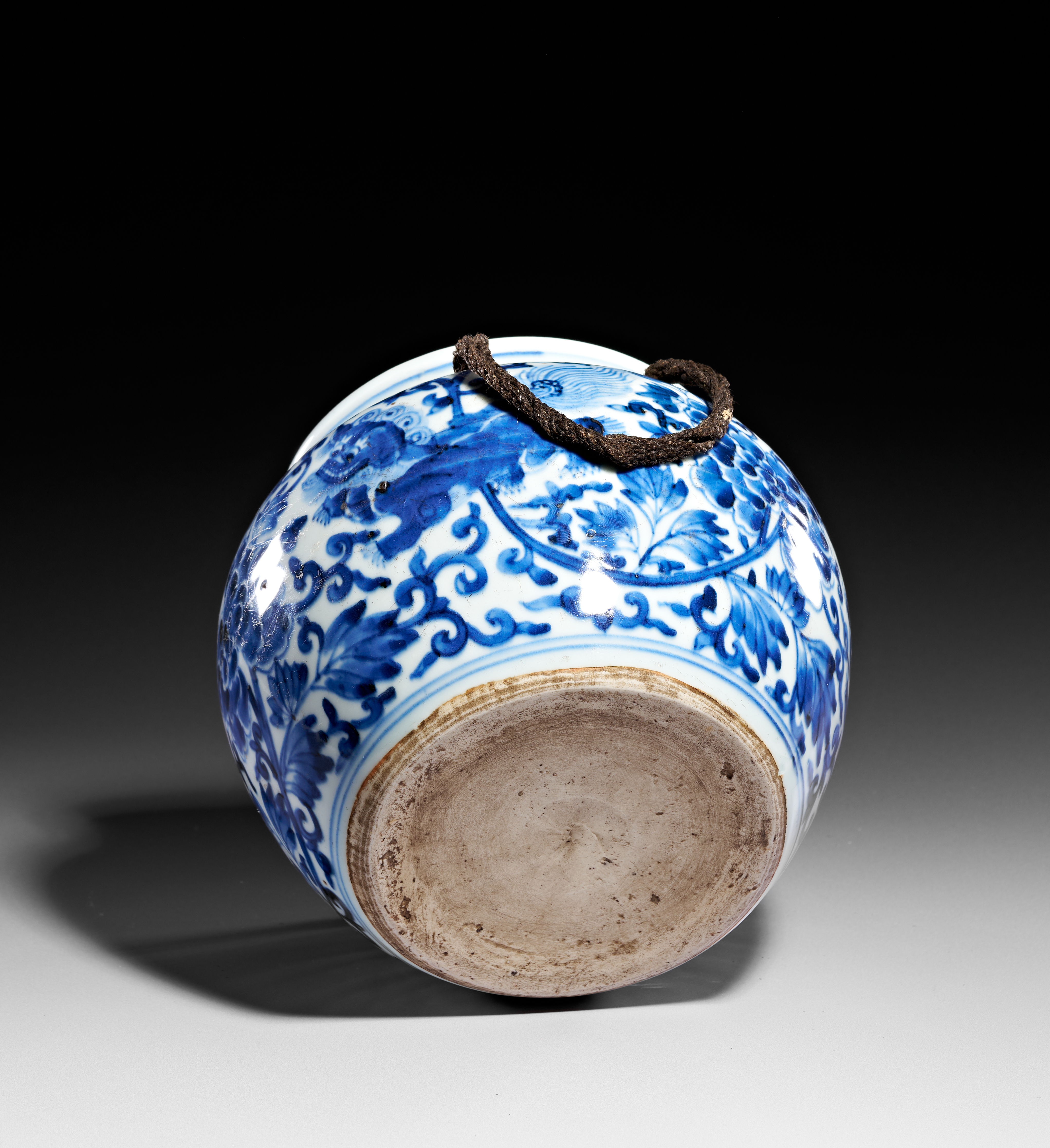 This Chinese blue and white porcelain jar features a globular body with a short, slightly everted neck. The exterior is decorated in underglaze cobalt blue, depicting two mythical shishi, or Buddhist lions, playing amidst scrolling peony blossoms and dense foliage. A sawtooth border encircles the upper shoulder above two small ceramic loop handles, through which a dark, twisted rope is threaded. The vessel’s interior is glazed, while the slightly recessed base remains unglazed, showing firing irregularities consistent with provincial manufacturing.