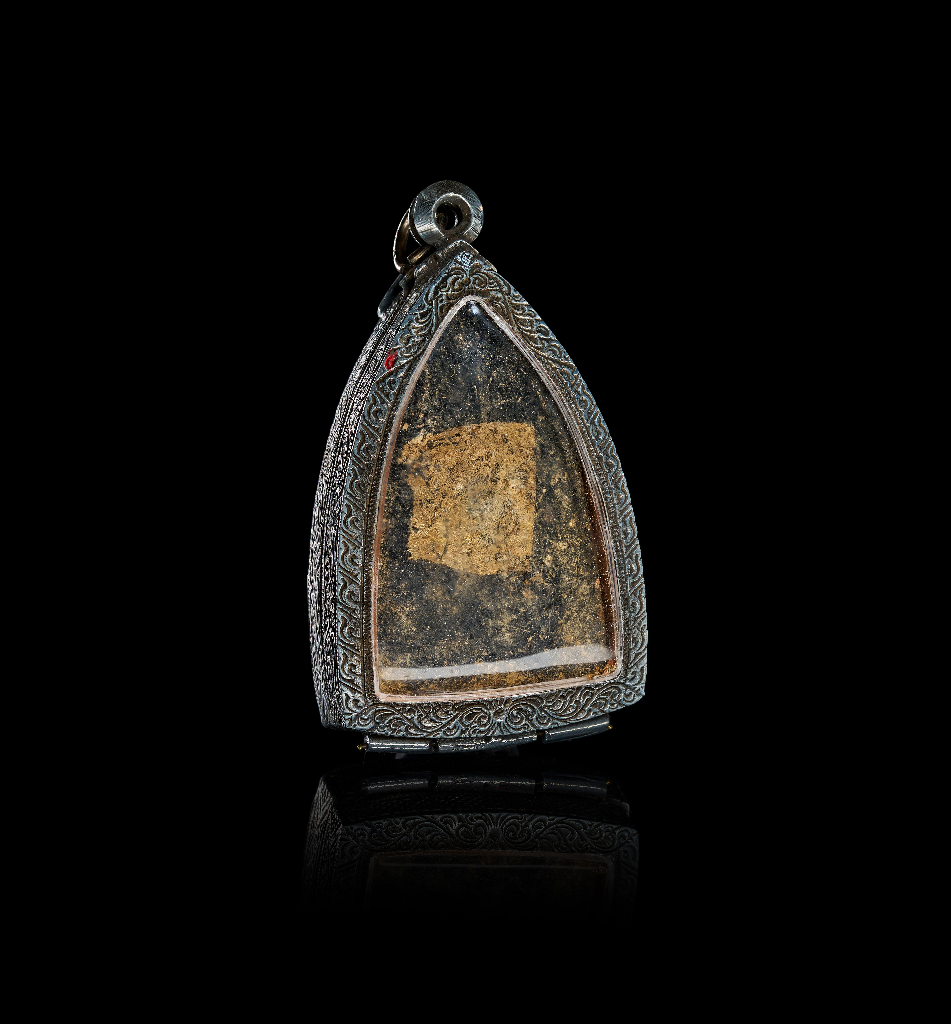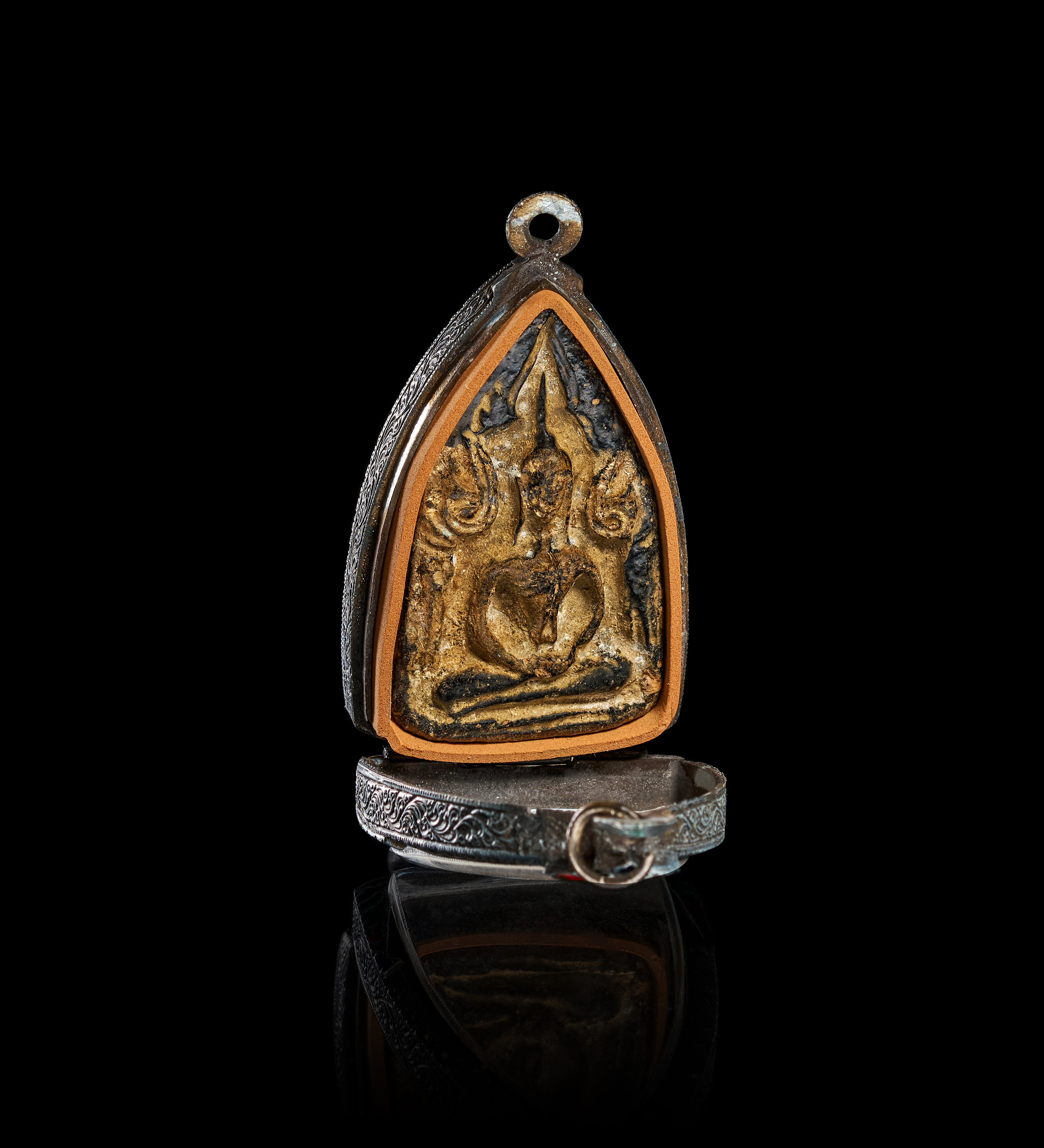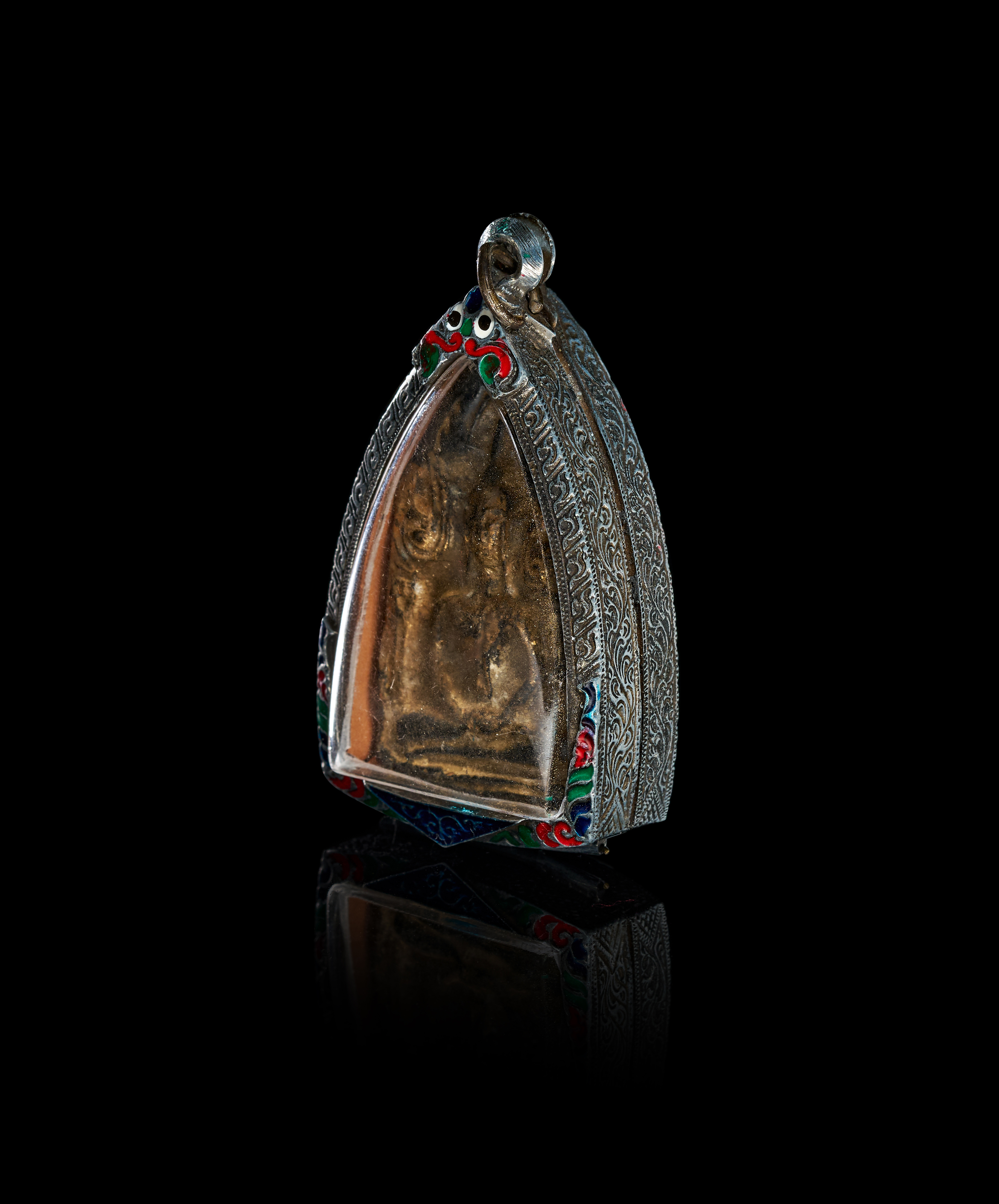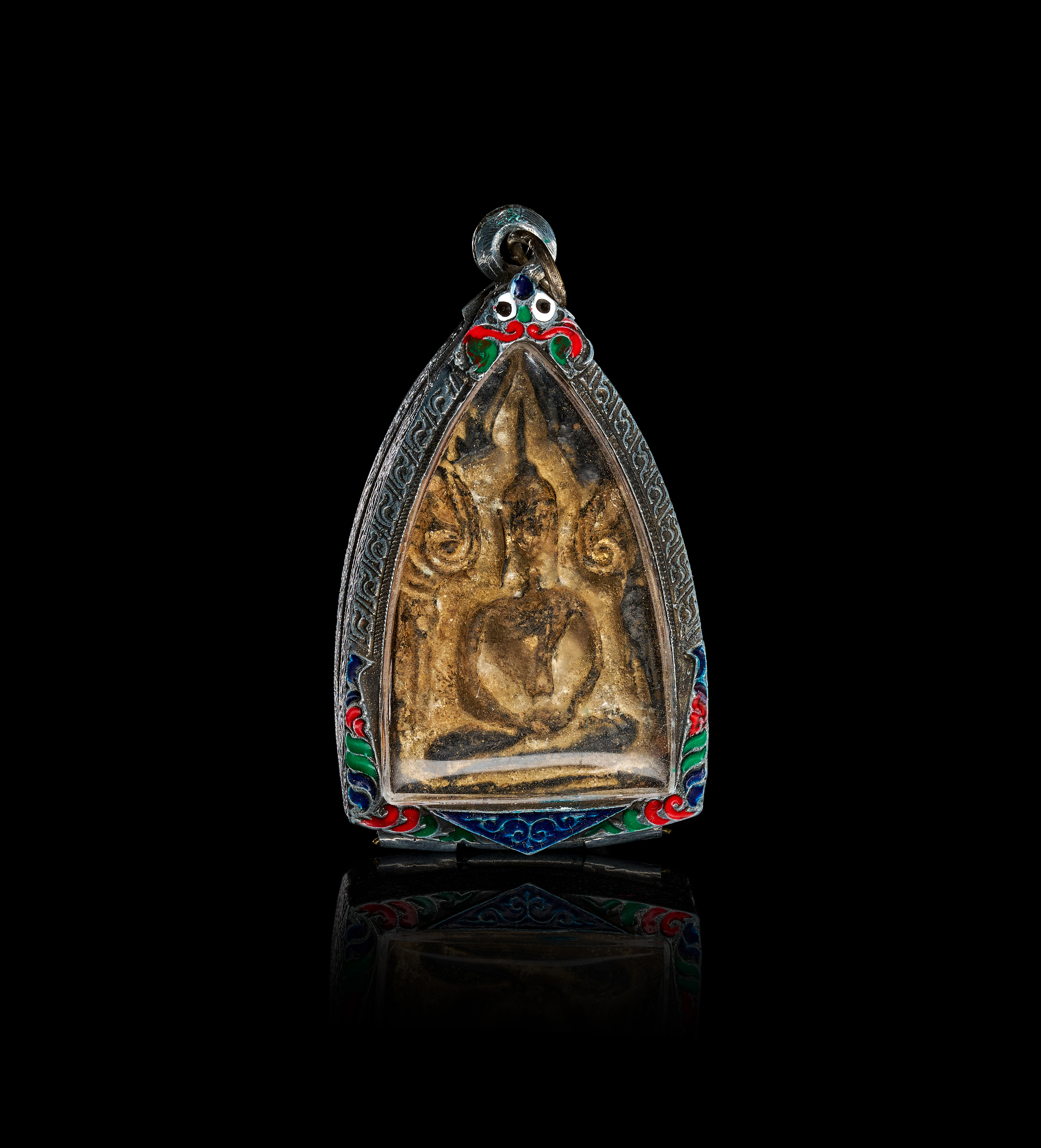 This Thai Buddhist amulet is identified as a Phra Khun Paen, a style frequently associated with the Wat Ban Krang cache. The central figure is crafted from molded sacred powder or clay, depicting a seated Buddha in a pointed-arch frame. The reverse of the amulet features a small patch of applied gold leaf. The piece is contained within a silver-toned metal case featuring a hinged opening at the base and a suspension loop at the apex. The exterior of the case is decorated with engraved foliate scrolling patterns and accented with red, green, and blue enamel work.