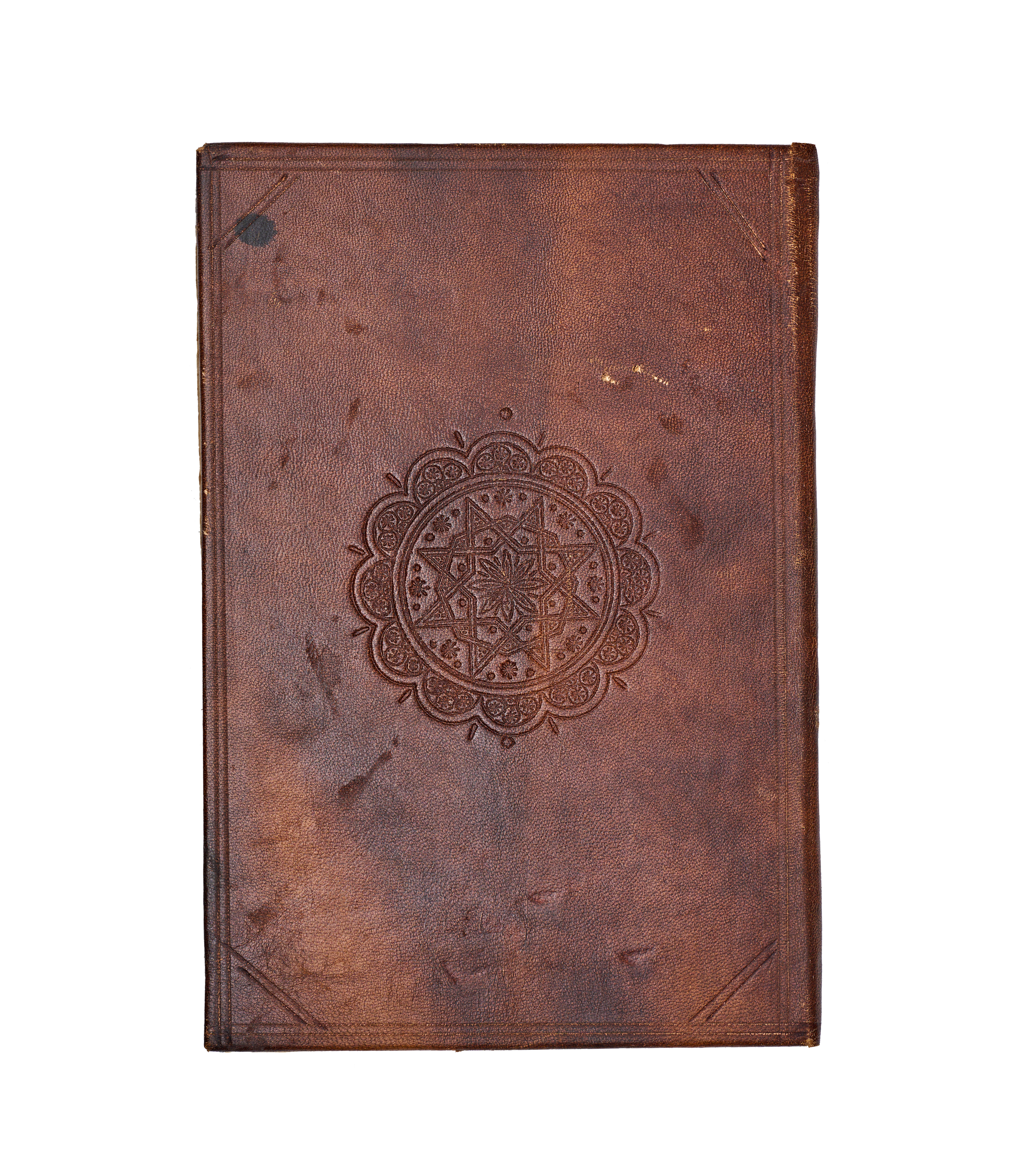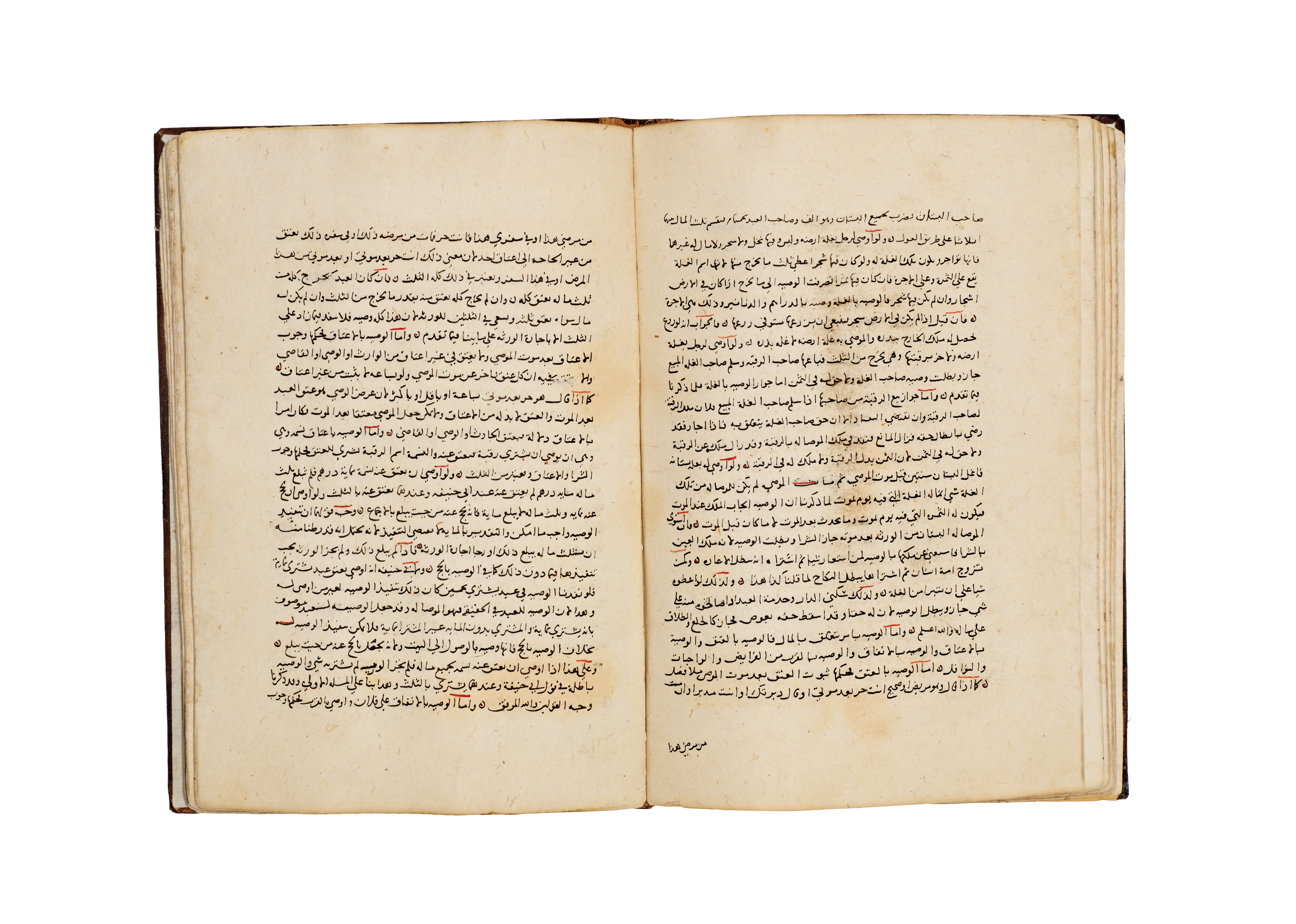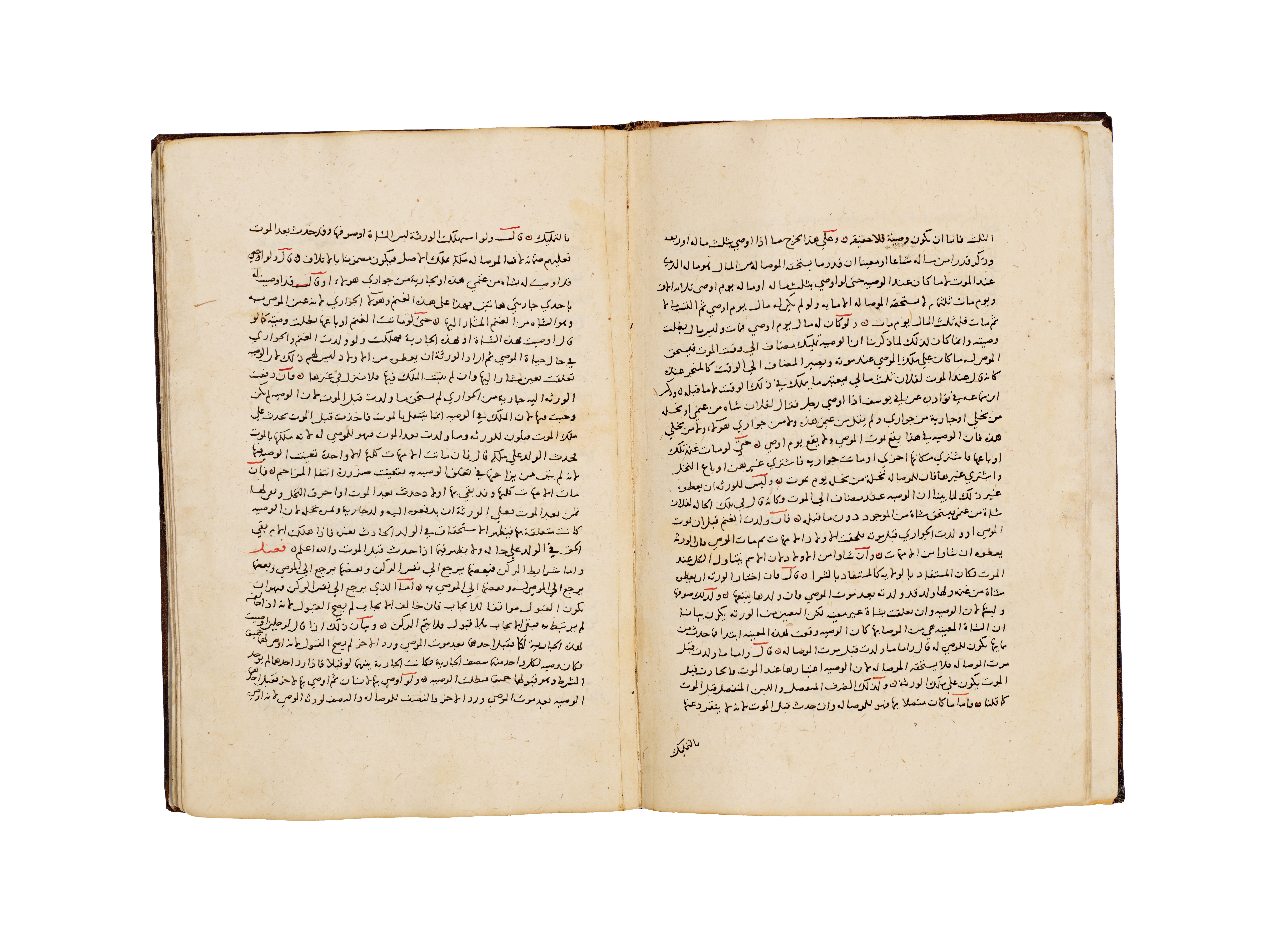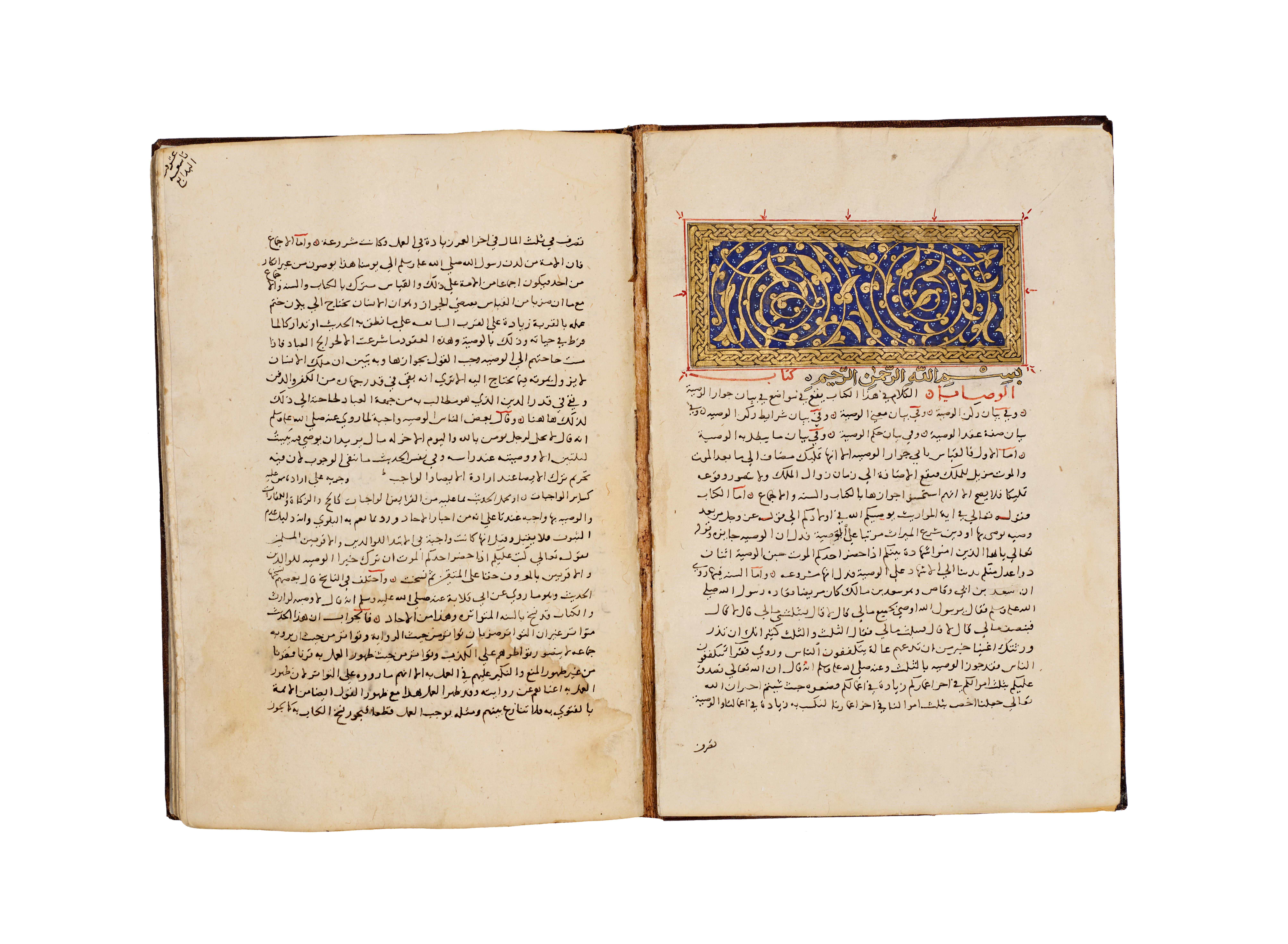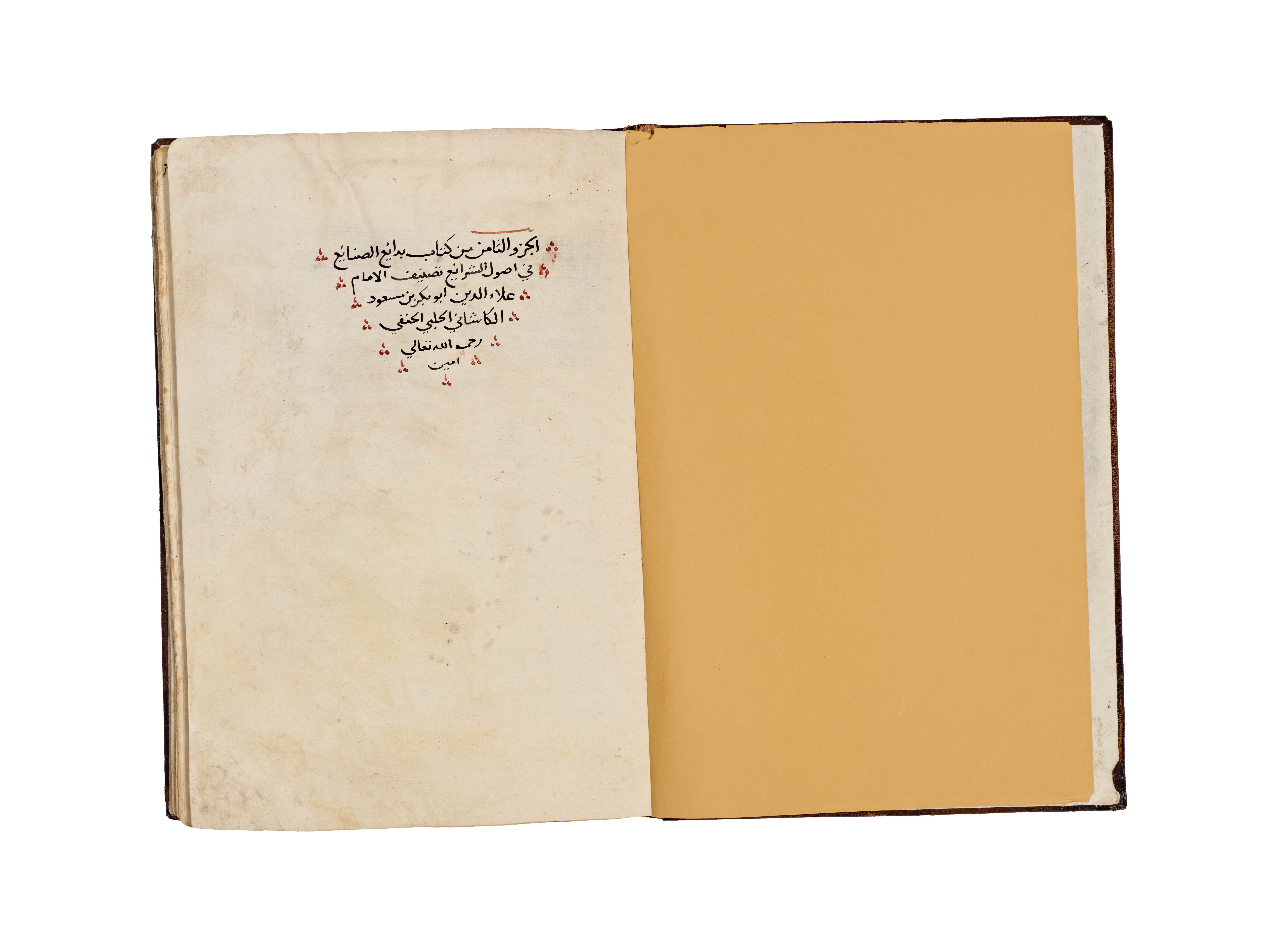 A hand-written Islamic manuscript volume titled Bada’i’ al-Sana’i’ fi Tartib al-Shara’i’ by the Hanafi jurist Al-Kasani. The volume is bound in brown, blind-tooled leather featuring a central scalloped medallion and ruled borders. The interior consists of handmade paper with text executed in black Naskh script, utilizing red ink for headings and key terms. A prominent illuminated headpiece or Unwan is decorated with blue, gold, and red floral and geometric motifs, introducing the section on the Book of Wills or Kitab al-Wasaya. The manuscript identifies itself as the eighth part of the larger work.