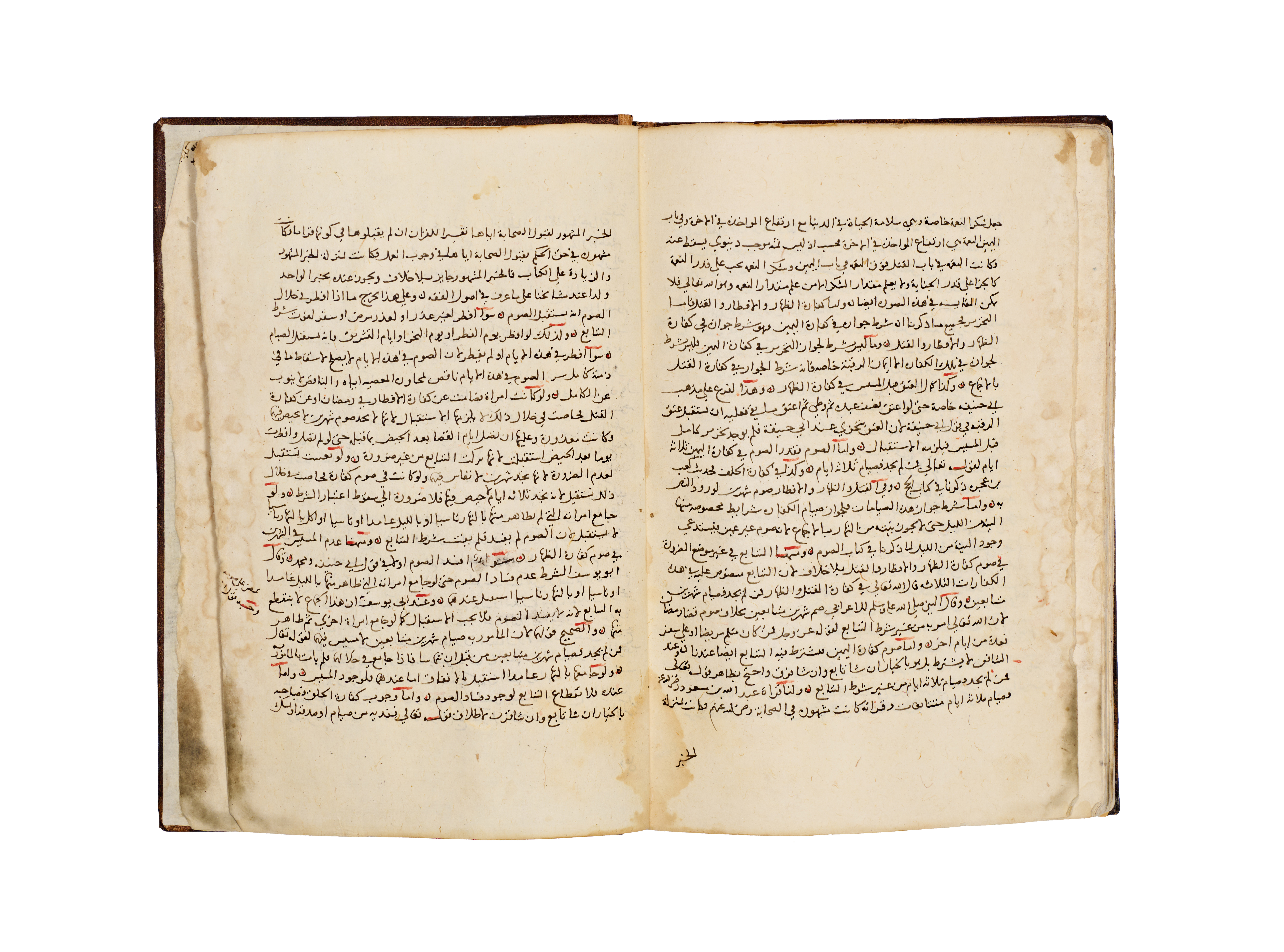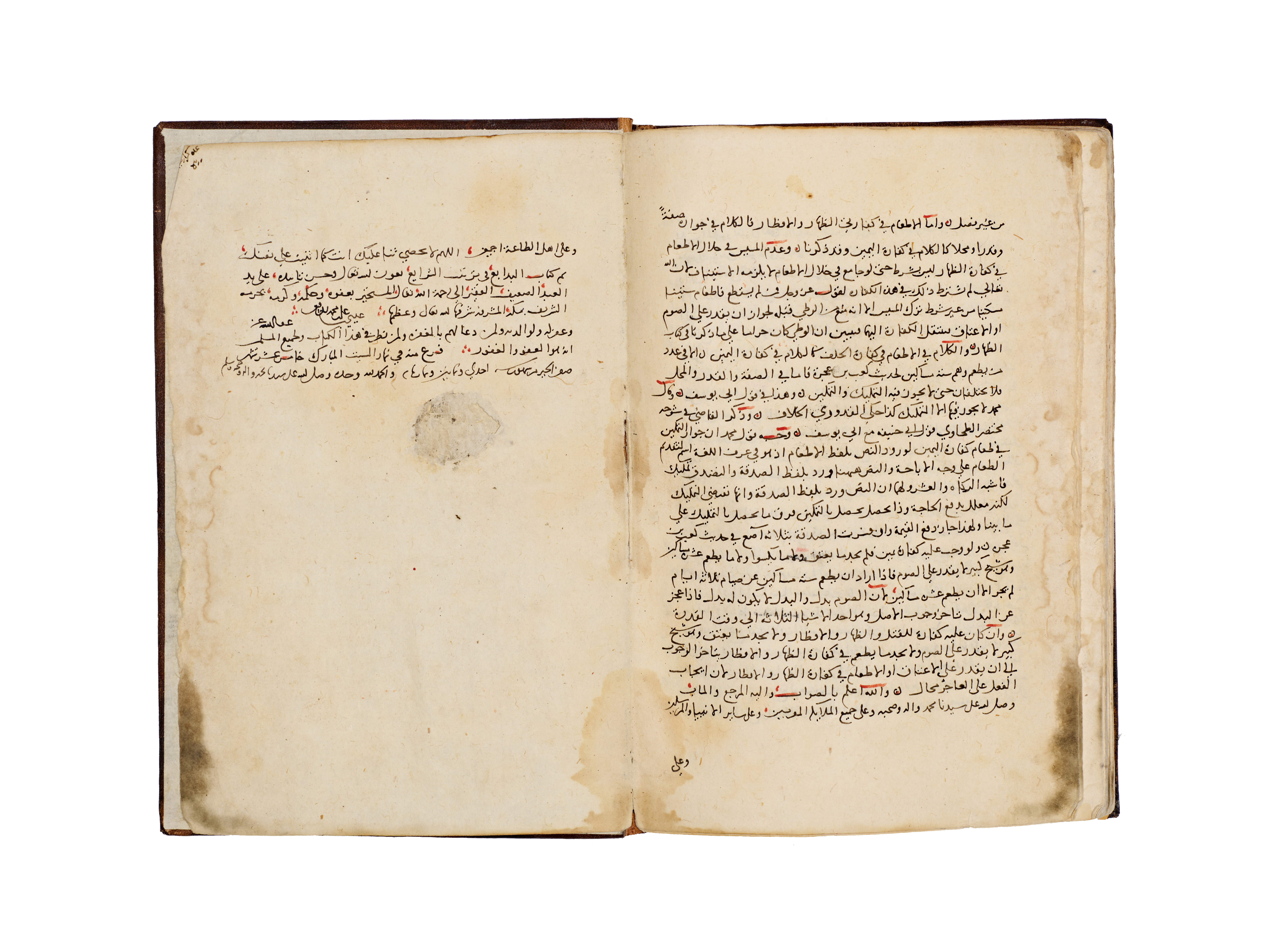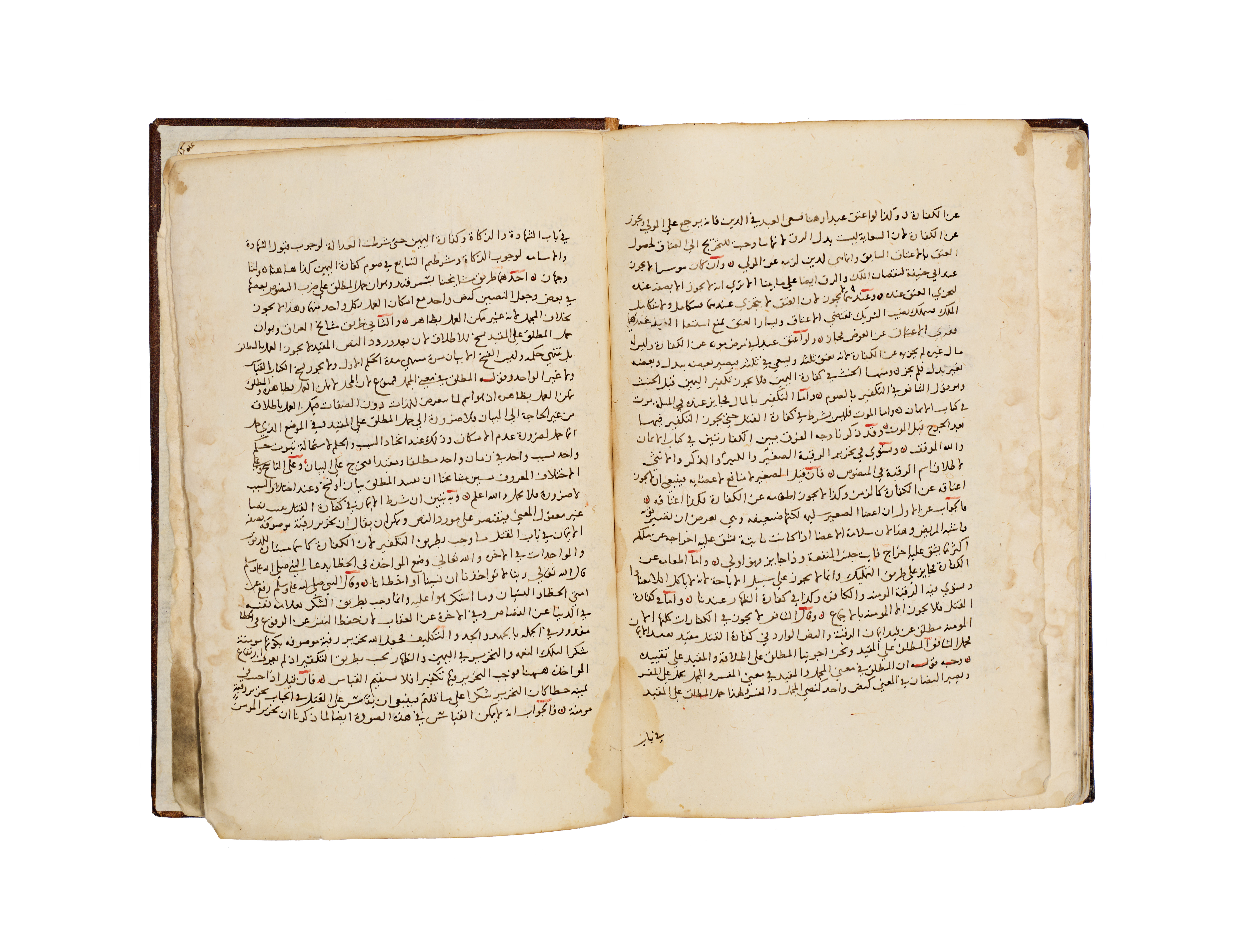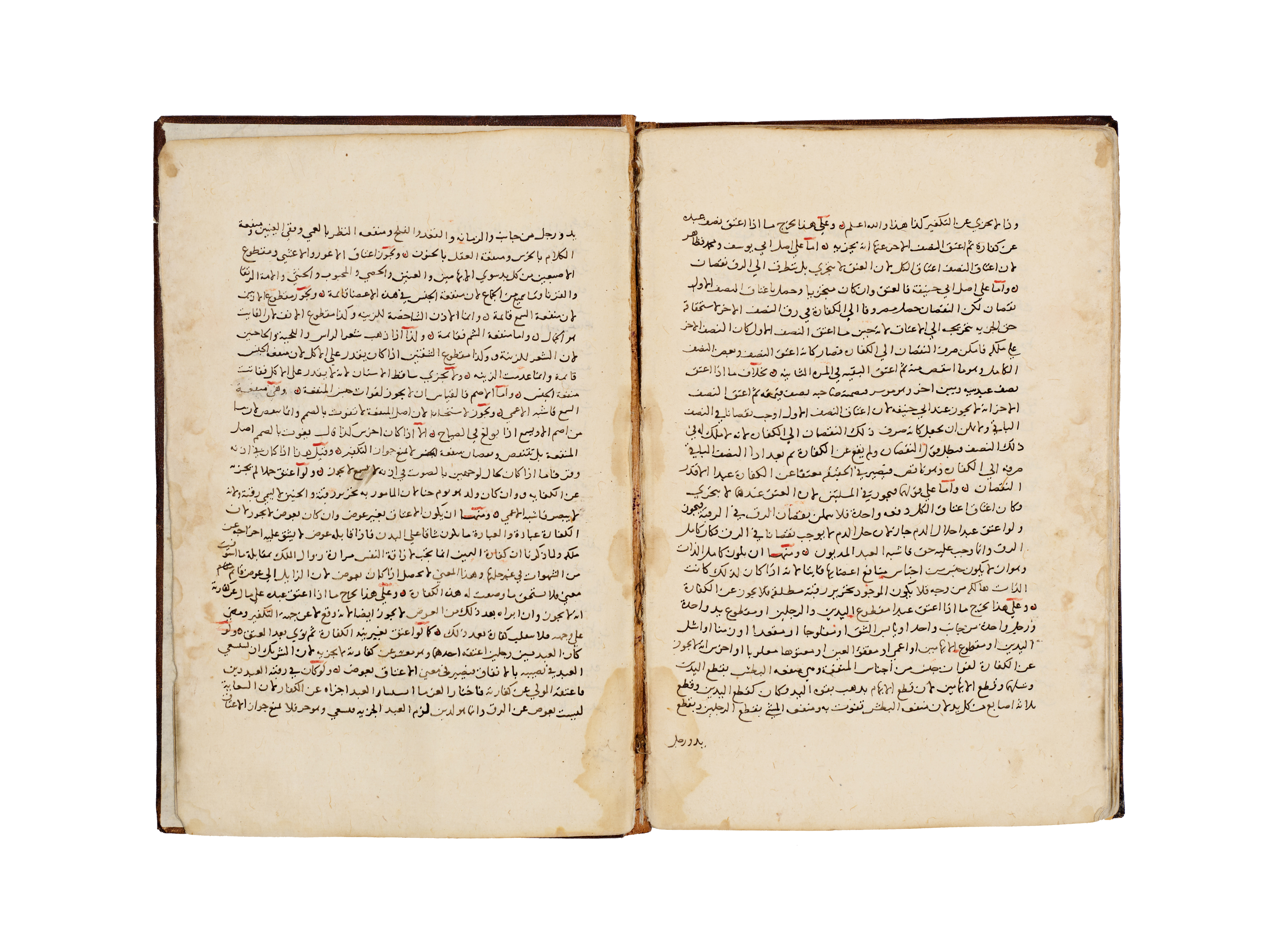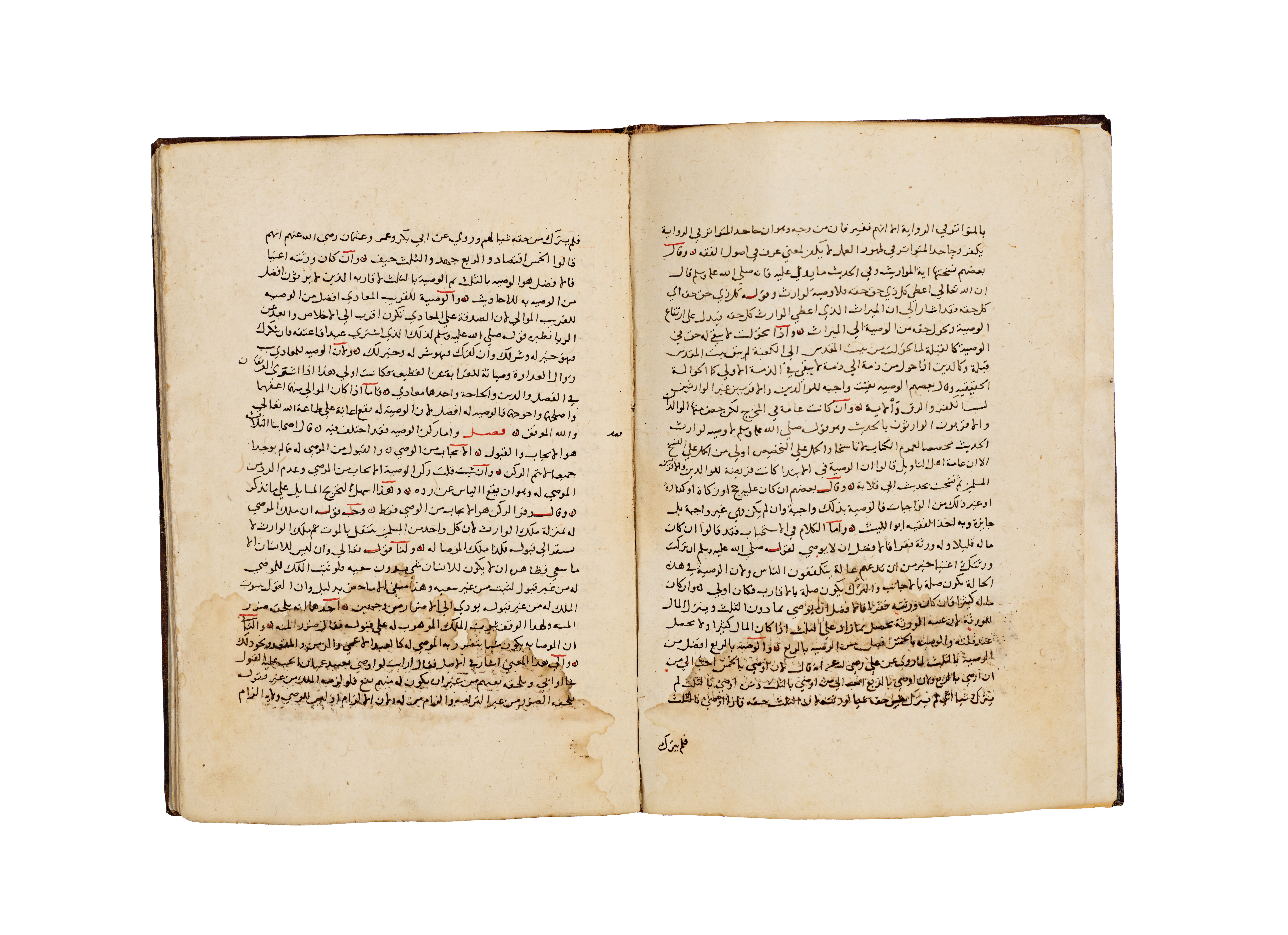 A hand-written Islamic manuscript volume titled Bada’i’ al-Sana’i’ fi Tartib al-Shara’i’ by the Hanafi jurist Al-Kasani. The volume is bound in brown, blind-tooled leather featuring a central scalloped medallion and ruled borders. The interior consists of handmade paper with text executed in black Naskh script, utilizing red ink for headings and key terms. A prominent illuminated headpiece or Unwan is decorated with blue, gold, and red floral and geometric motifs, introducing the section on the Book of Wills or Kitab al-Wasaya. The manuscript identifies itself as the eighth part of the larger work.