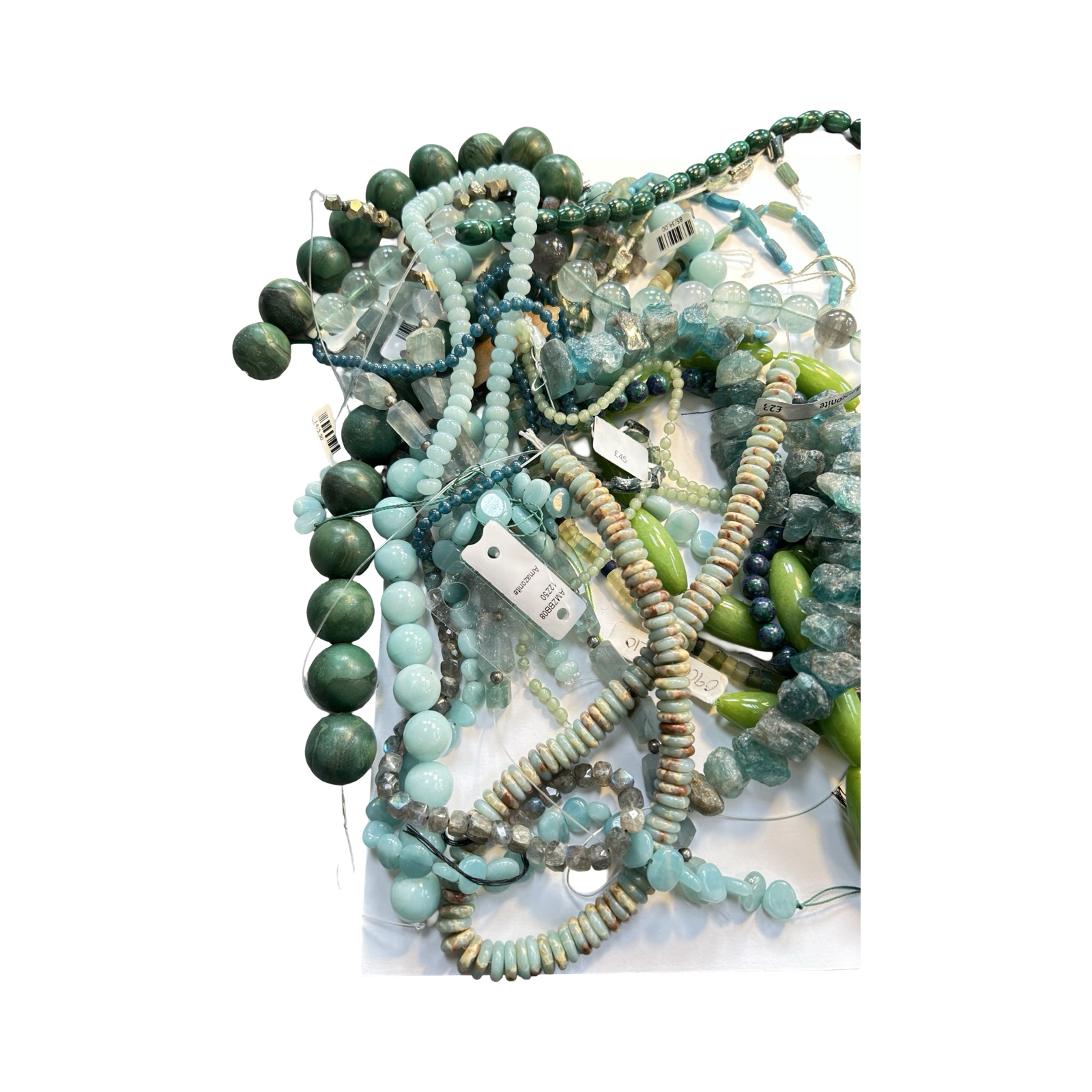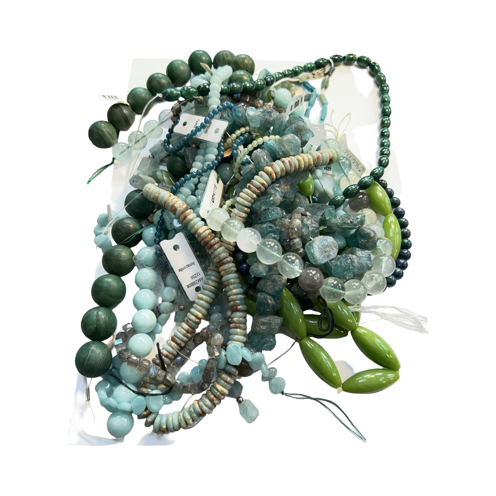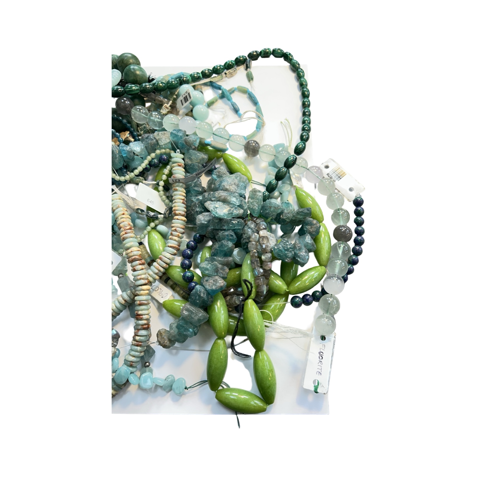 MIXED LOT OF 20 UNMADE BEAD STRANDS OF AMAZONITE, APATITE, SERPENTINE, MALACHITE, AZURITE, VERDITE, PYRITE AND OTHERS