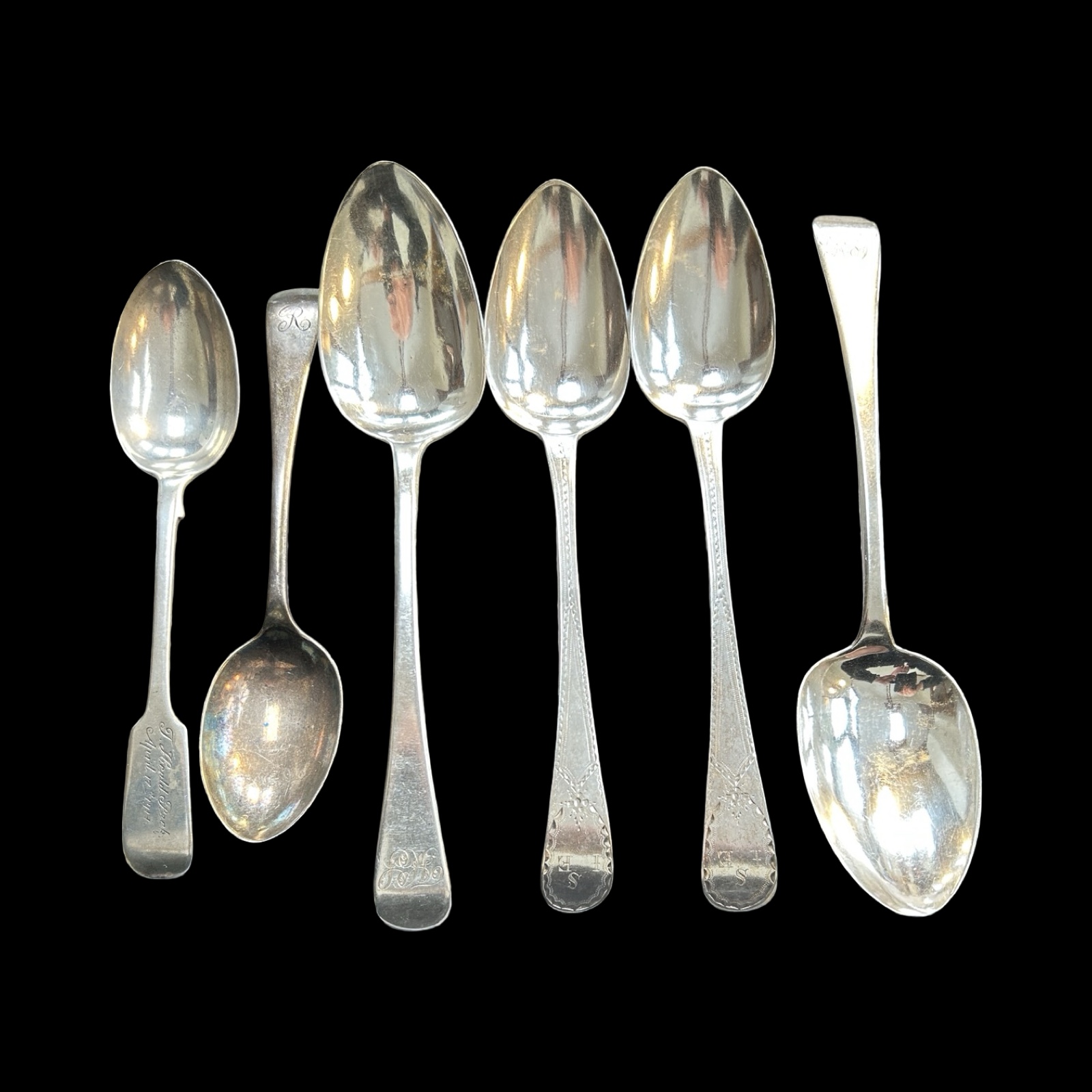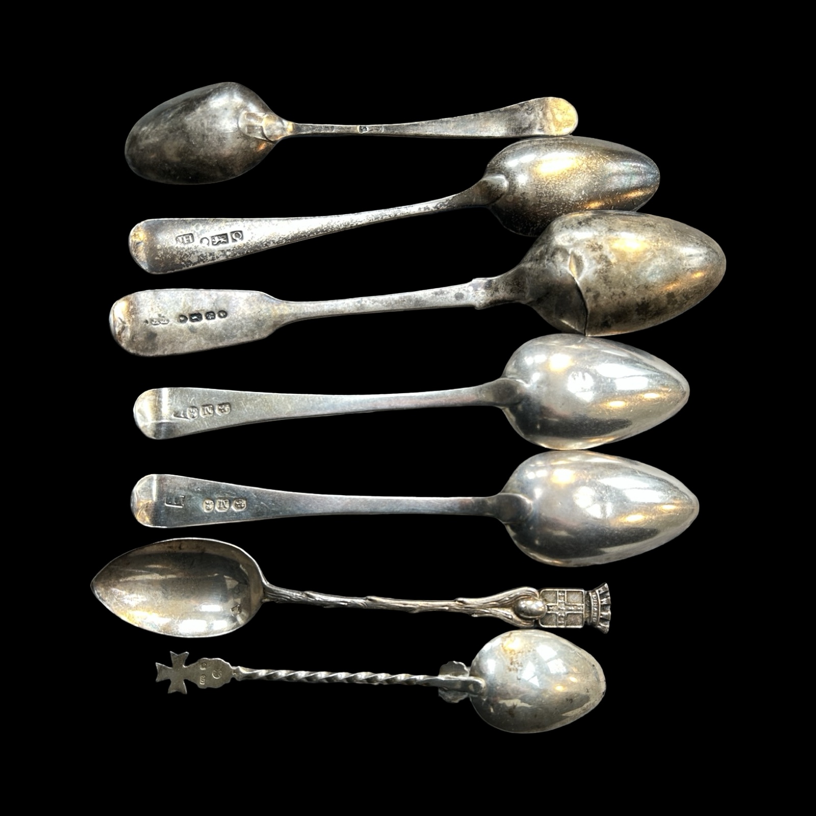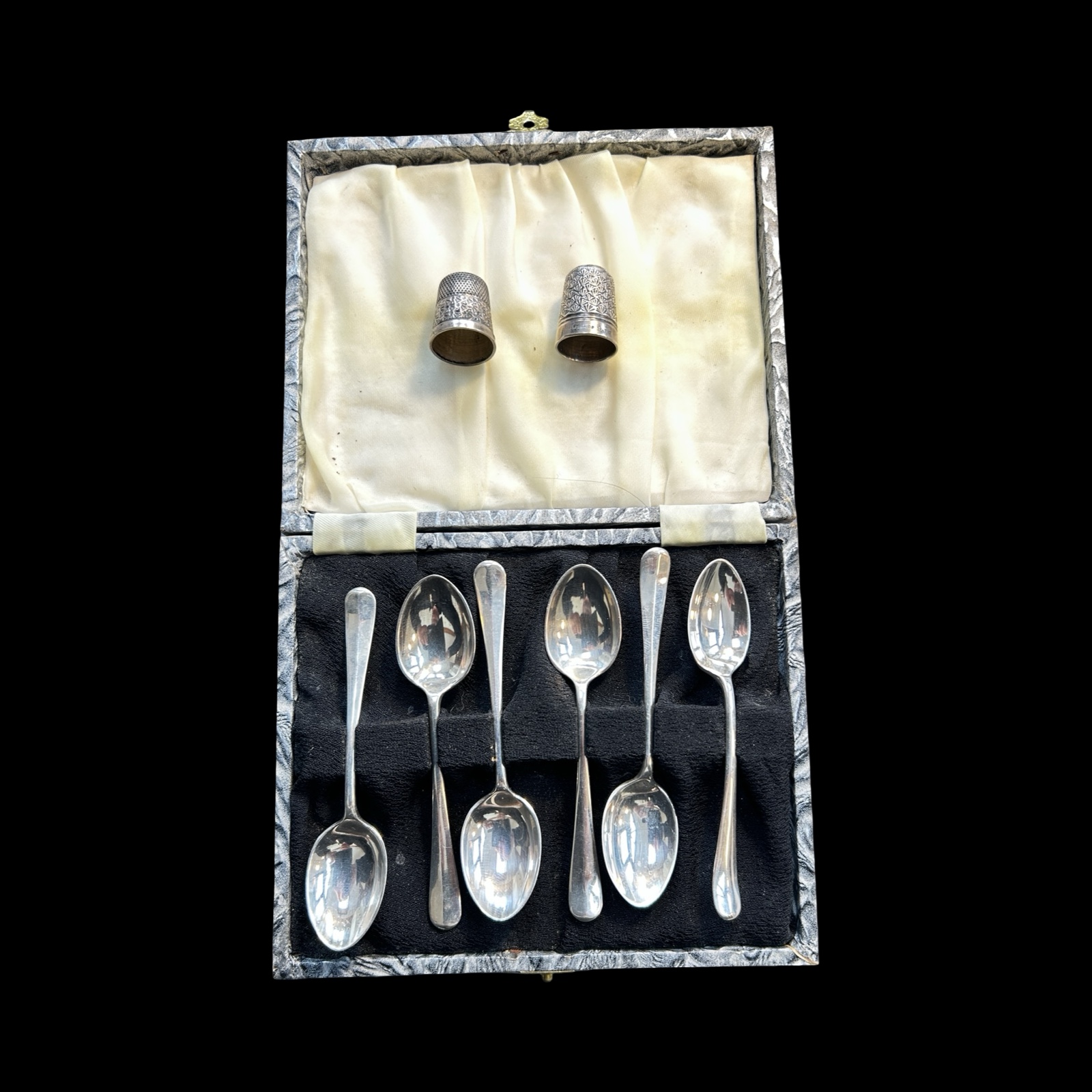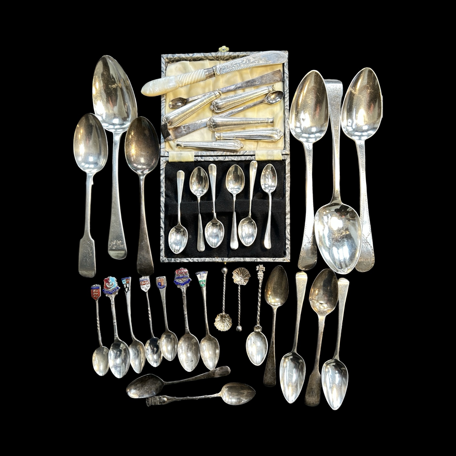 To include 6 fully hallmarked tables and dessert spoons, various dates and makers with 2 bright cut Georgian examples, 15 fully hallmarked tea and /or condiment spoons – some with enamel decoration, various dates and makers, 2 thimbles, one fully hallmarked, a cased set of silver coffee spoons (fully hallmarked) and other broken pieces.