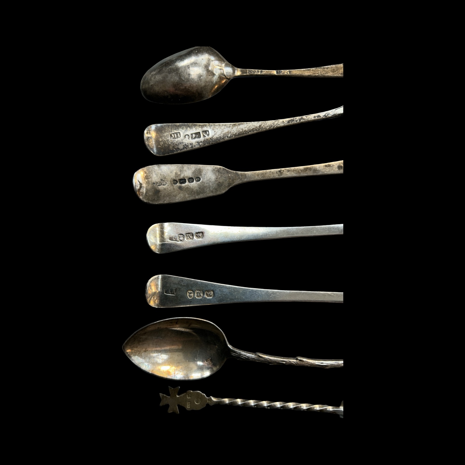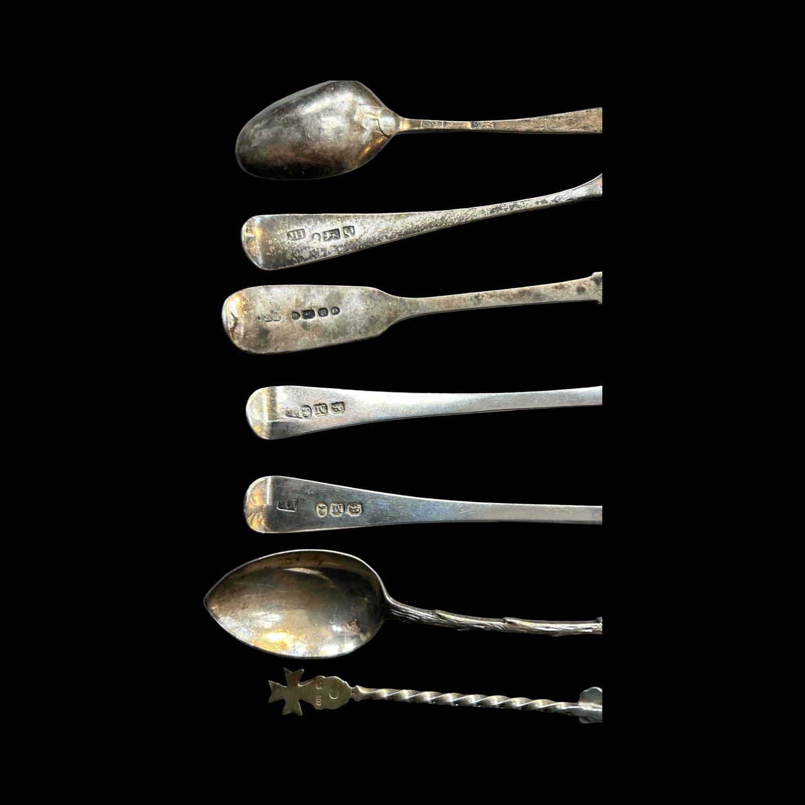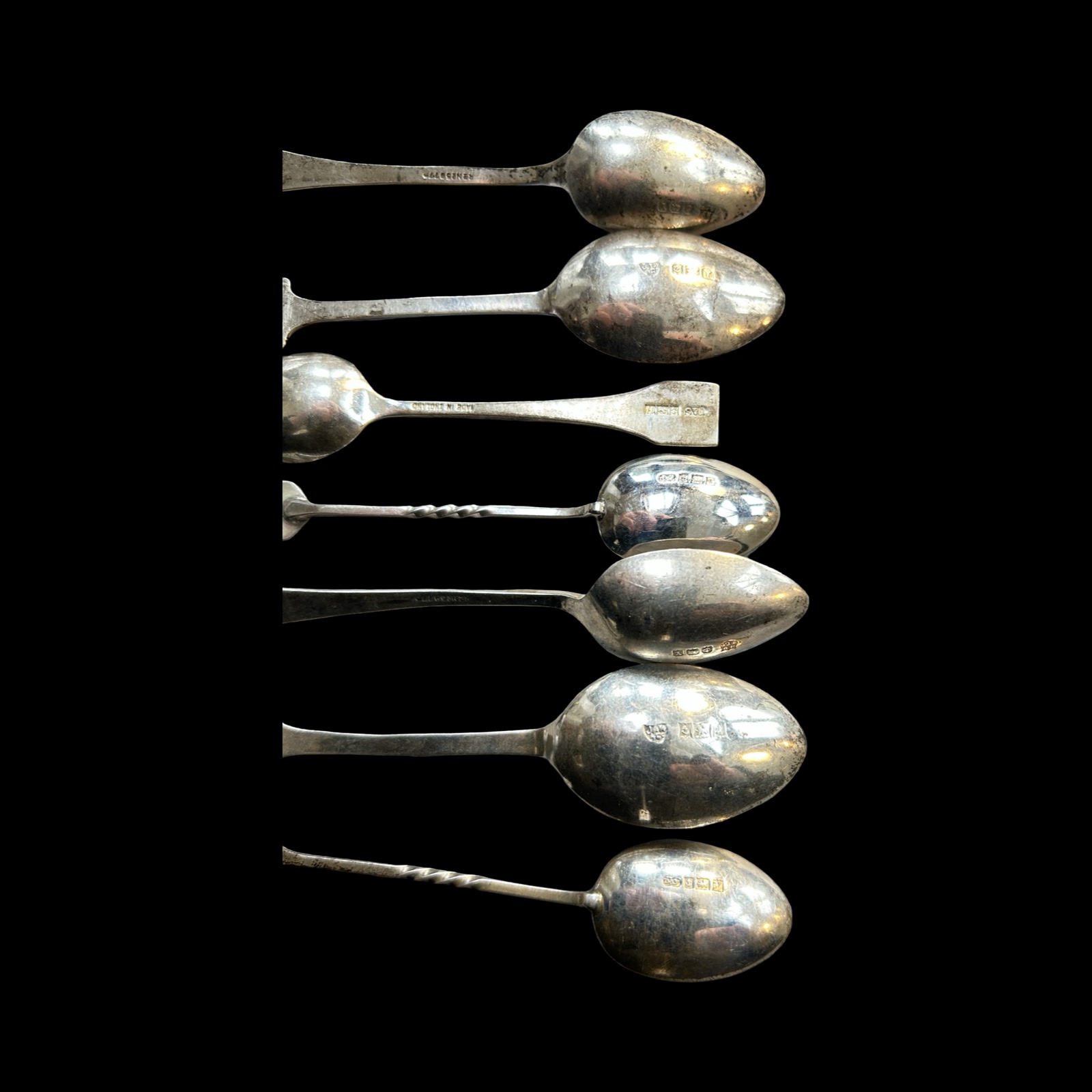 To include 6 fully hallmarked tables and dessert spoons, various dates and makers with 2 bright cut Georgian examples, 15 fully hallmarked tea and /or condiment spoons – some with enamel decoration, various dates and makers, 2 thimbles, one fully hallmarked, a cased set of silver coffee spoons (fully hallmarked) and other broken pieces.