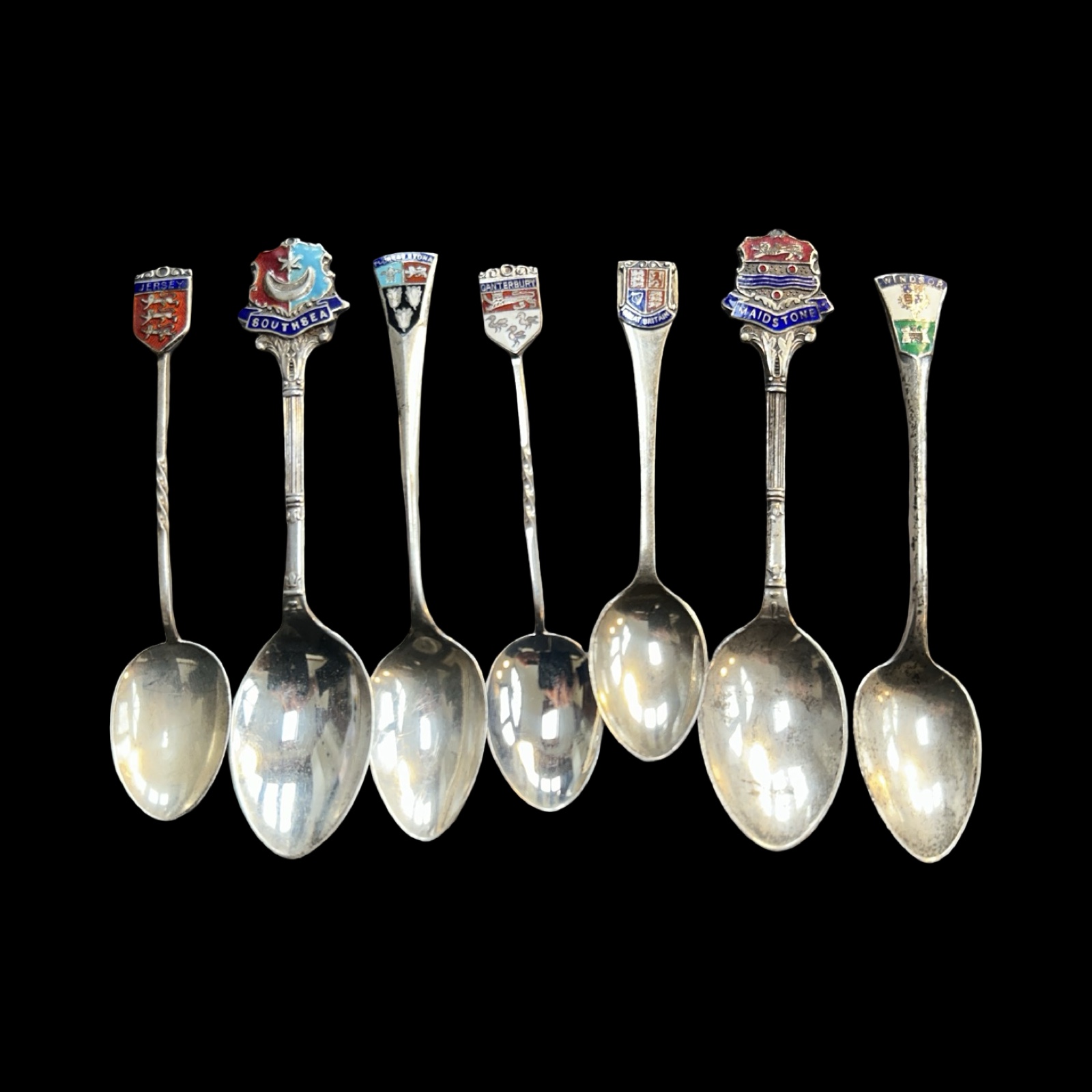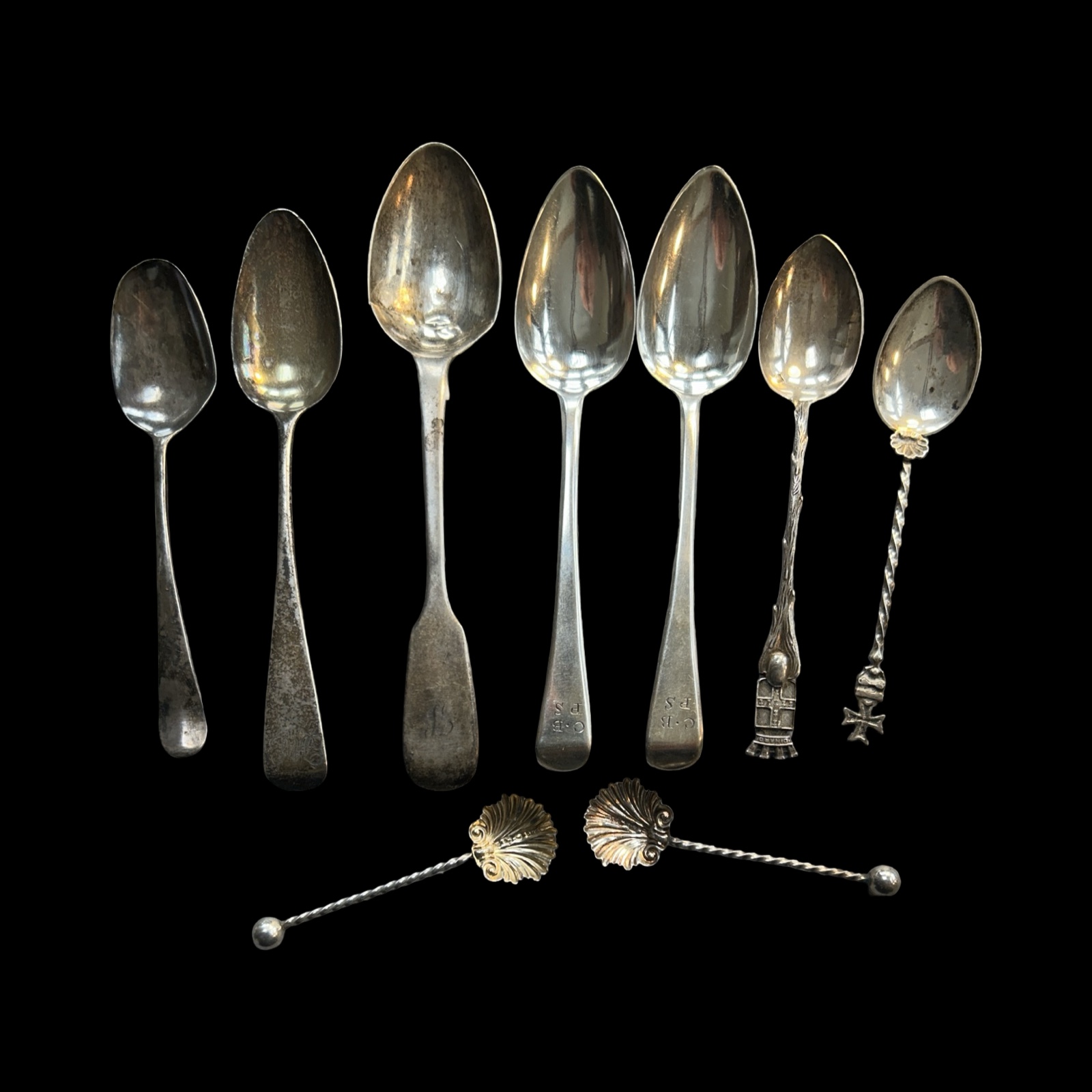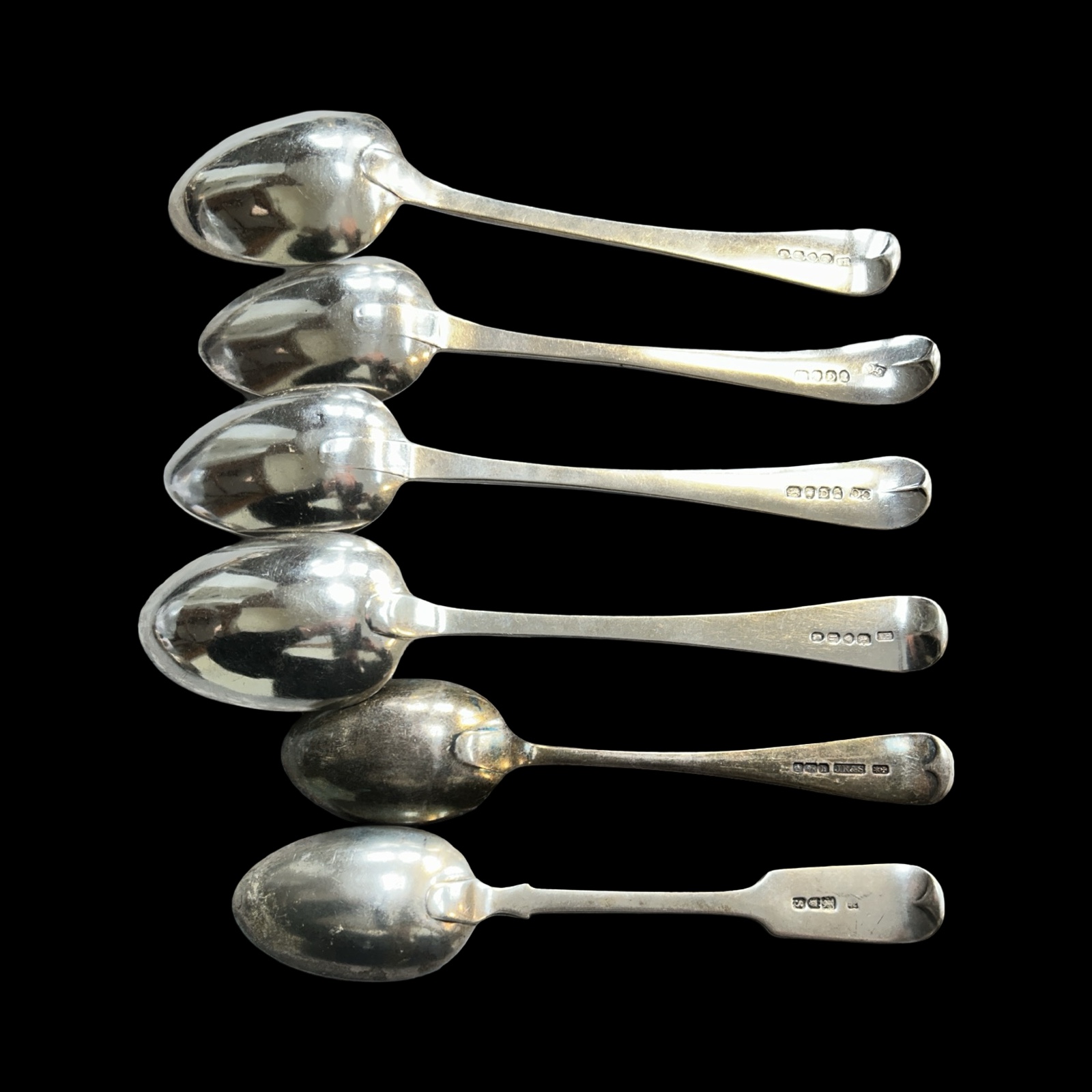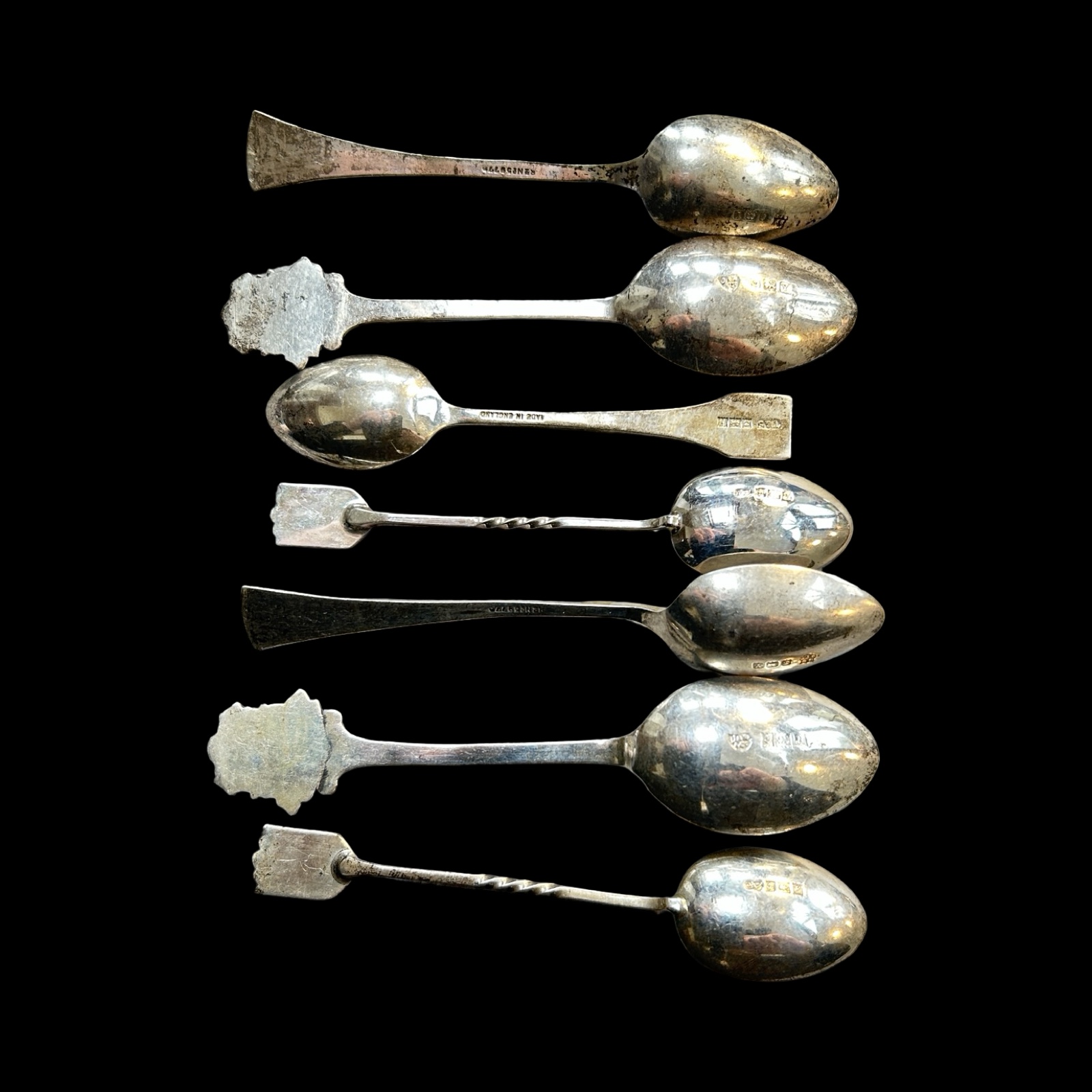 To include 6 fully hallmarked tables and dessert spoons, various dates and makers with 2 bright cut Georgian examples, 15 fully hallmarked tea and /or condiment spoons – some with enamel decoration, various dates and makers, 2 thimbles, one fully hallmarked, a cased set of silver coffee spoons (fully hallmarked) and other broken pieces.